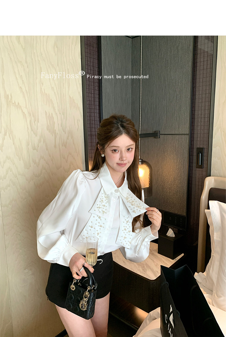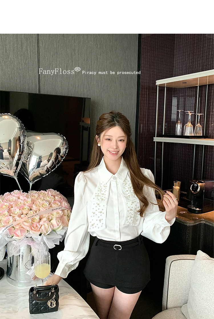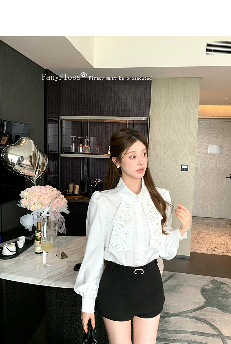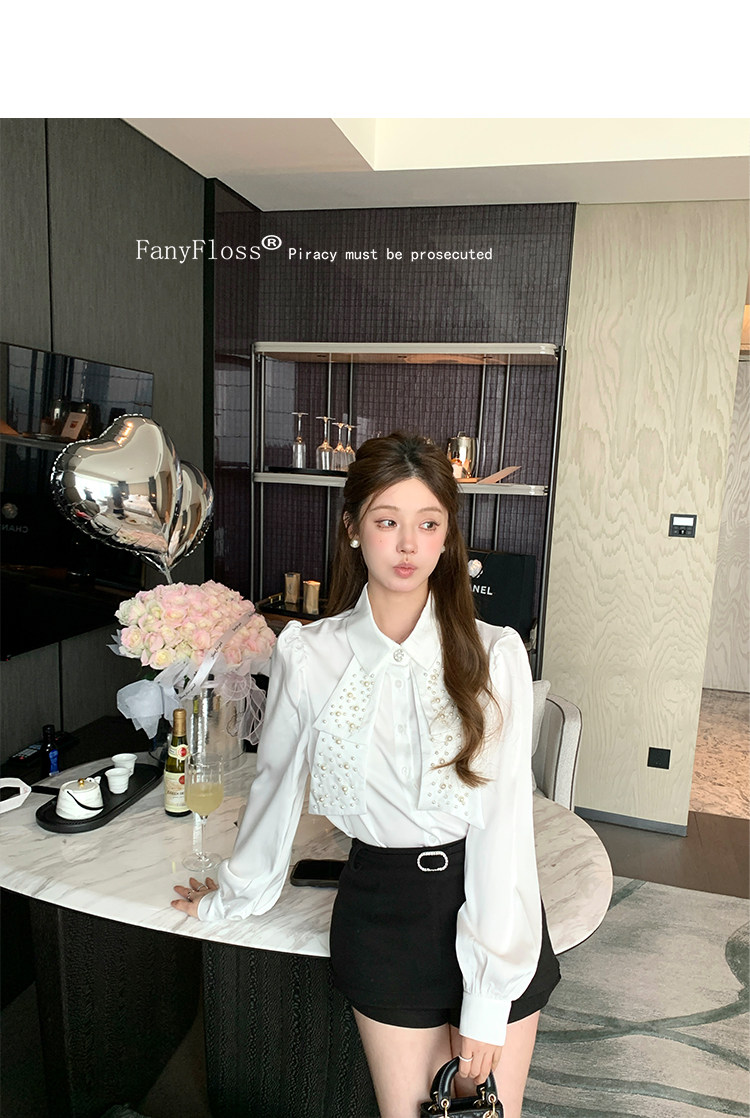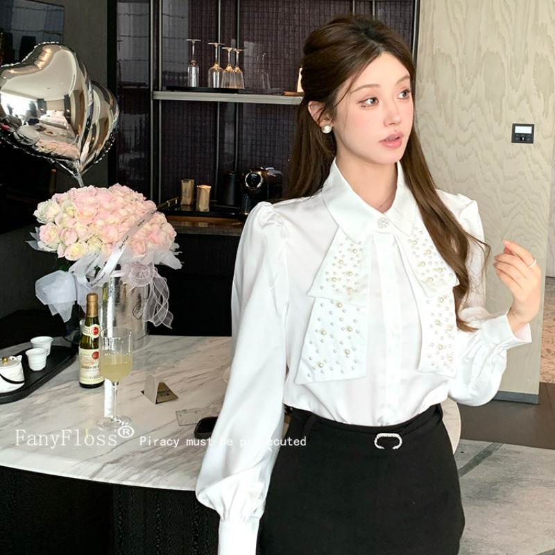 MY16182# FanyFloss法式气质钉珠蝴蝶结白色衬衫女重工收腰钉钻ol长袖衬衣女裝貨源服裝批發
