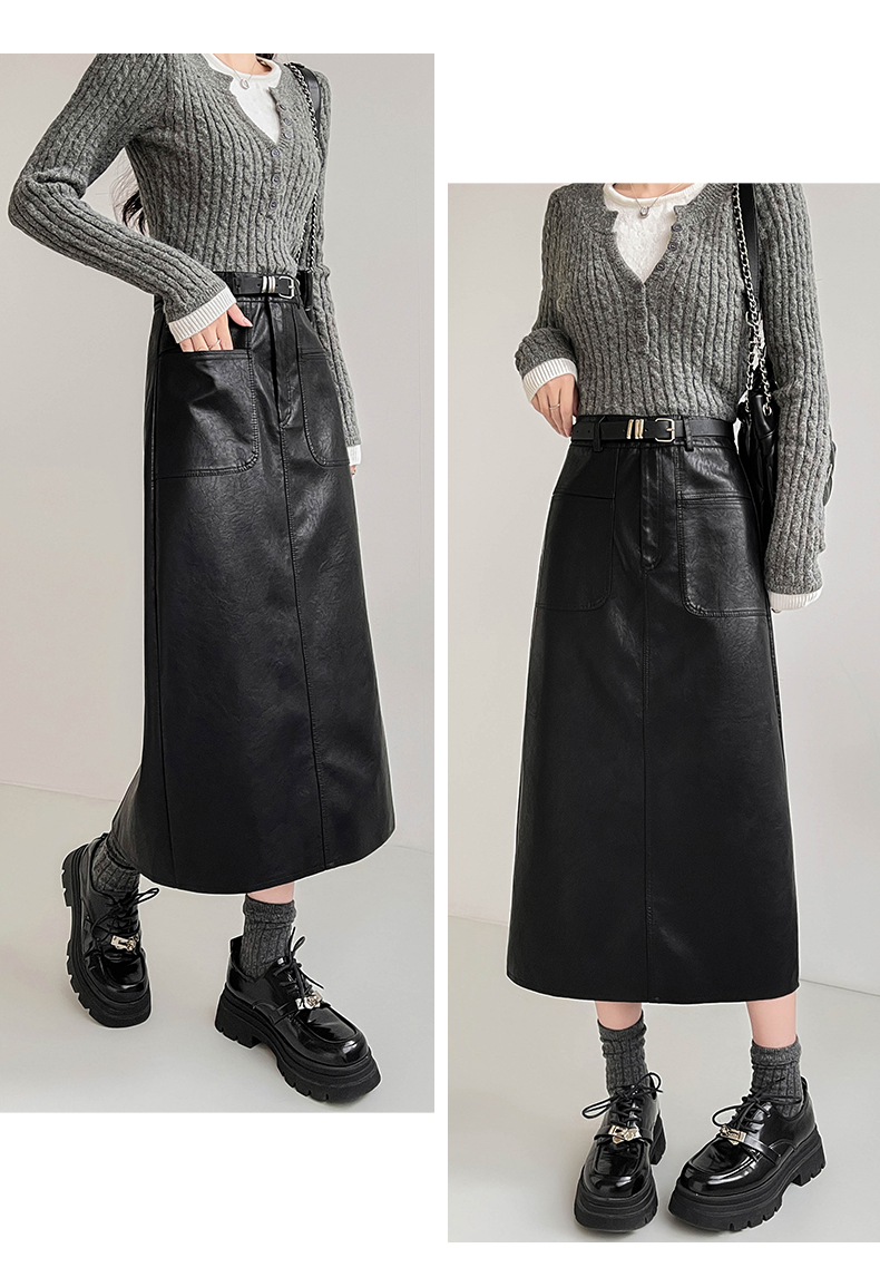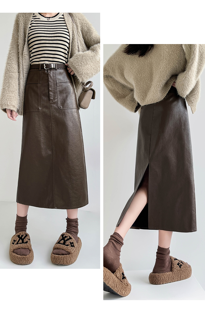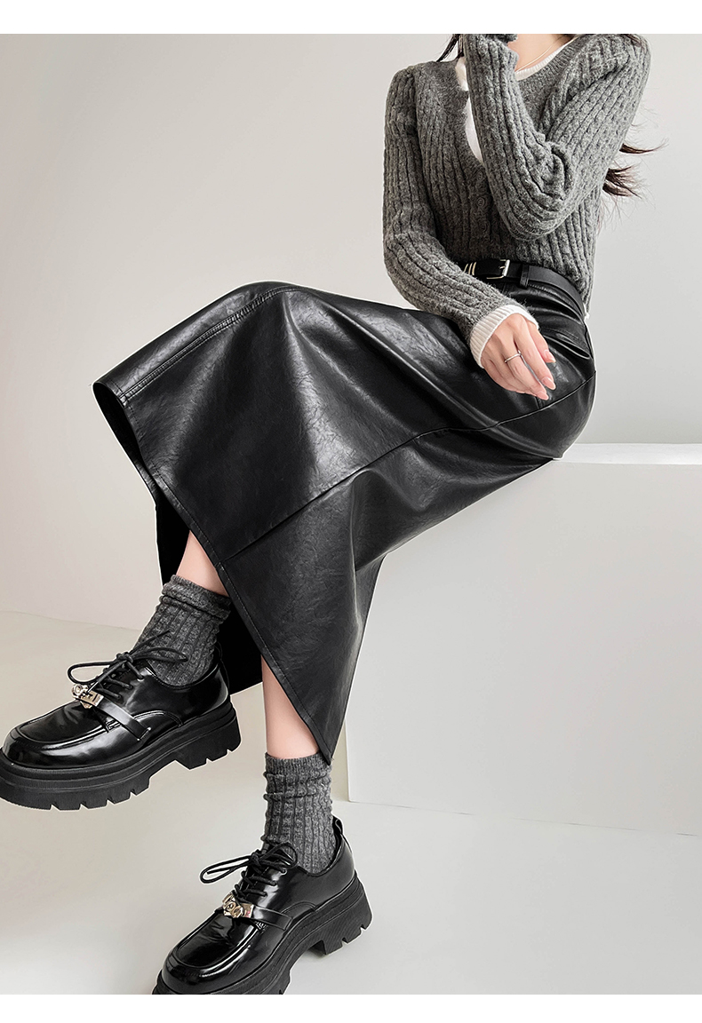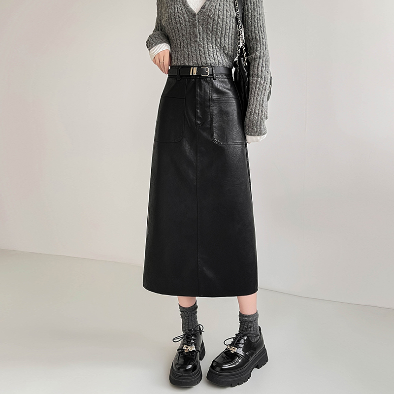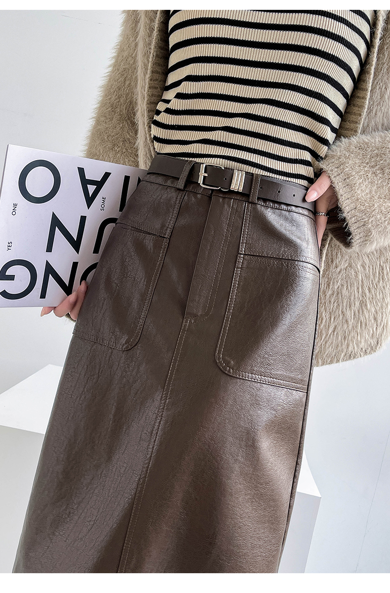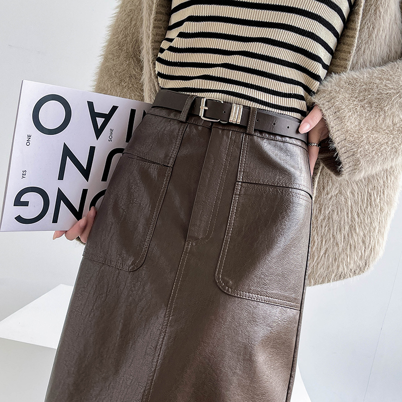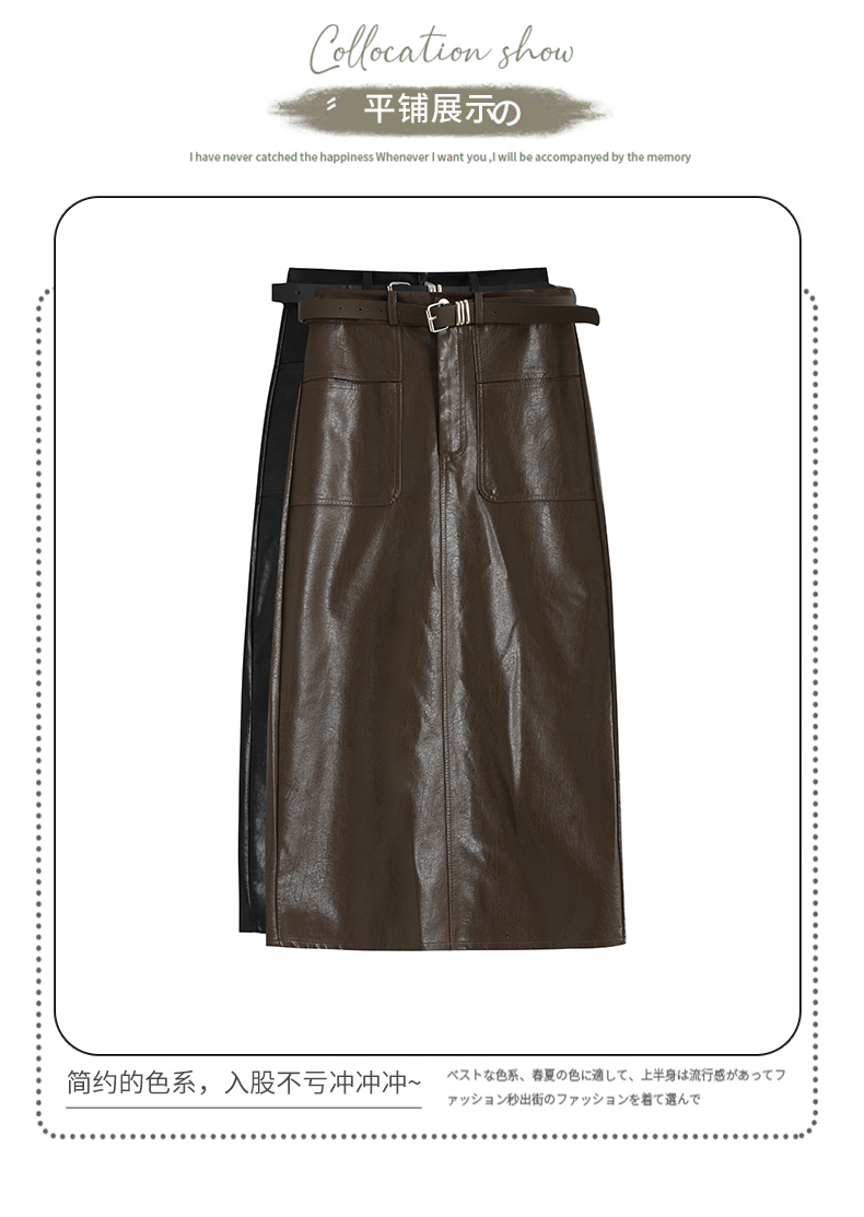 MY16196# 高腰显瘦中长款包臀开叉洗水皮半身一步长裙 送腰带女裝貨源服裝批發