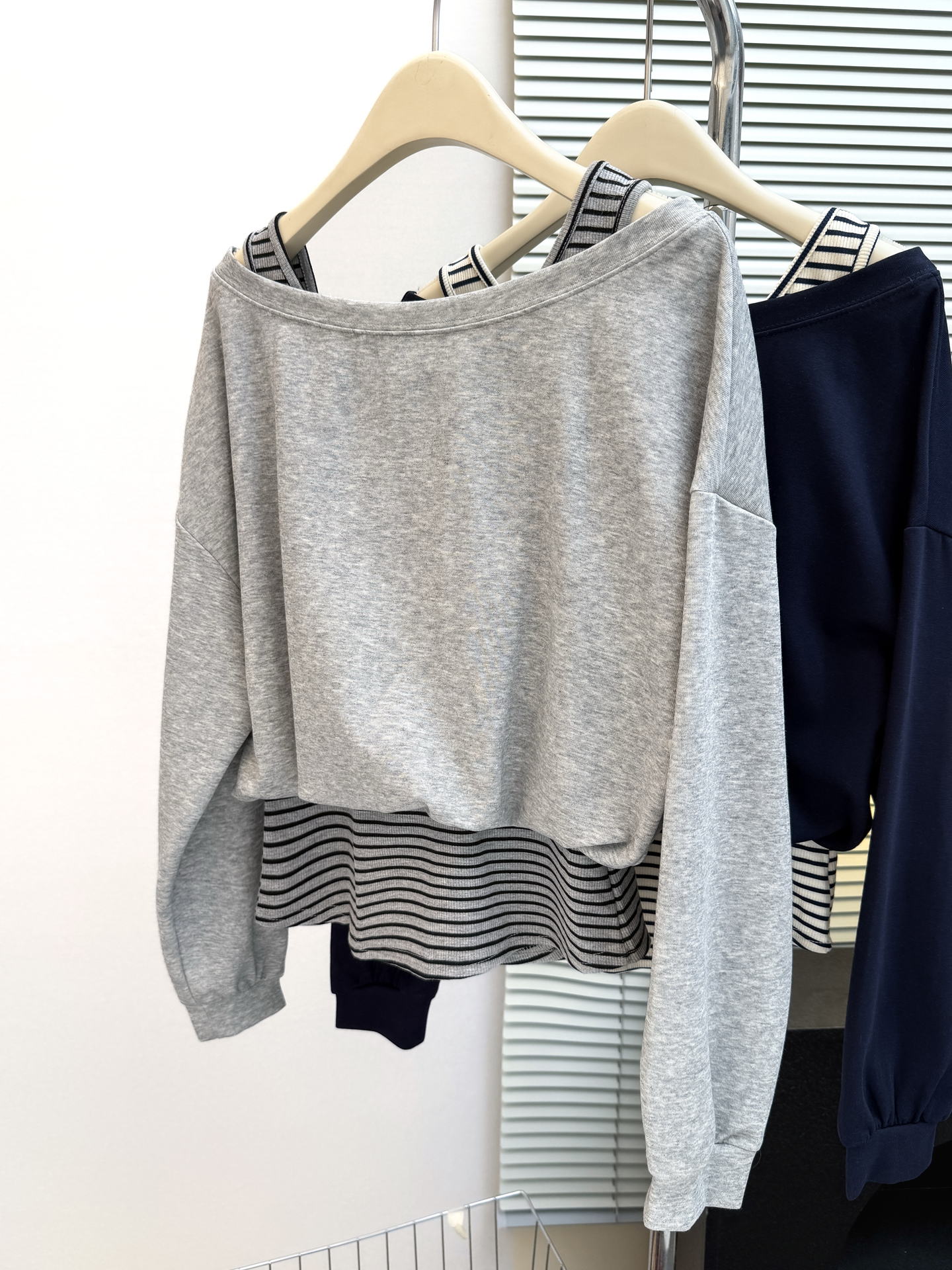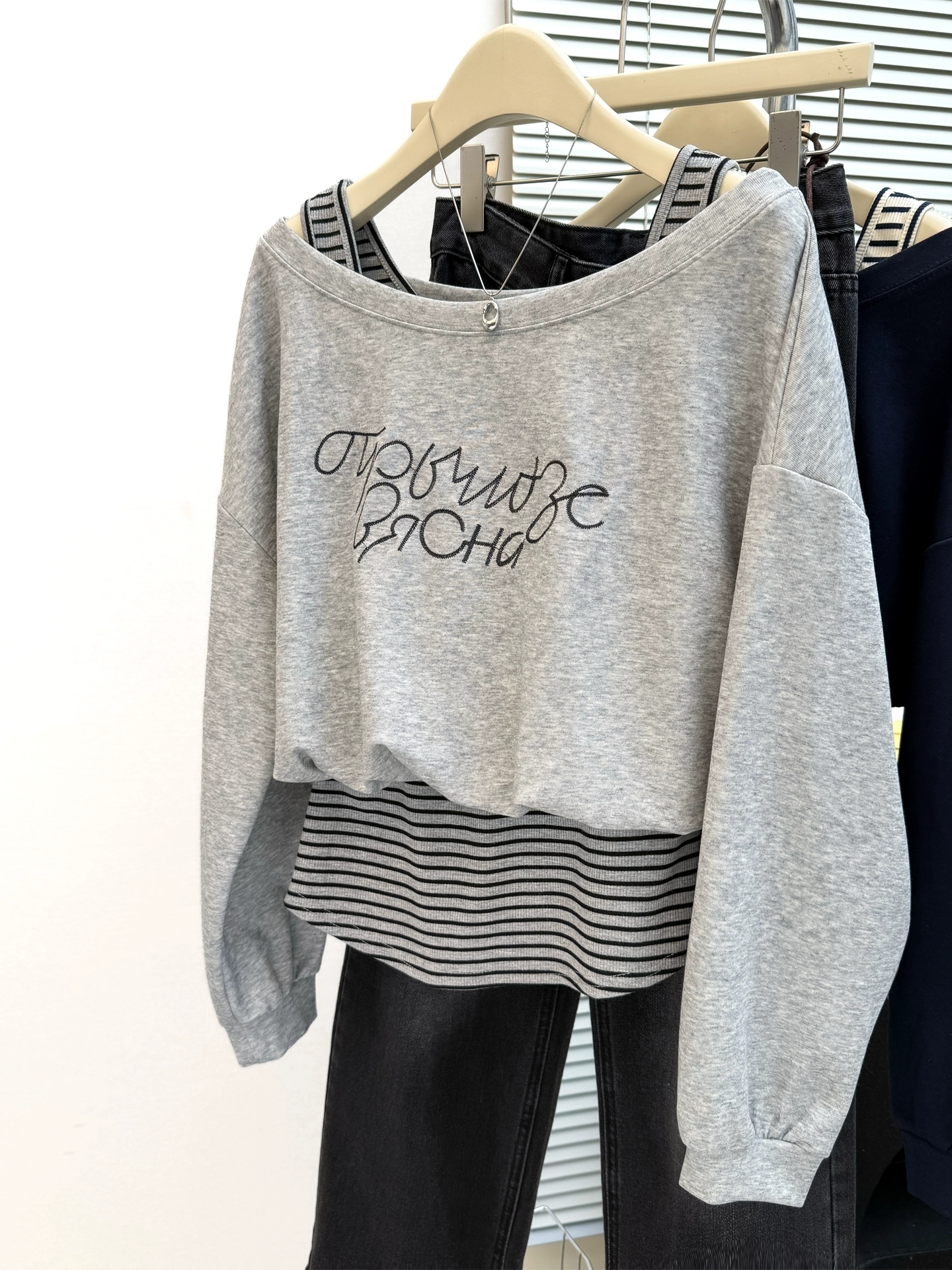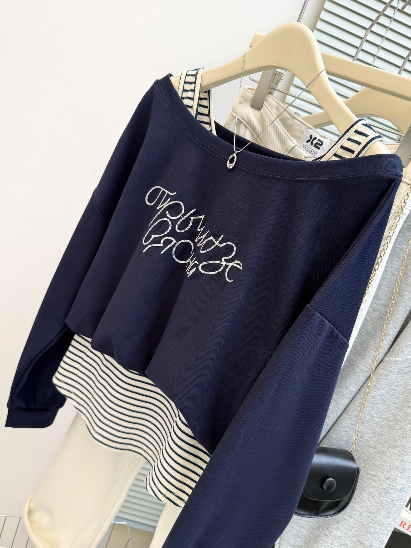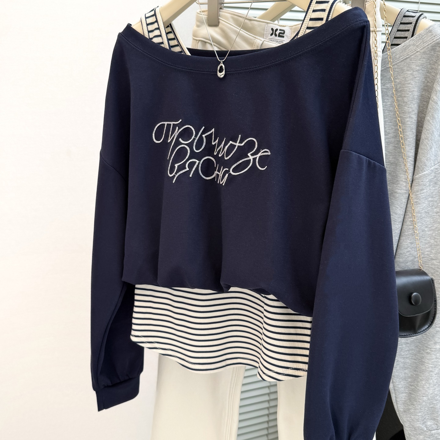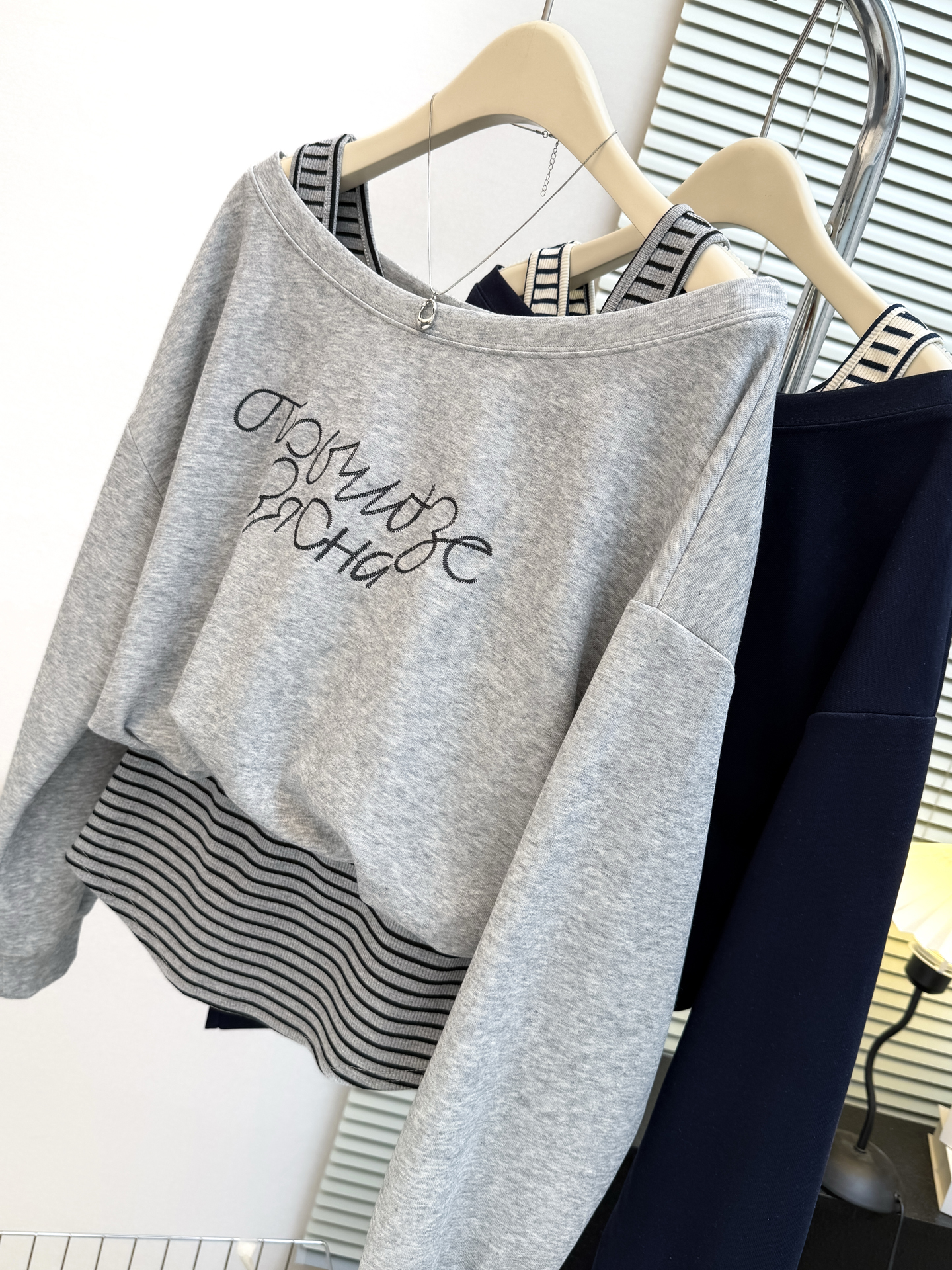 MY16255# 超火减龄露肩长袖卫衣大码女装胖mm假两件别致上衣女裝貨源服裝批發