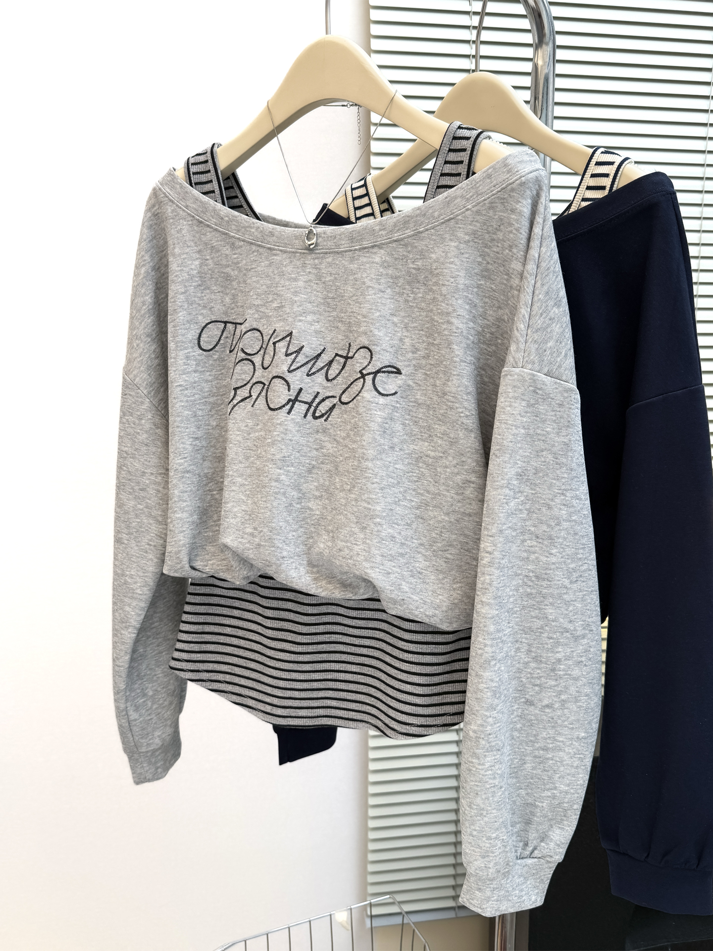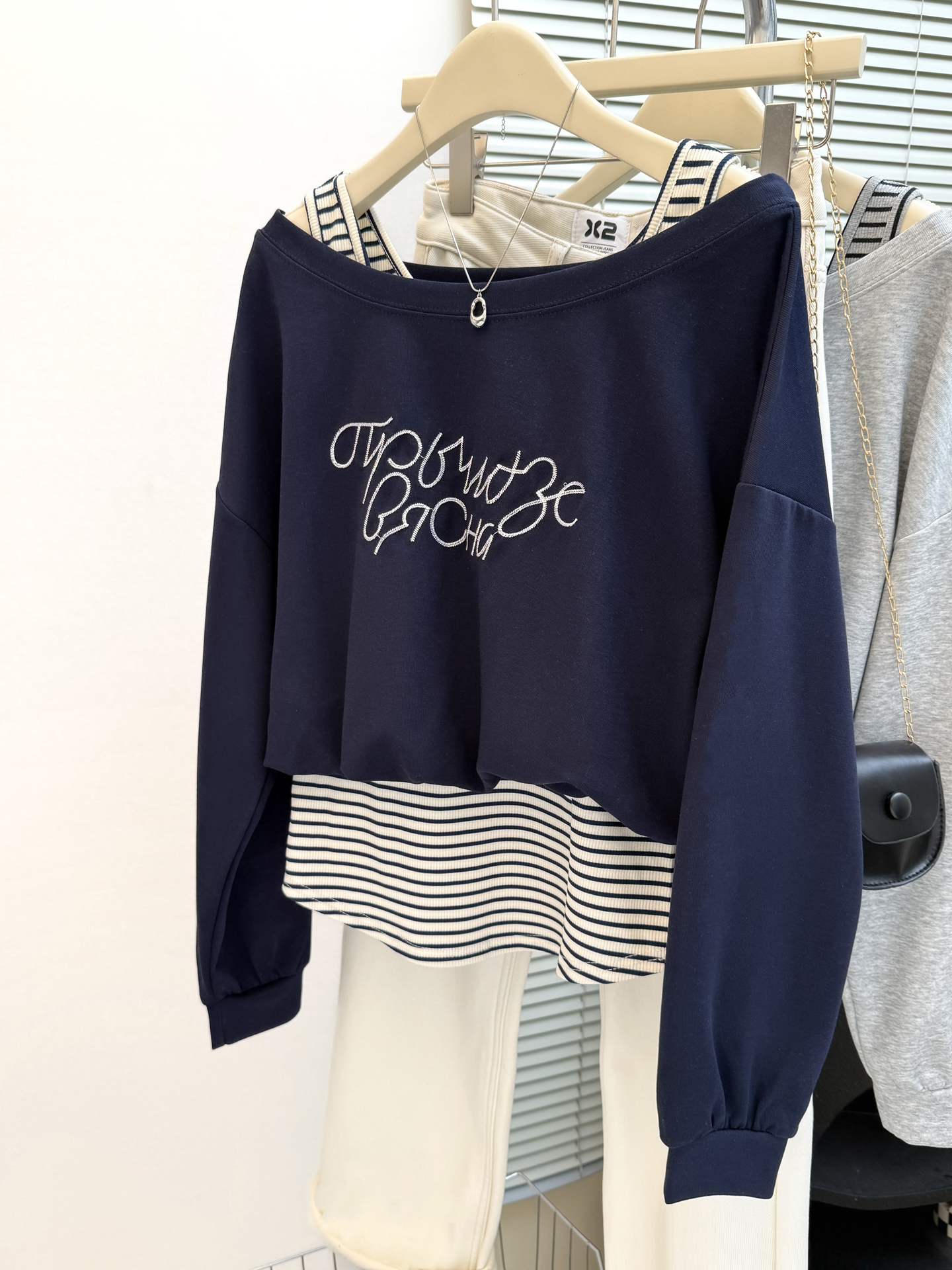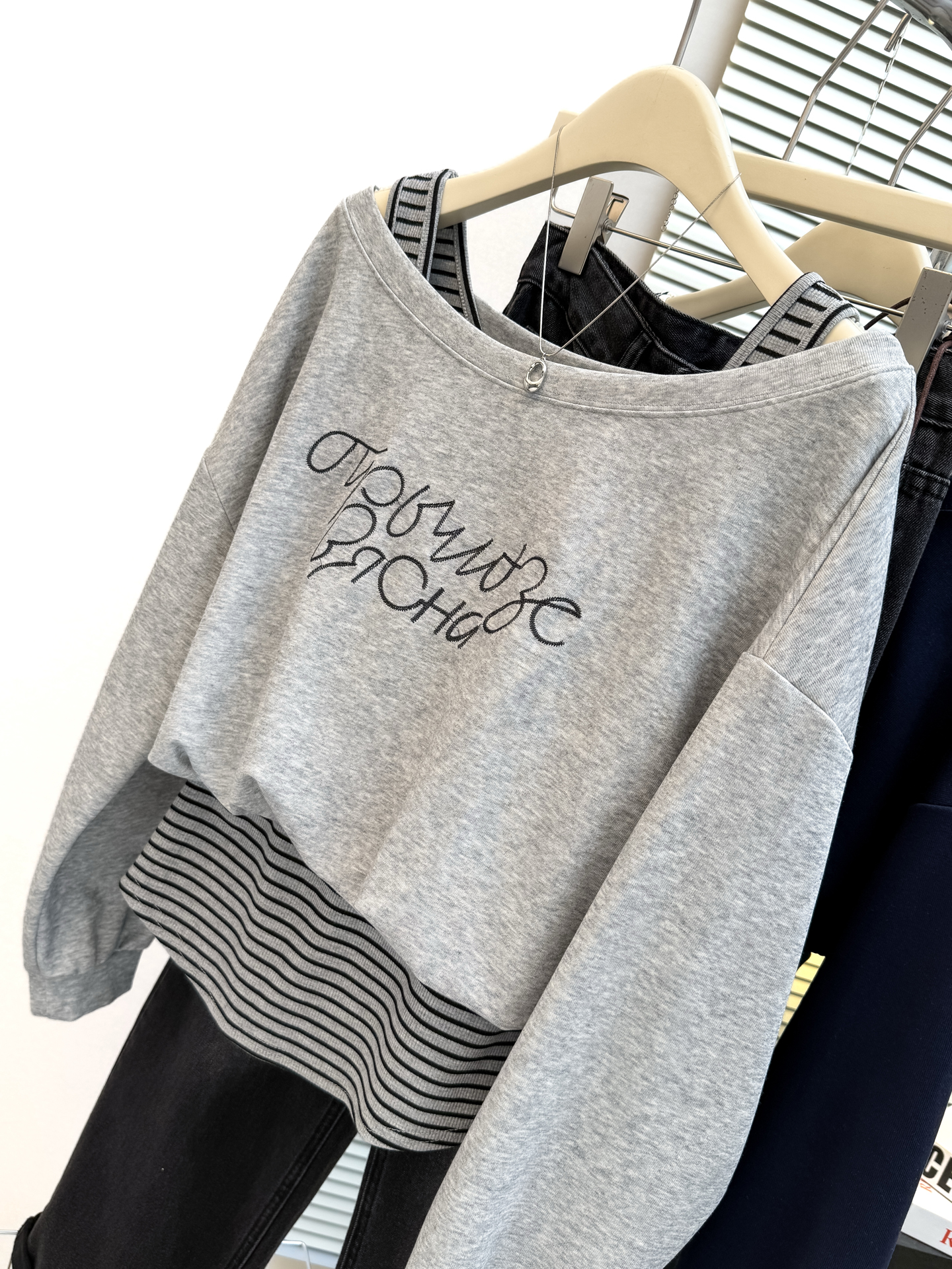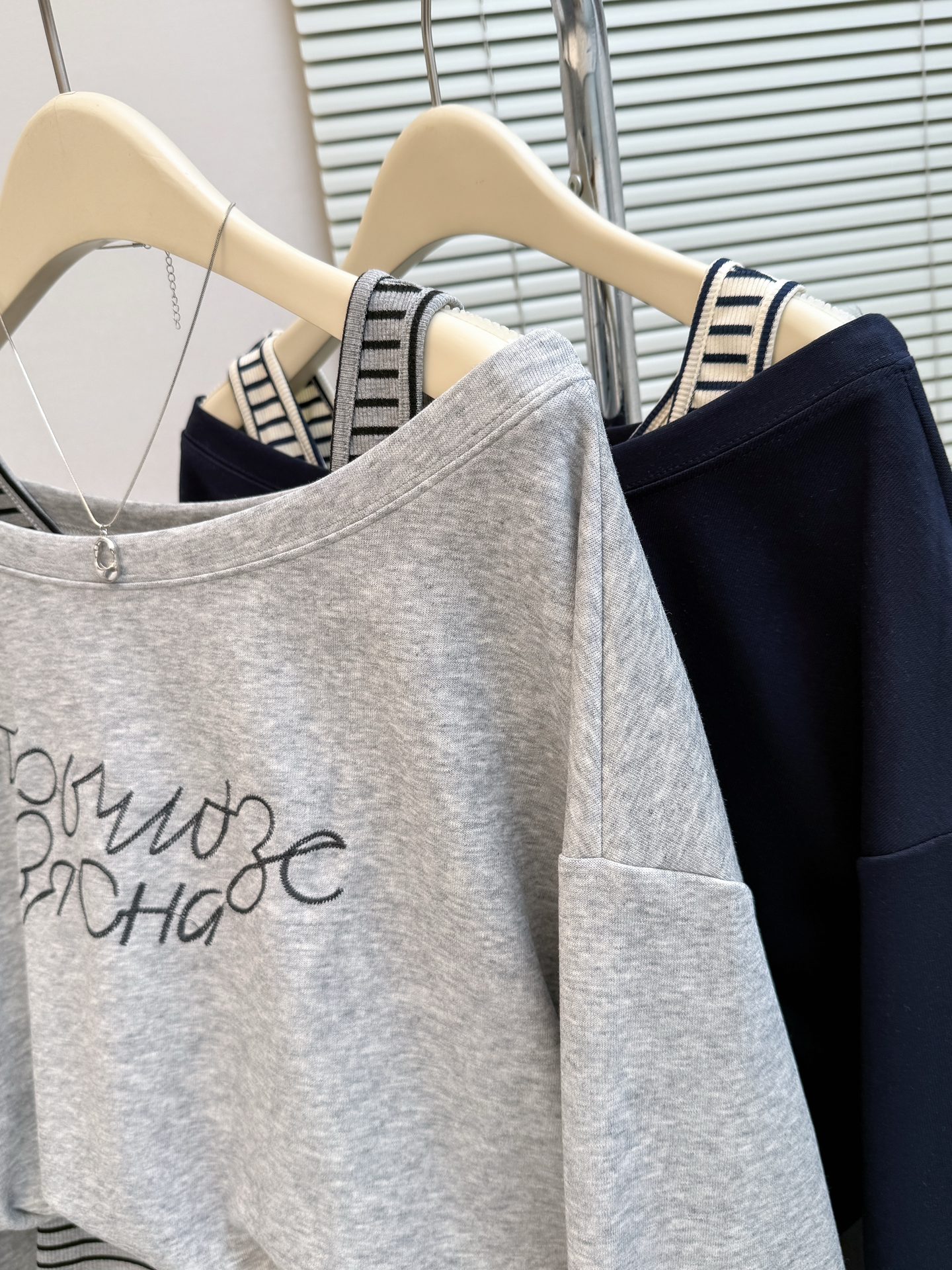 MY16255# 超火减龄露肩长袖卫衣大码女装胖mm假两件别致上衣女裝貨源服裝批發