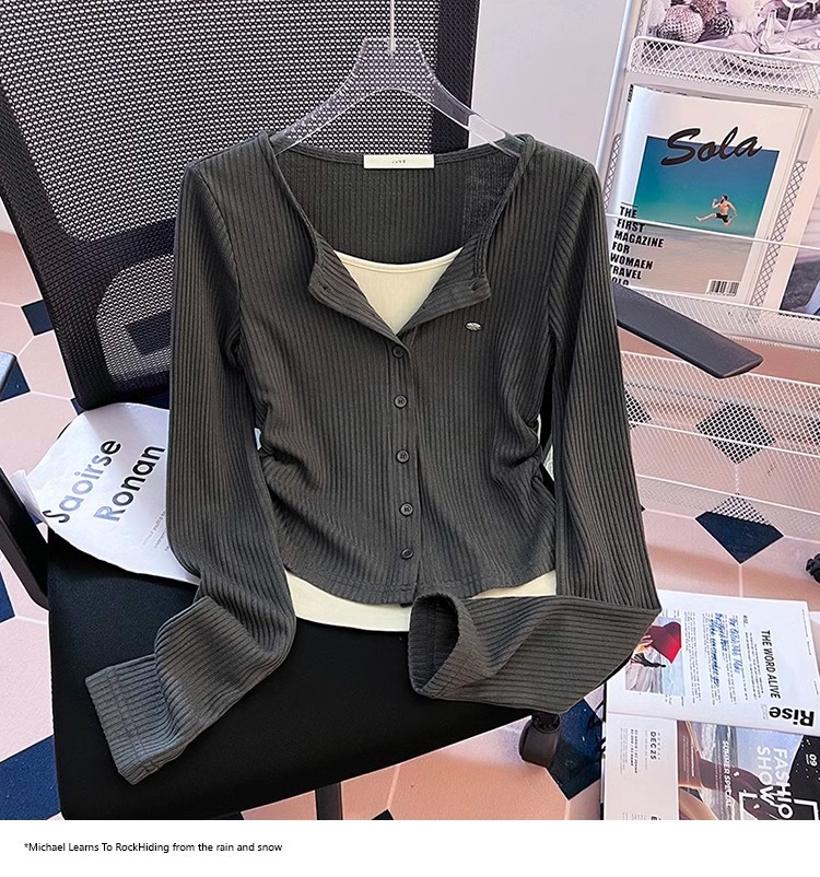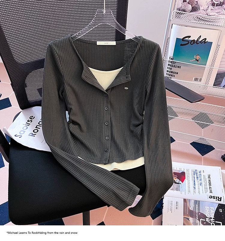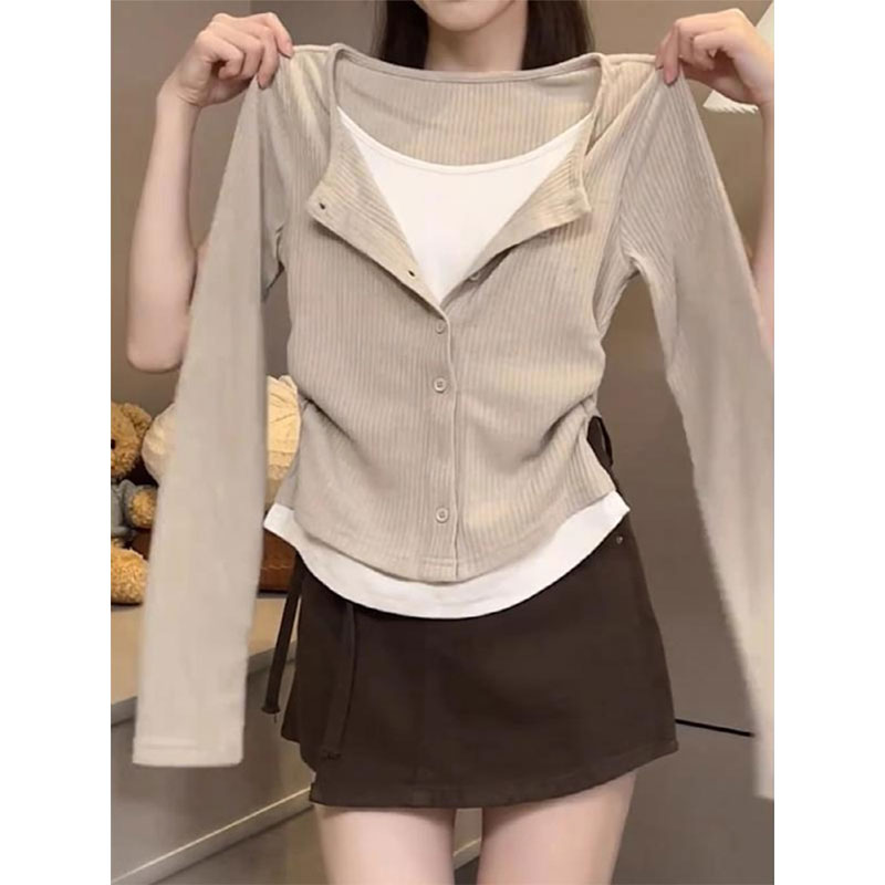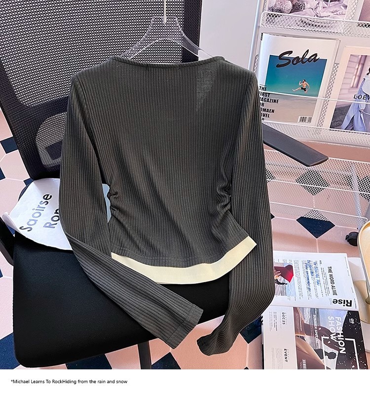 MY16267# 原版面料复古假两件长袖T恤女新款收腰内搭显瘦上衣女裝貨源服裝批發