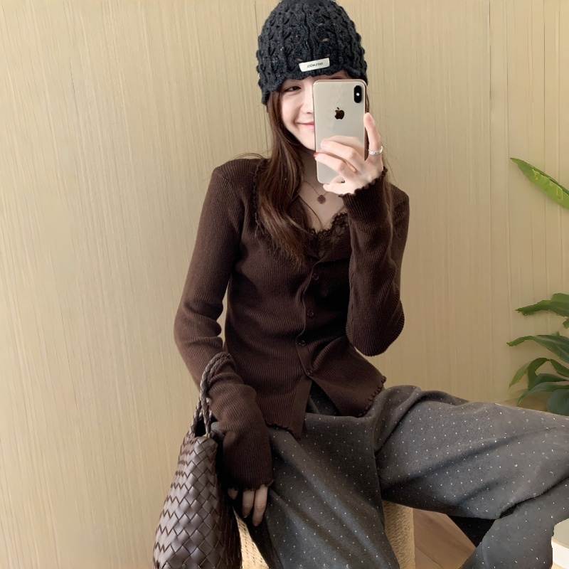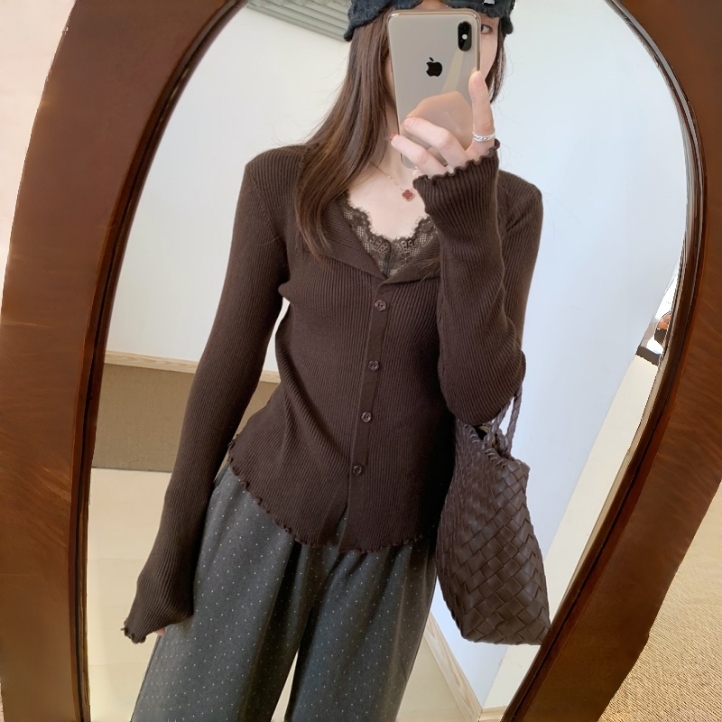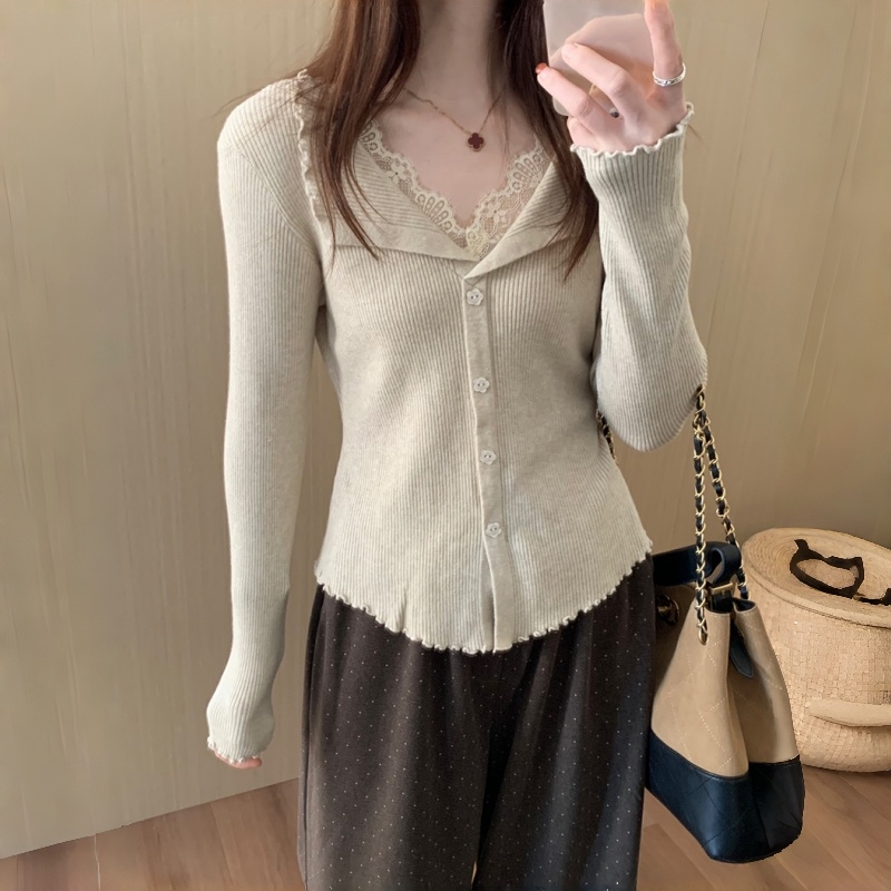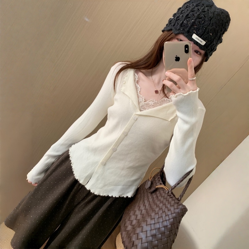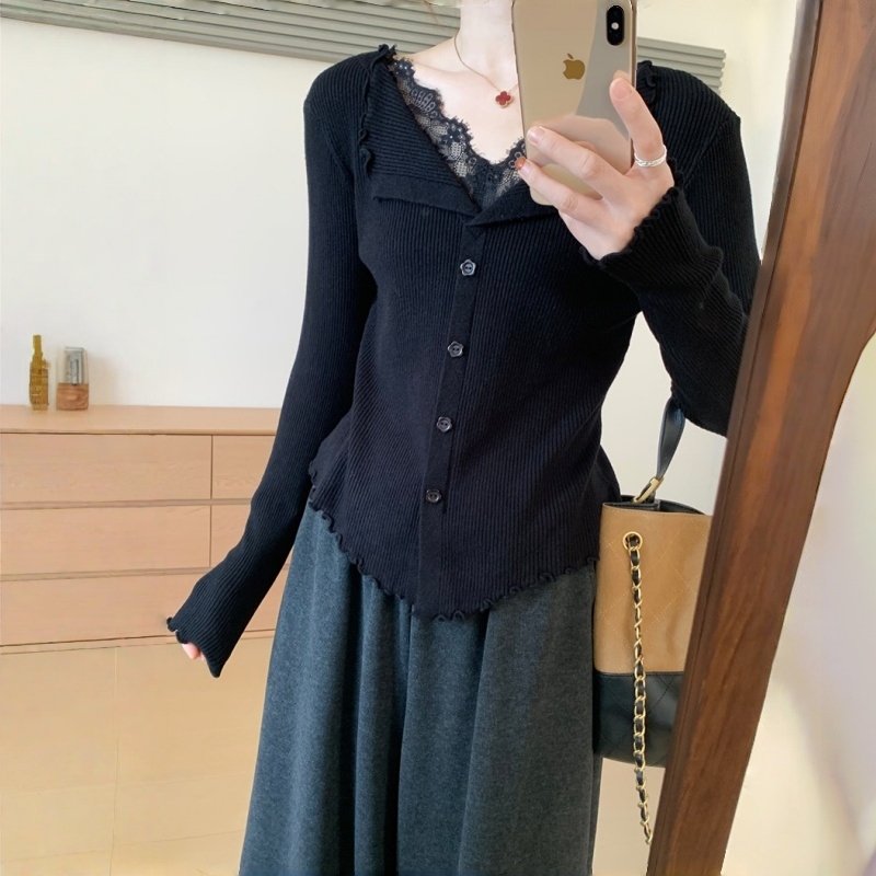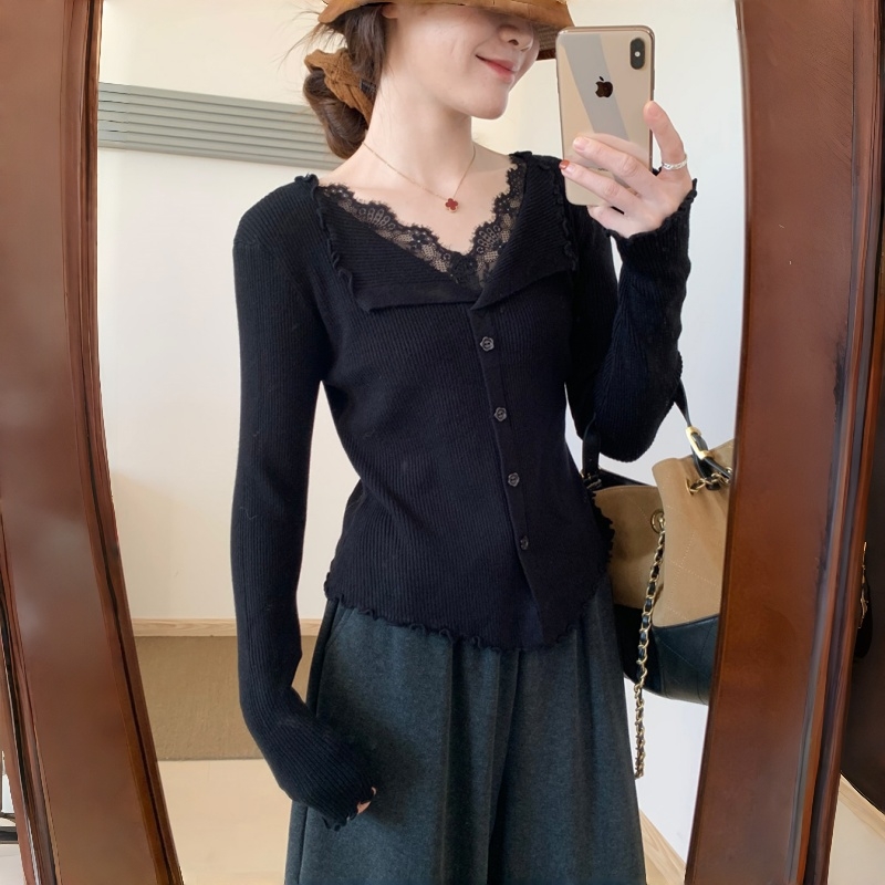RM29706#钉钻毛衣女秋冬设计拼接蕾丝交叉V领针织打底衫内搭长袖