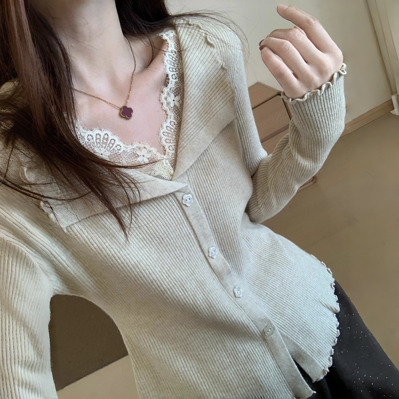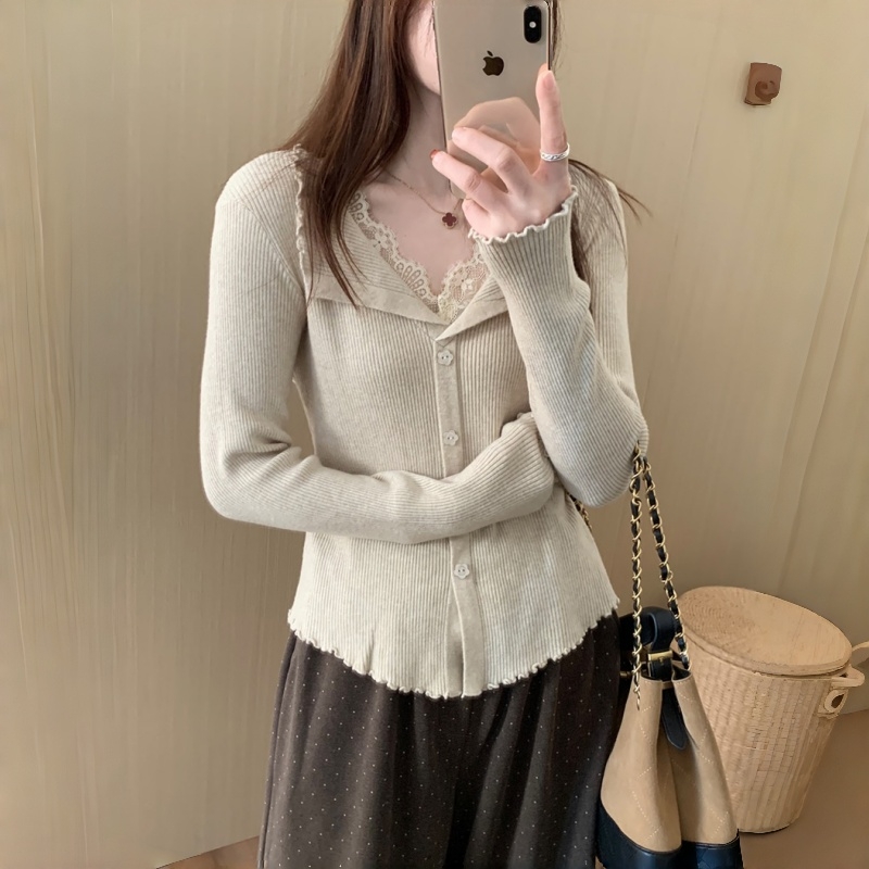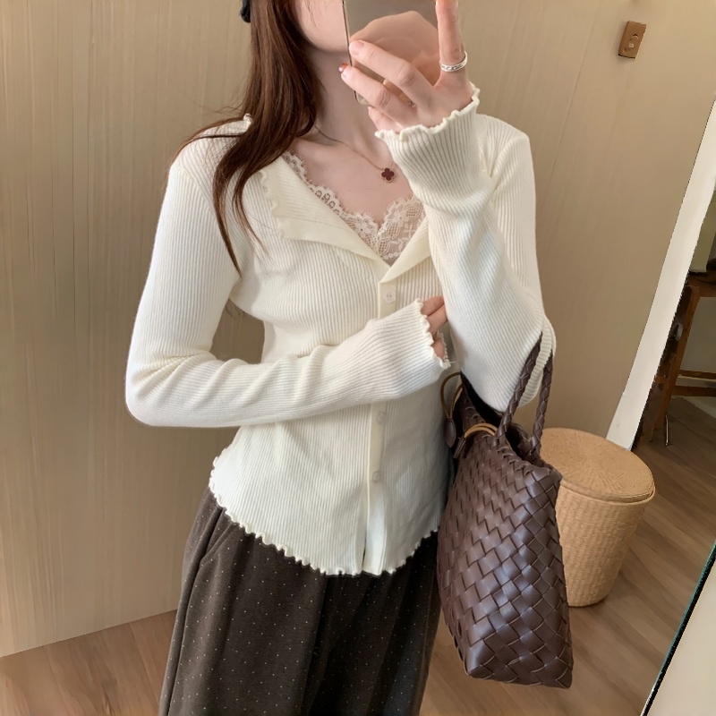 MY16268# 基础款细羊毛蕾丝假两件针织打底衫韩版微宽松气质百搭上衣女女裝貨源服裝批發