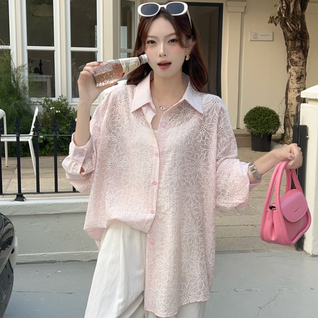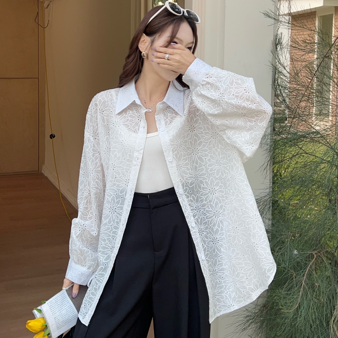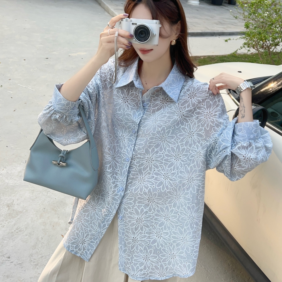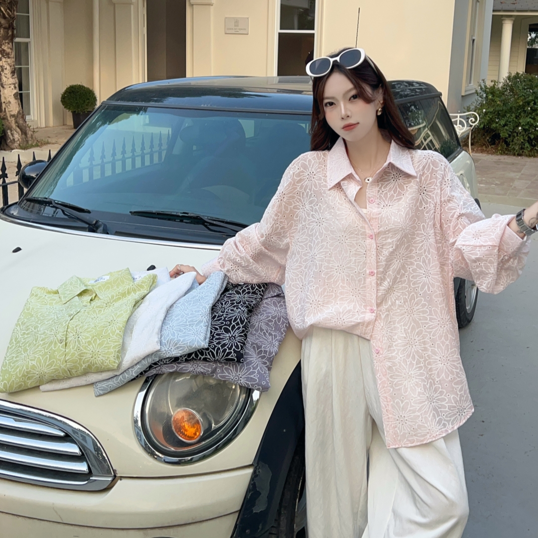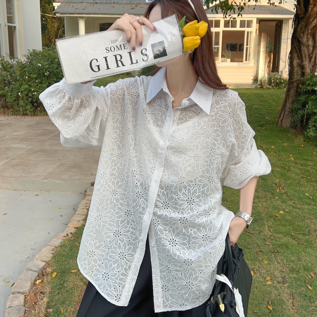 MY16270# 韩版春oversize宽松衬衫原宿风百搭镂空绣花休闲设计感衬衣外套女女裝貨源服裝批發