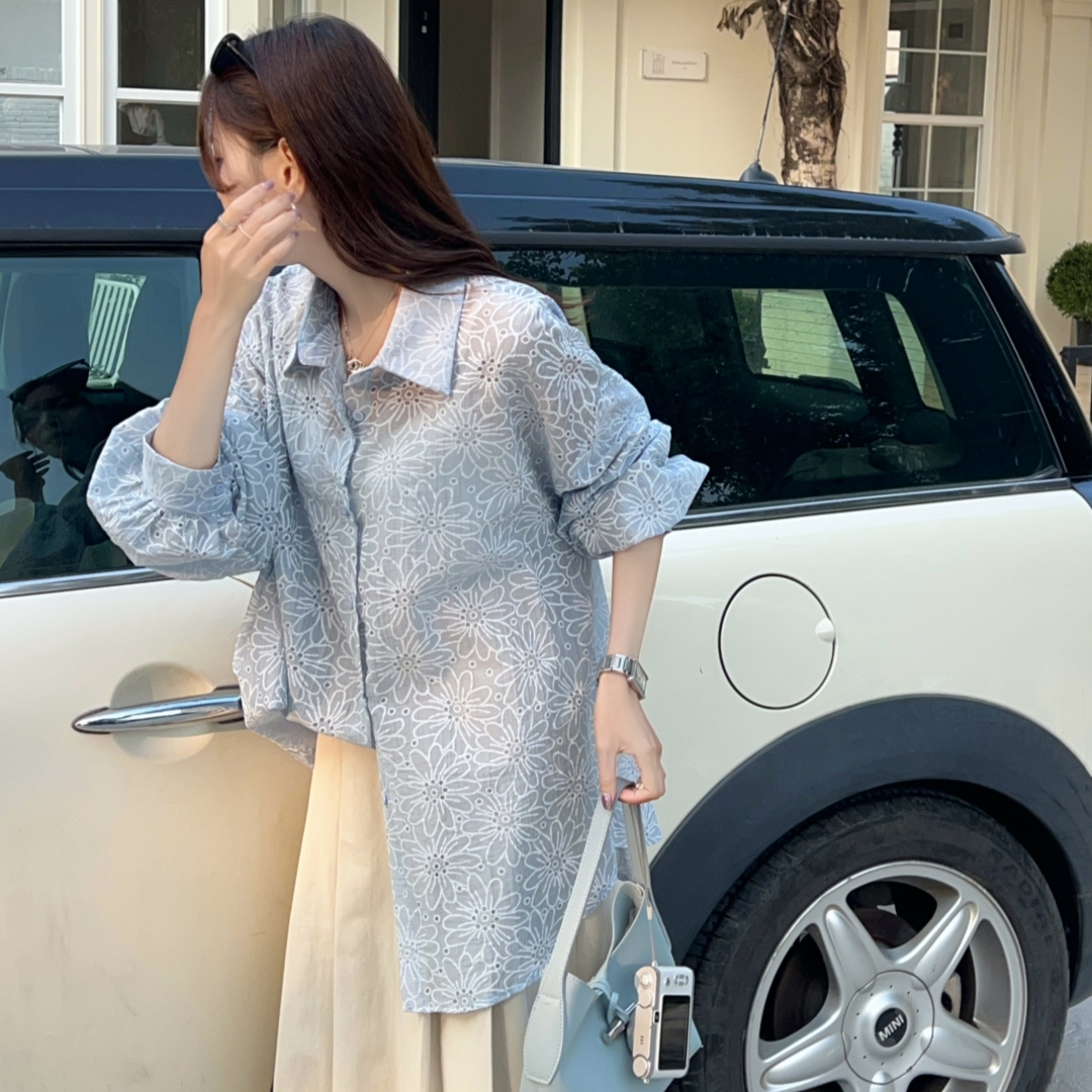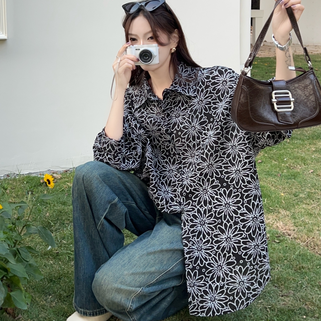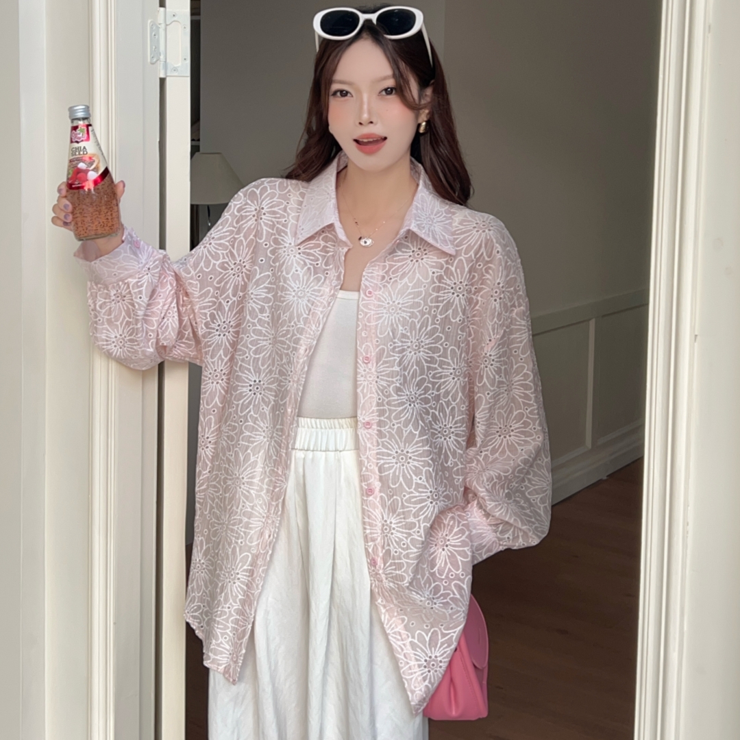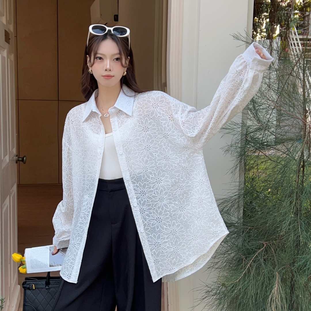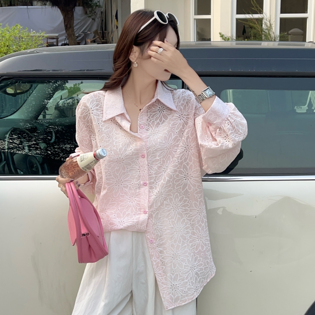 MY16270# 韩版春oversize宽松衬衫原宿风百搭镂空绣花休闲设计感衬衣外套女女裝貨源服裝批發