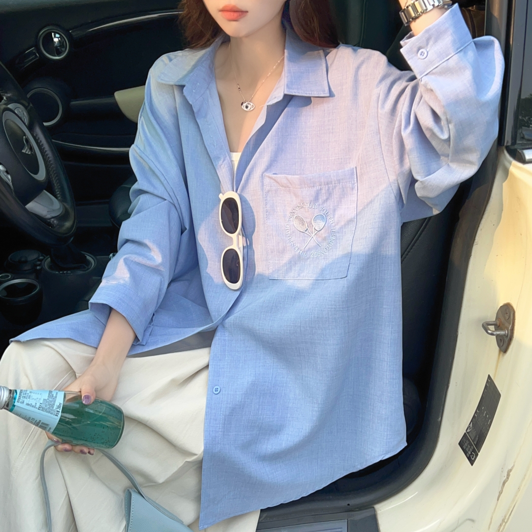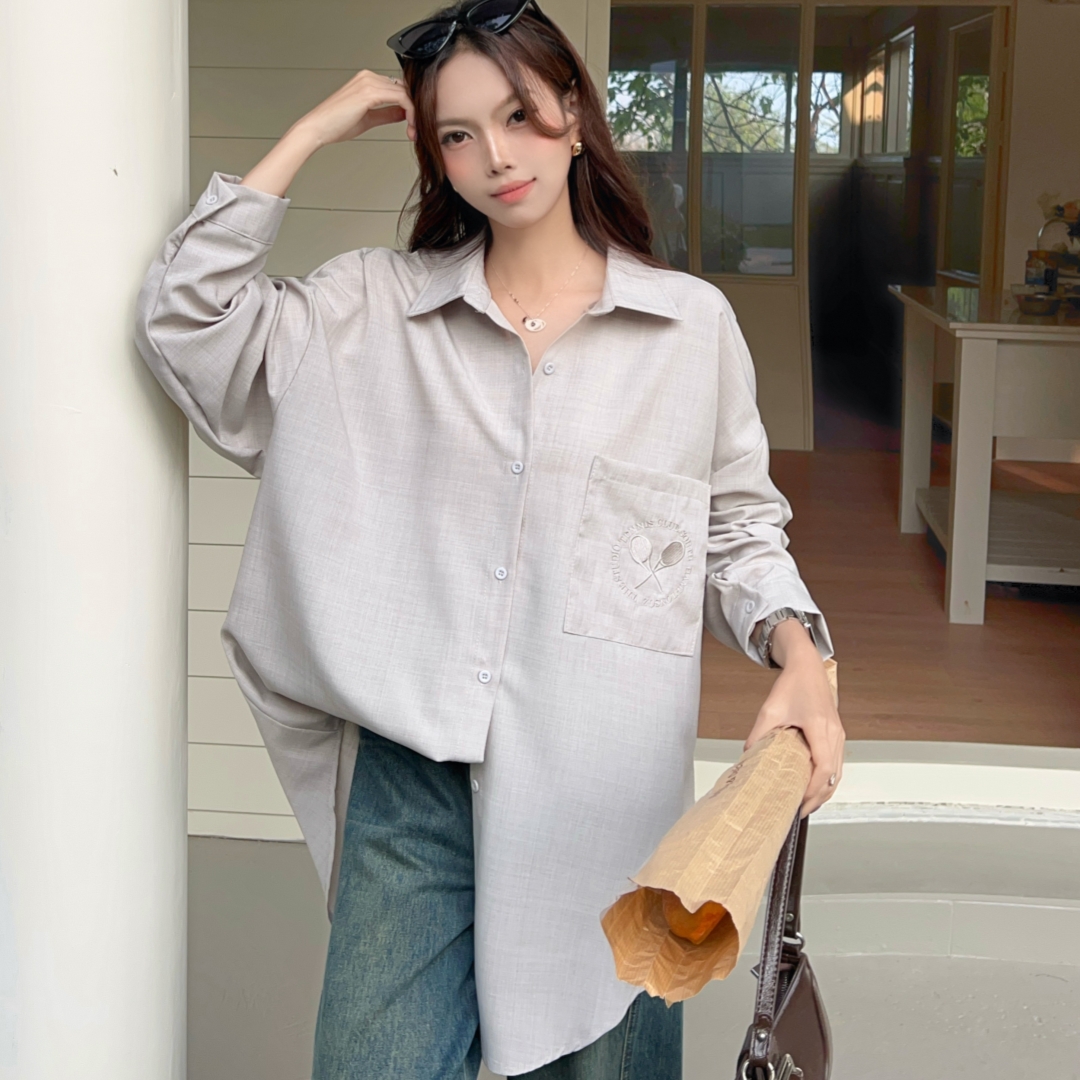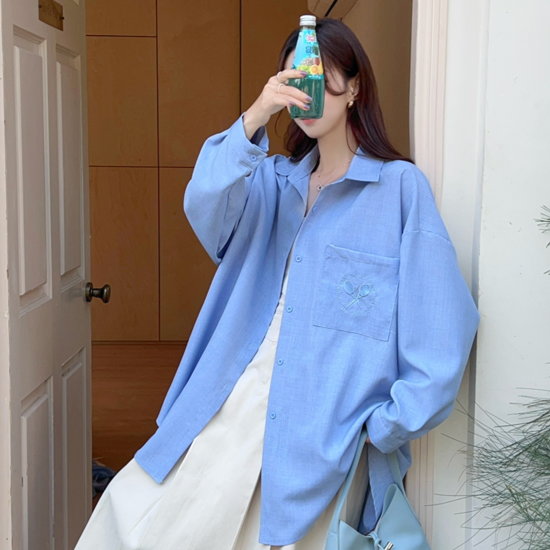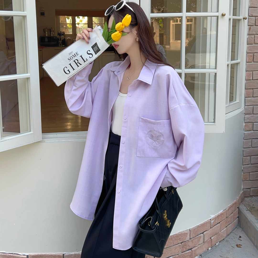 MY16272# 韩版春oversize去拍刺绣宽松衬衫原宿风简约纯色设计感衬衣外套女女裝貨源服裝批發
