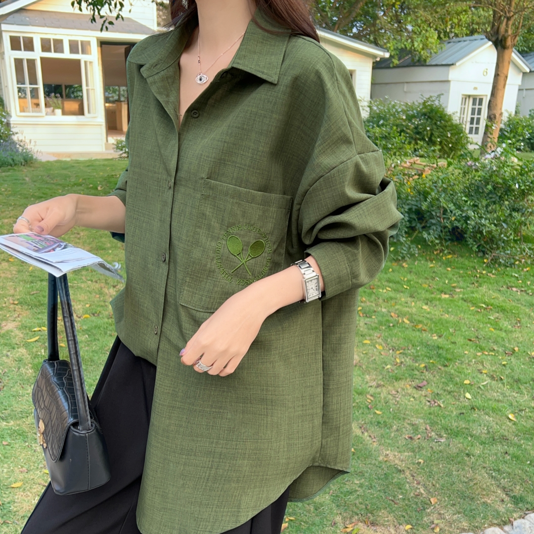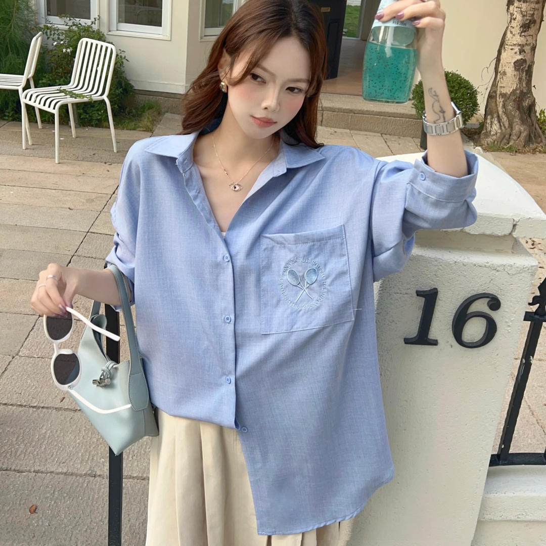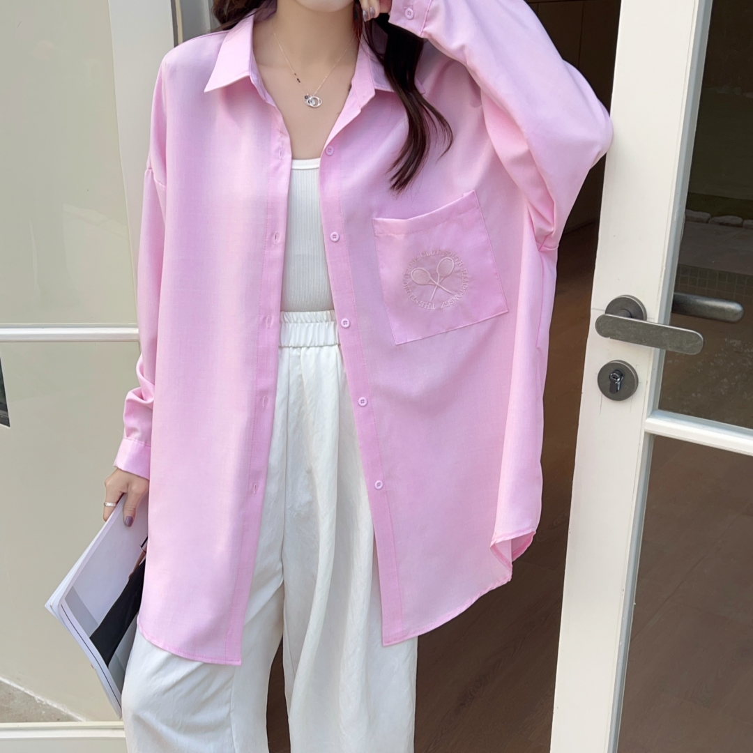 MY16272# 韩版春oversize去拍刺绣宽松衬衫原宿风简约纯色设计感衬衣外套女女裝貨源服裝批發