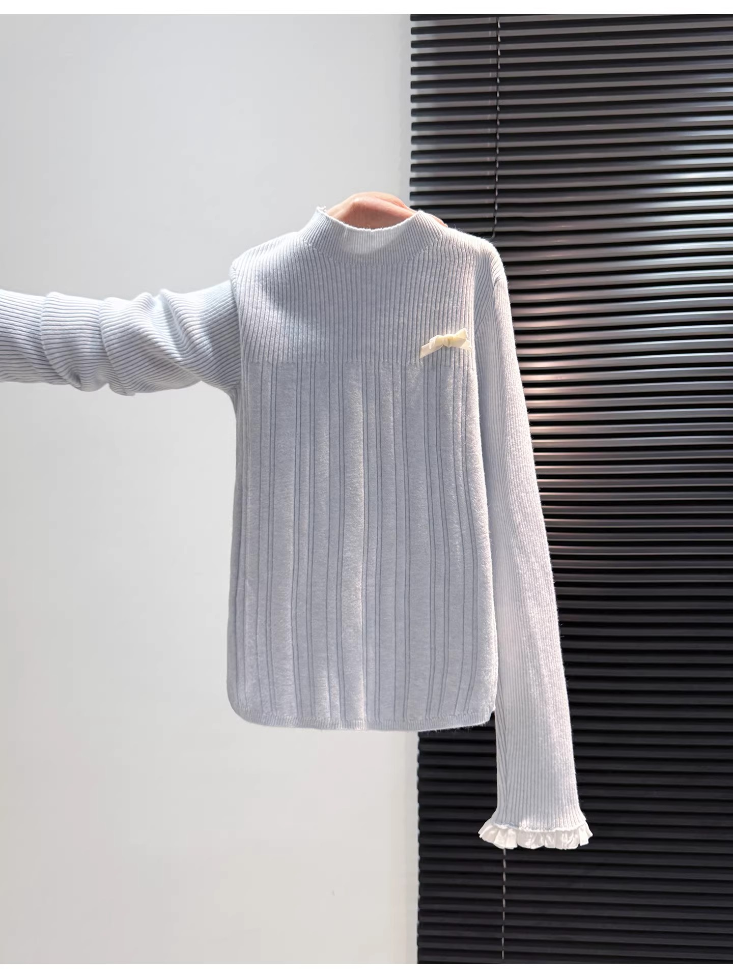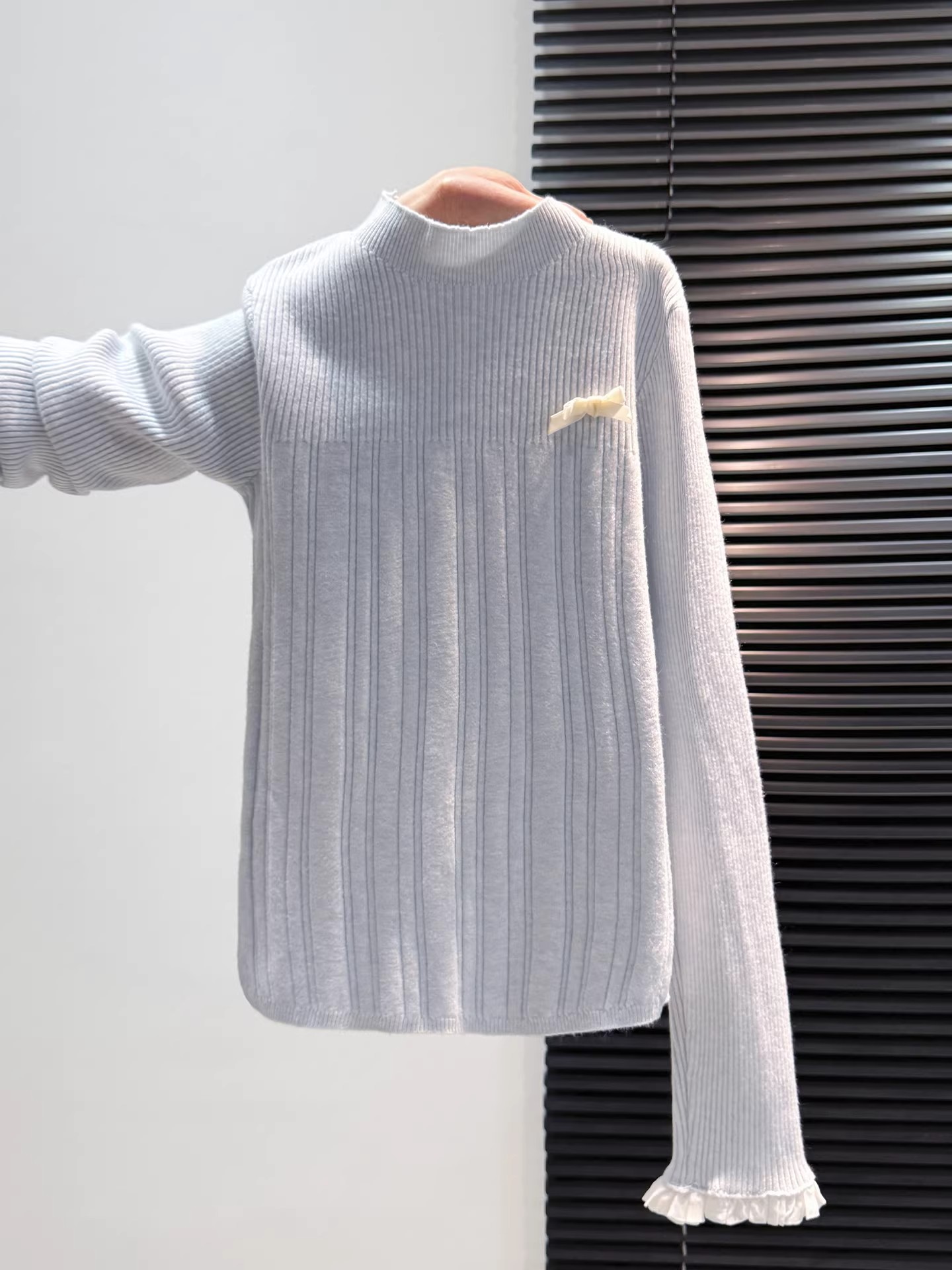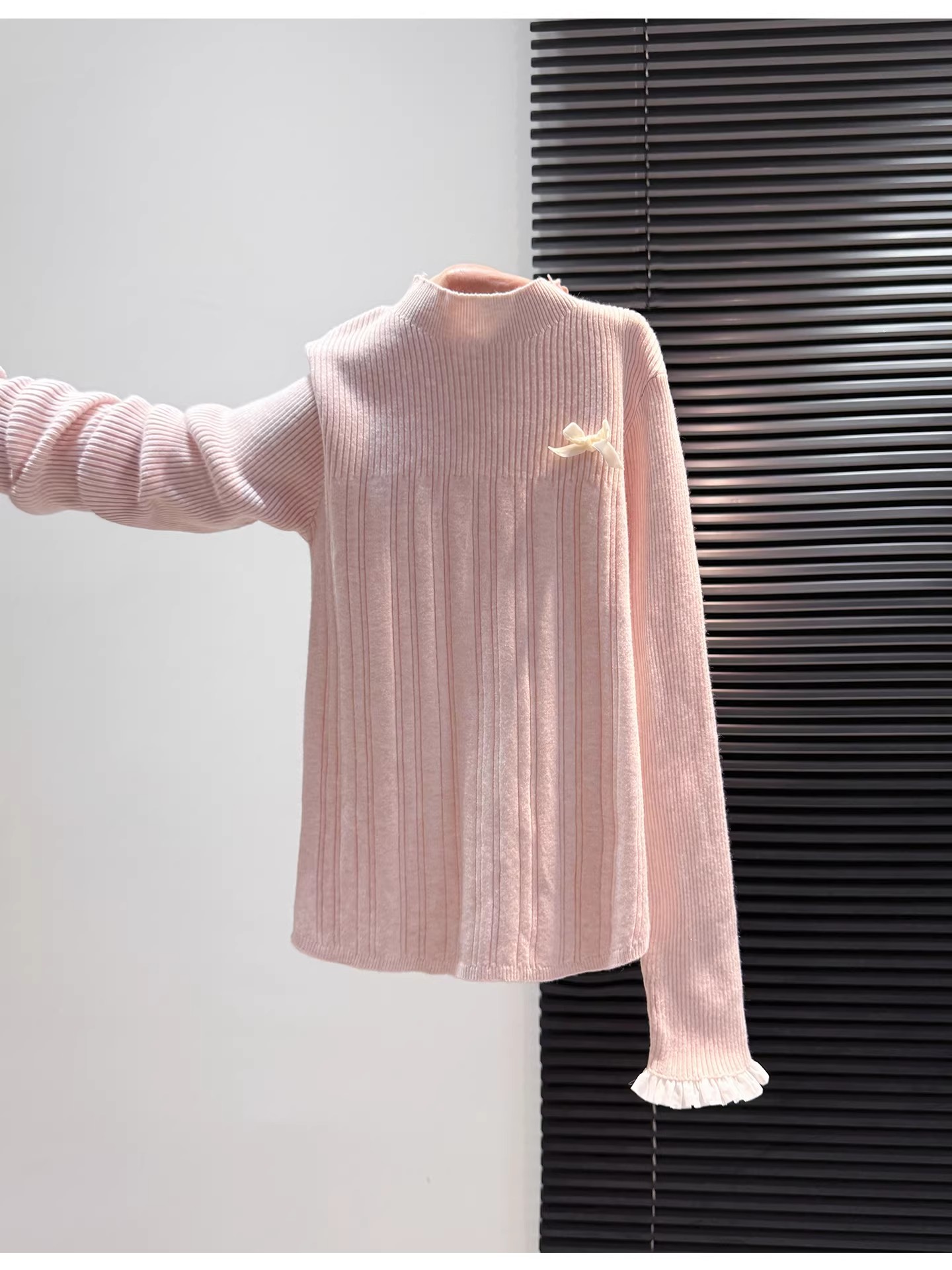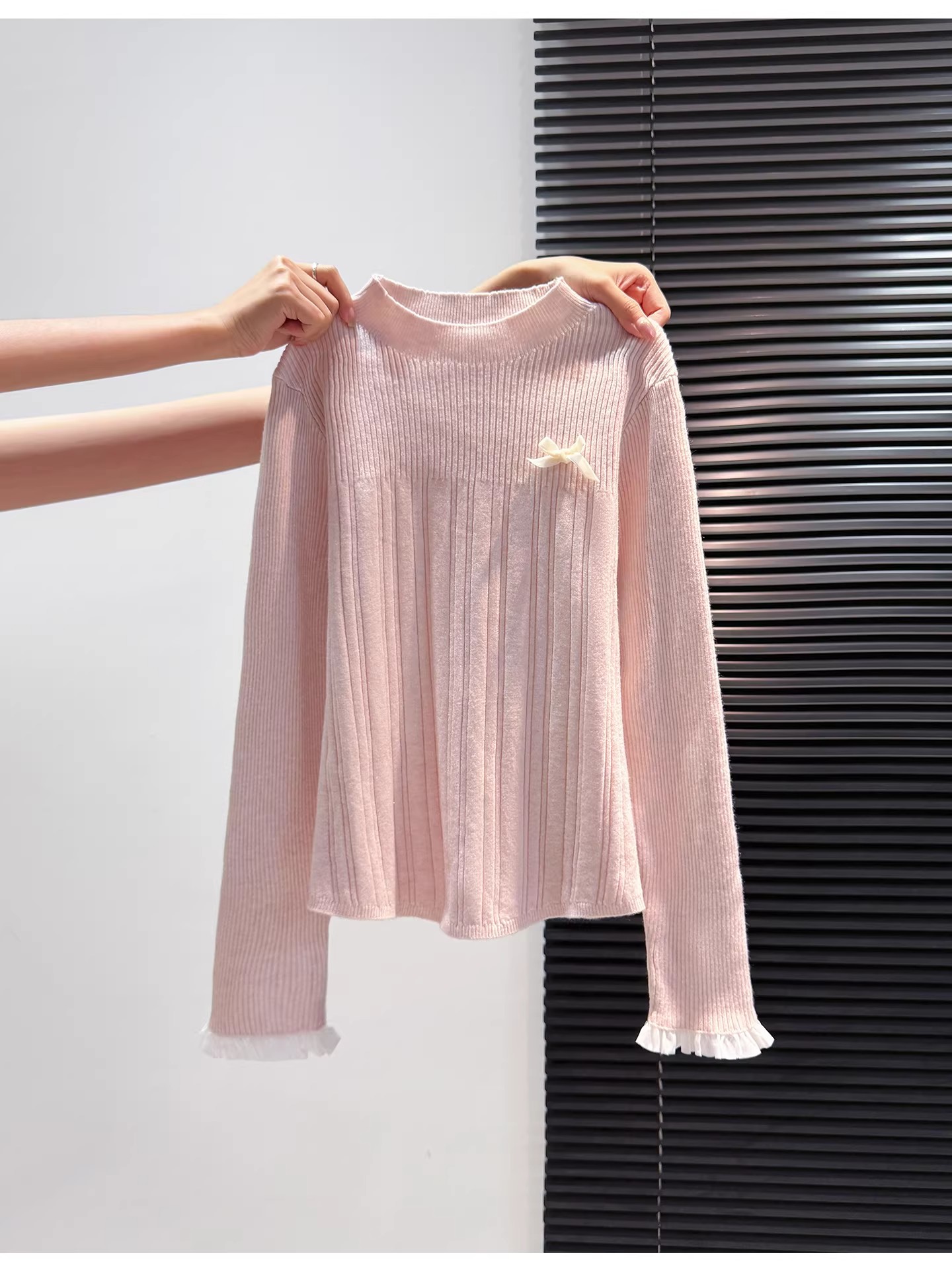 MY16298# 蝴蝶结蕾丝拼接针织衫女内搭半高领打底衫粉色独特漂亮减龄款上衣女裝貨源服裝批發