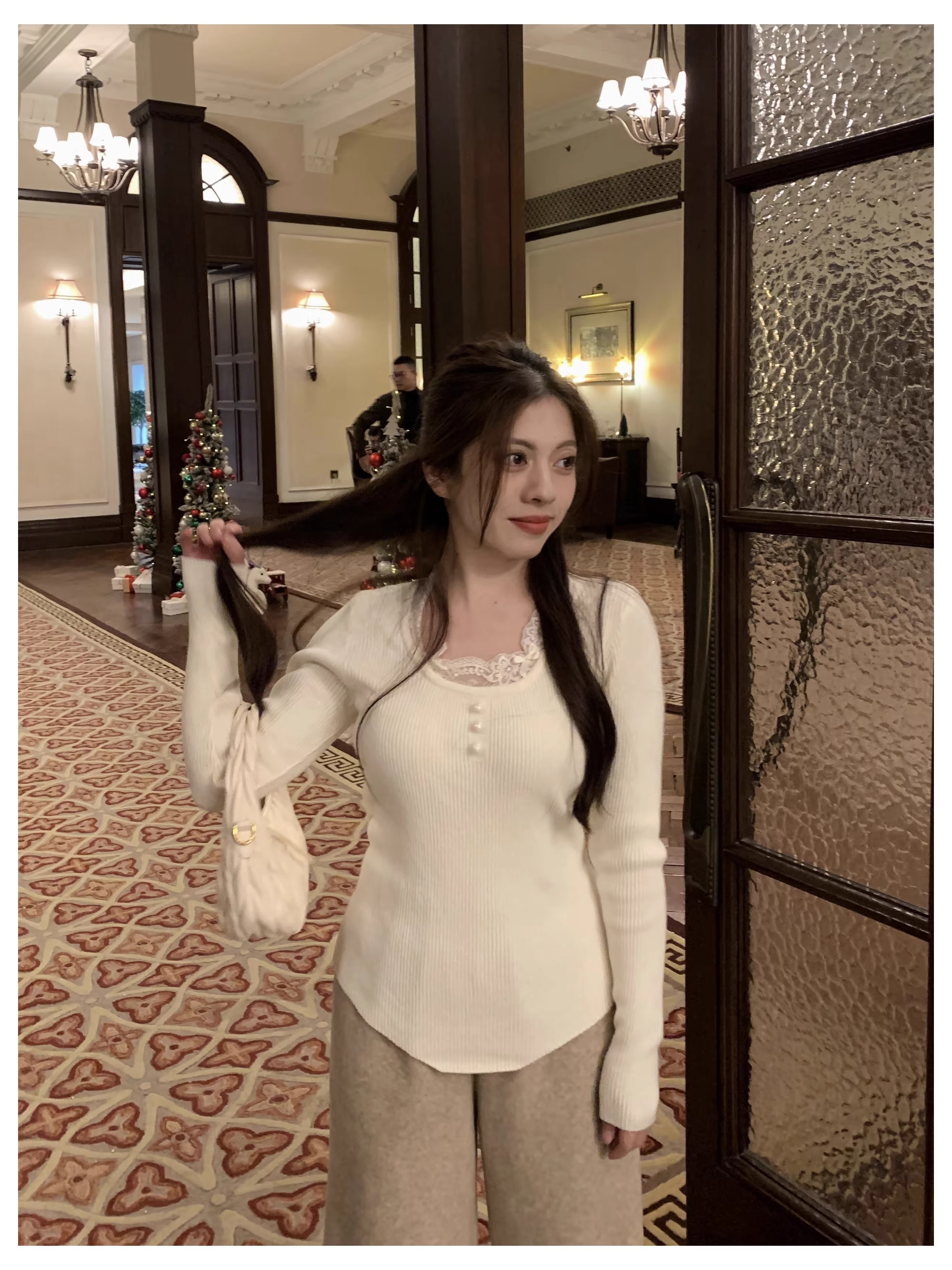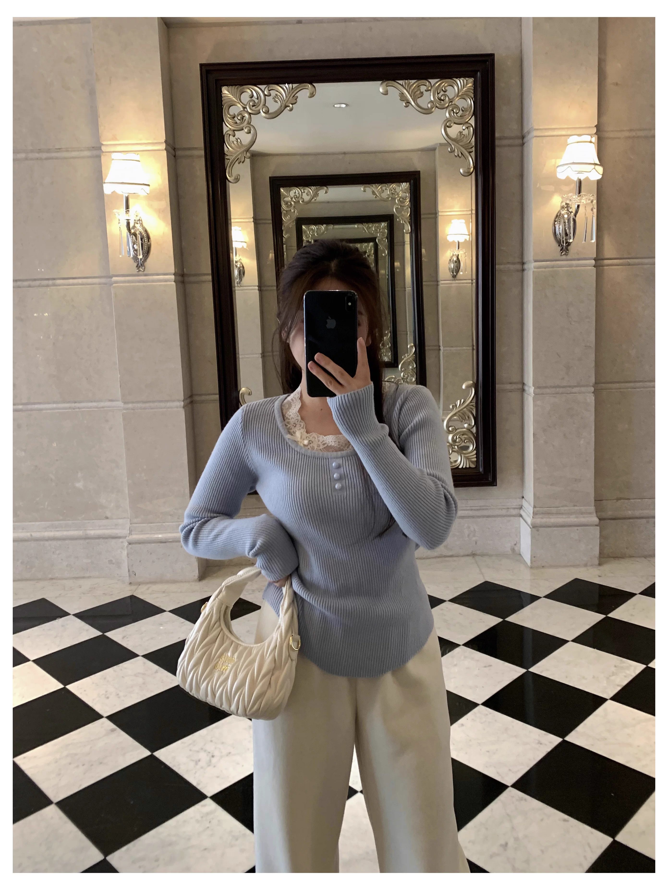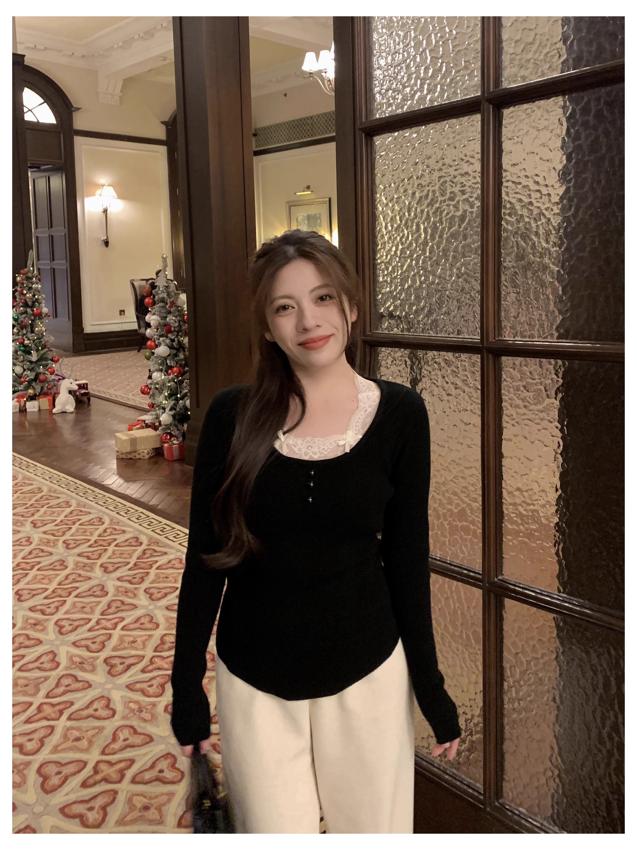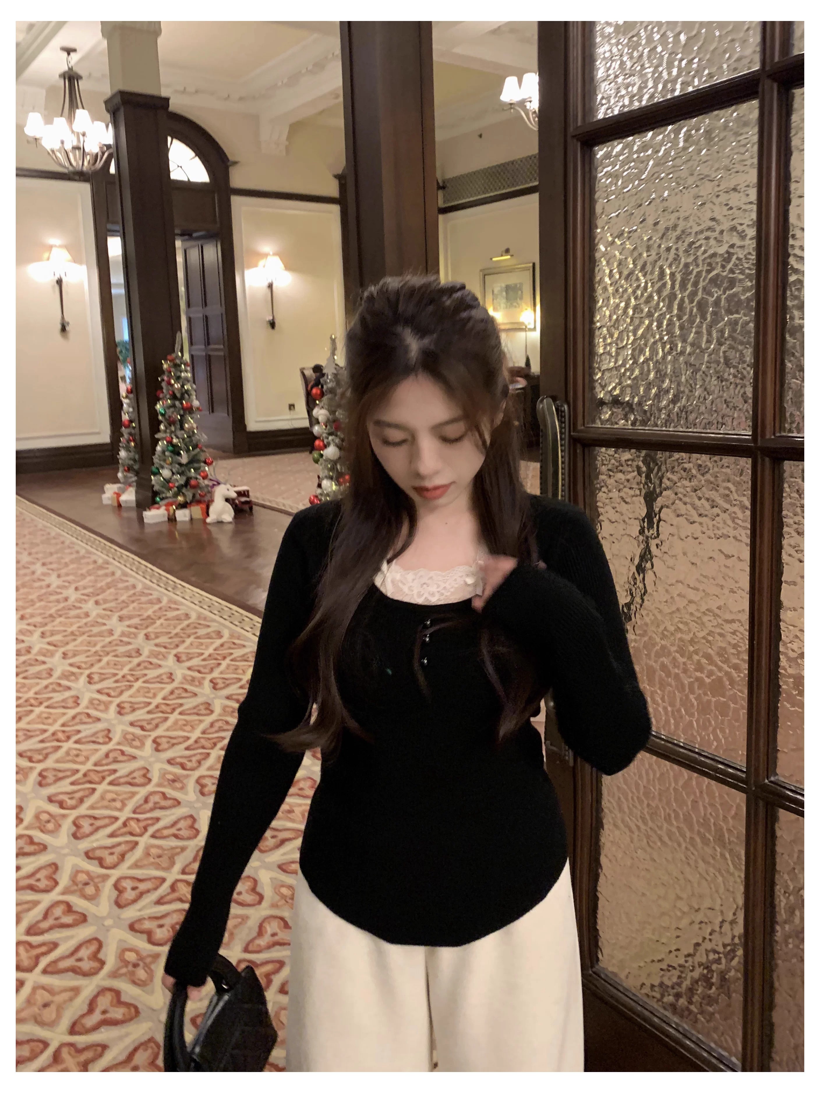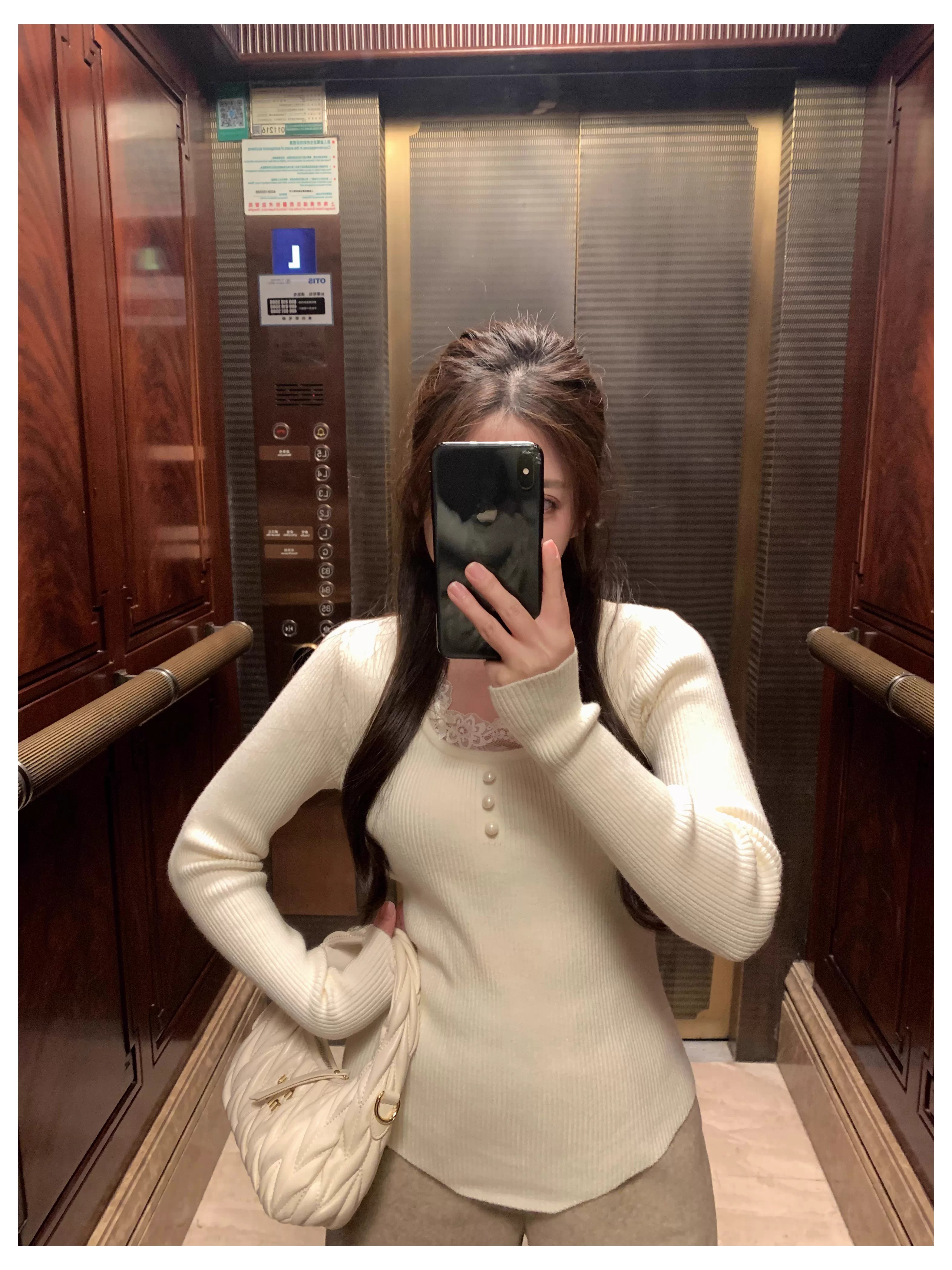 MY16302# 小个子蕾丝针织衫修身内搭上衣秋冬季毛衣打底衫长袖女裝貨源服裝批發