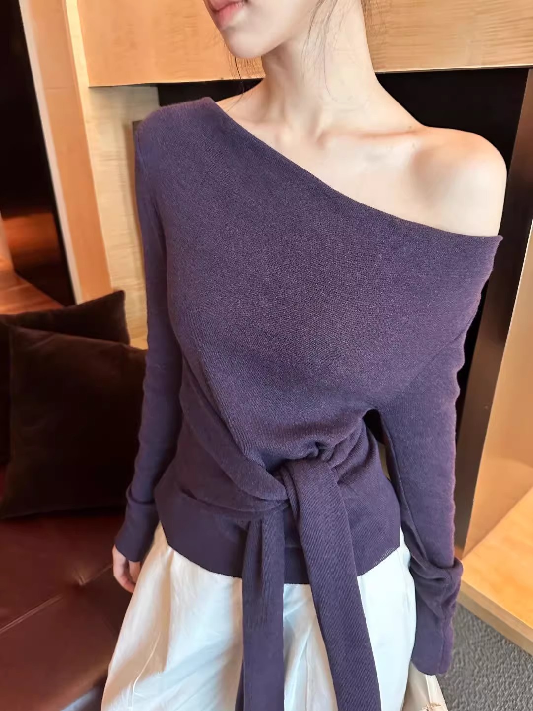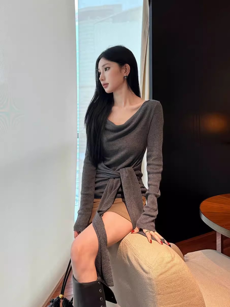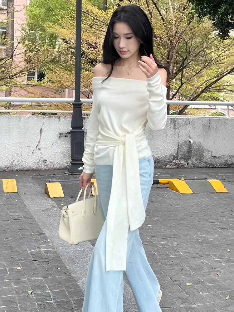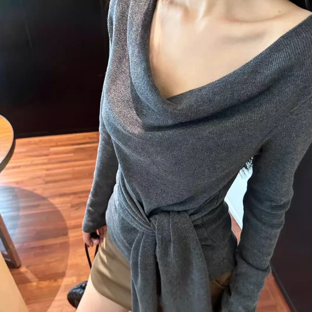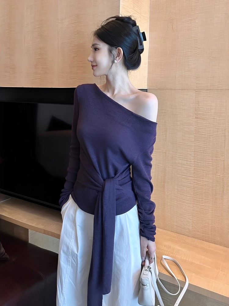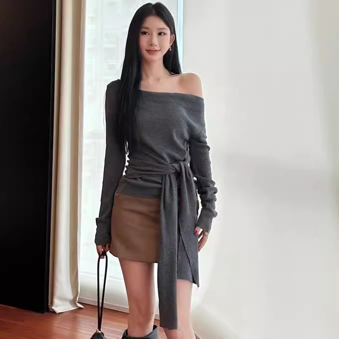 MY16304# 斜肩系带收腰长袖针织衫新款修身打底衫独特漂亮洋气上衣潮女裝貨源服裝批發