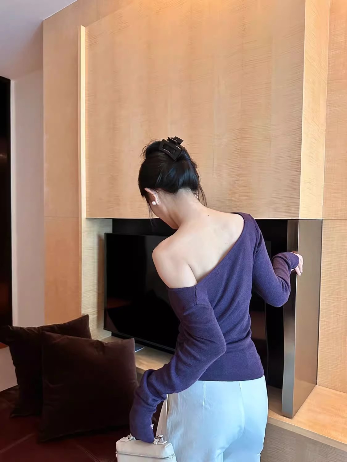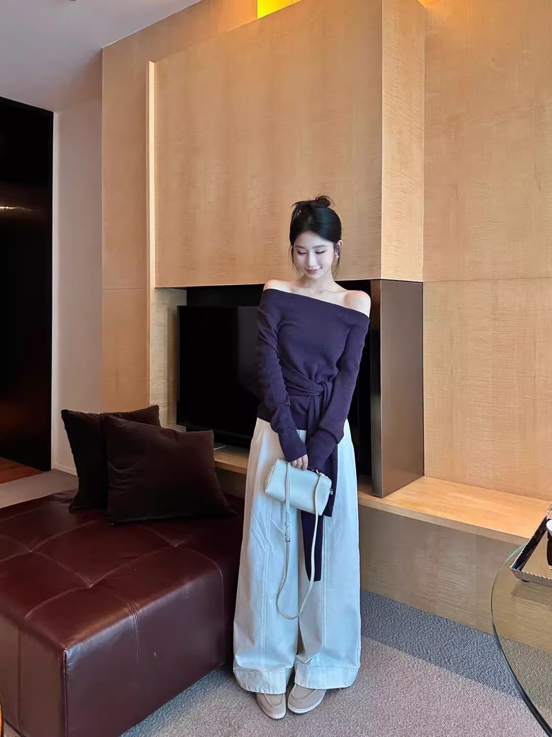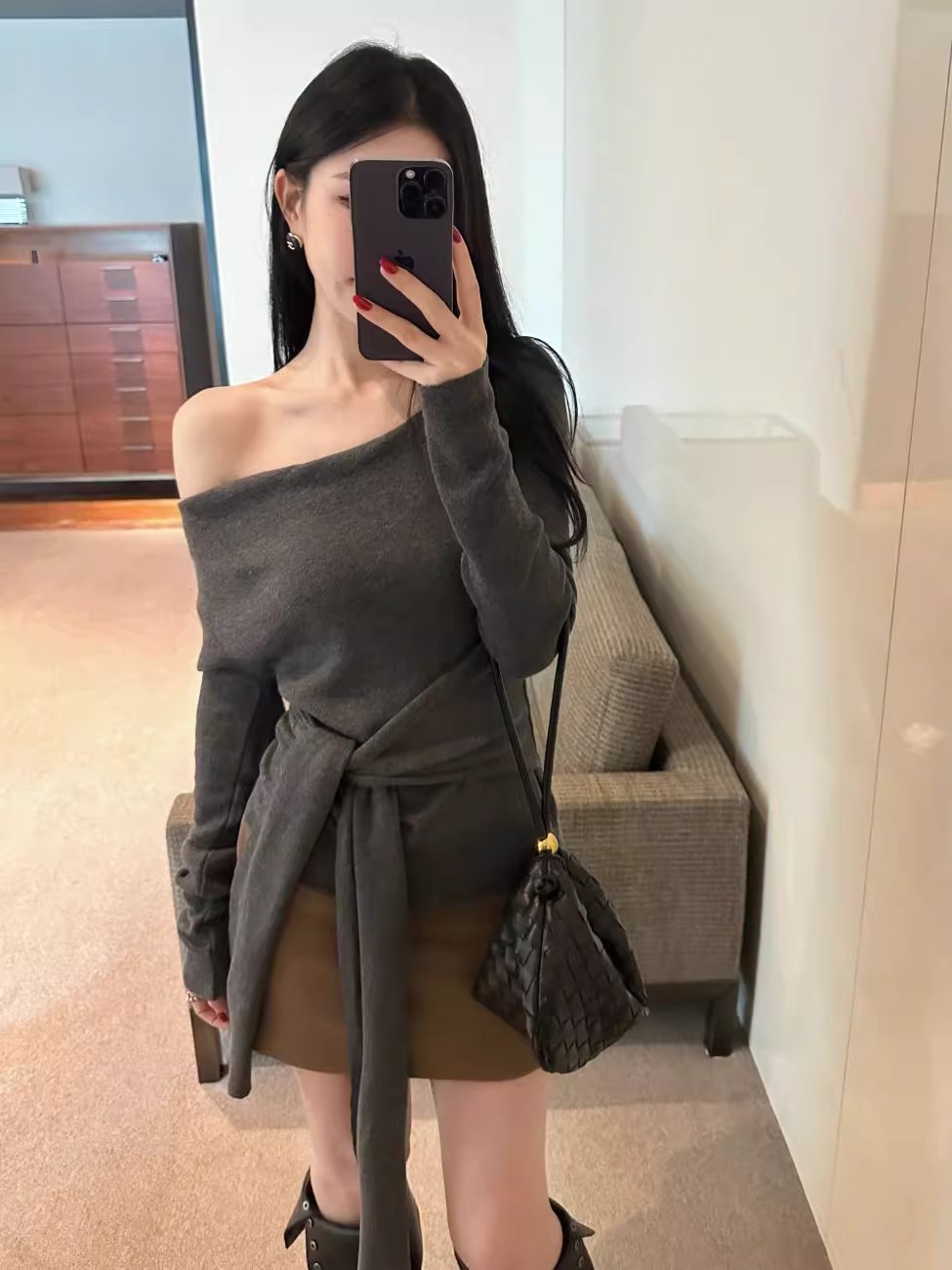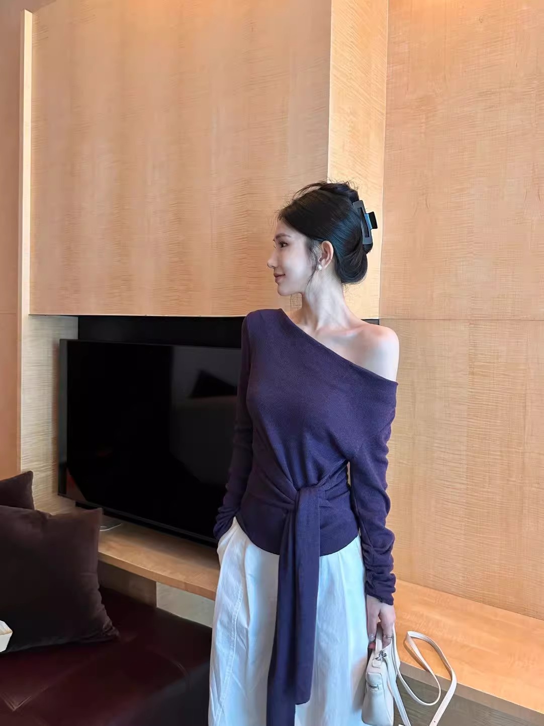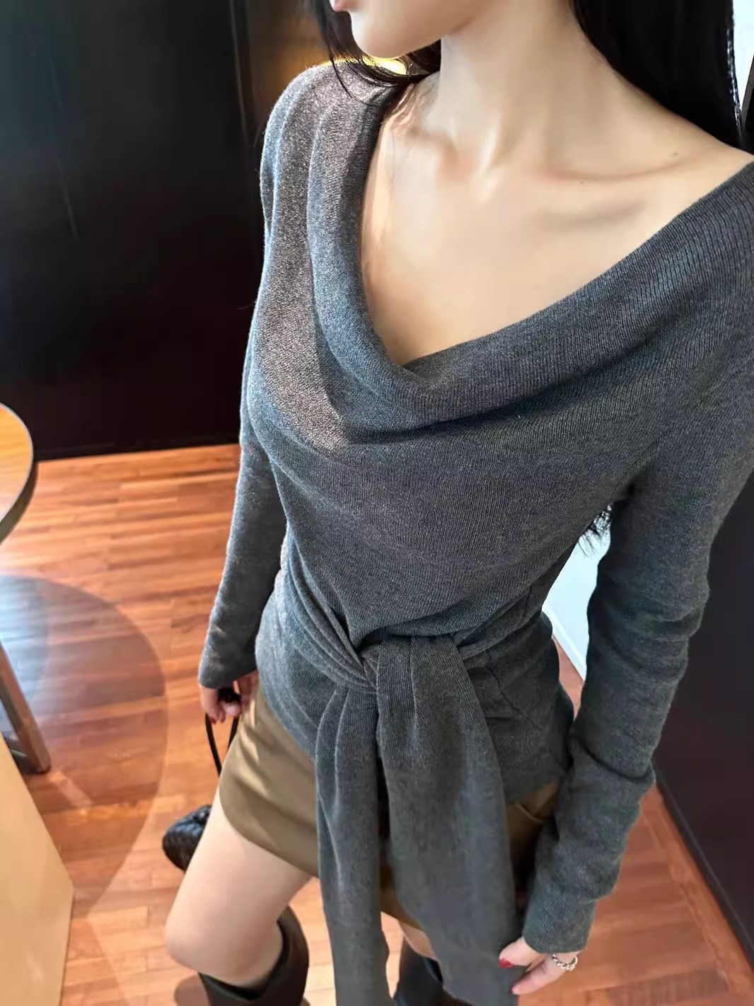 MY16304# 斜肩系带收腰长袖针织衫新款修身打底衫独特漂亮洋气上衣潮女裝貨源服裝批發