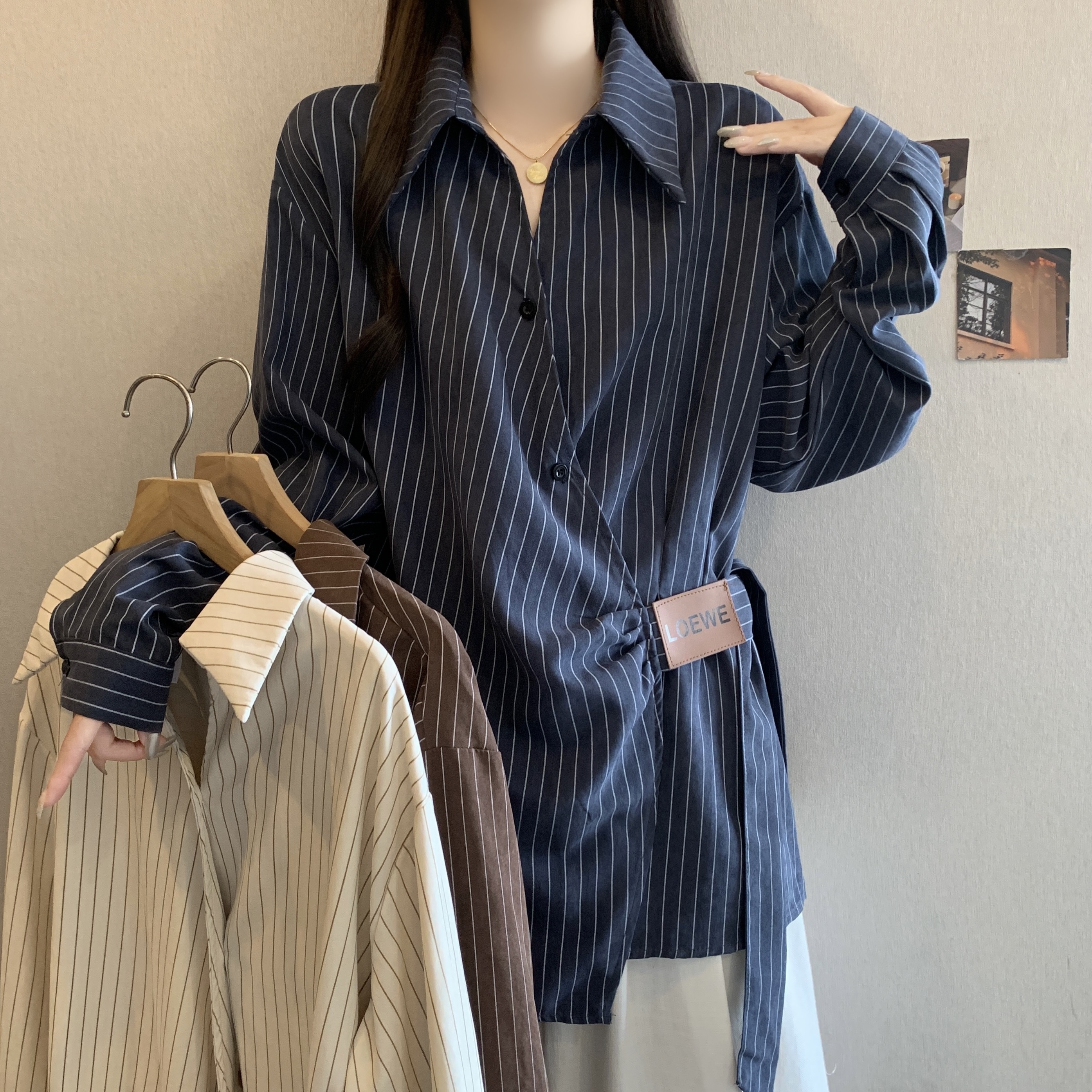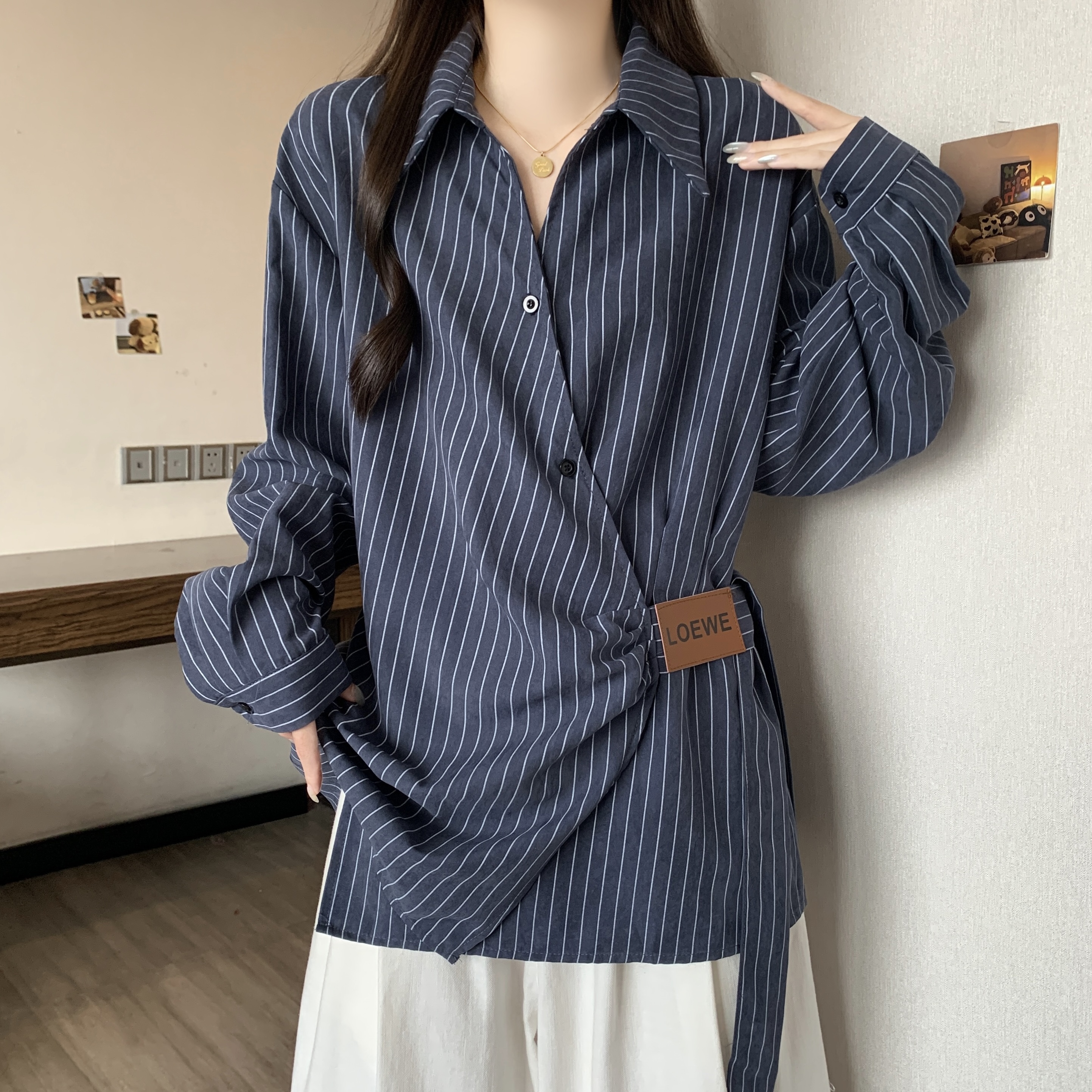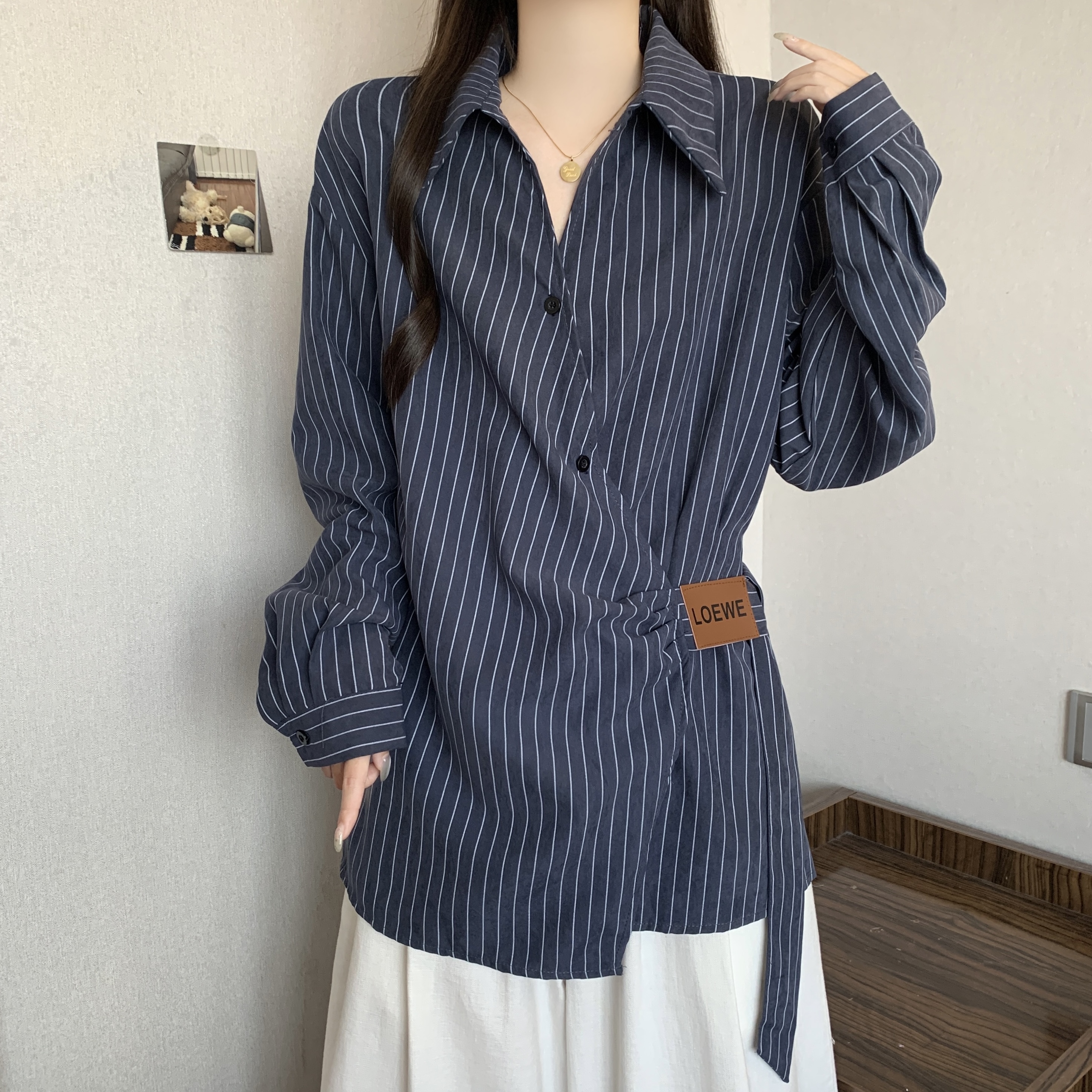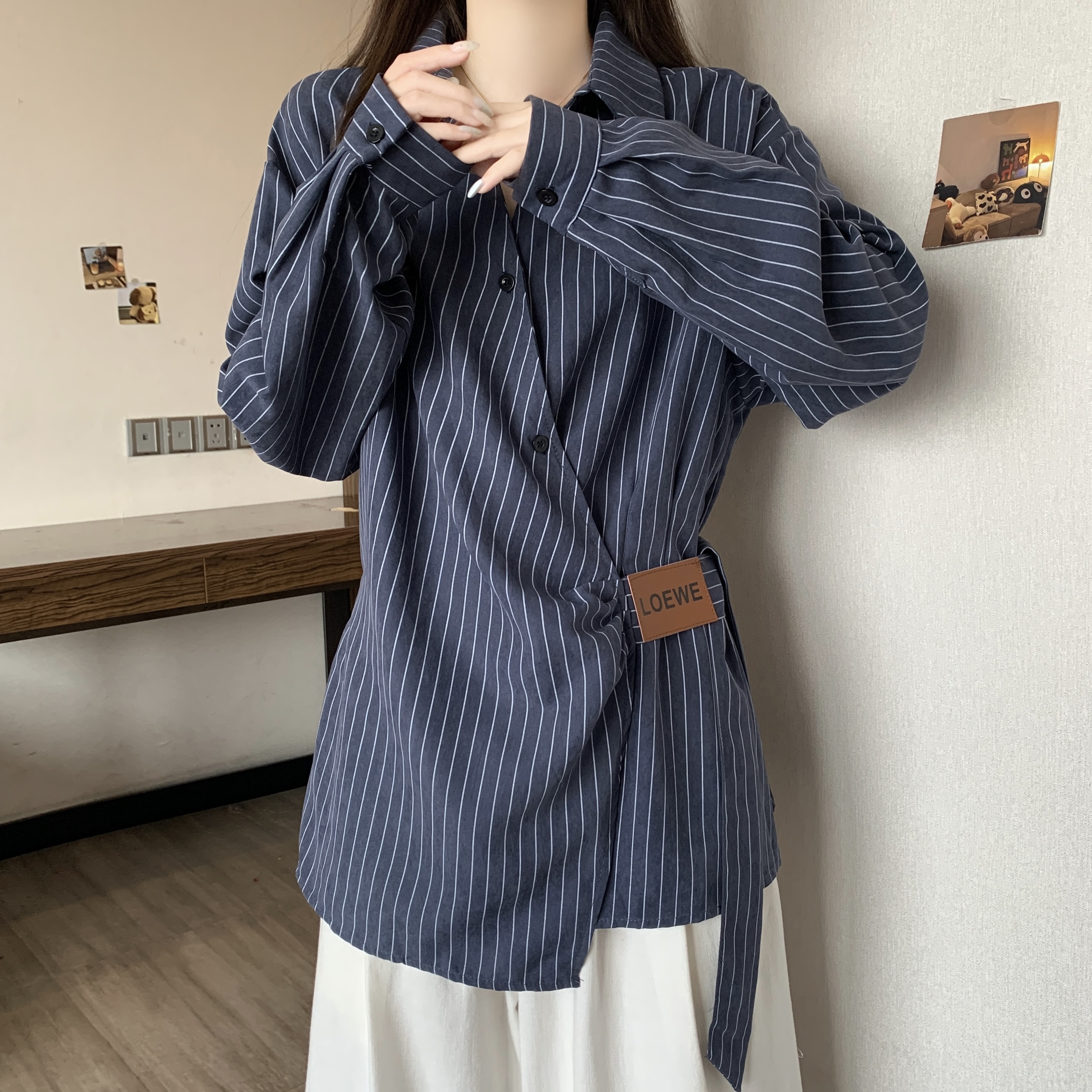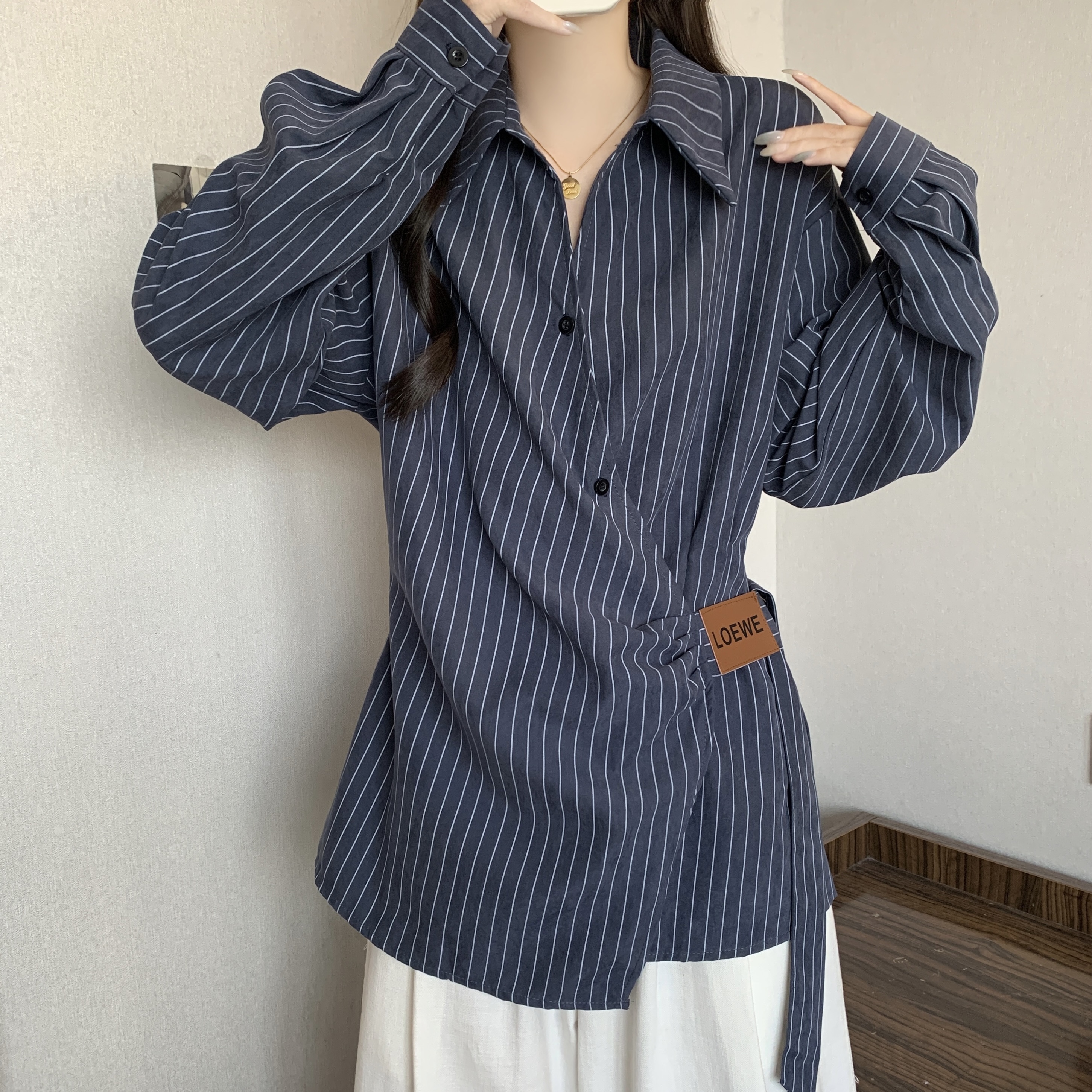 MY16306# 大码法式不规则收腰系带条纹衬衫设计感小众独特别致上衣女裝貨源服裝批發