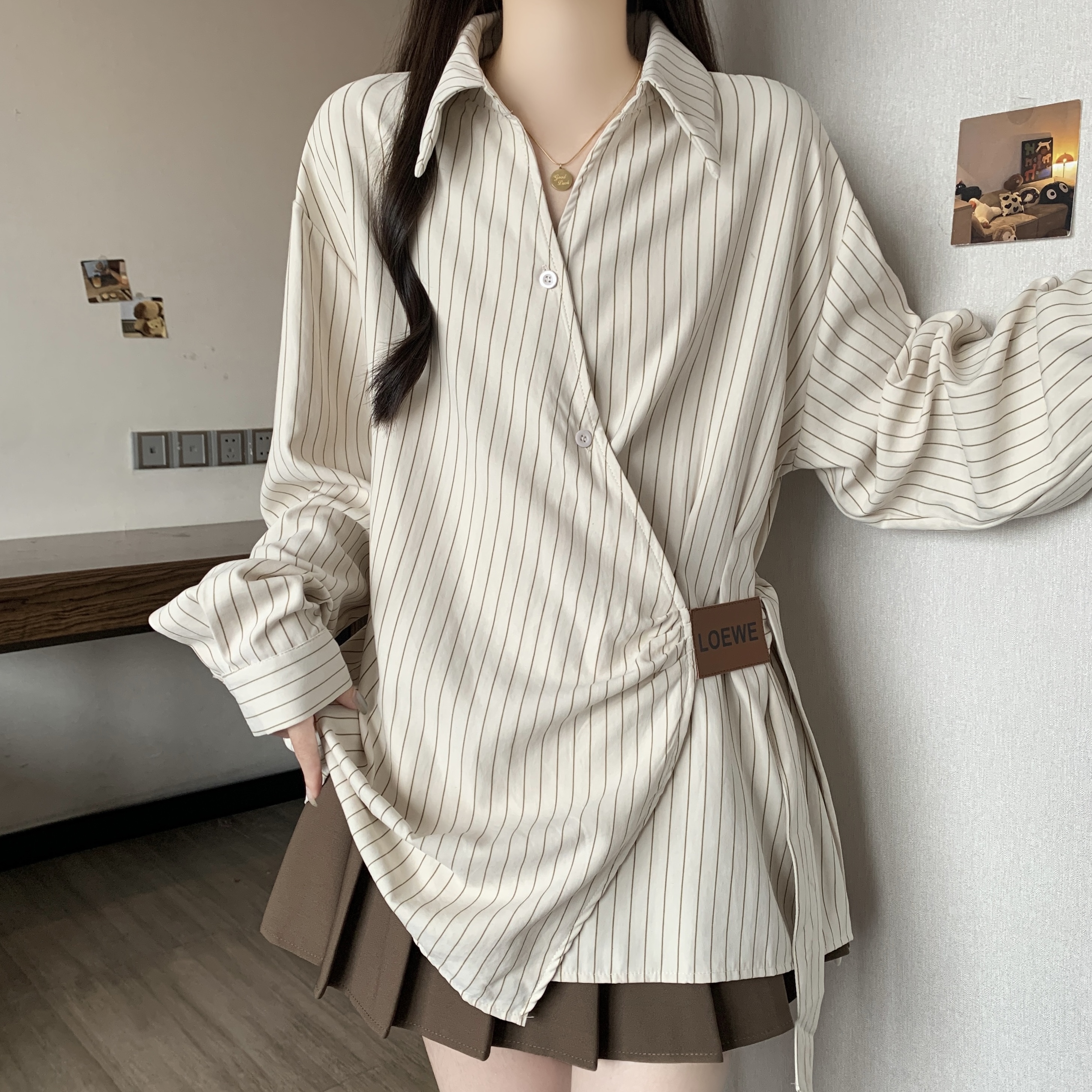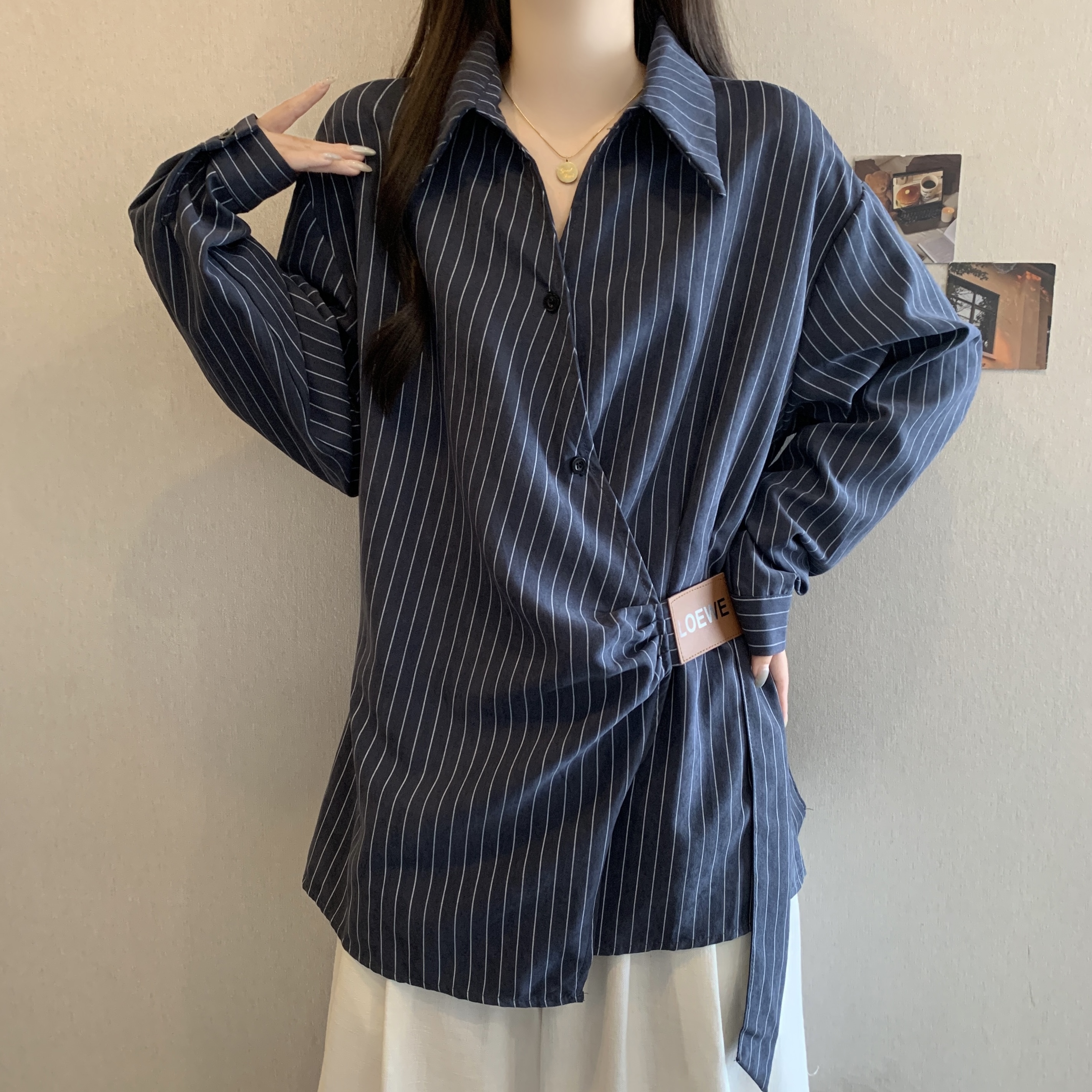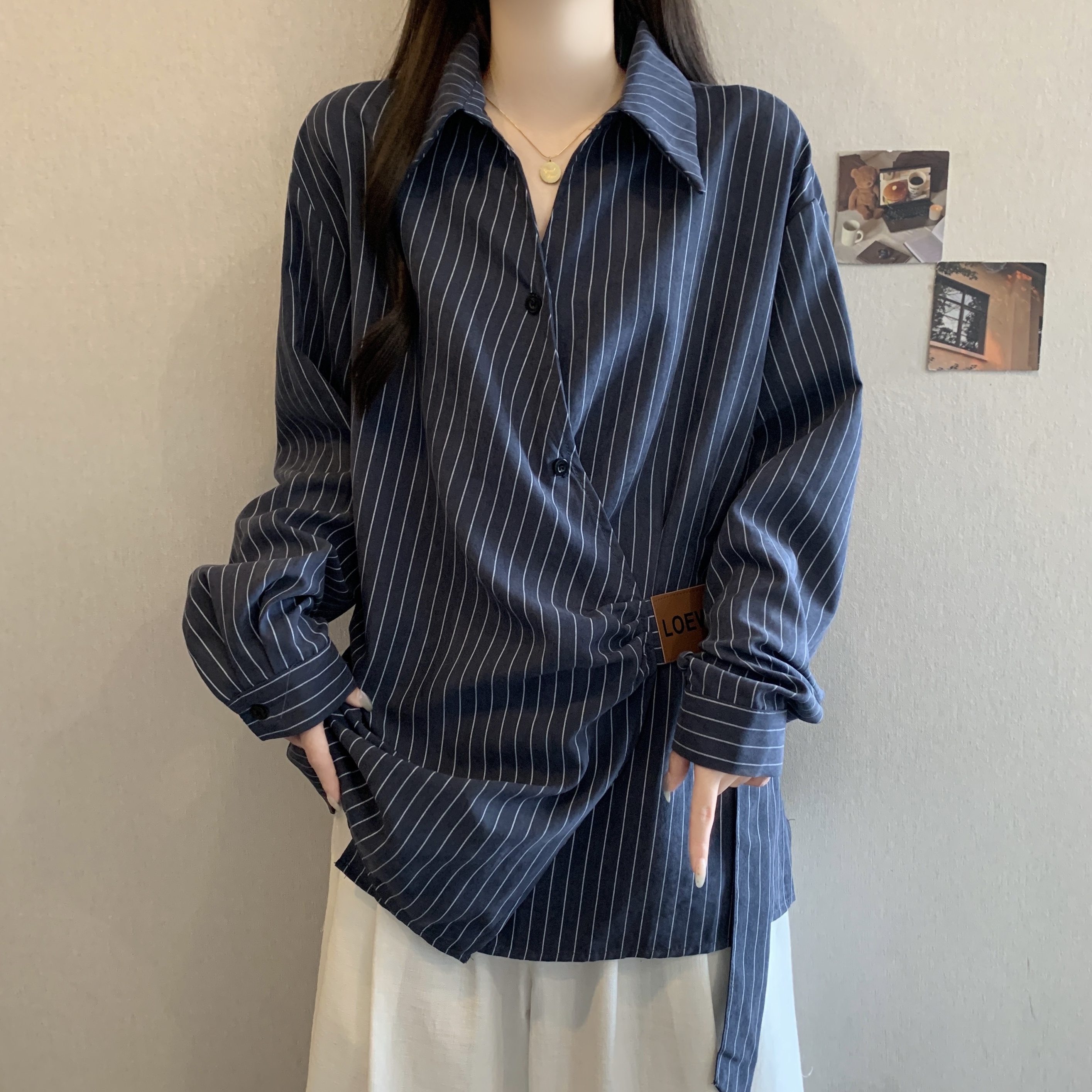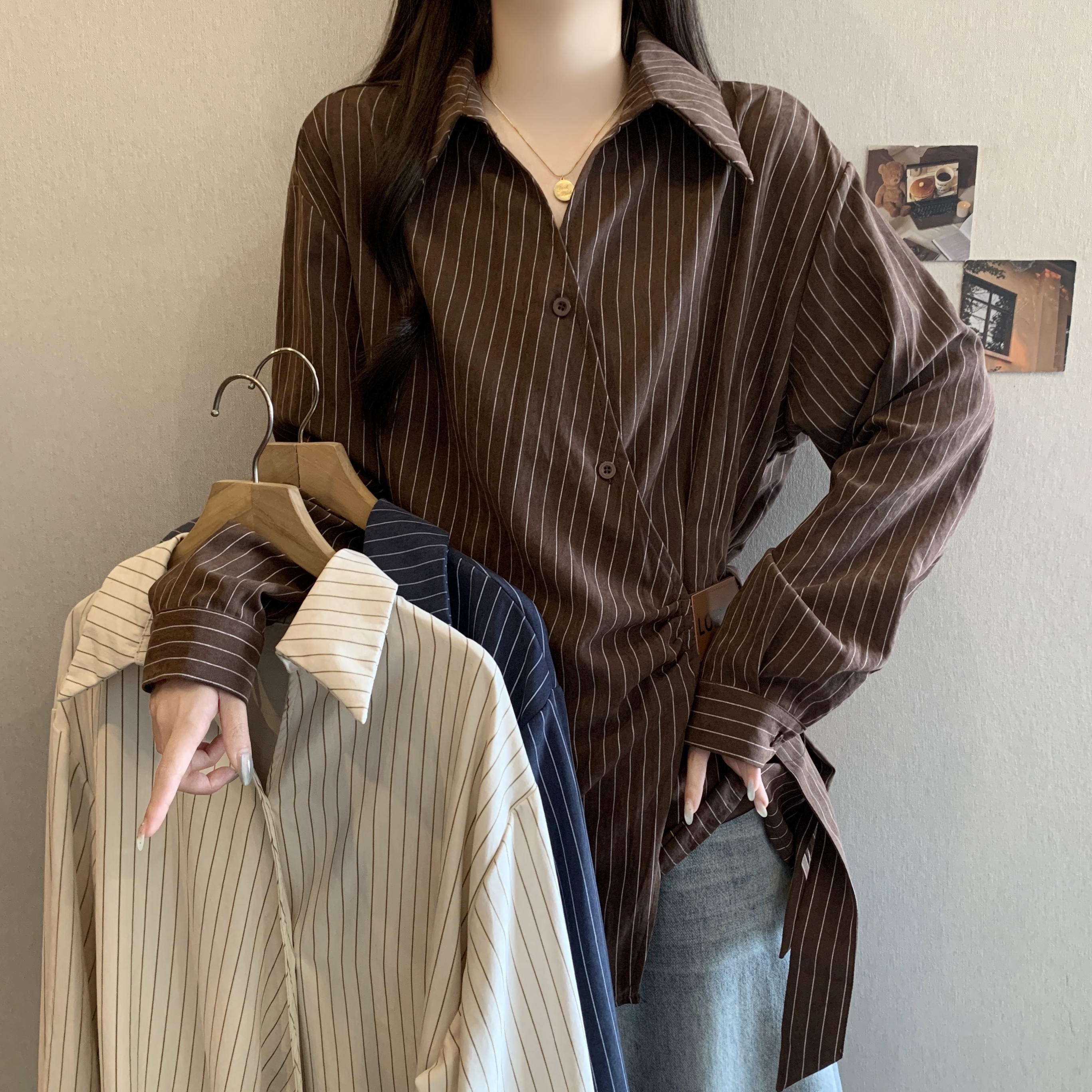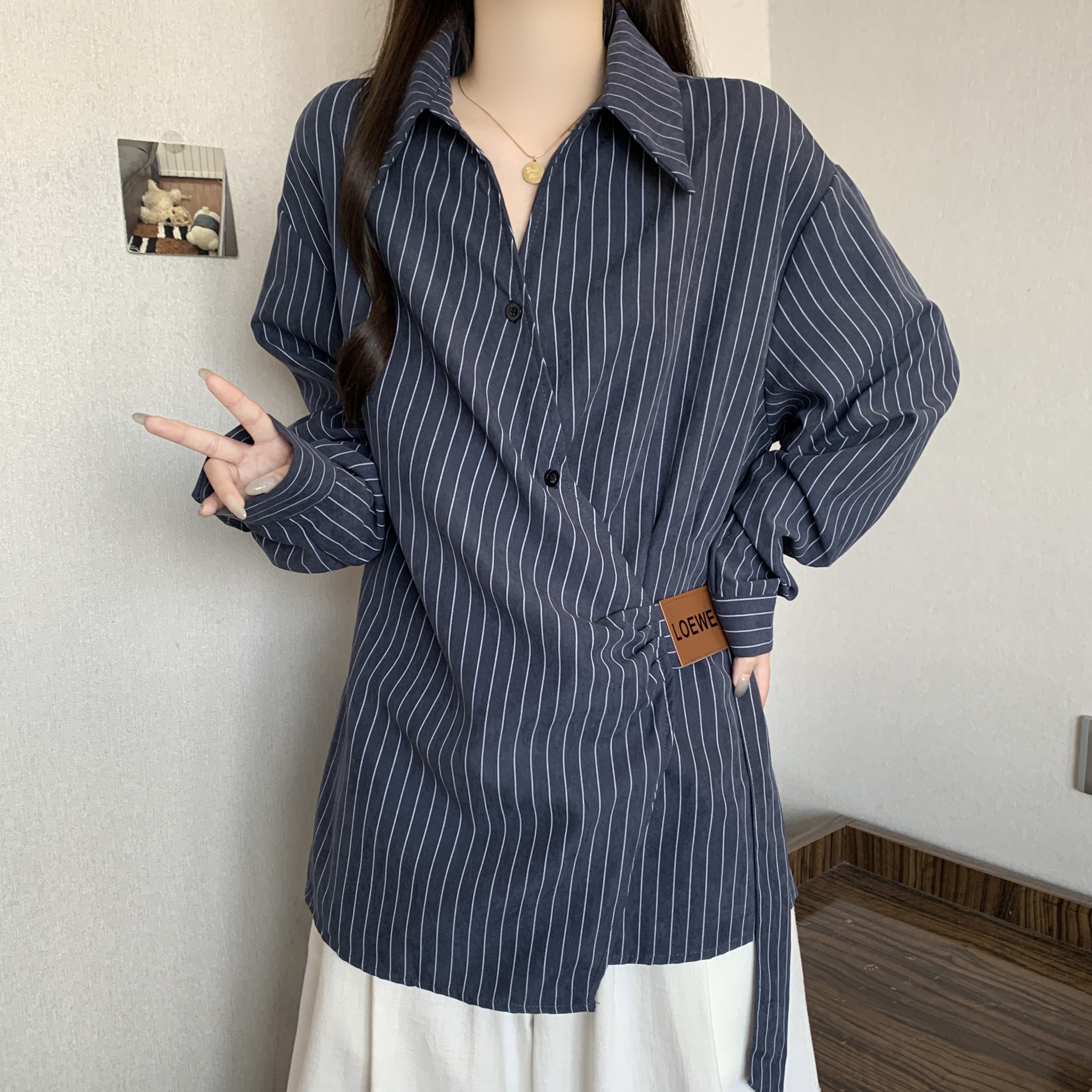 MY16306# 大码法式不规则收腰系带条纹衬衫设计感小众独特别致上衣女裝貨源服裝批發