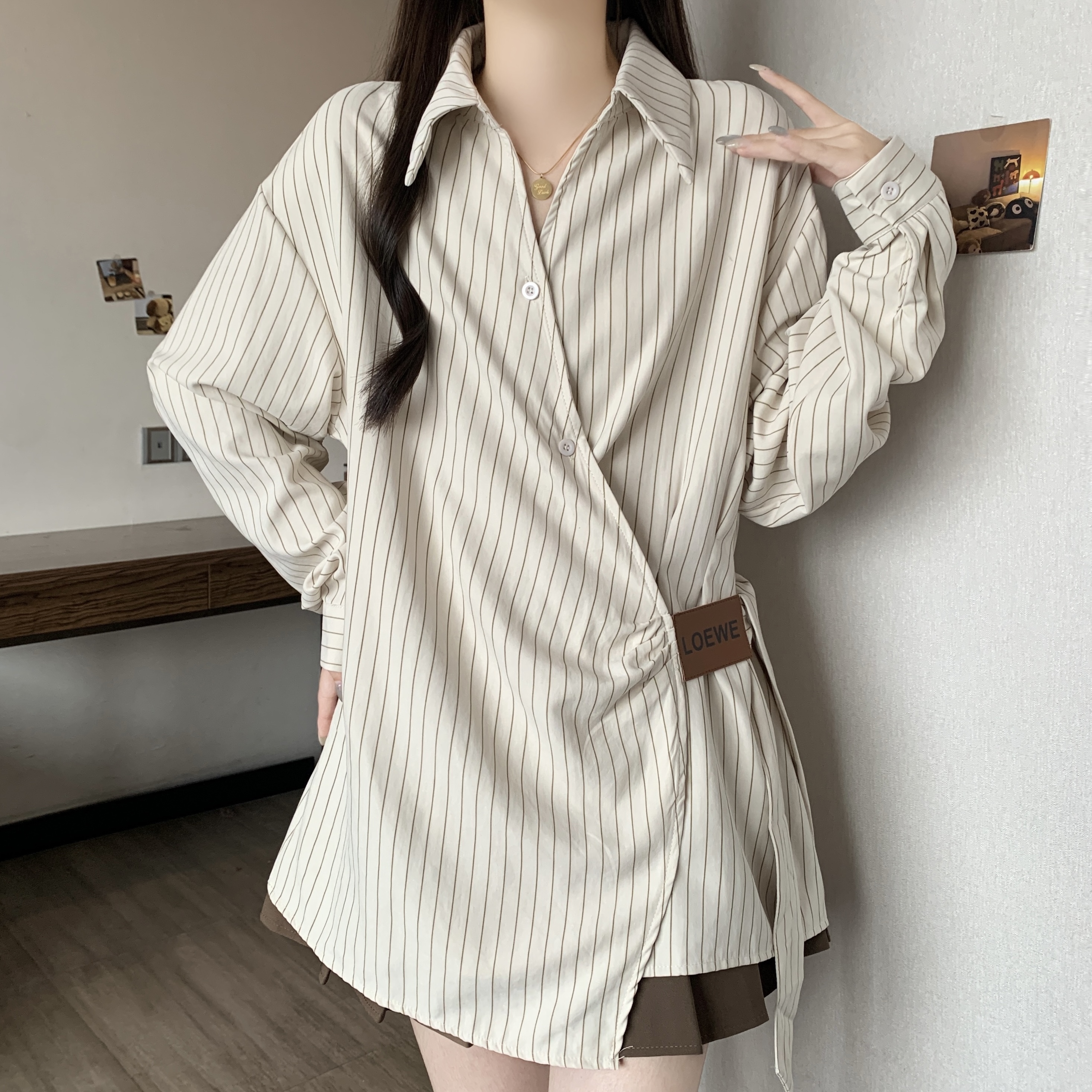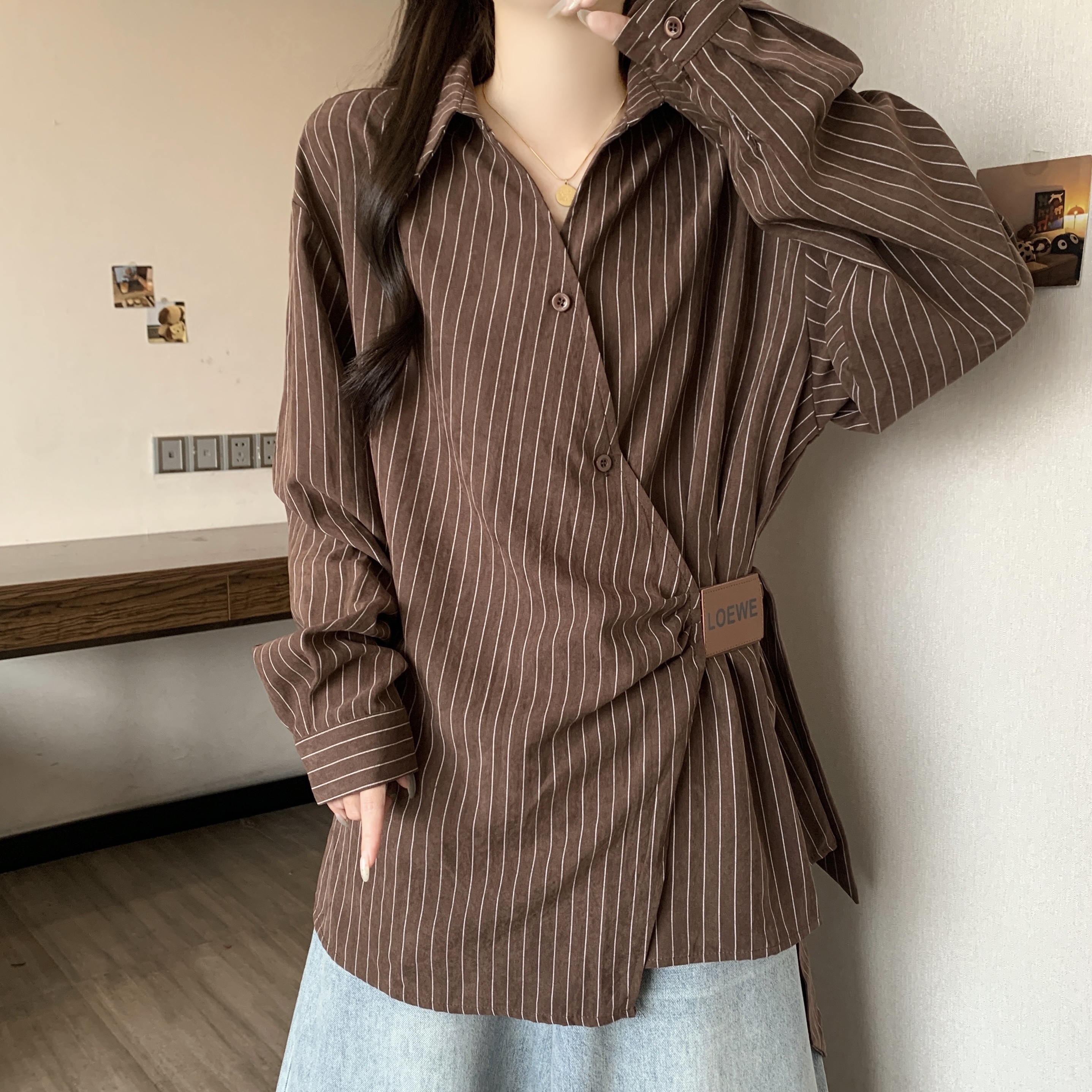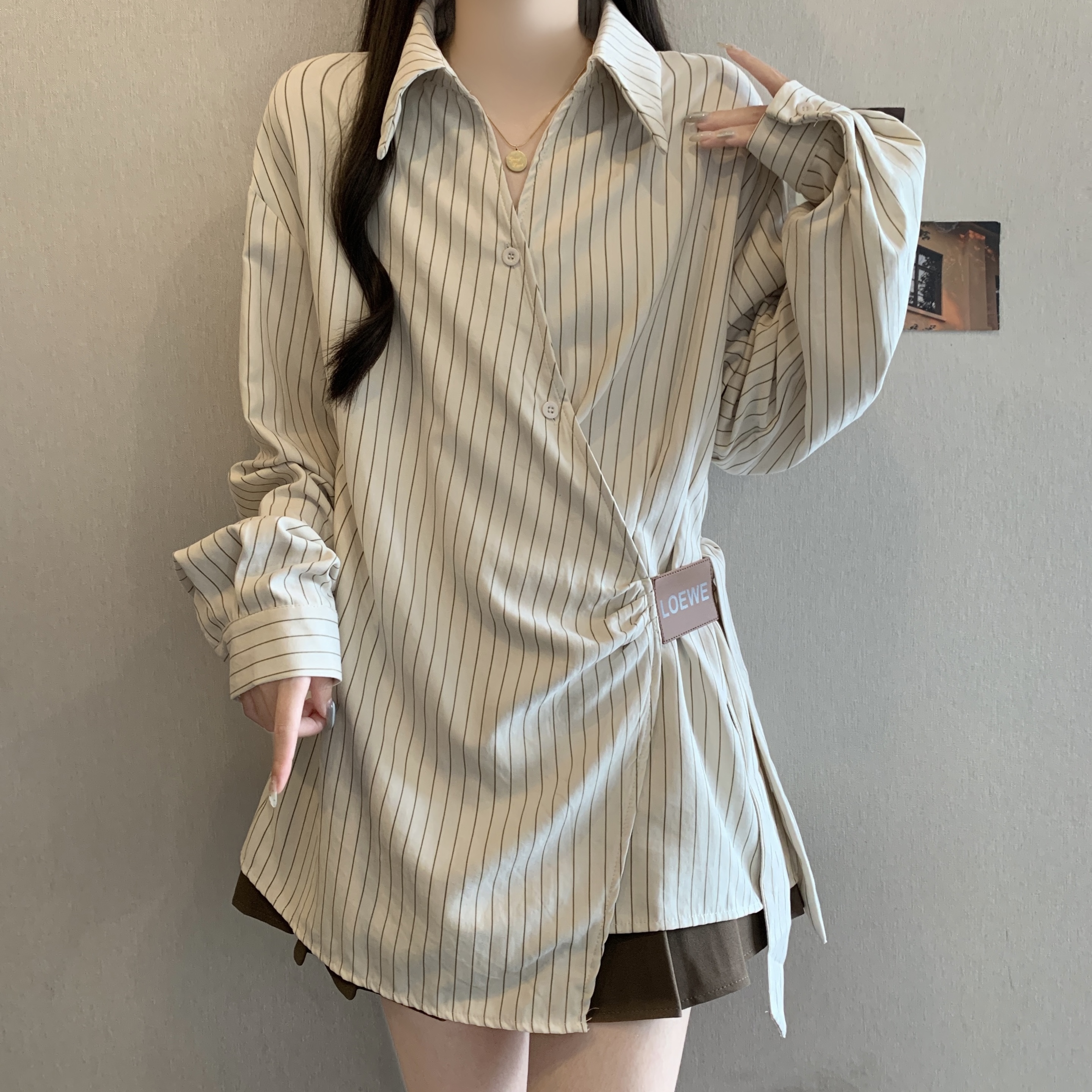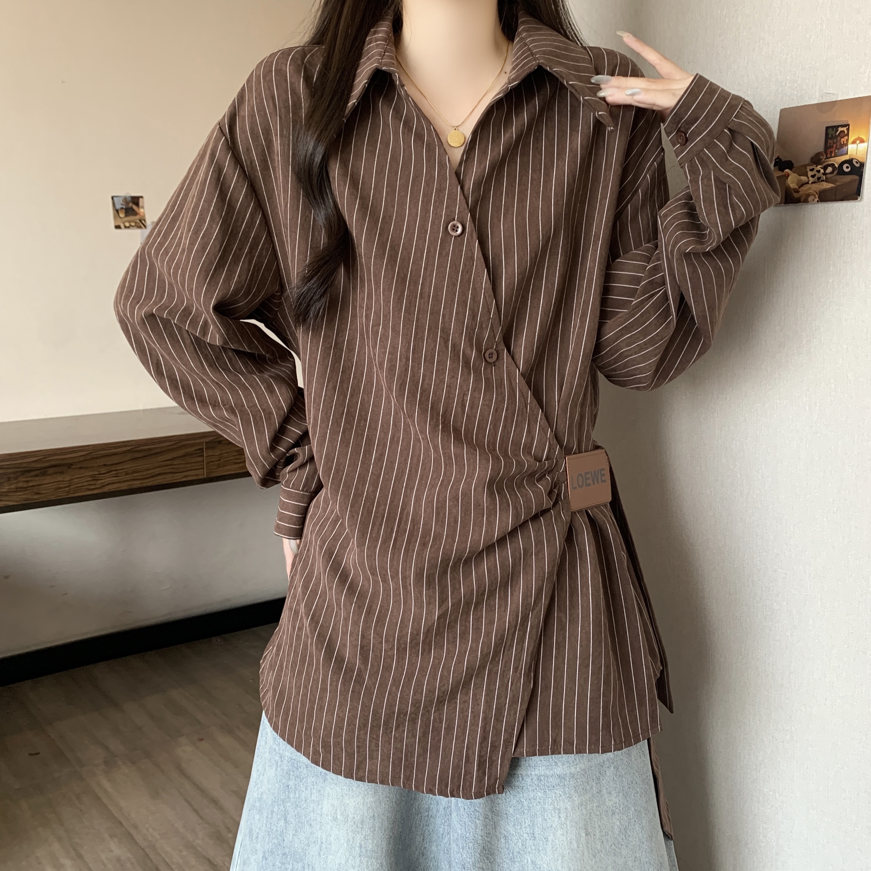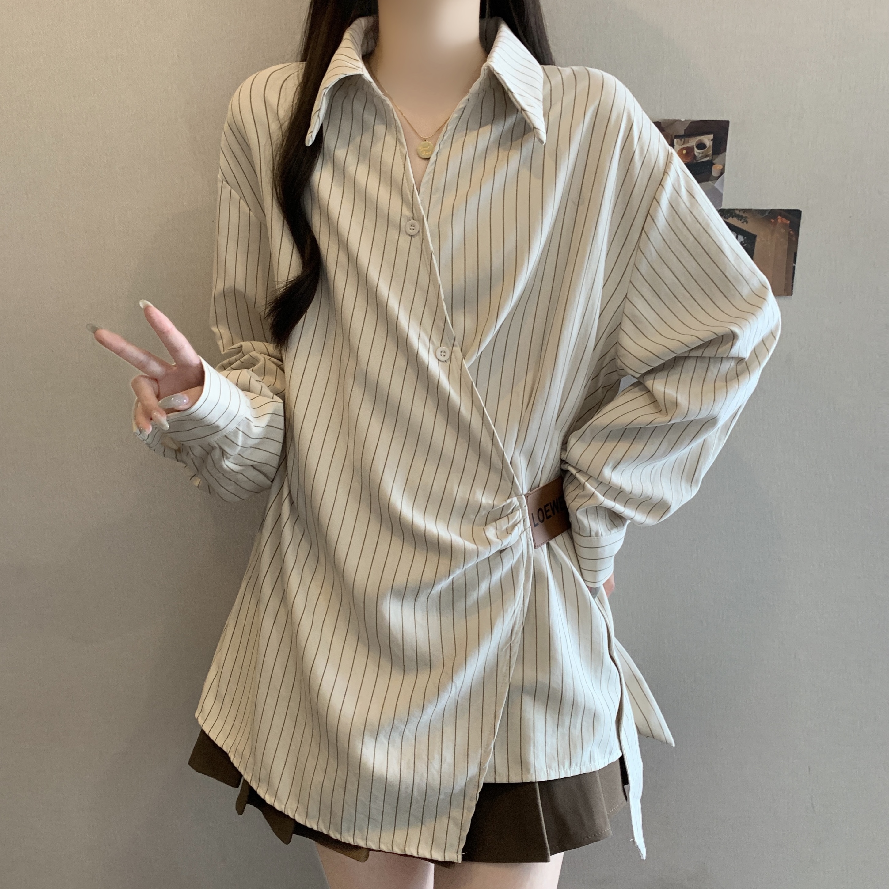 MY16306# 大码法式不规则收腰系带条纹衬衫设计感小众独特别致上衣女裝貨源服裝批發