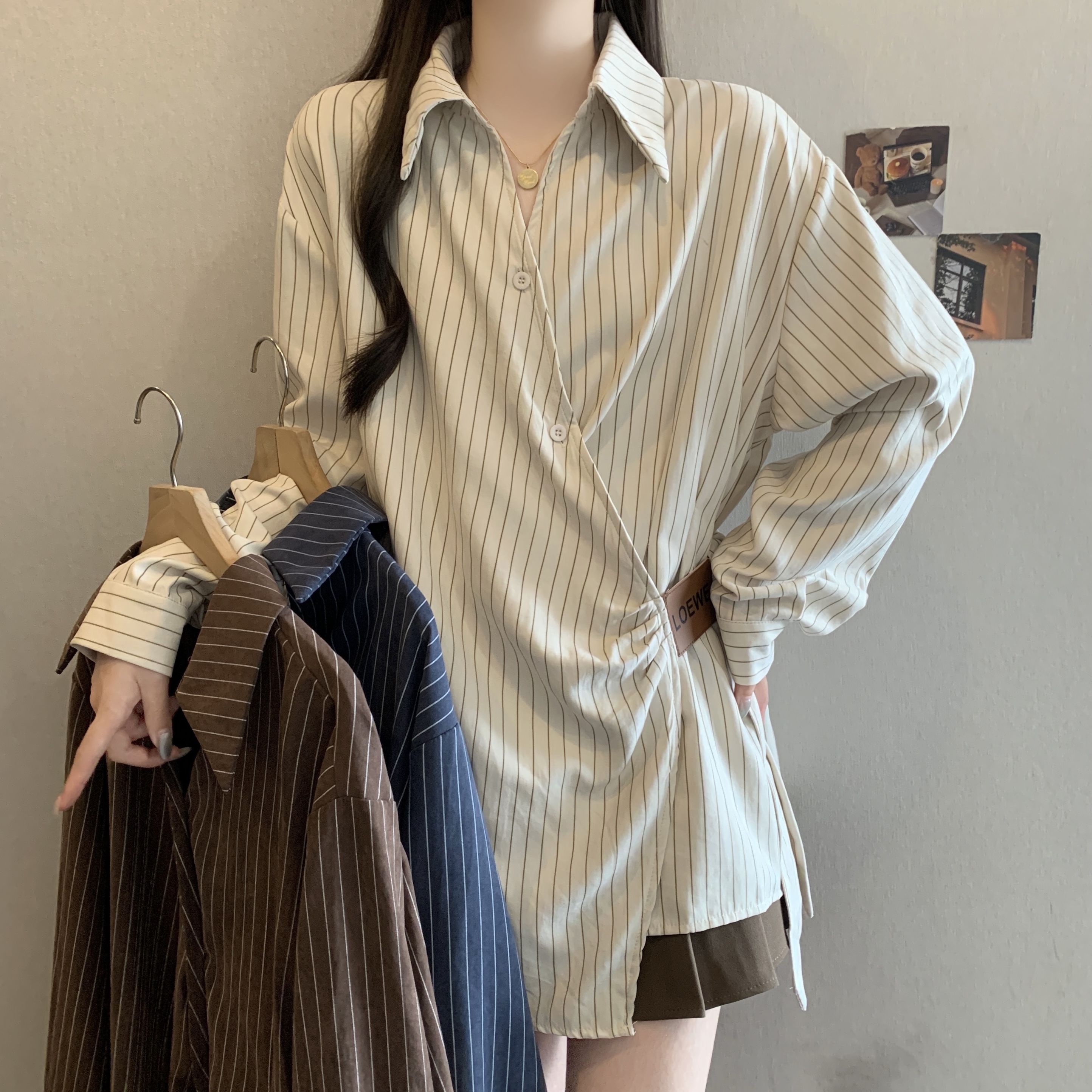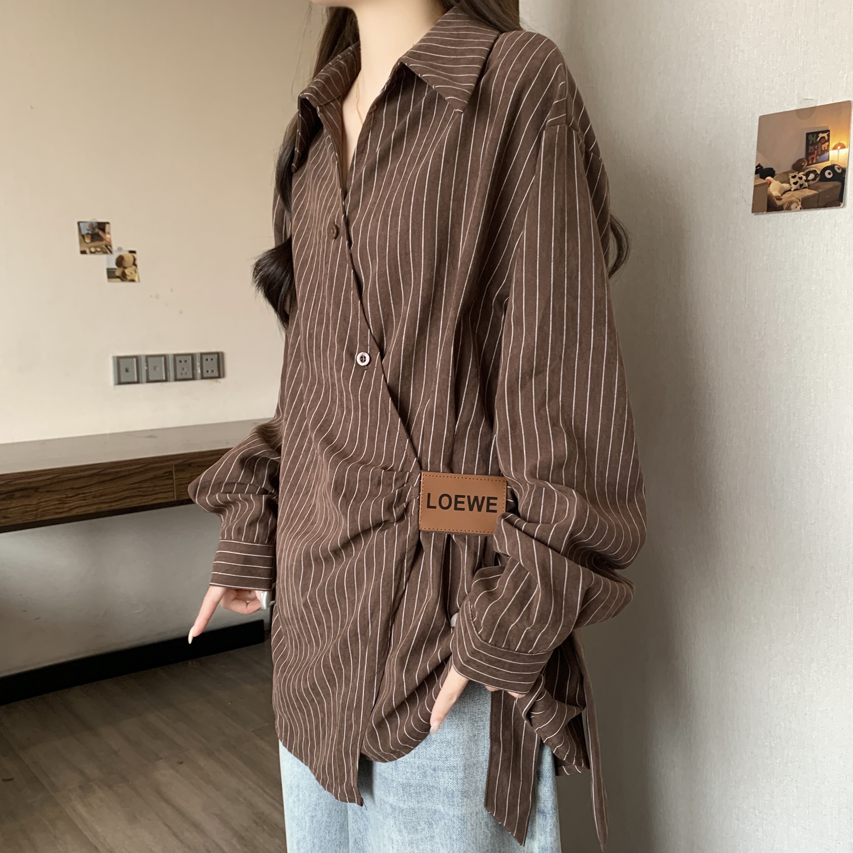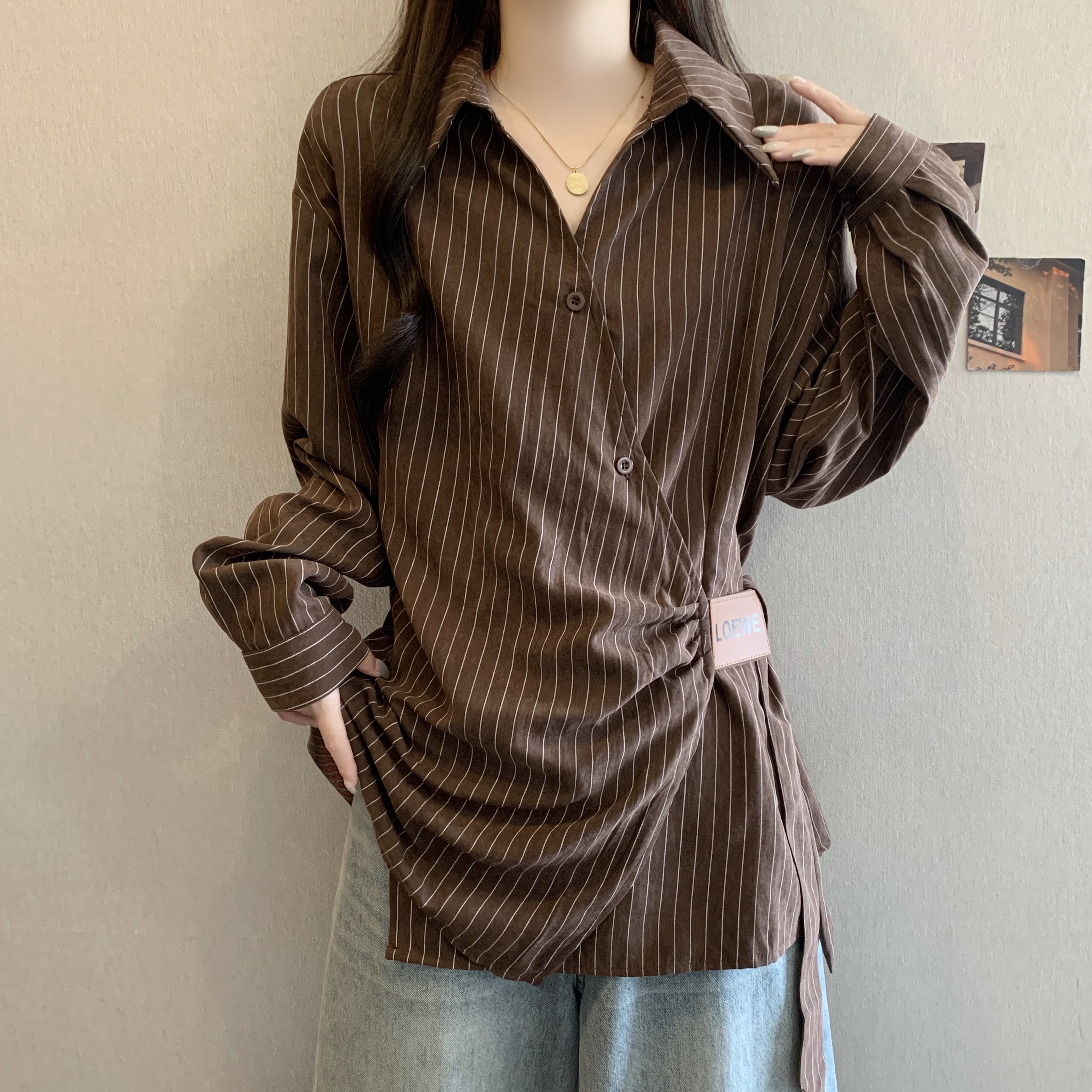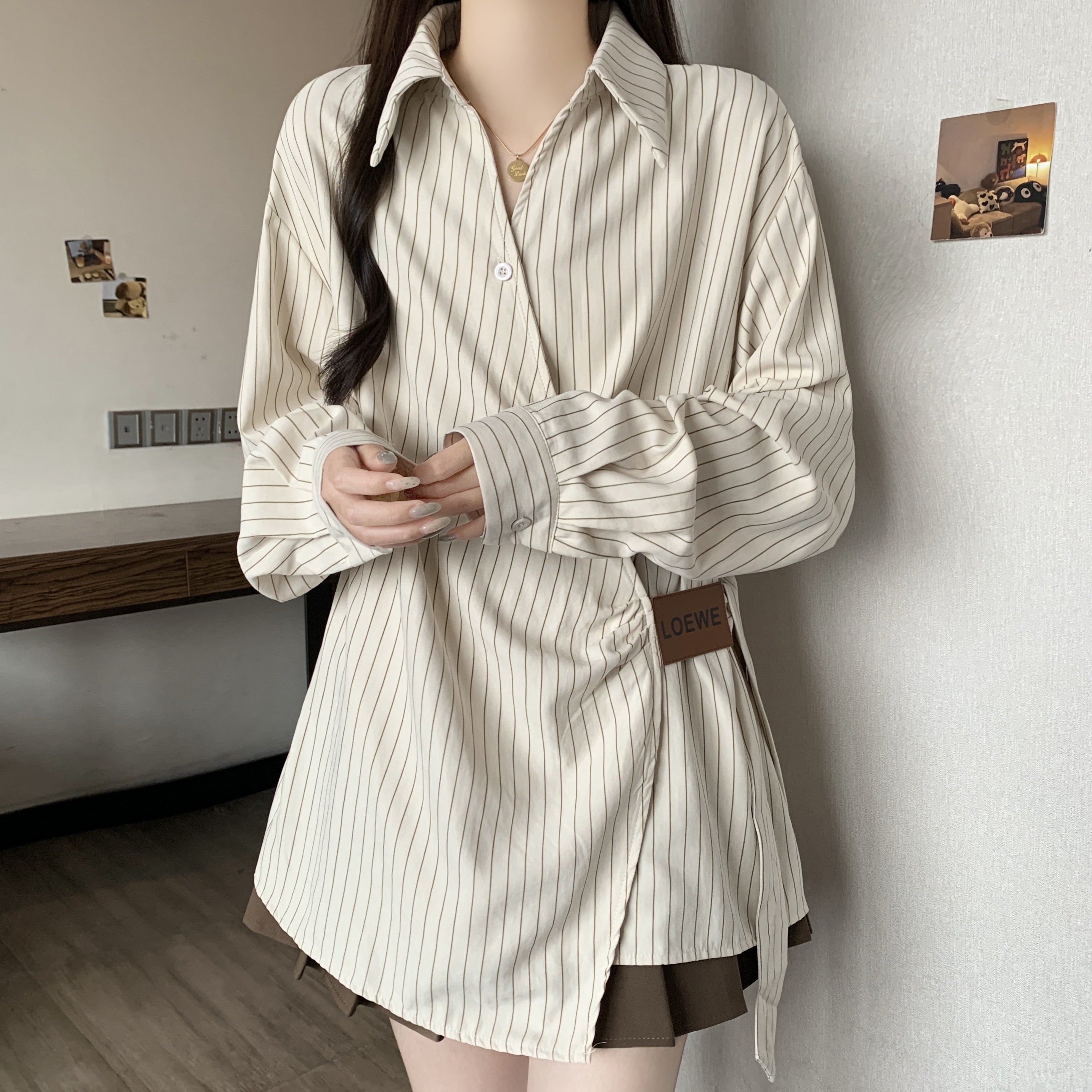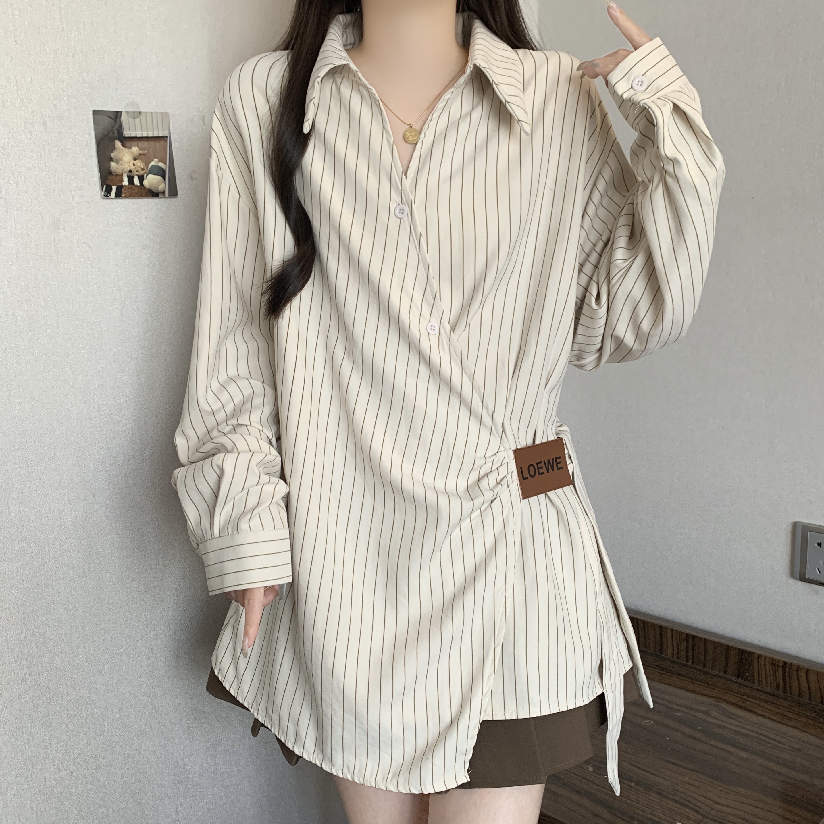 MY16306# 大码法式不规则收腰系带条纹衬衫设计感小众独特别致上衣女裝貨源服裝批發
