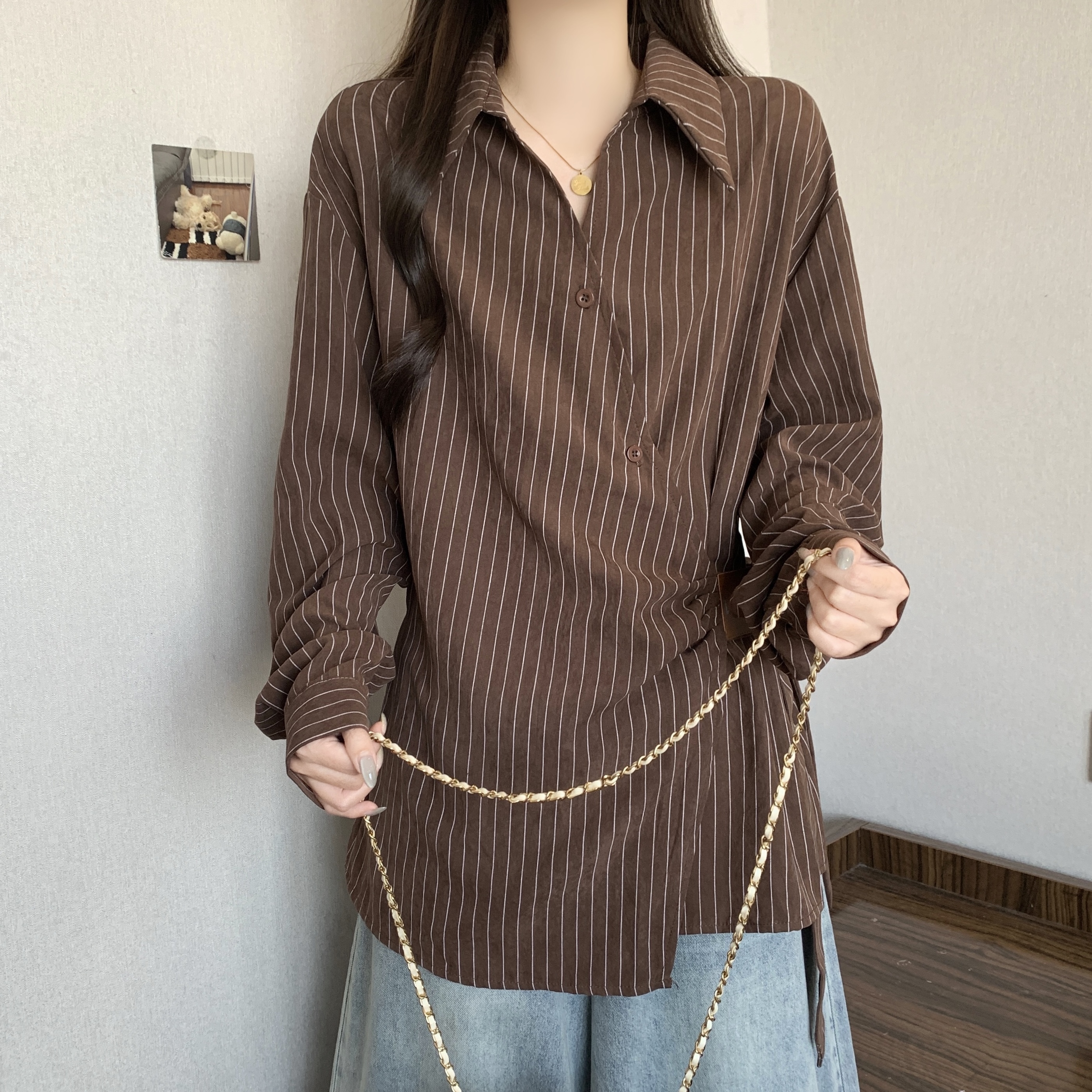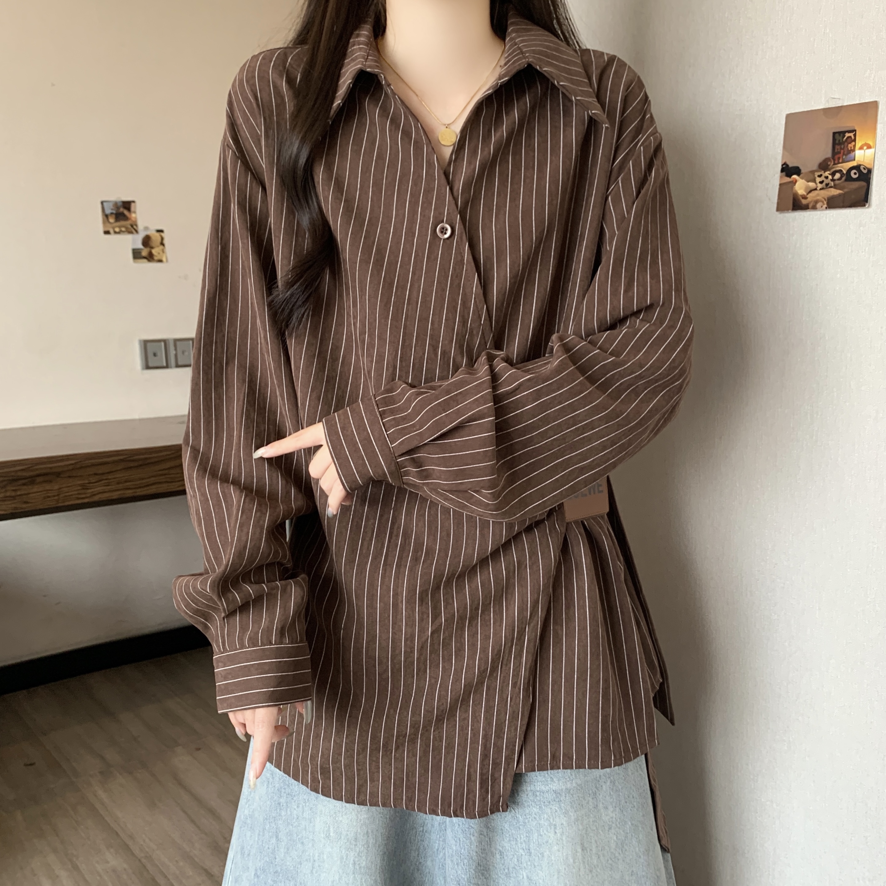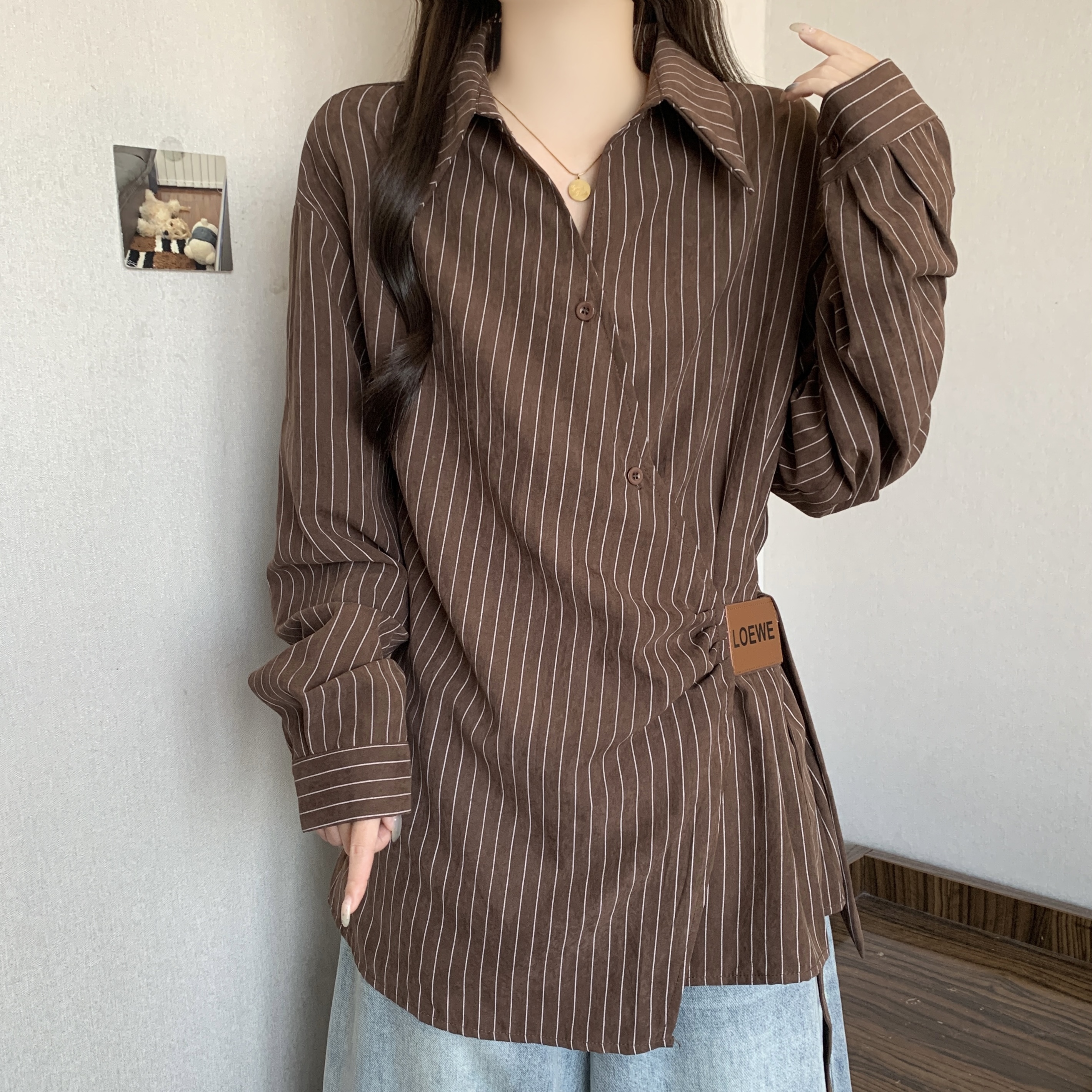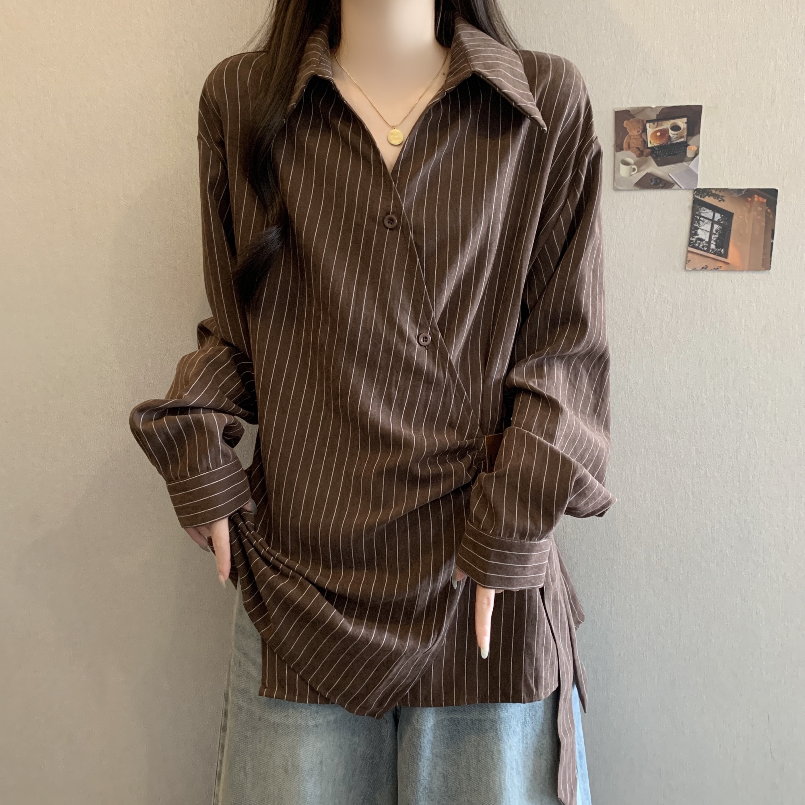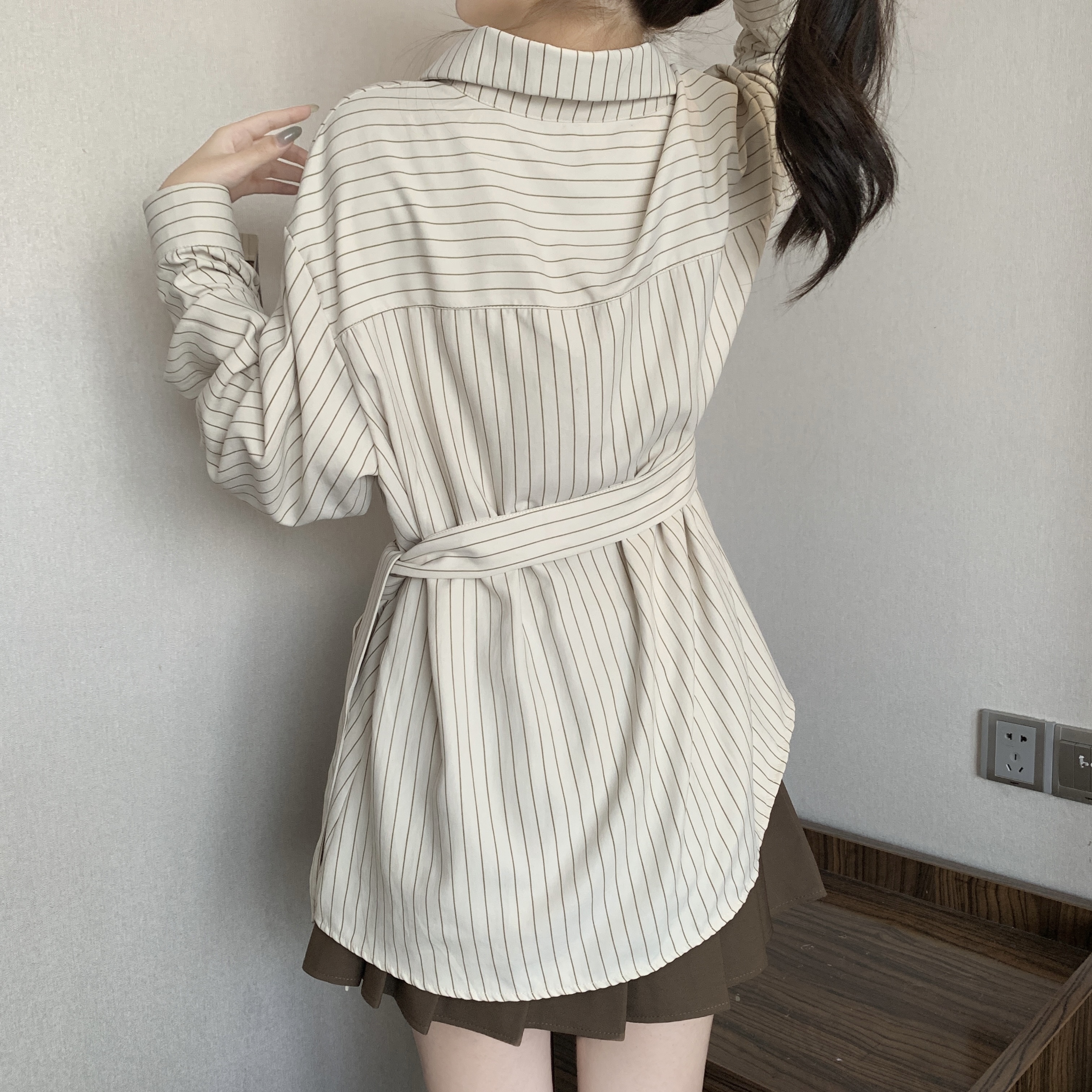 MY16306# 大码法式不规则收腰系带条纹衬衫设计感小众独特别致上衣女裝貨源服裝批發