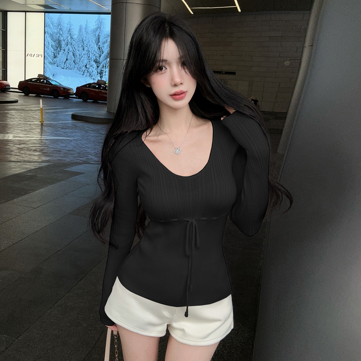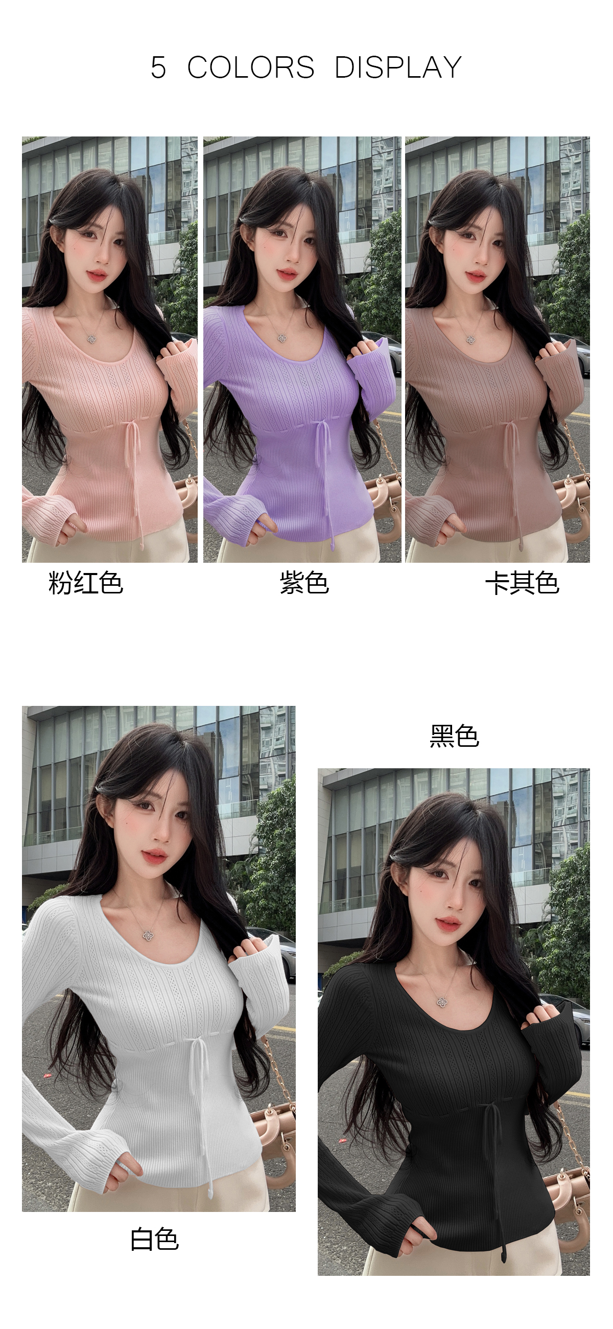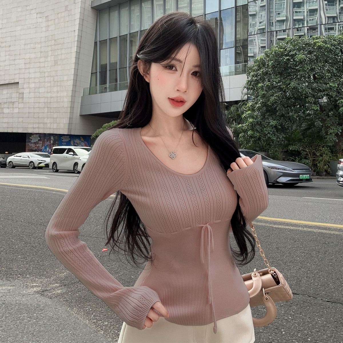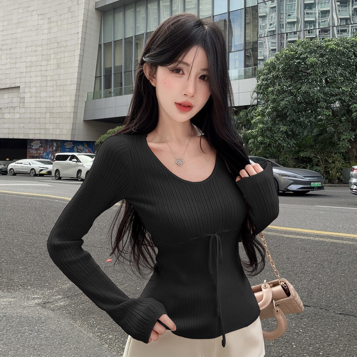 MY16313# 韩系抽绳收腰显瘦U领针织衫T恤百搭长袖打底上衣女裝貨源服裝批發