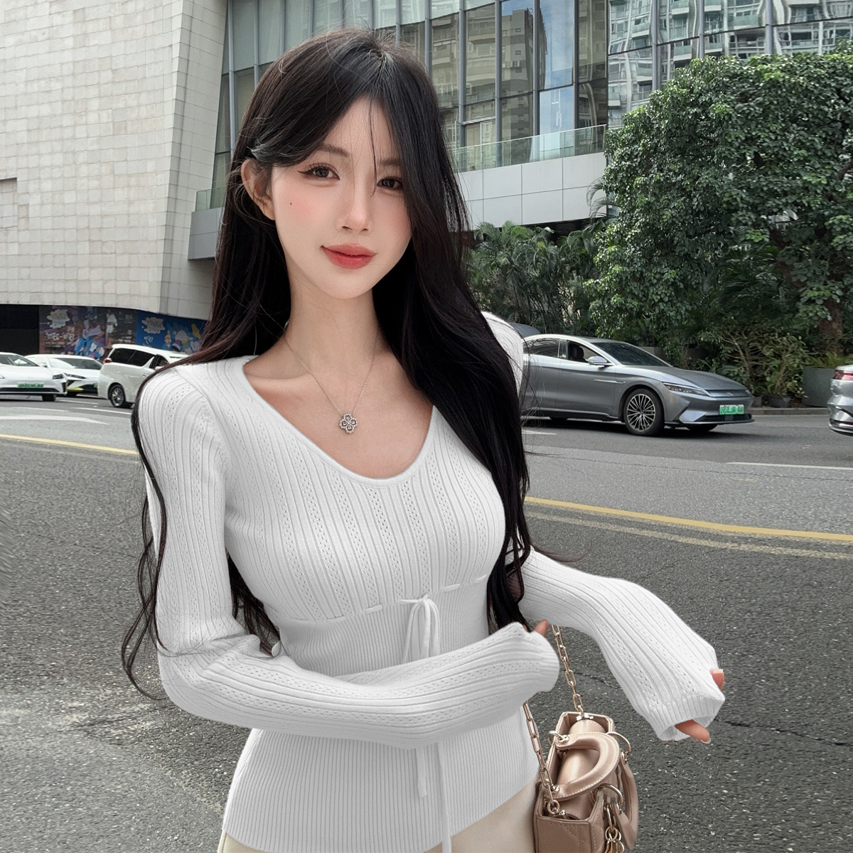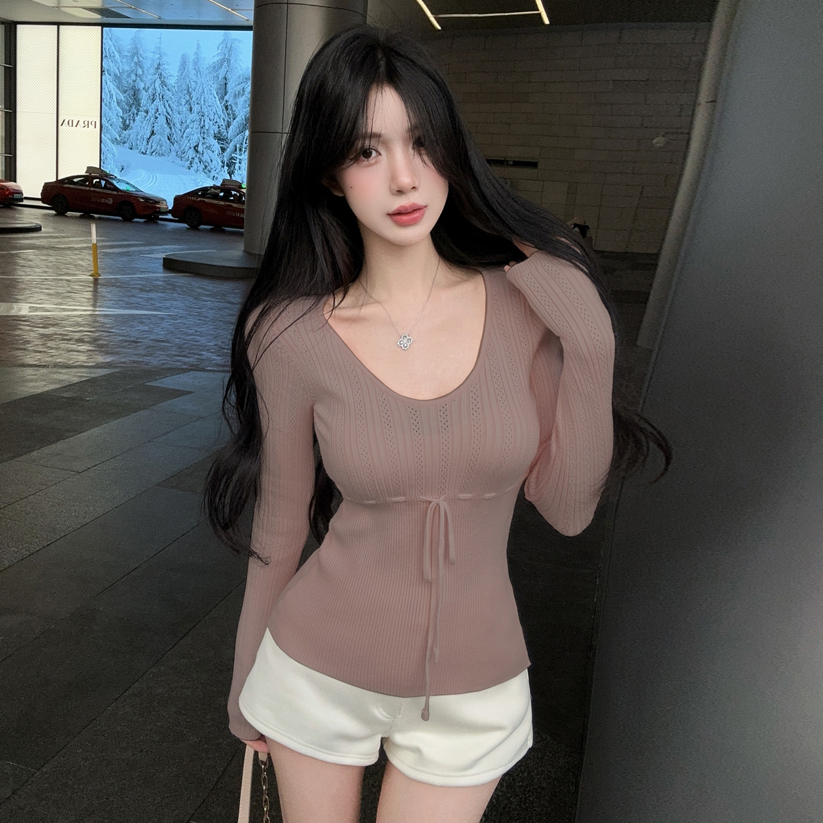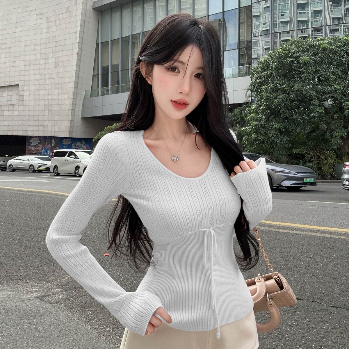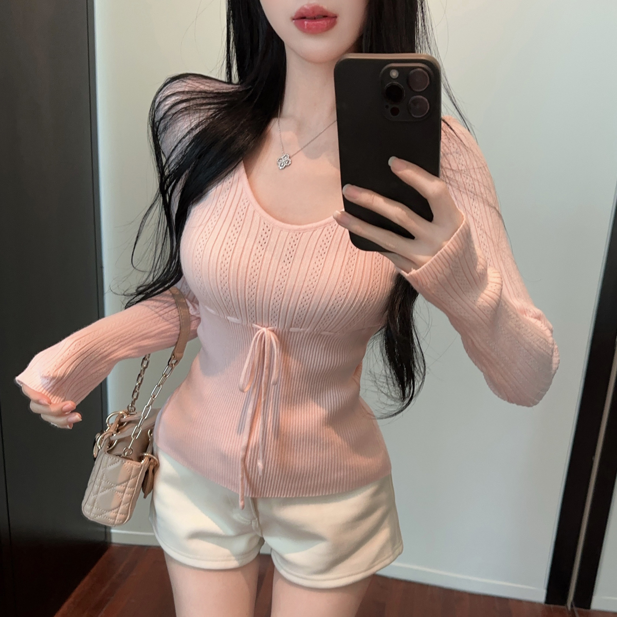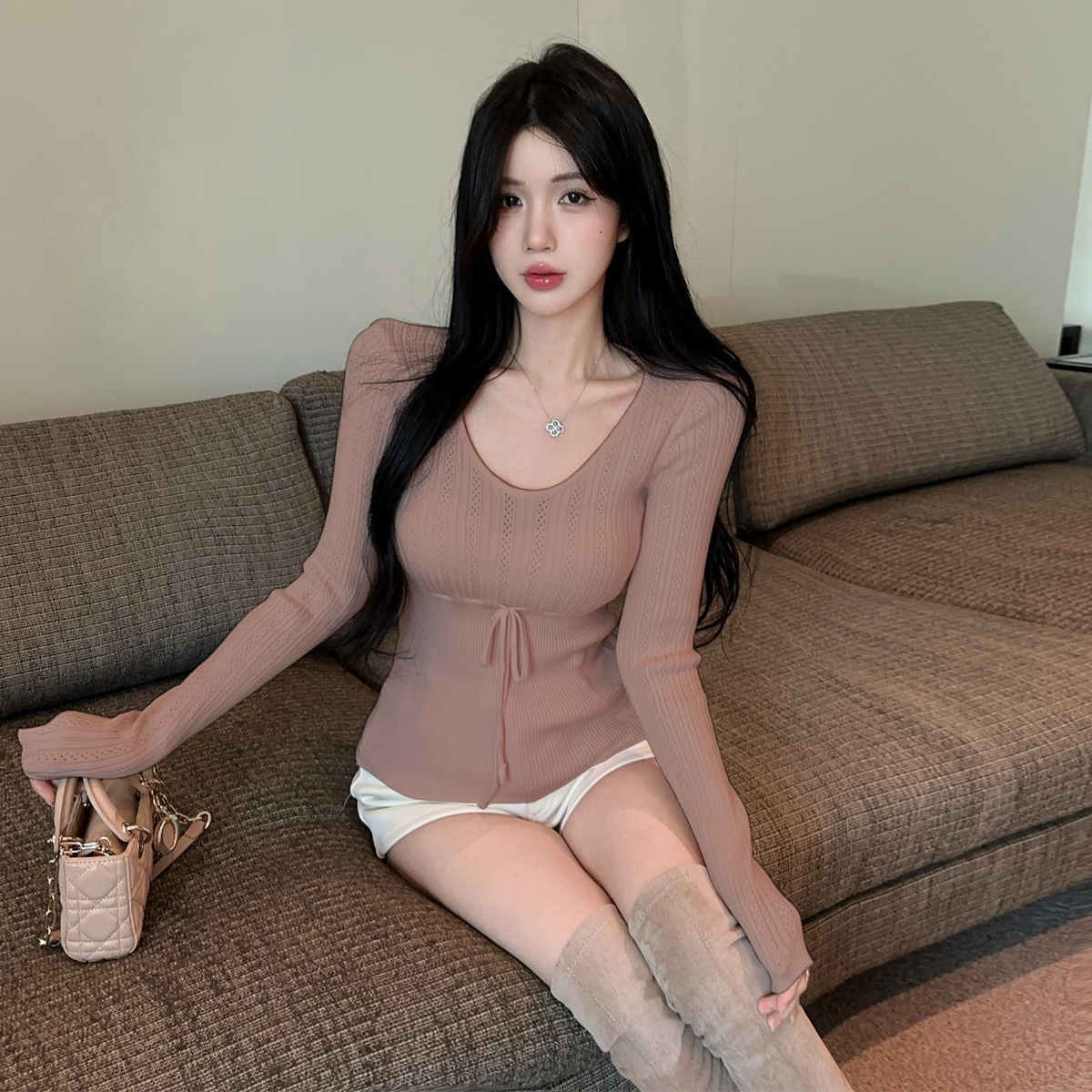 MY16313# 韩系抽绳收腰显瘦U领针织衫T恤百搭长袖打底上衣女裝貨源服裝批發