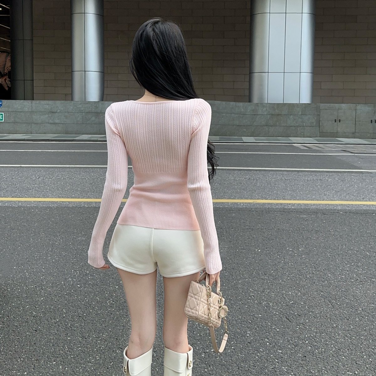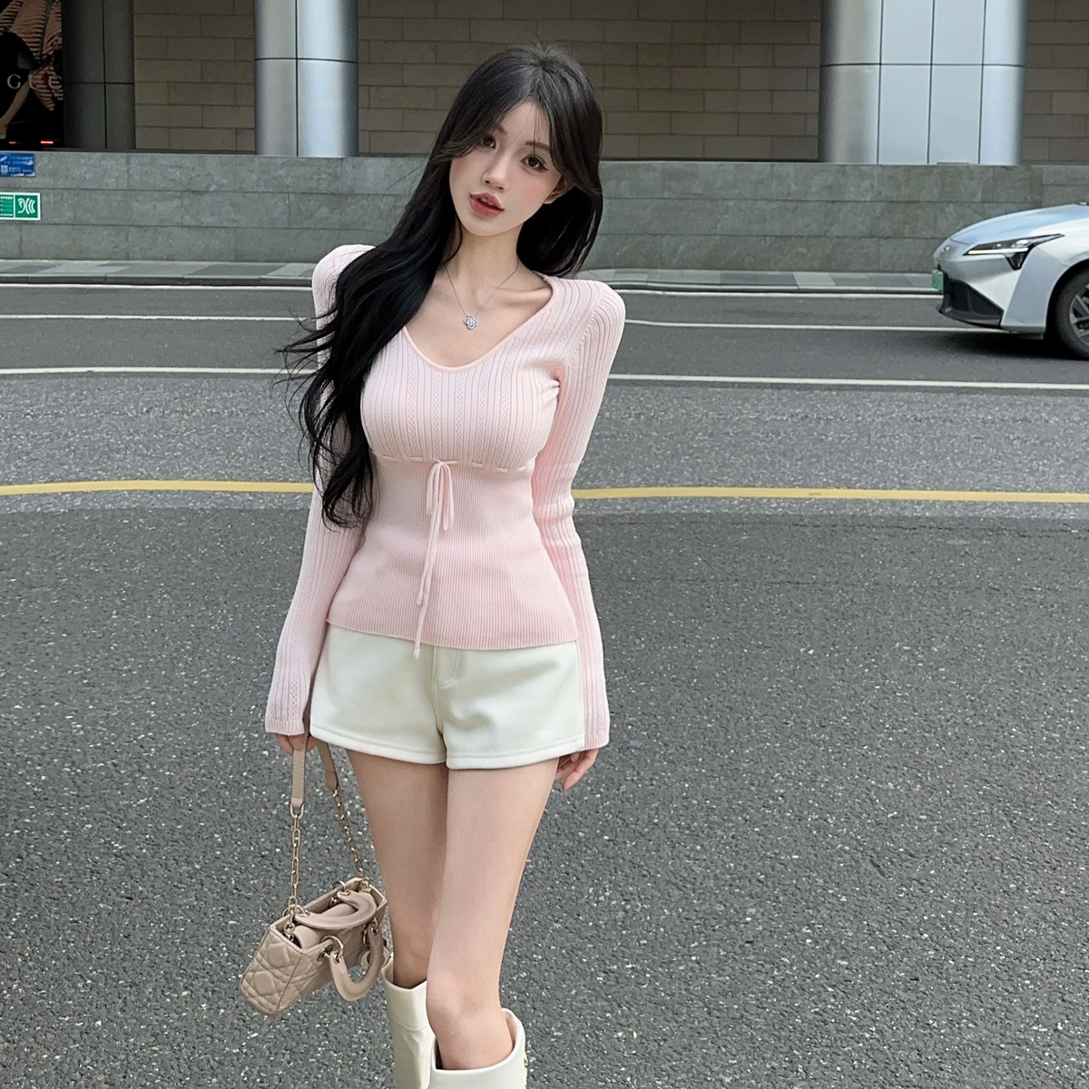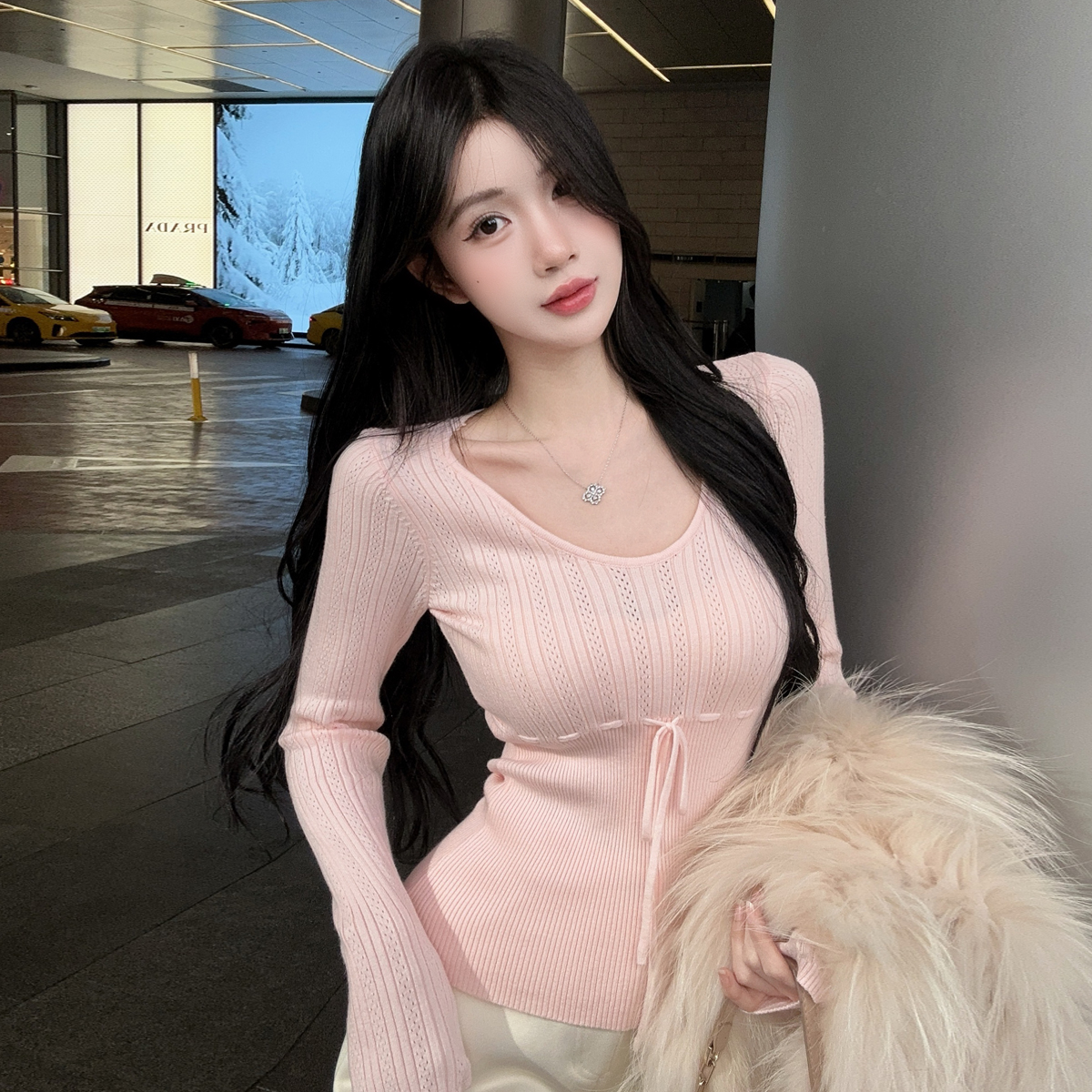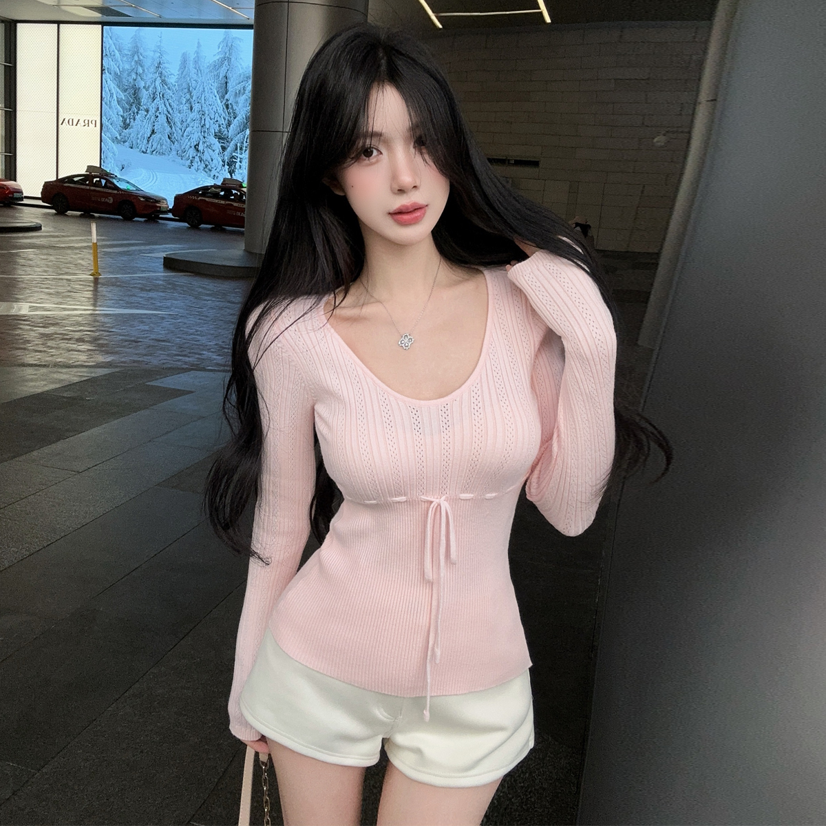 MY16313# 韩系抽绳收腰显瘦U领针织衫T恤百搭长袖打底上衣女裝貨源服裝批發