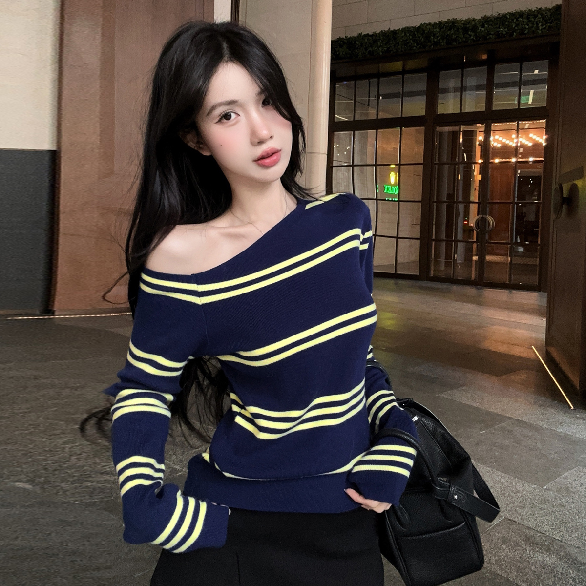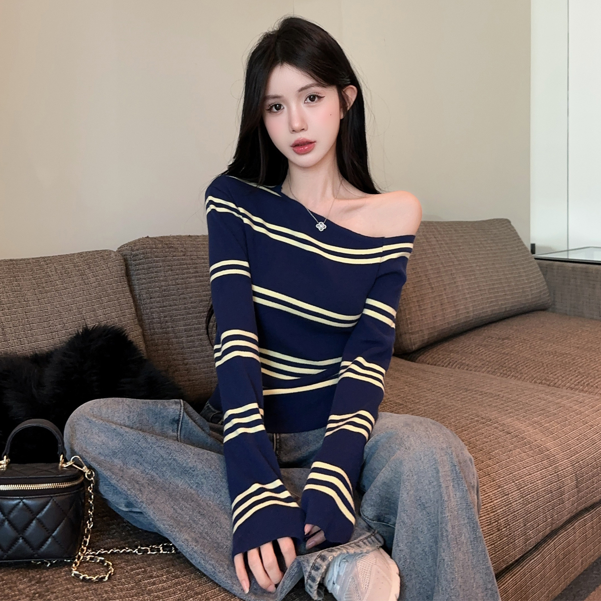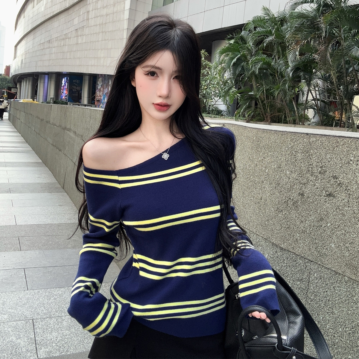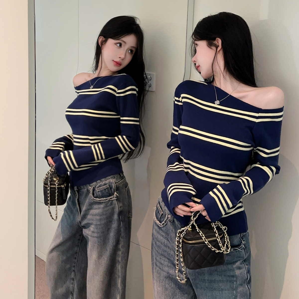 MY16314# 性感露肩条纹针织毛衣斜肩条纹长袖T恤上衣打底衫女裝貨源服裝批發