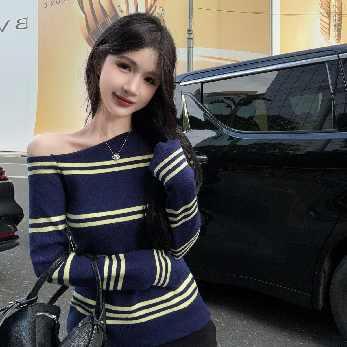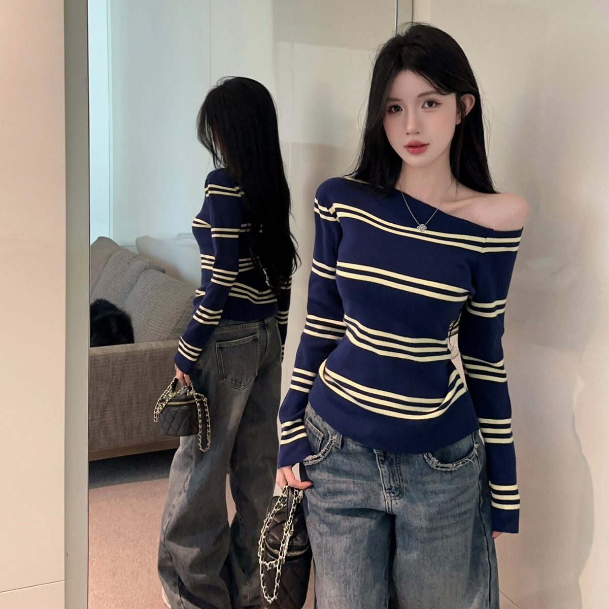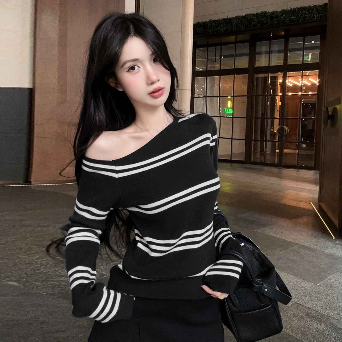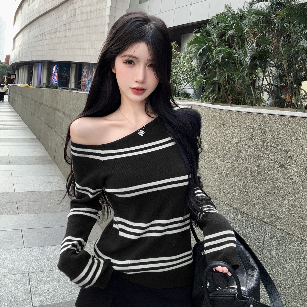 MY16314# 性感露肩条纹针织毛衣斜肩条纹长袖T恤上衣打底衫女裝貨源服裝批發