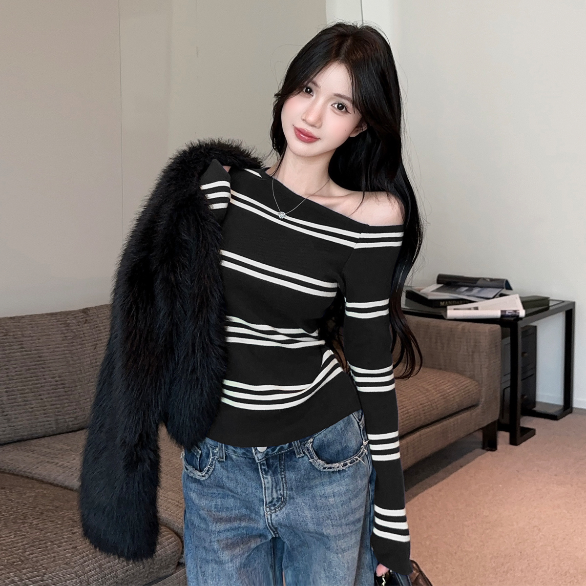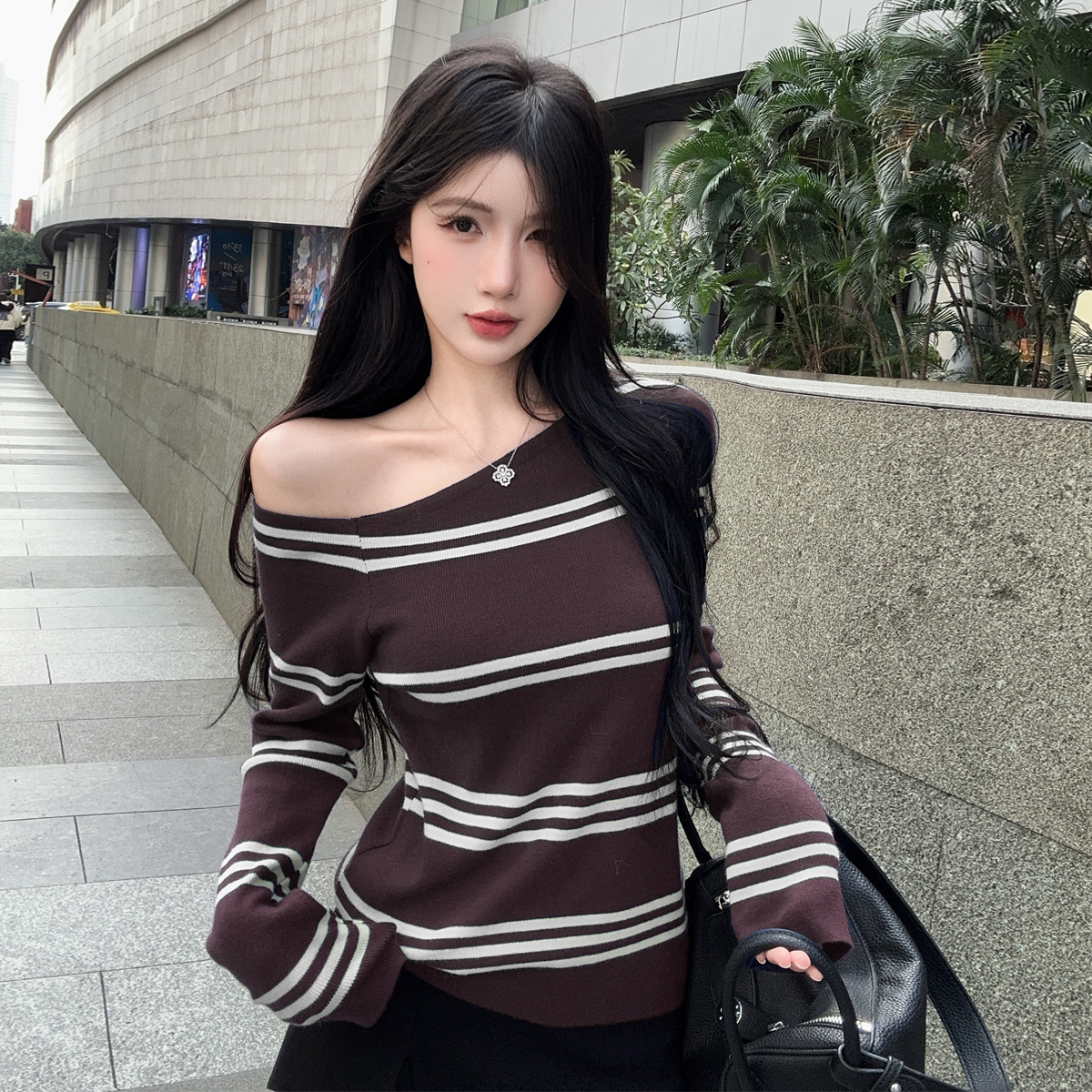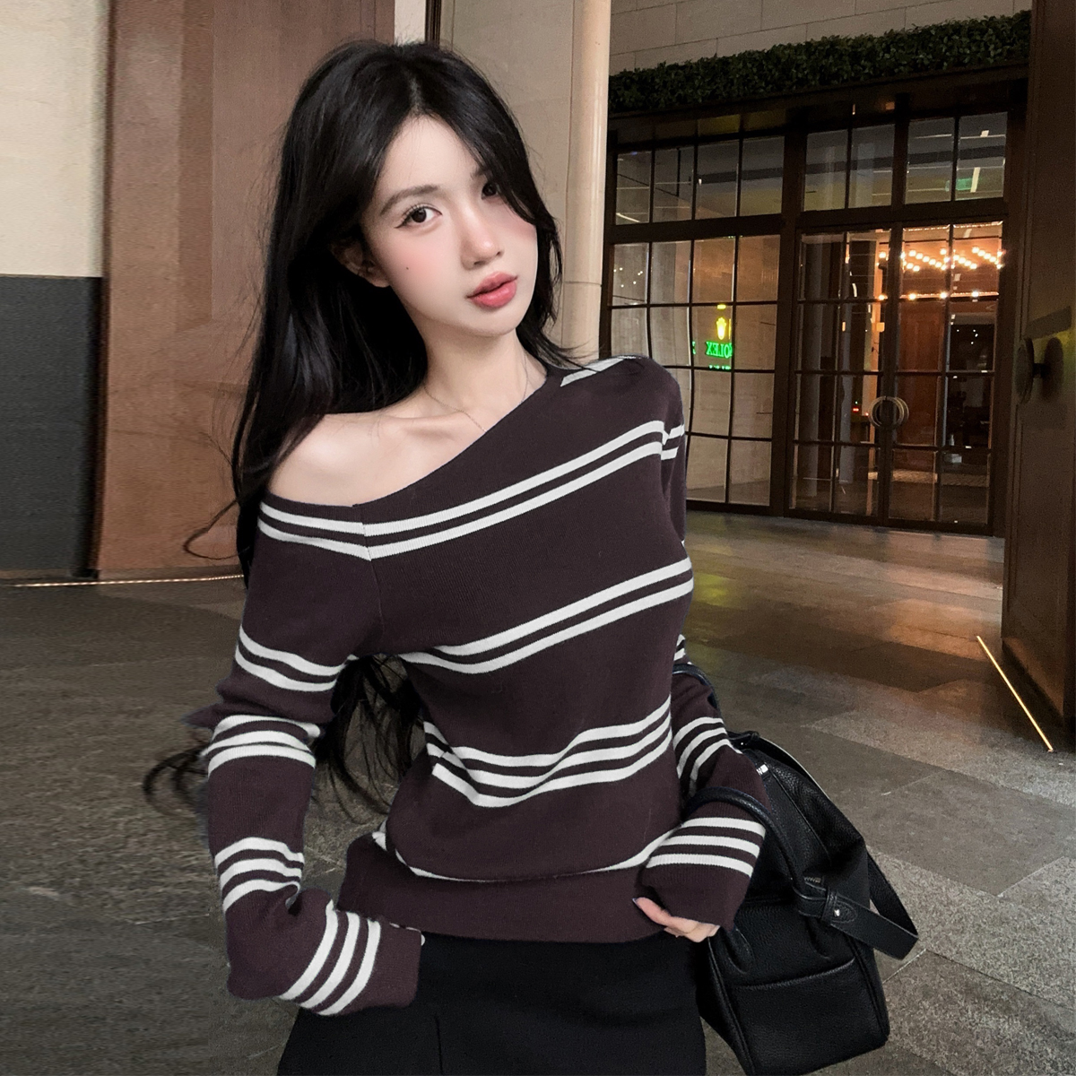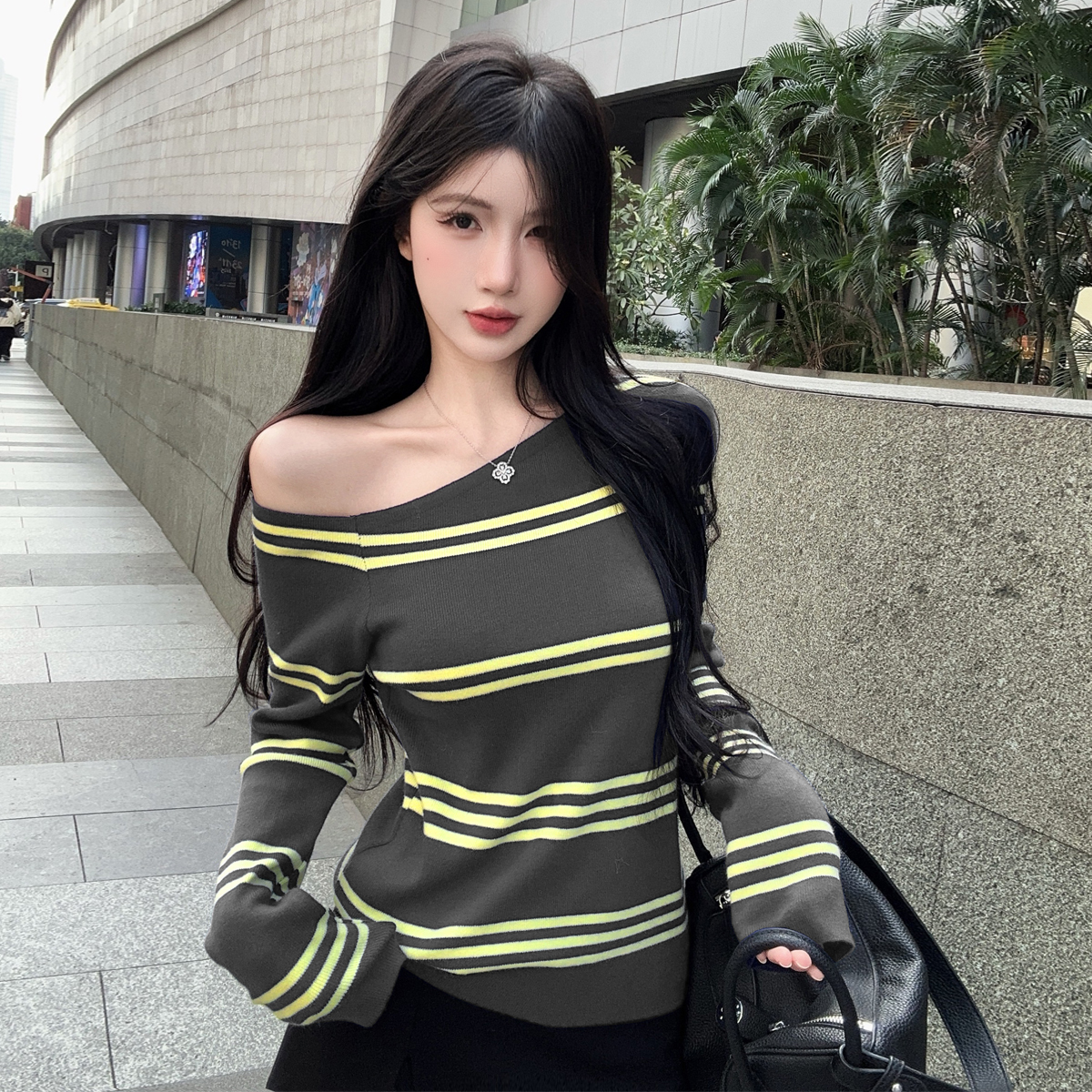MY16314# 性感露肩条纹针织毛衣斜肩条纹长袖T恤上衣打底衫女裝貨源服裝批發