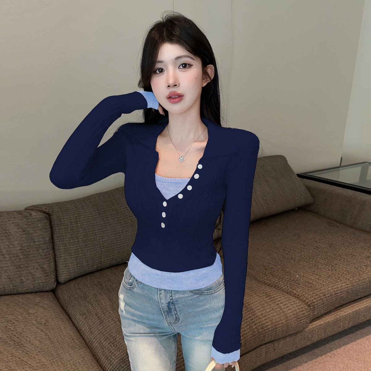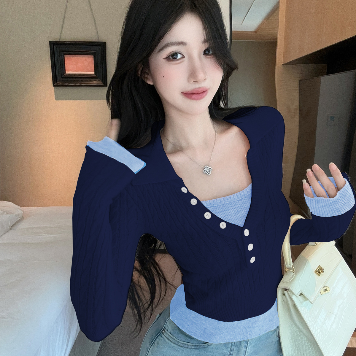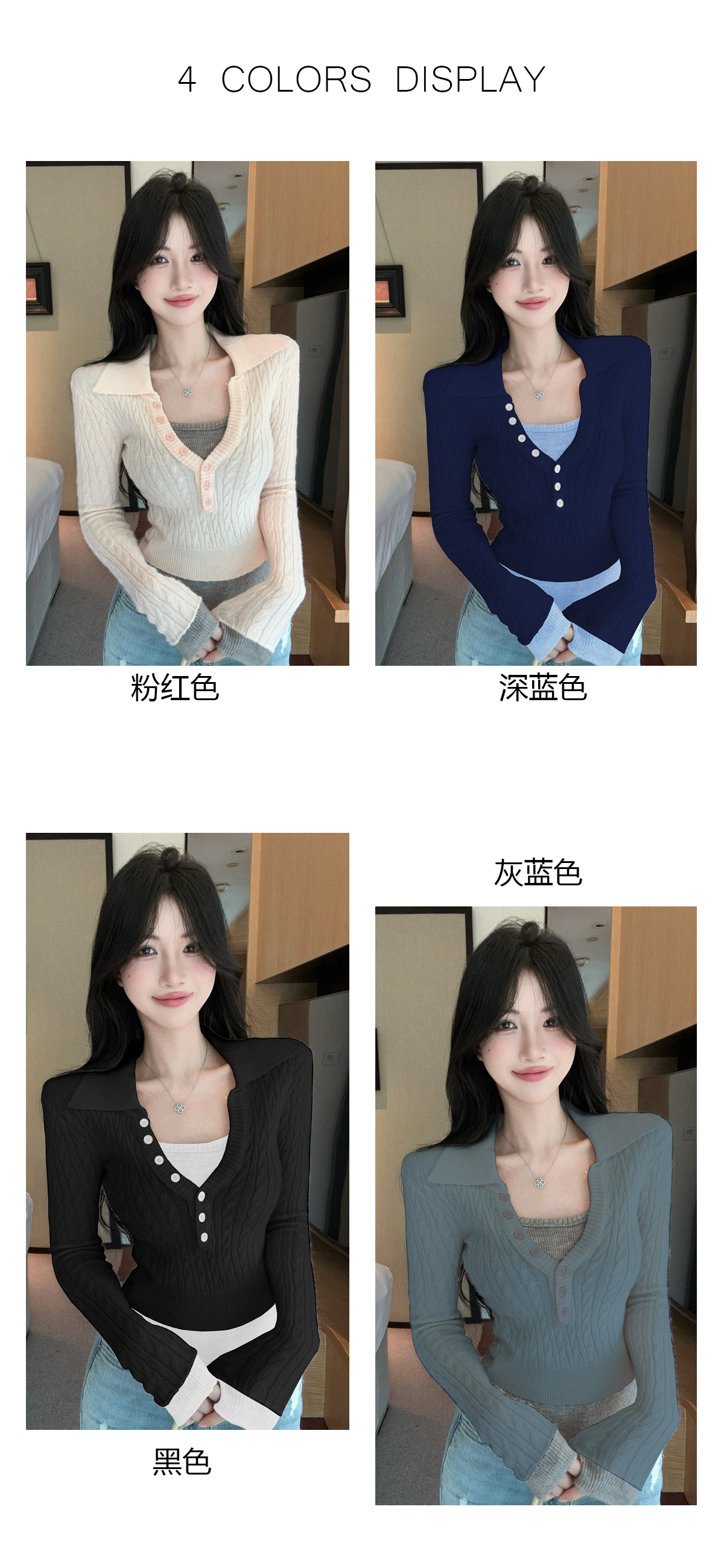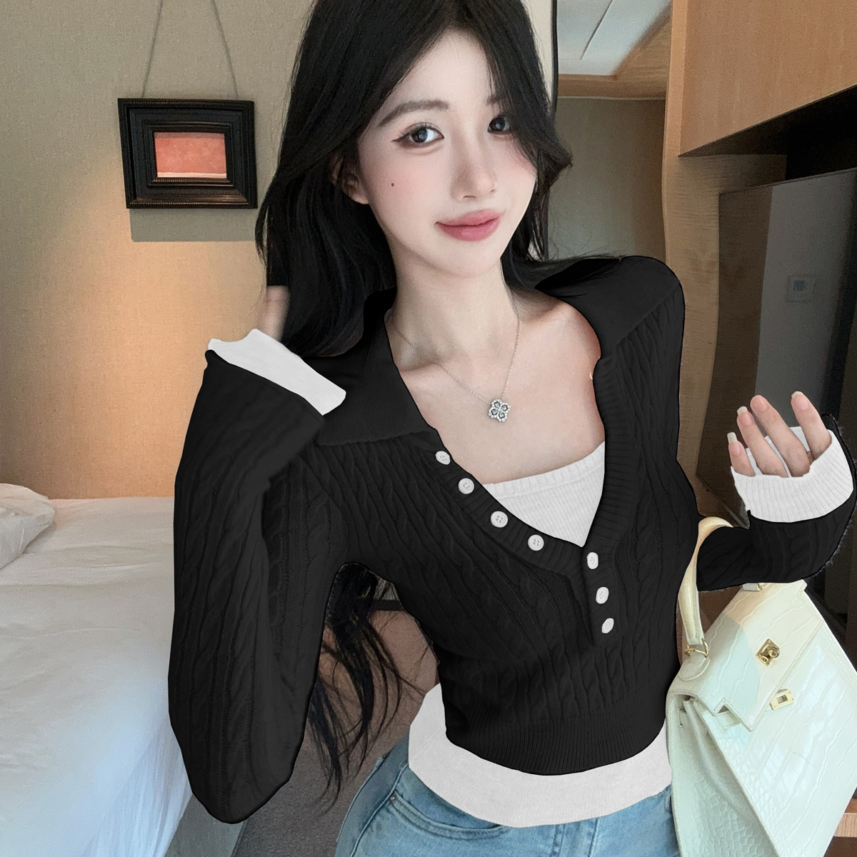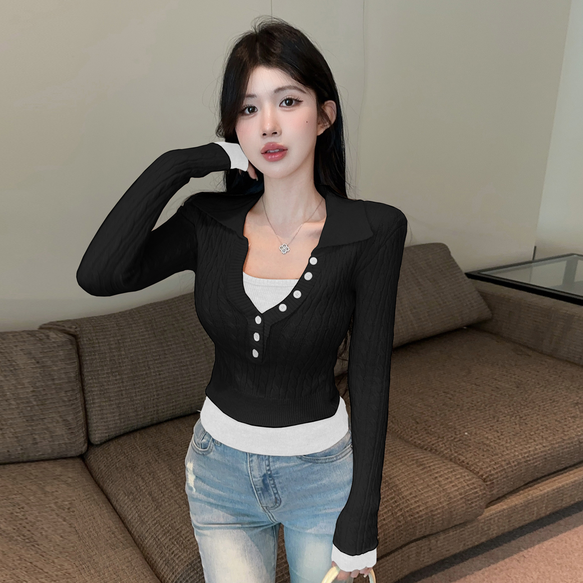 MY16315# 假两件Polo领针织衫气质纯欲v领上衣打底衫内搭麻花毛衣女裝貨源服裝批發