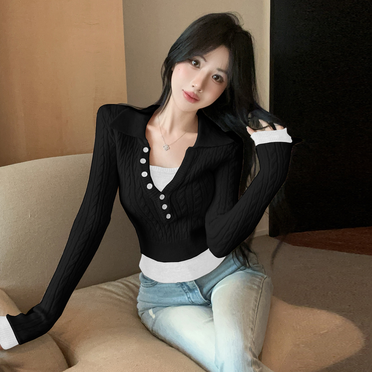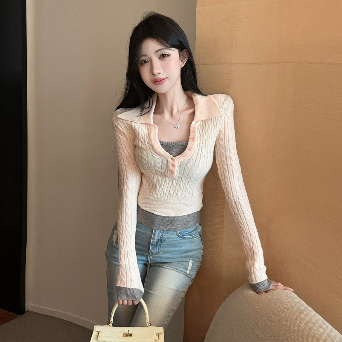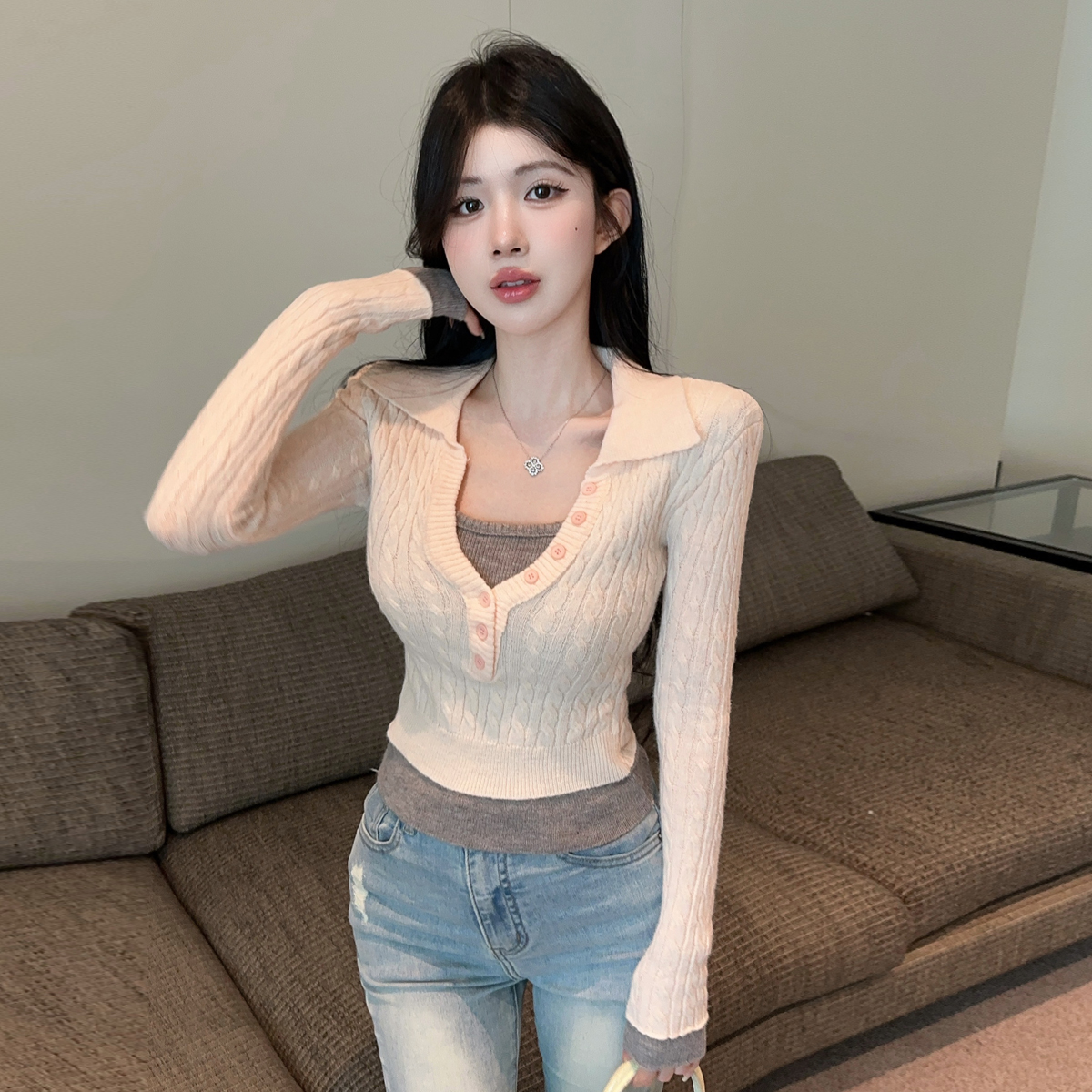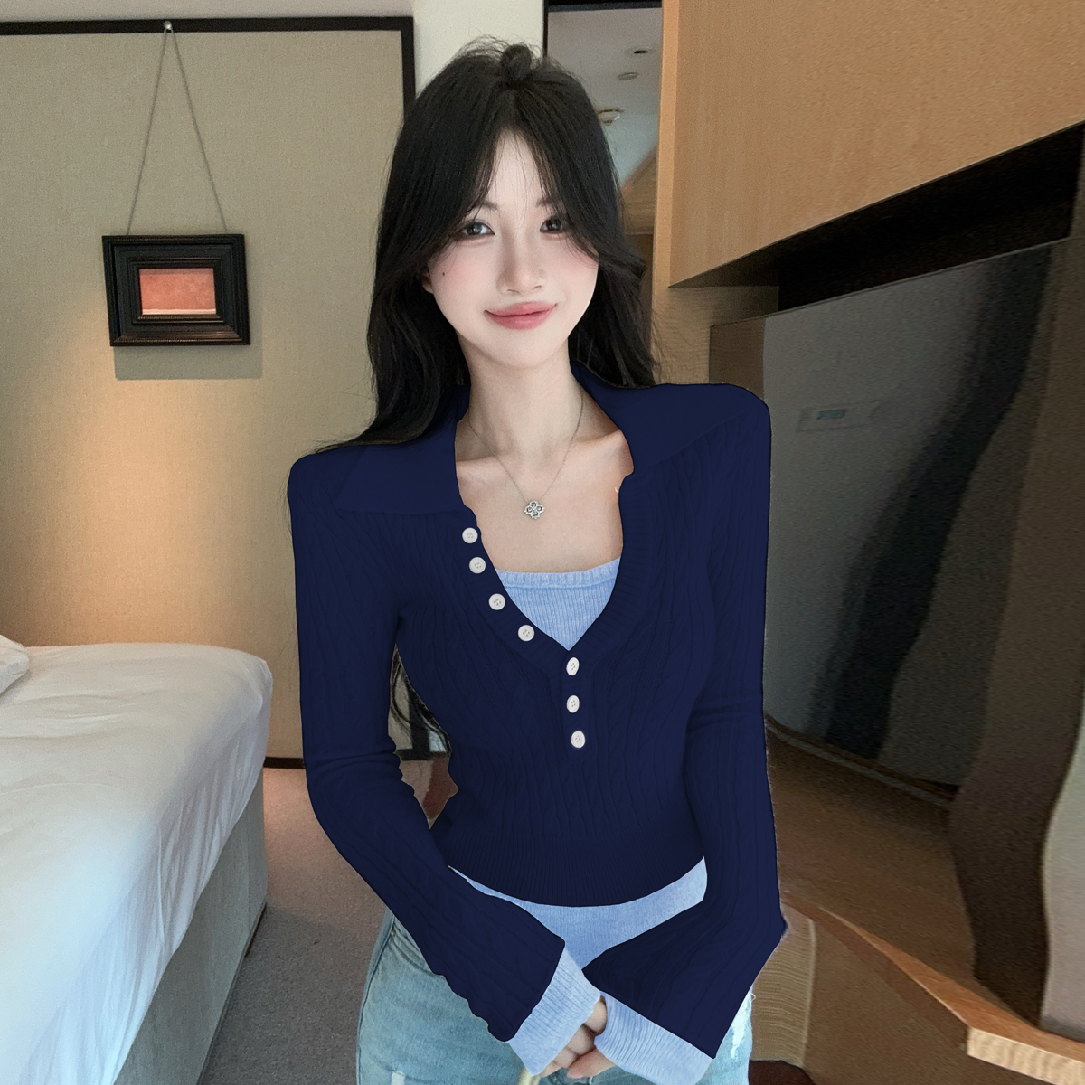 MY16315# 假两件Polo领针织衫气质纯欲v领上衣打底衫内搭麻花毛衣女裝貨源服裝批發