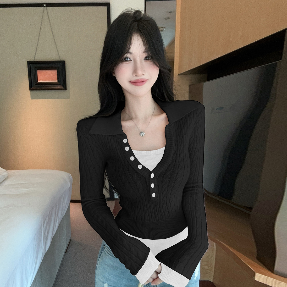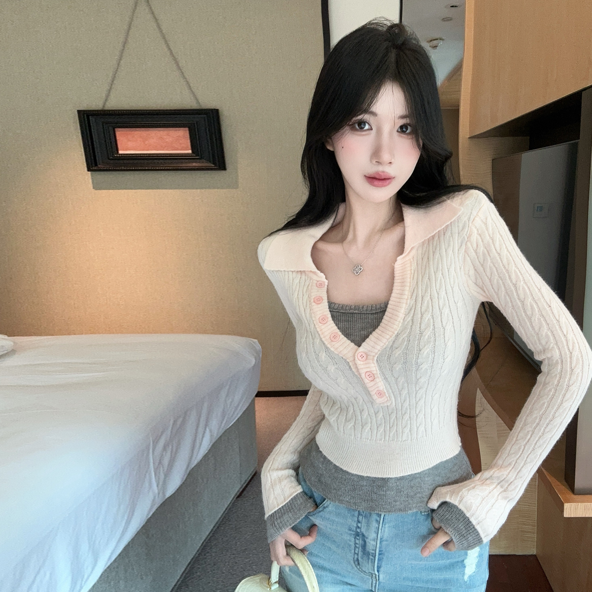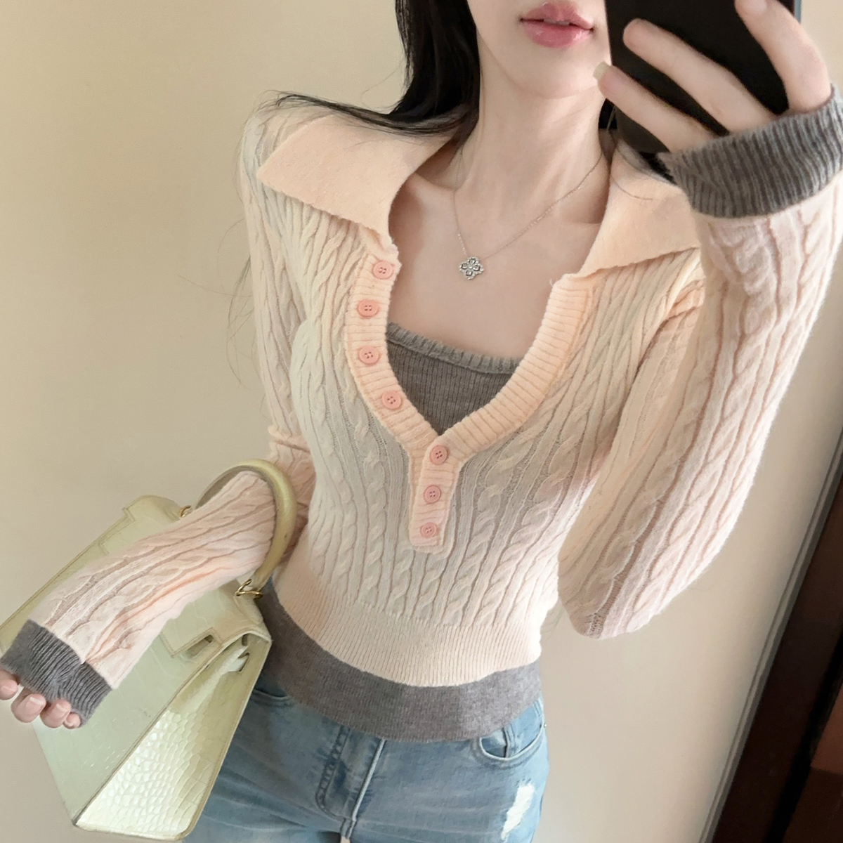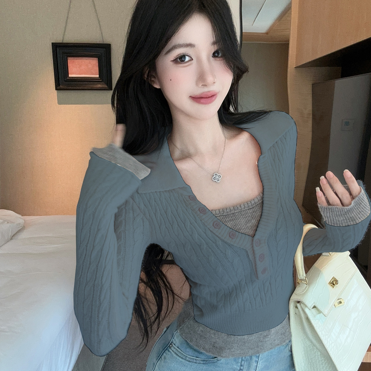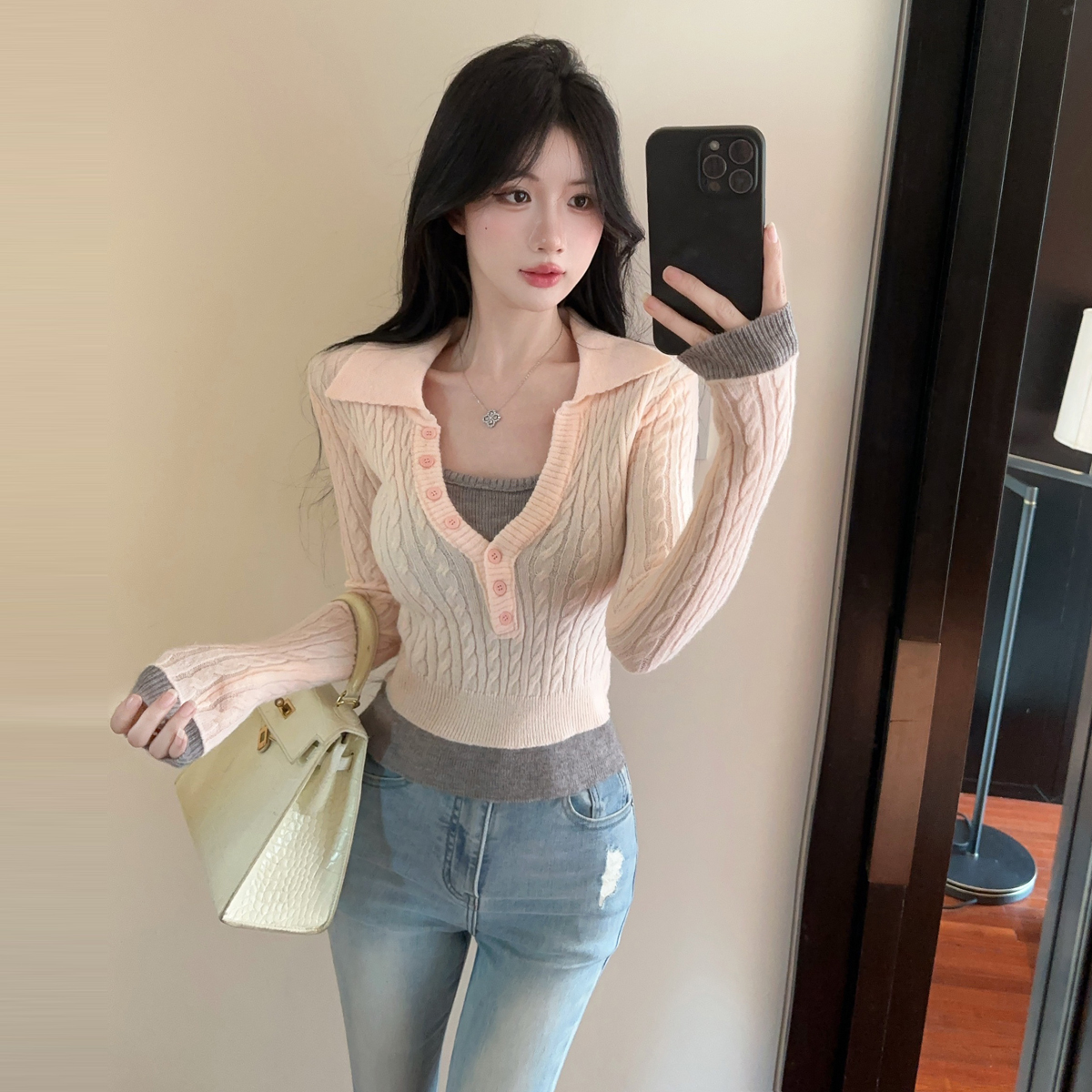 MY16315# 假两件Polo领针织衫气质纯欲v领上衣打底衫内搭麻花毛衣女裝貨源服裝批發