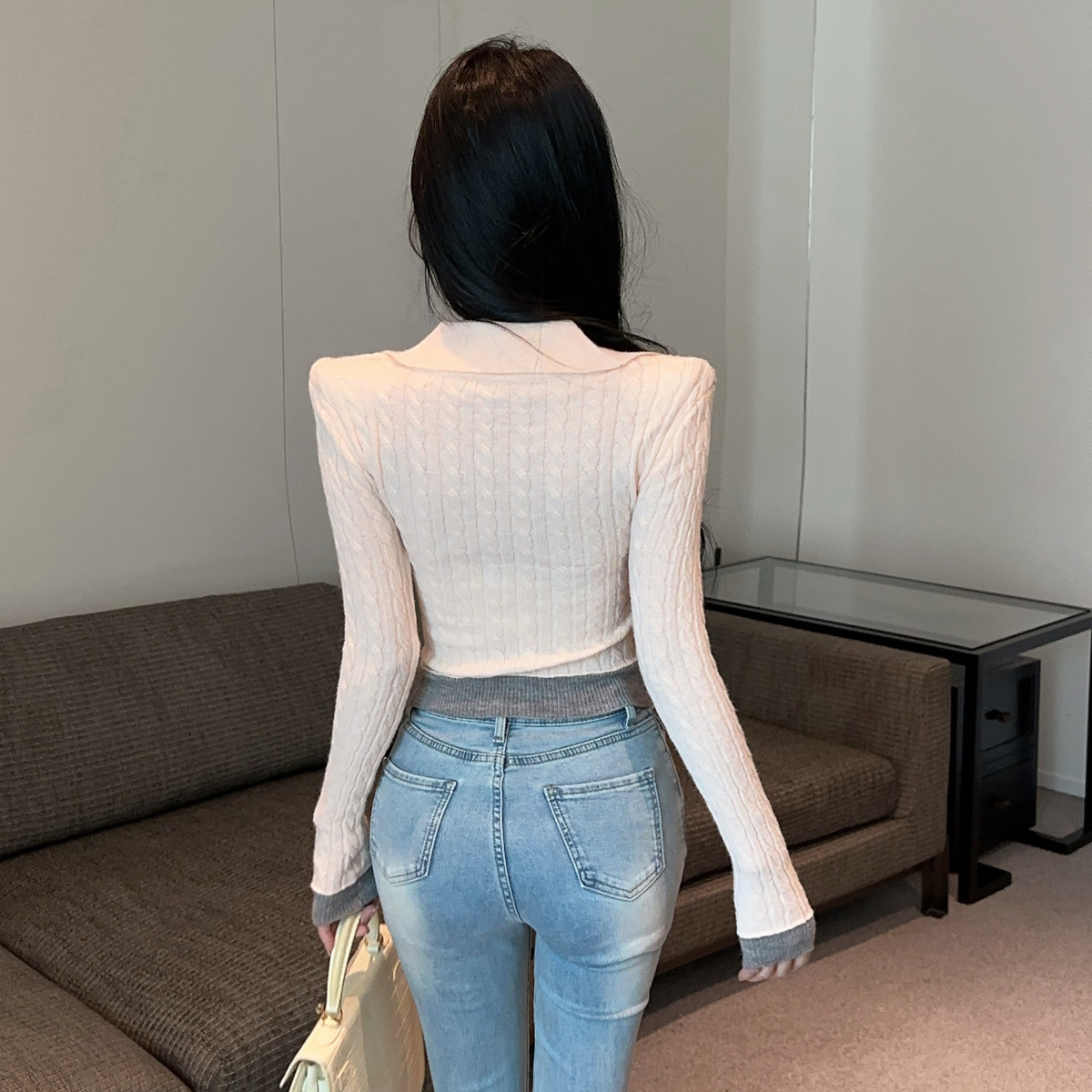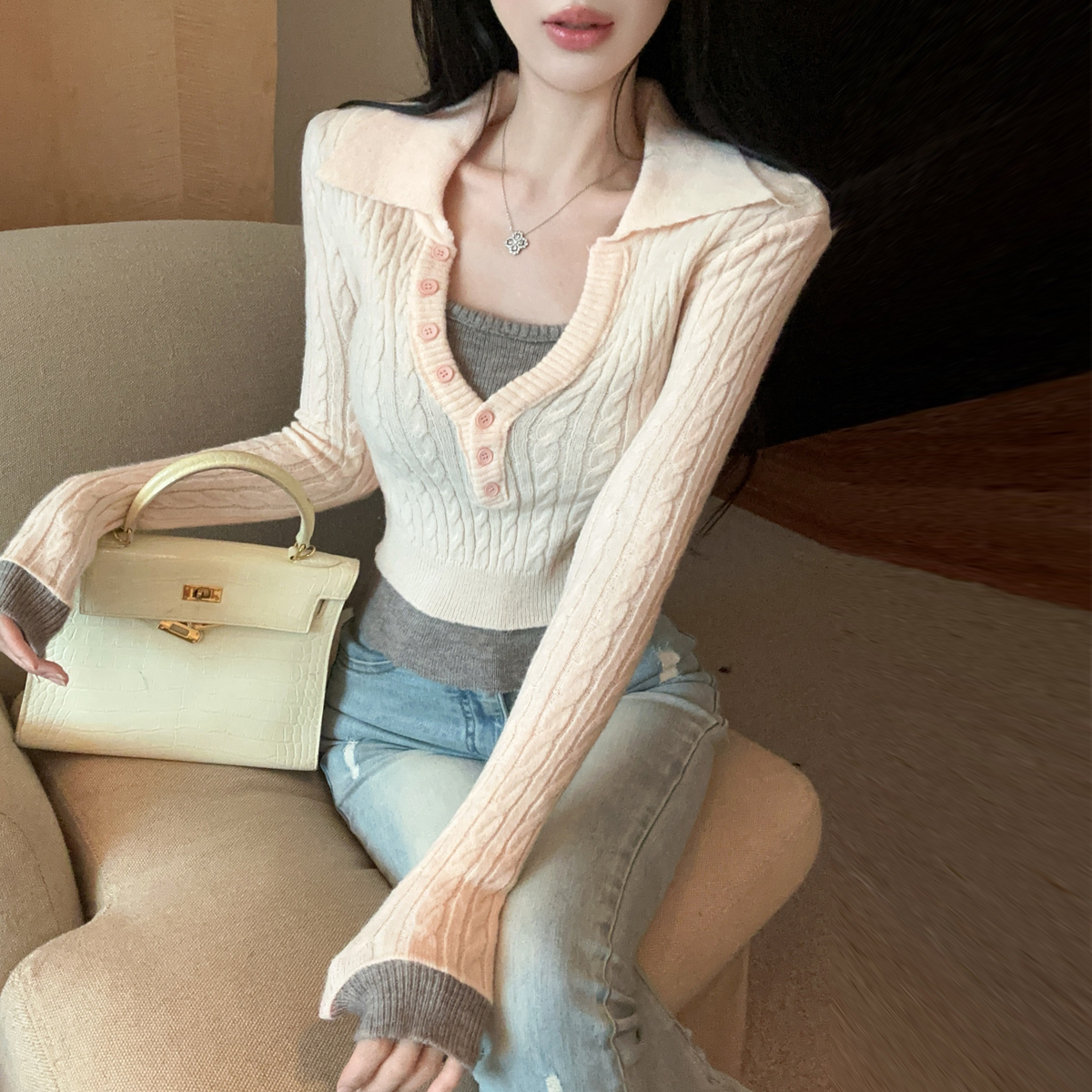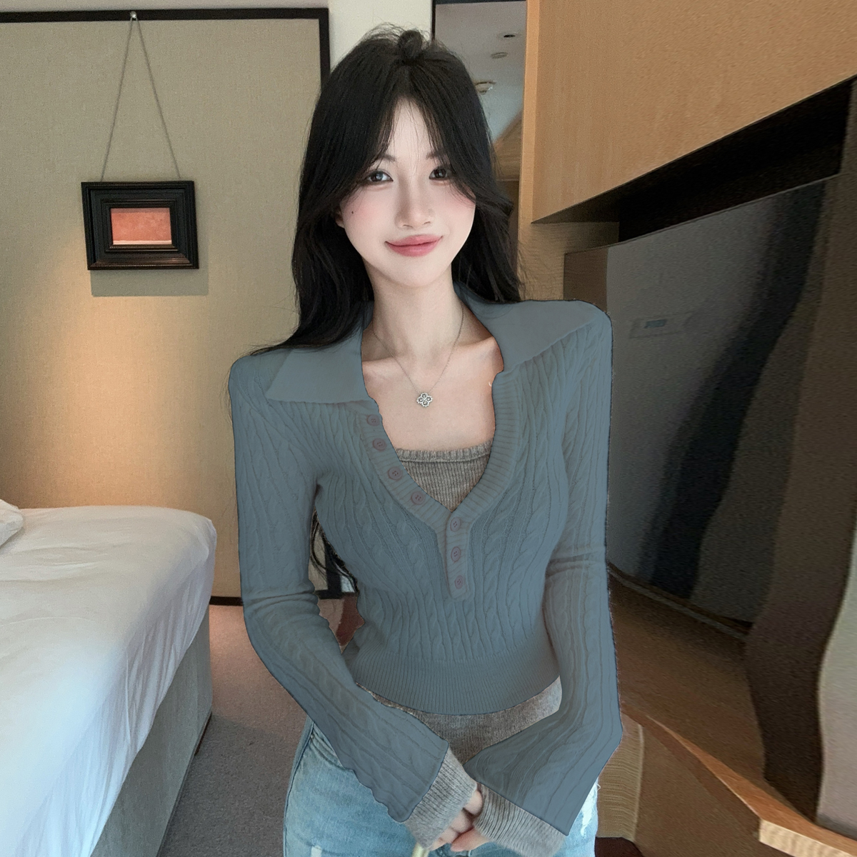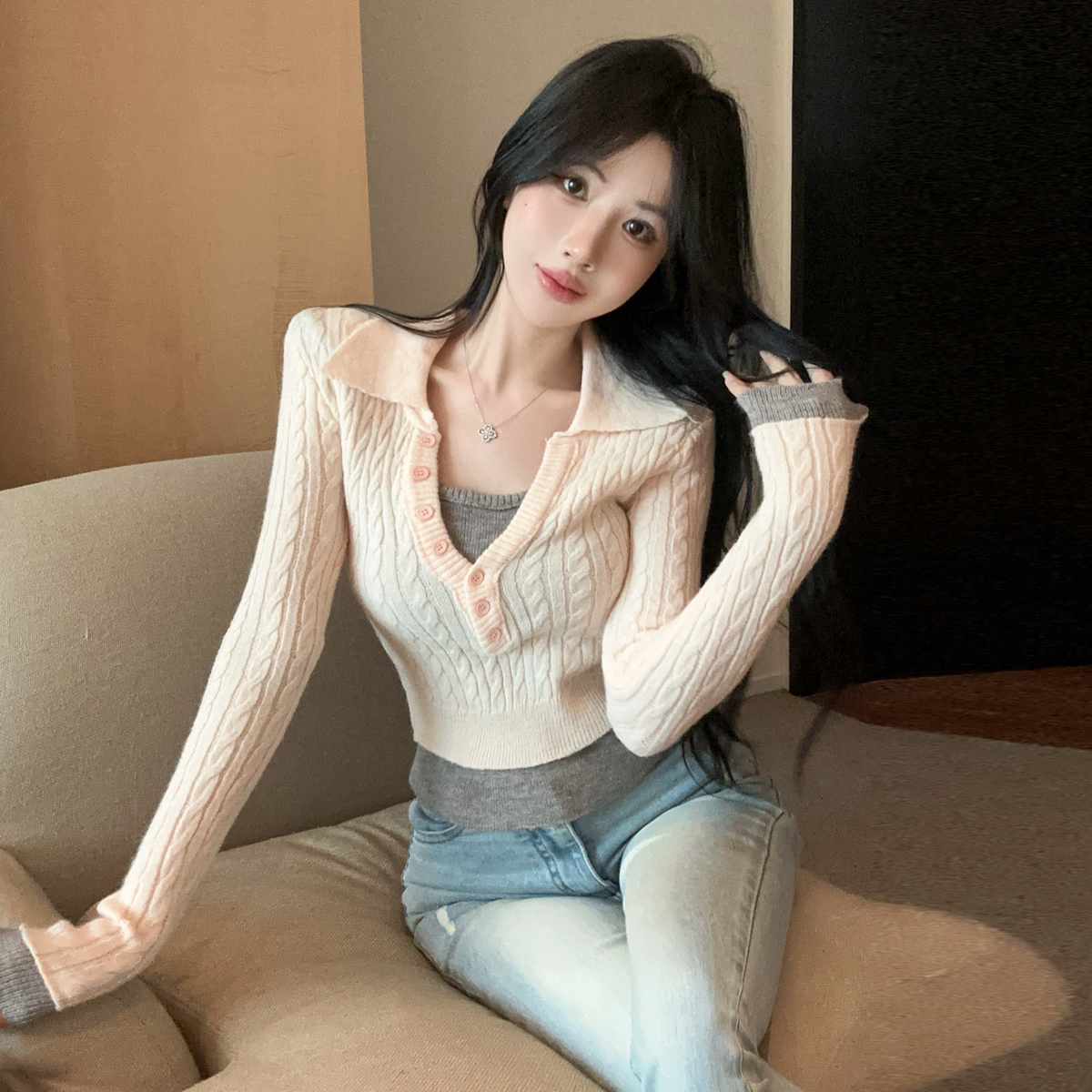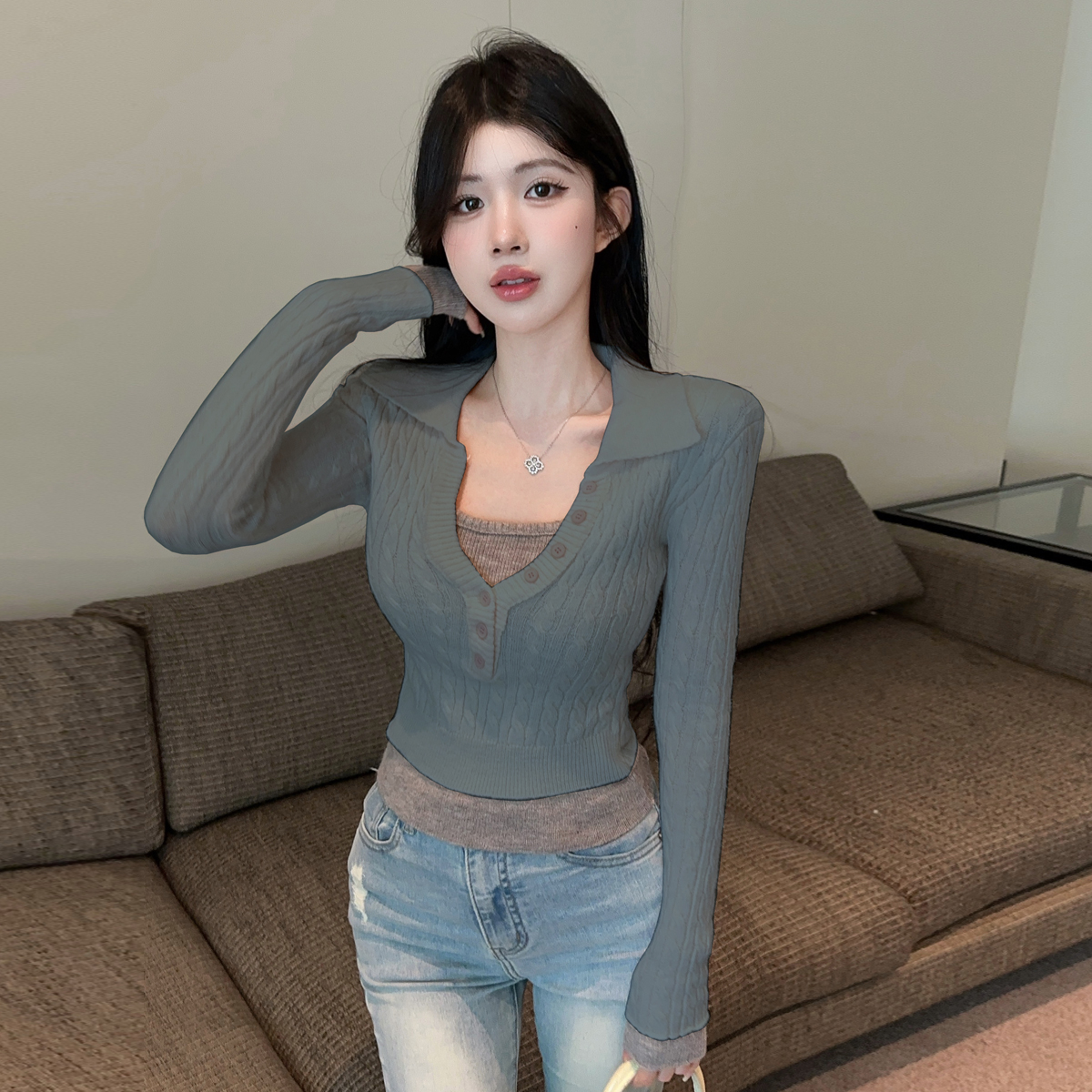 MY16315# 假两件Polo领针织衫气质纯欲v领上衣打底衫内搭麻花毛衣女裝貨源服裝批發