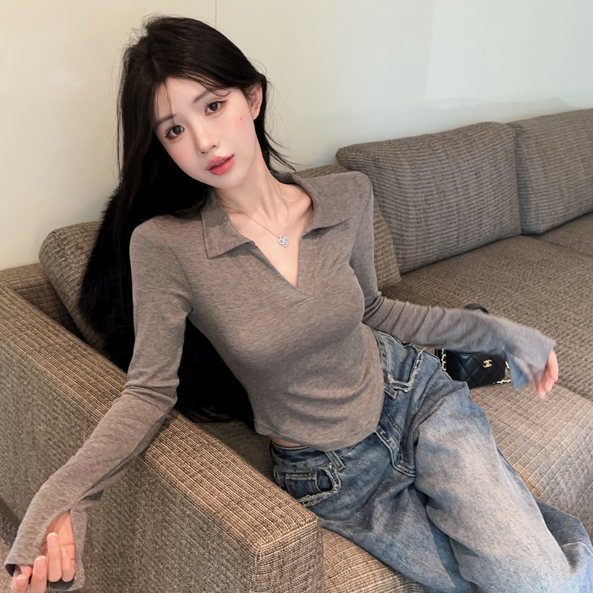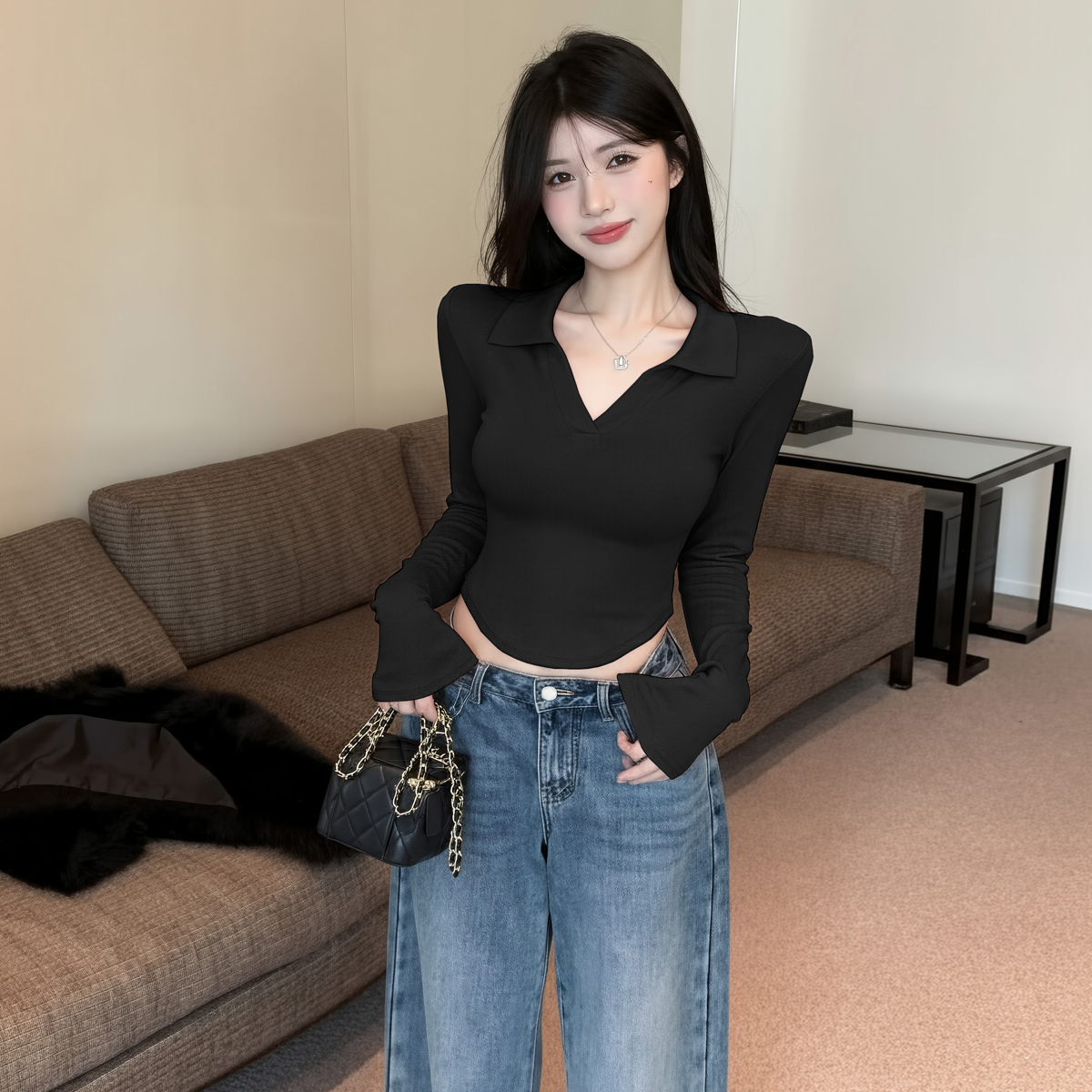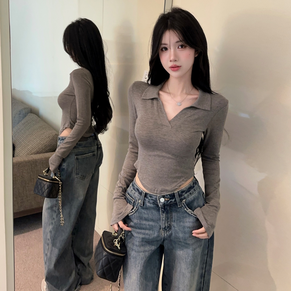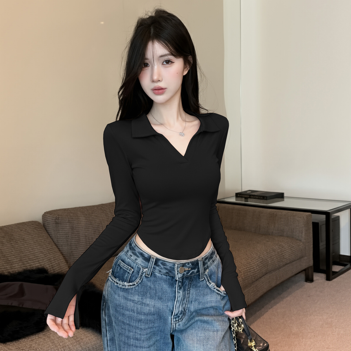 MY16316# 休闲polo领开叉长袖T恤衫纯欲辣妹短款露腰修身显瘦打底上衣女裝貨源服裝批發