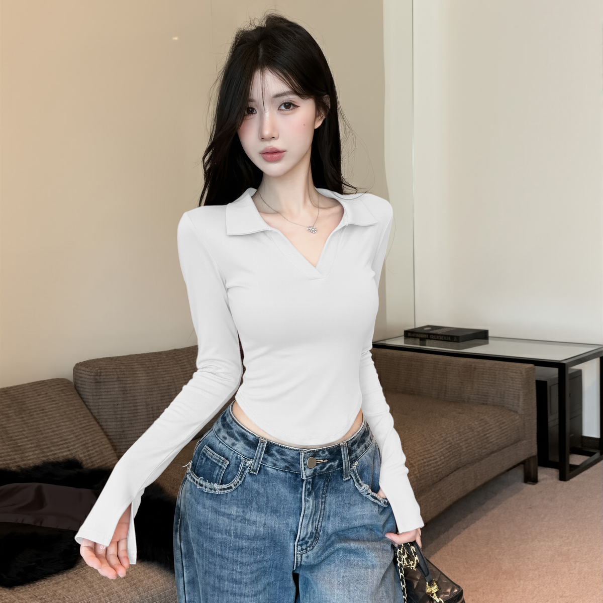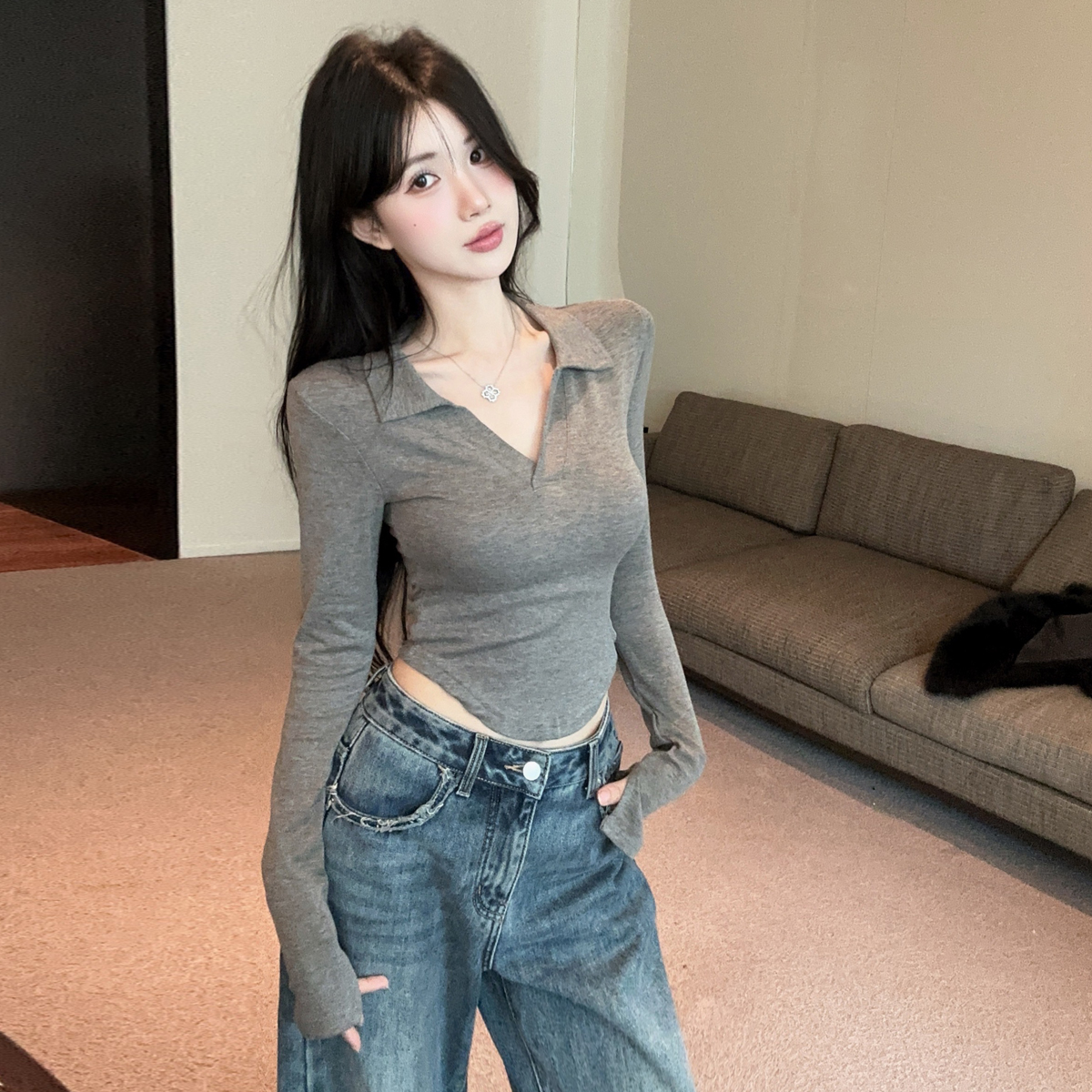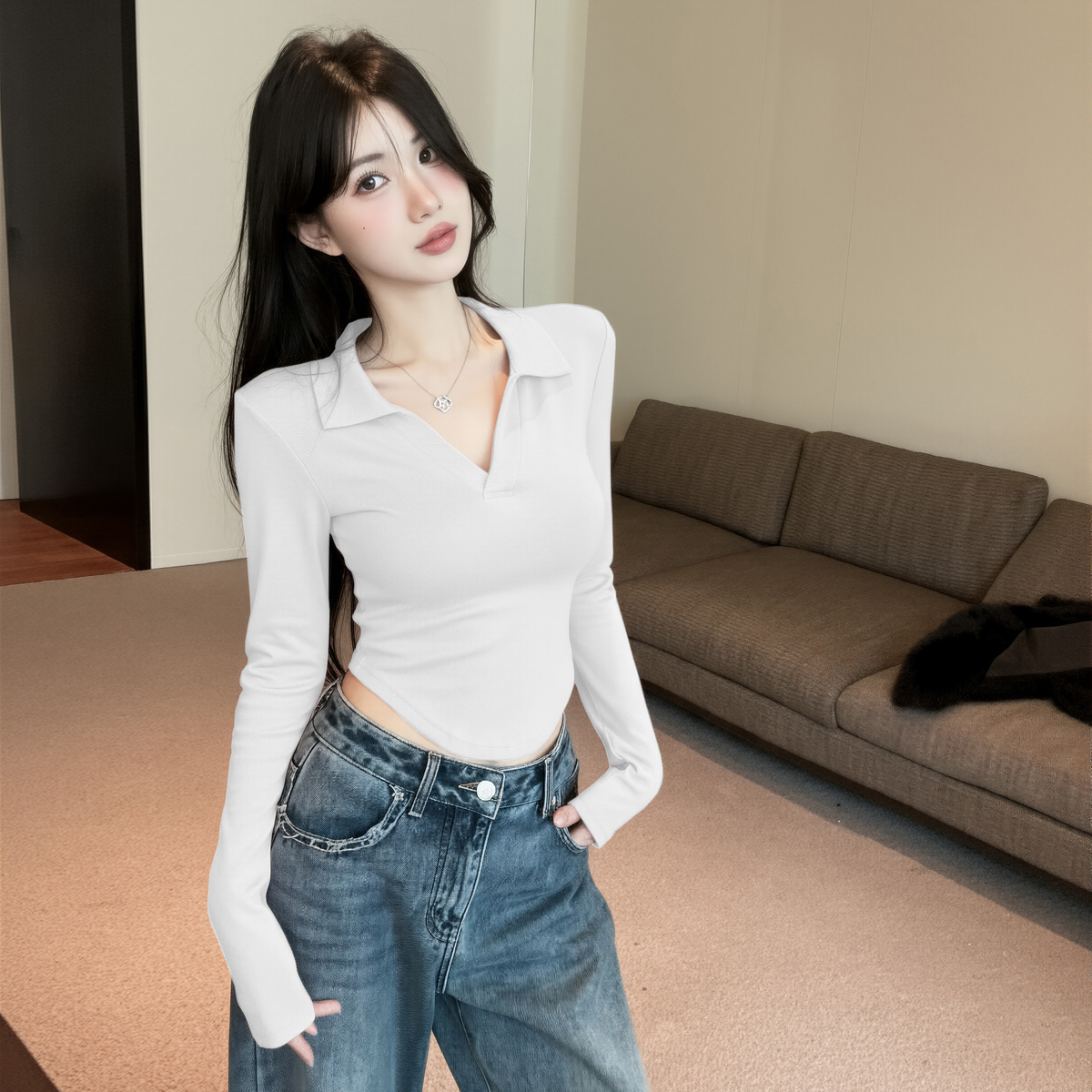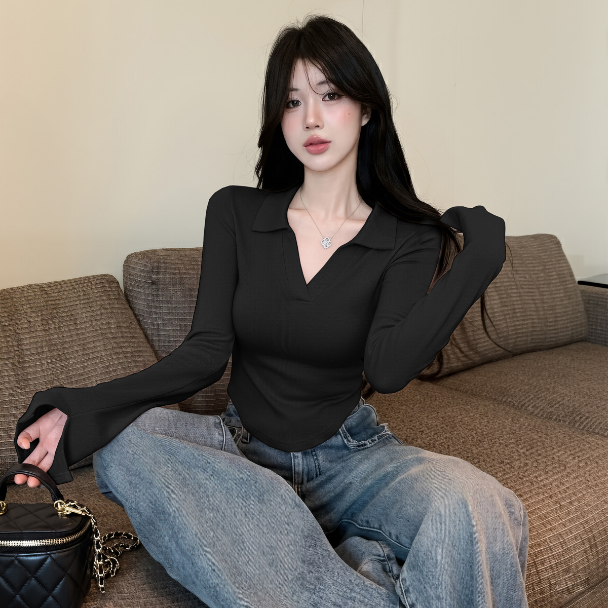 MY16316# 休闲polo领开叉长袖T恤衫纯欲辣妹短款露腰修身显瘦打底上衣女裝貨源服裝批發