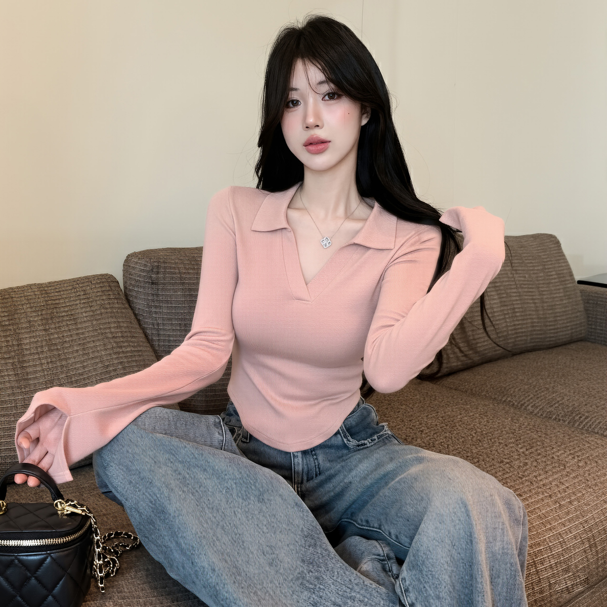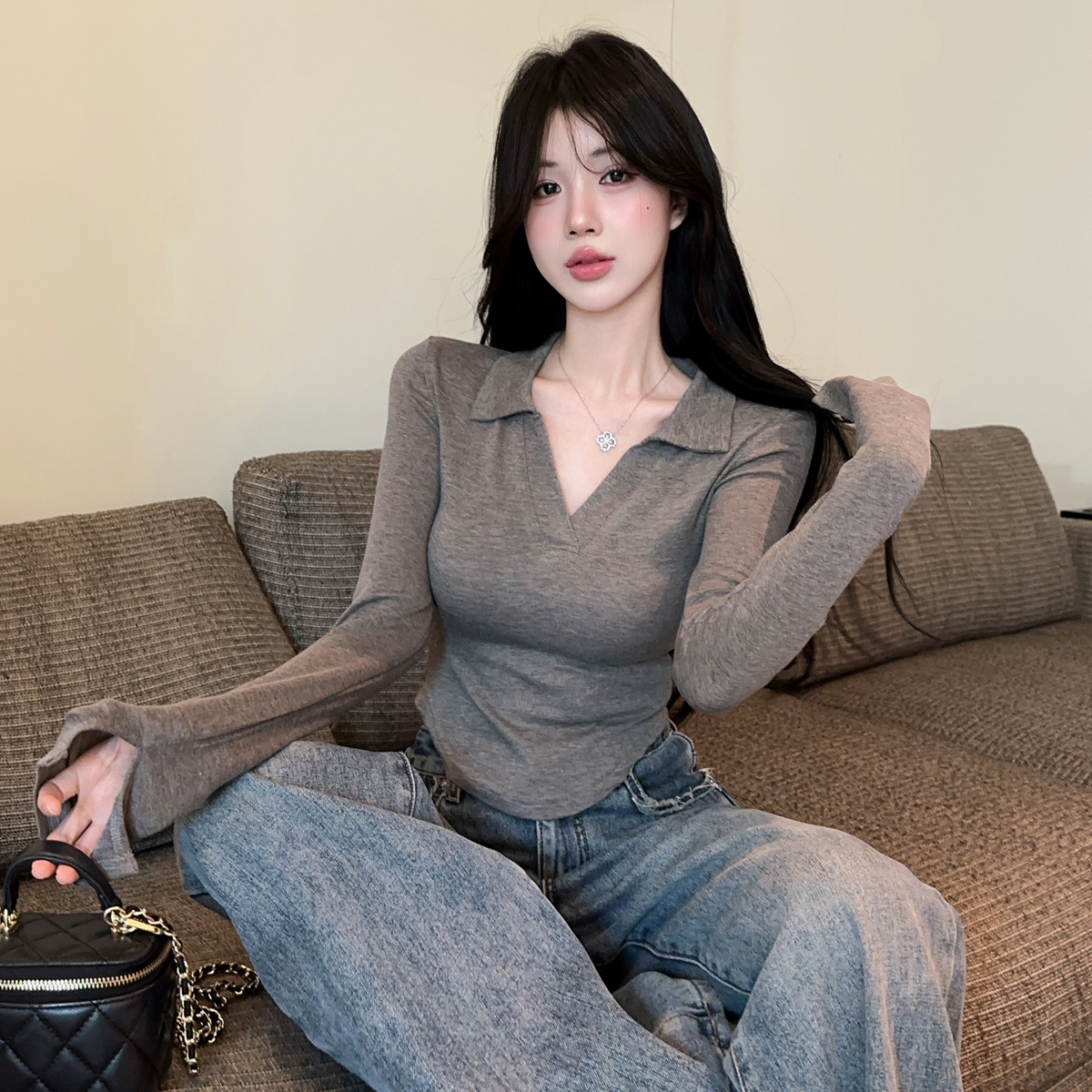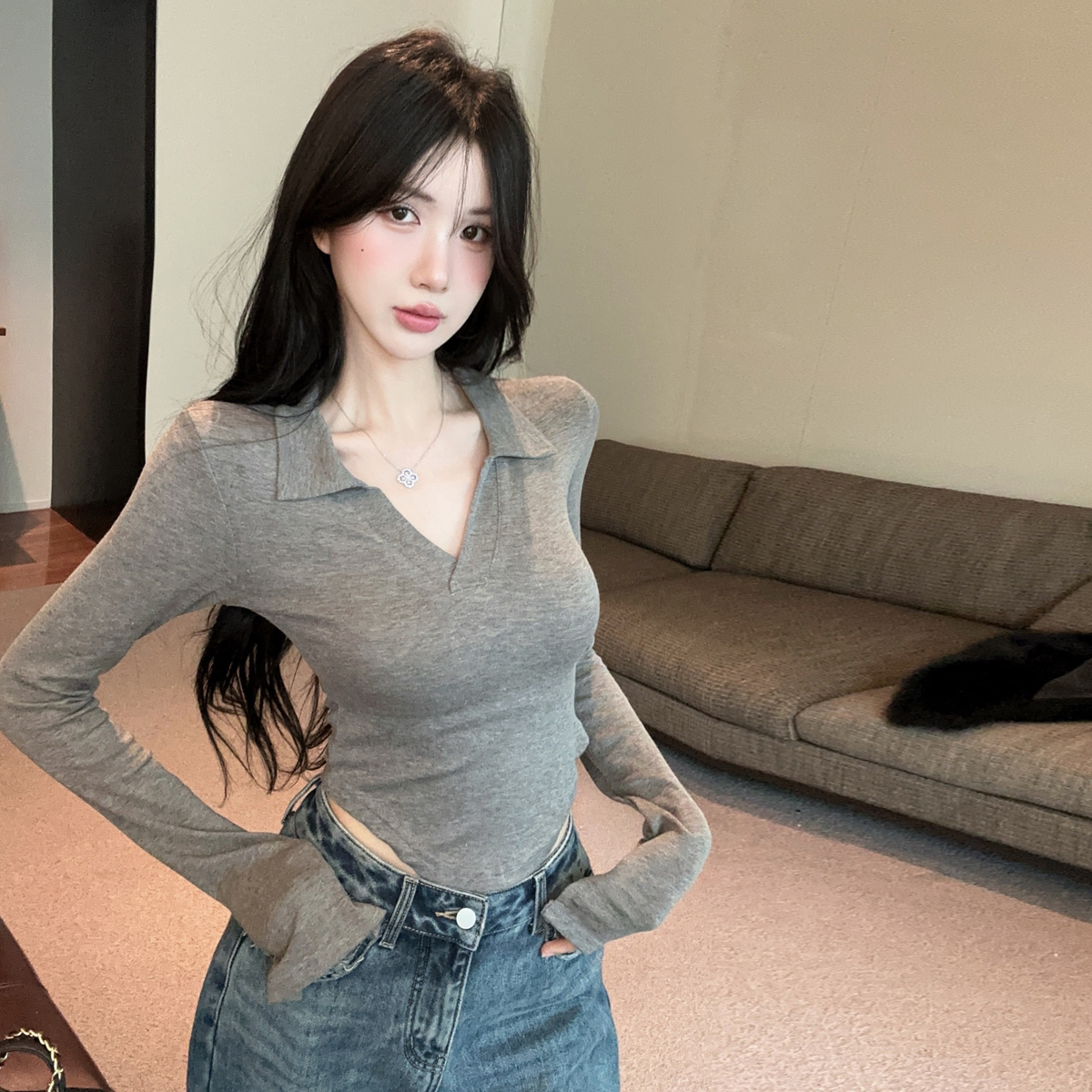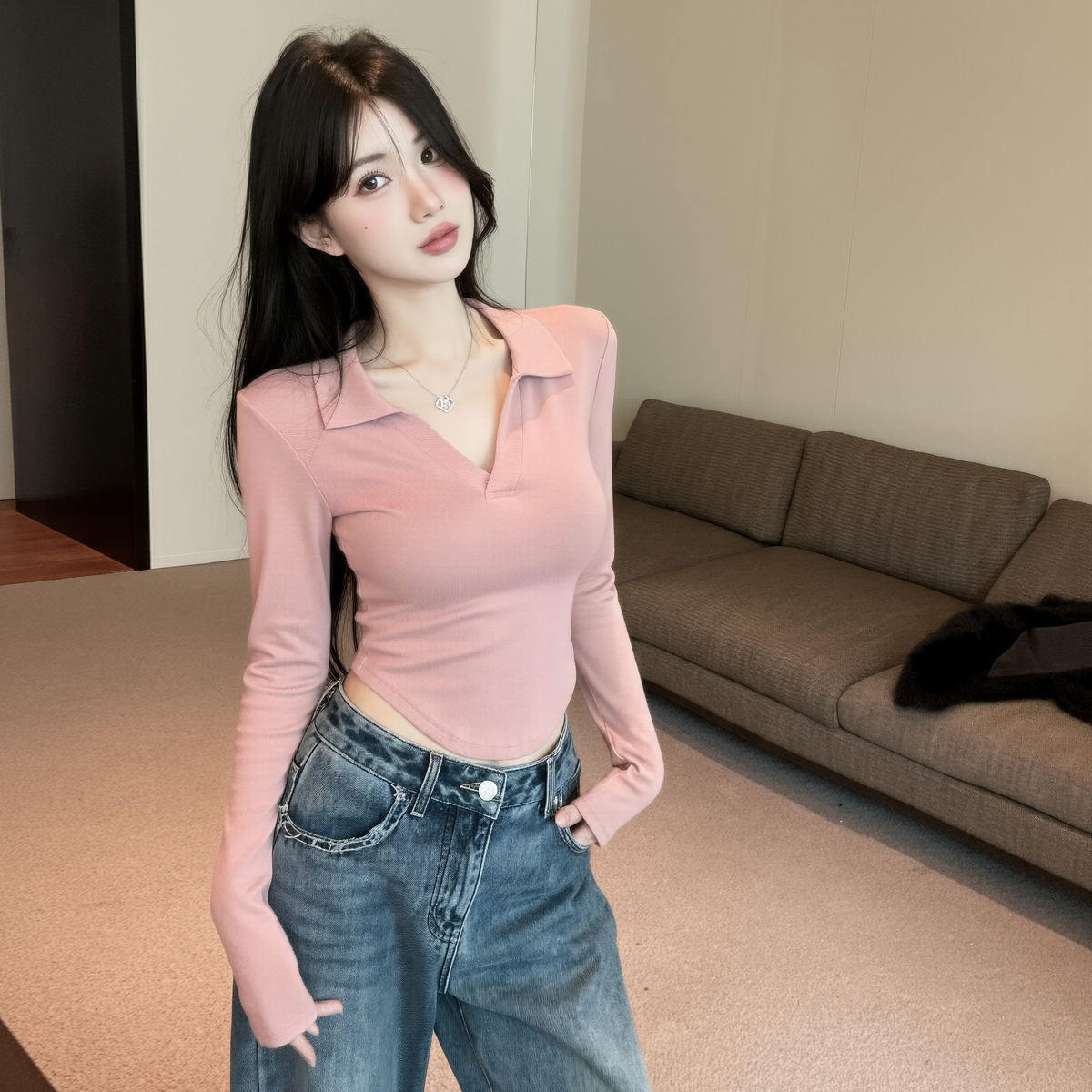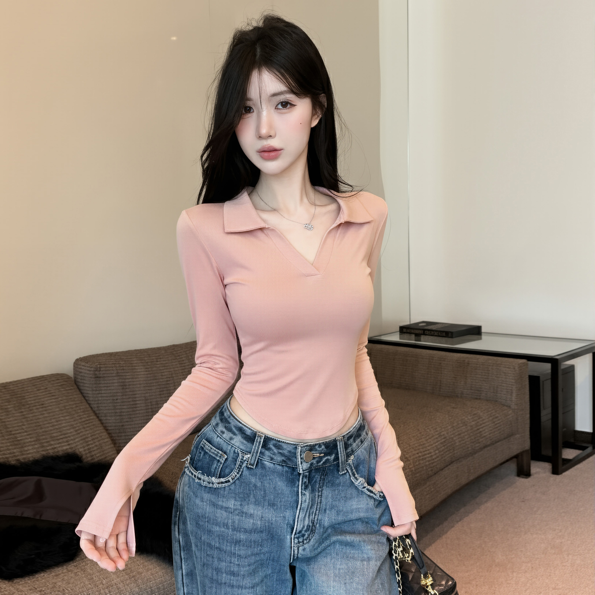 MY16316# 休闲polo领开叉长袖T恤衫纯欲辣妹短款露腰修身显瘦打底上衣女裝貨源服裝批發