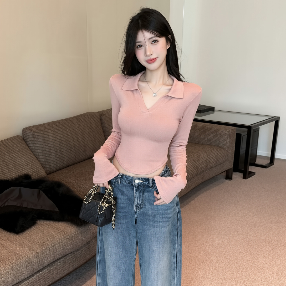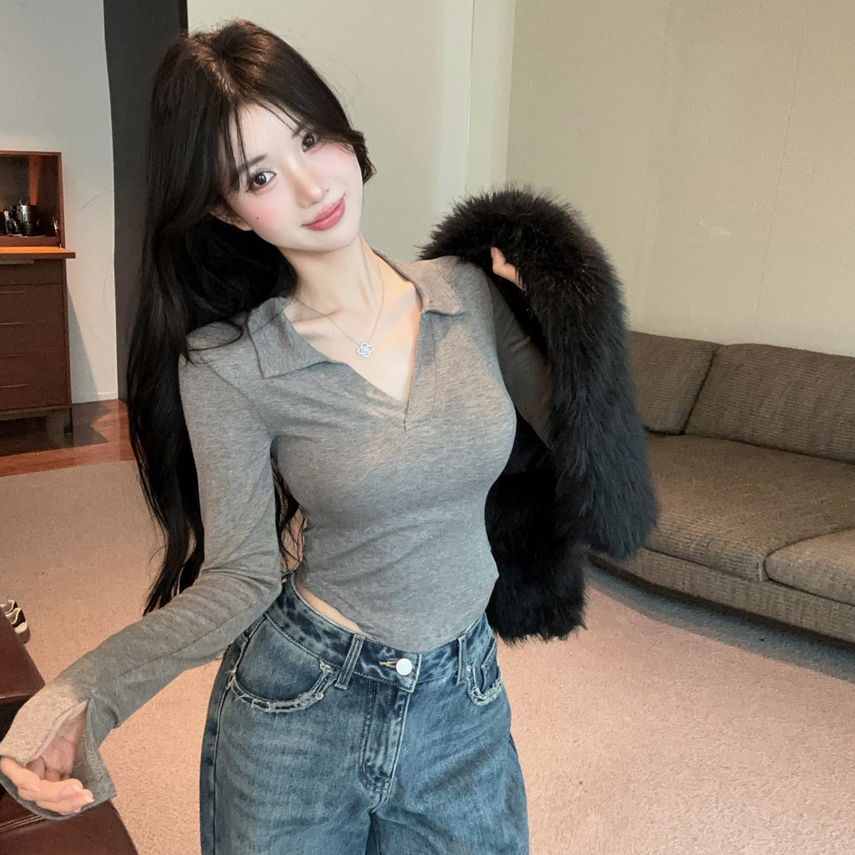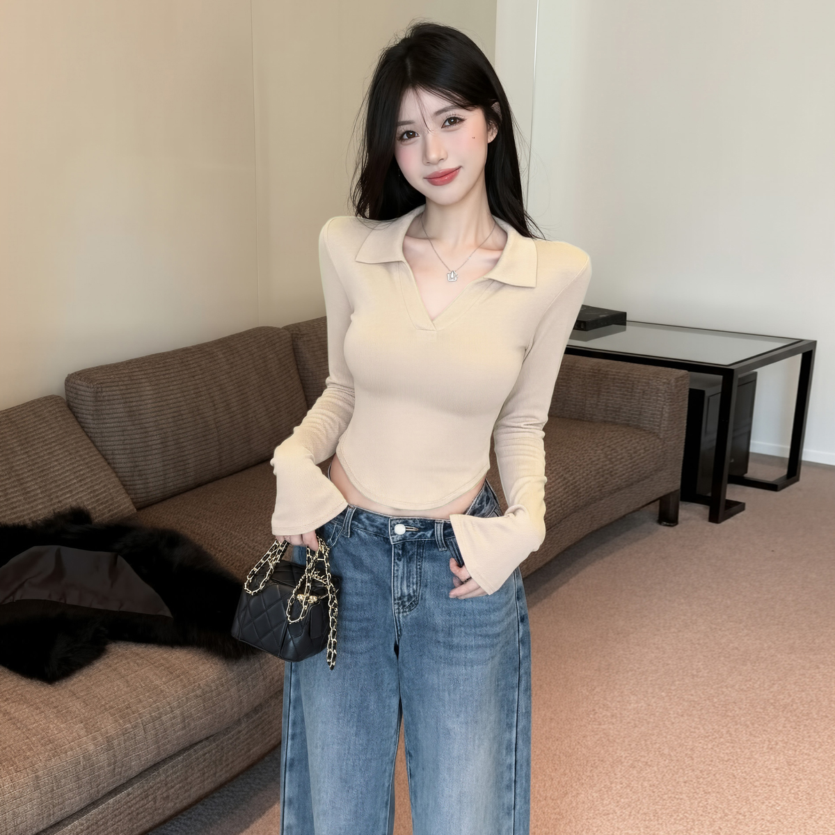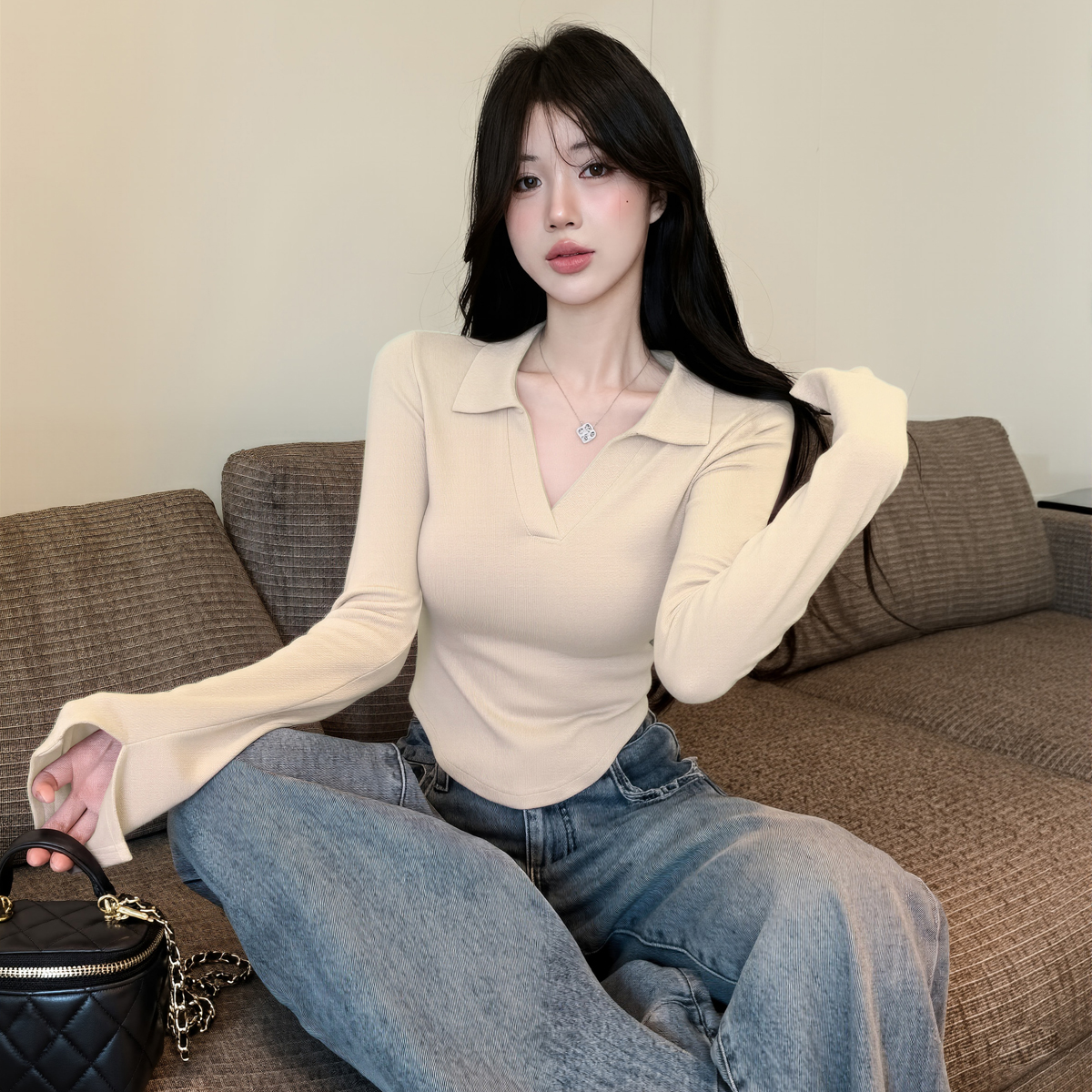 MY16316# 休闲polo领开叉长袖T恤衫纯欲辣妹短款露腰修身显瘦打底上衣女裝貨源服裝批發