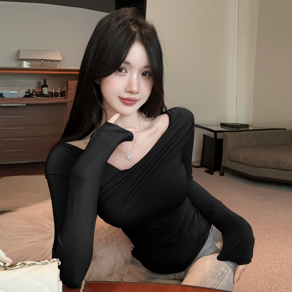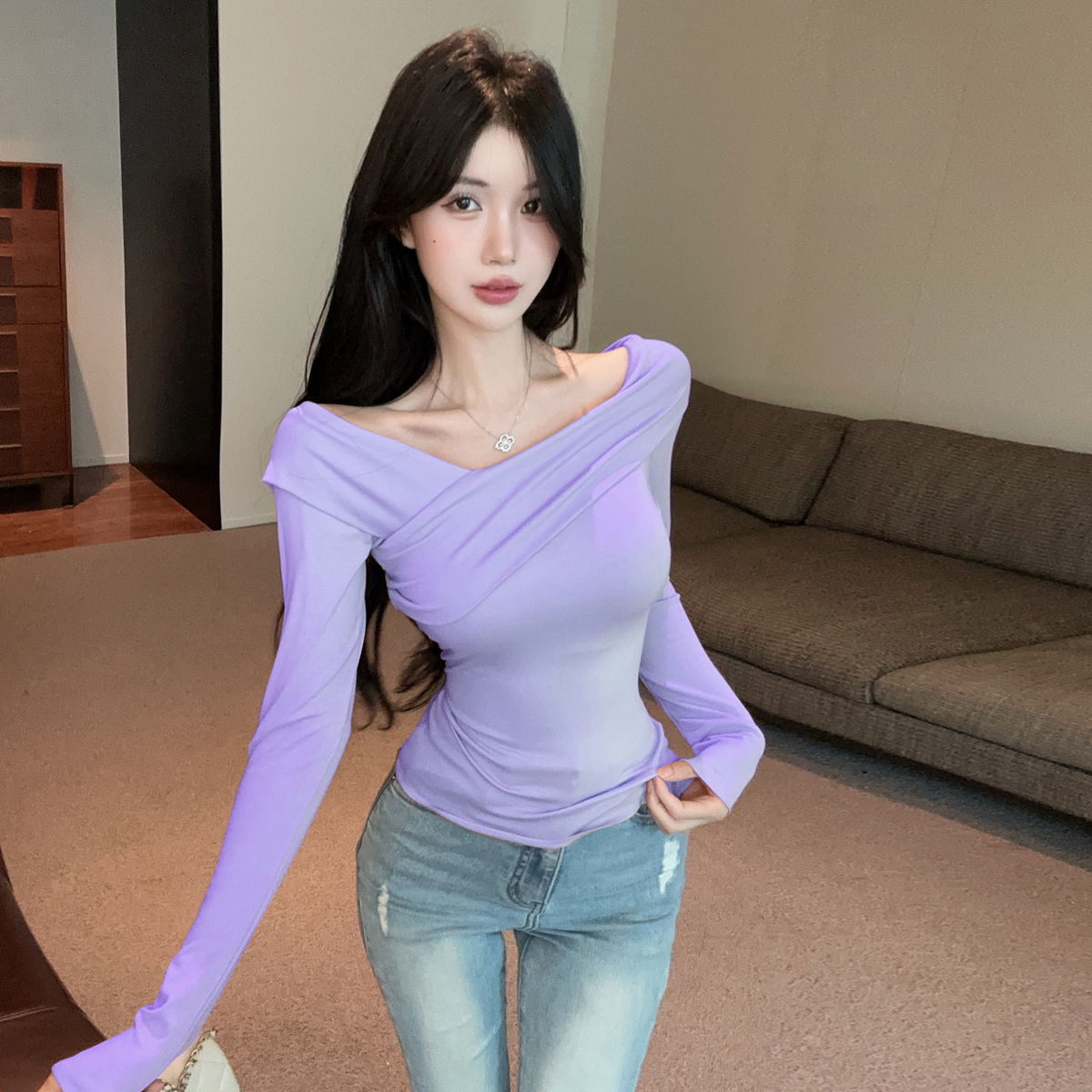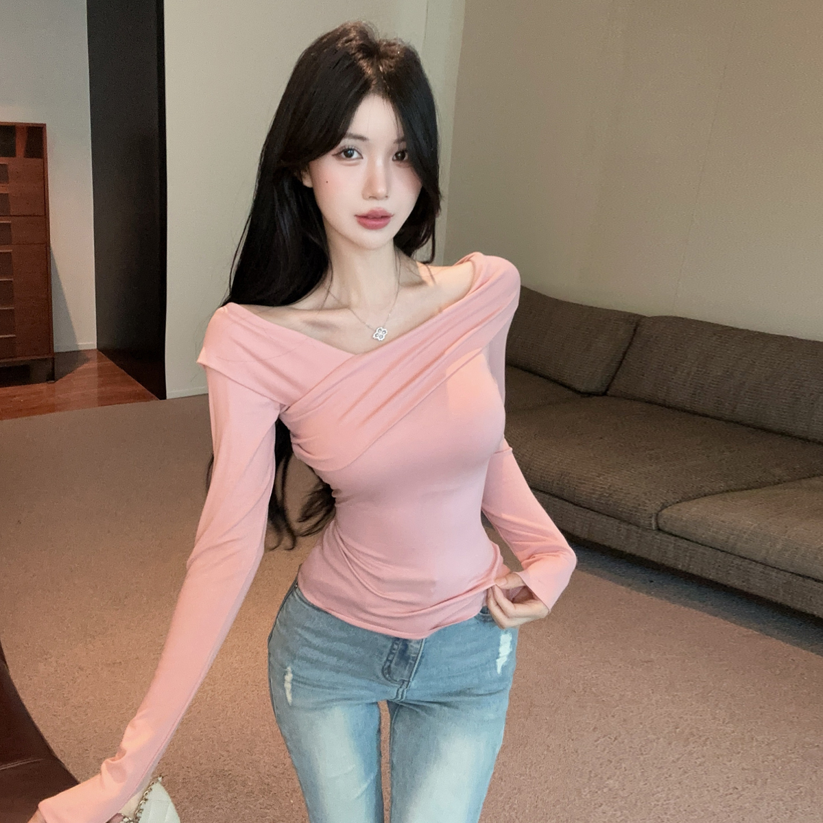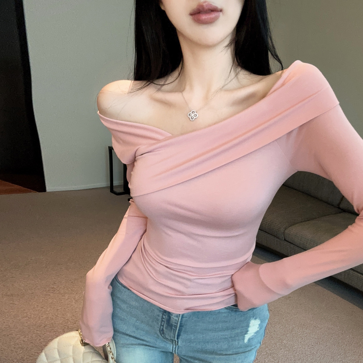 MY16317# 性感纯欲辣妹气质斜肩长袖T恤衫纯色交叉V领露肩打底衫上衣女裝貨源服裝批發