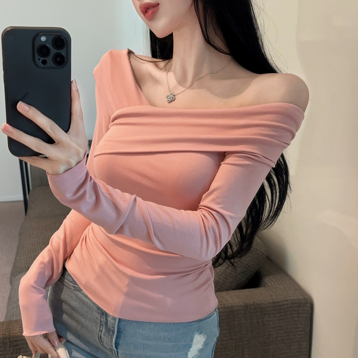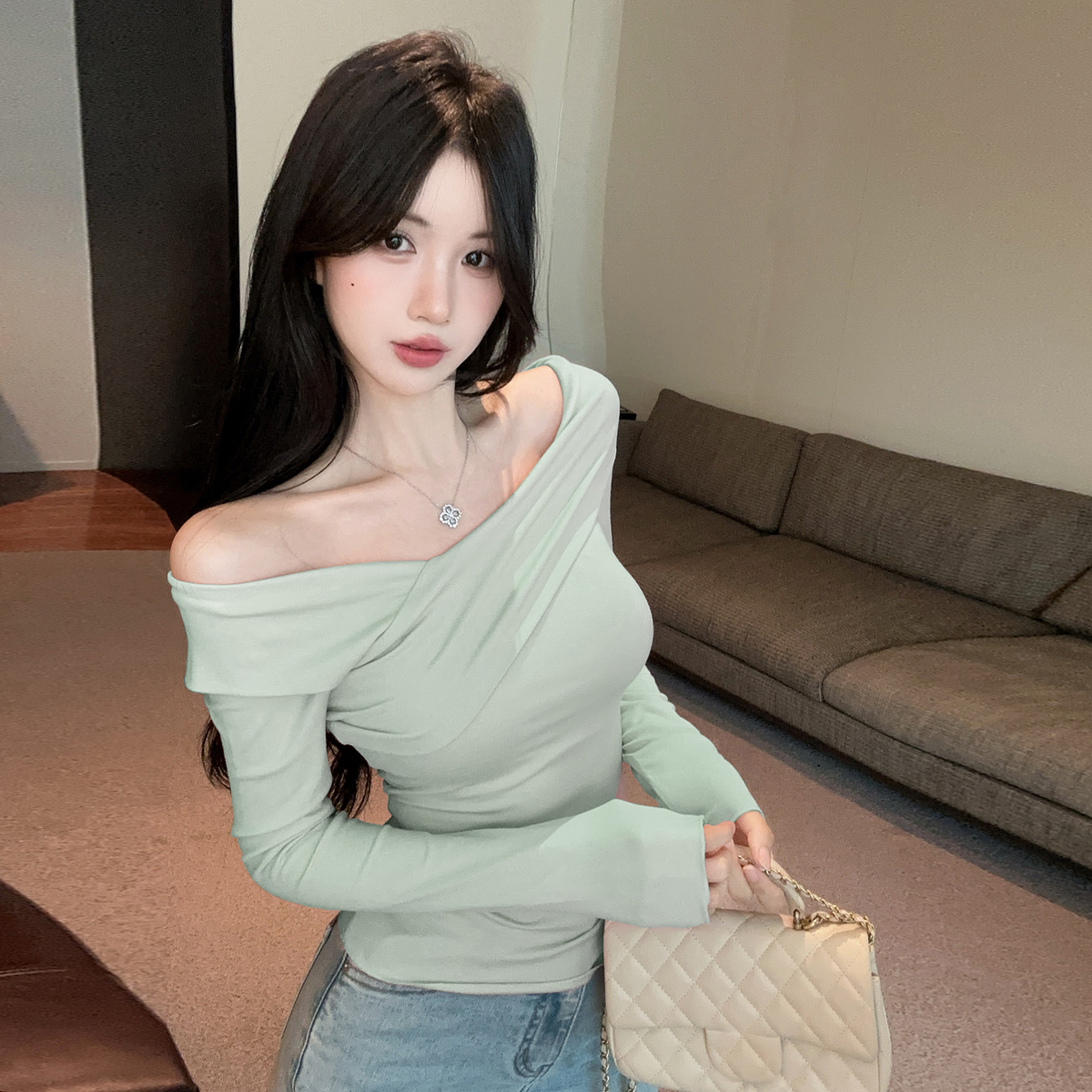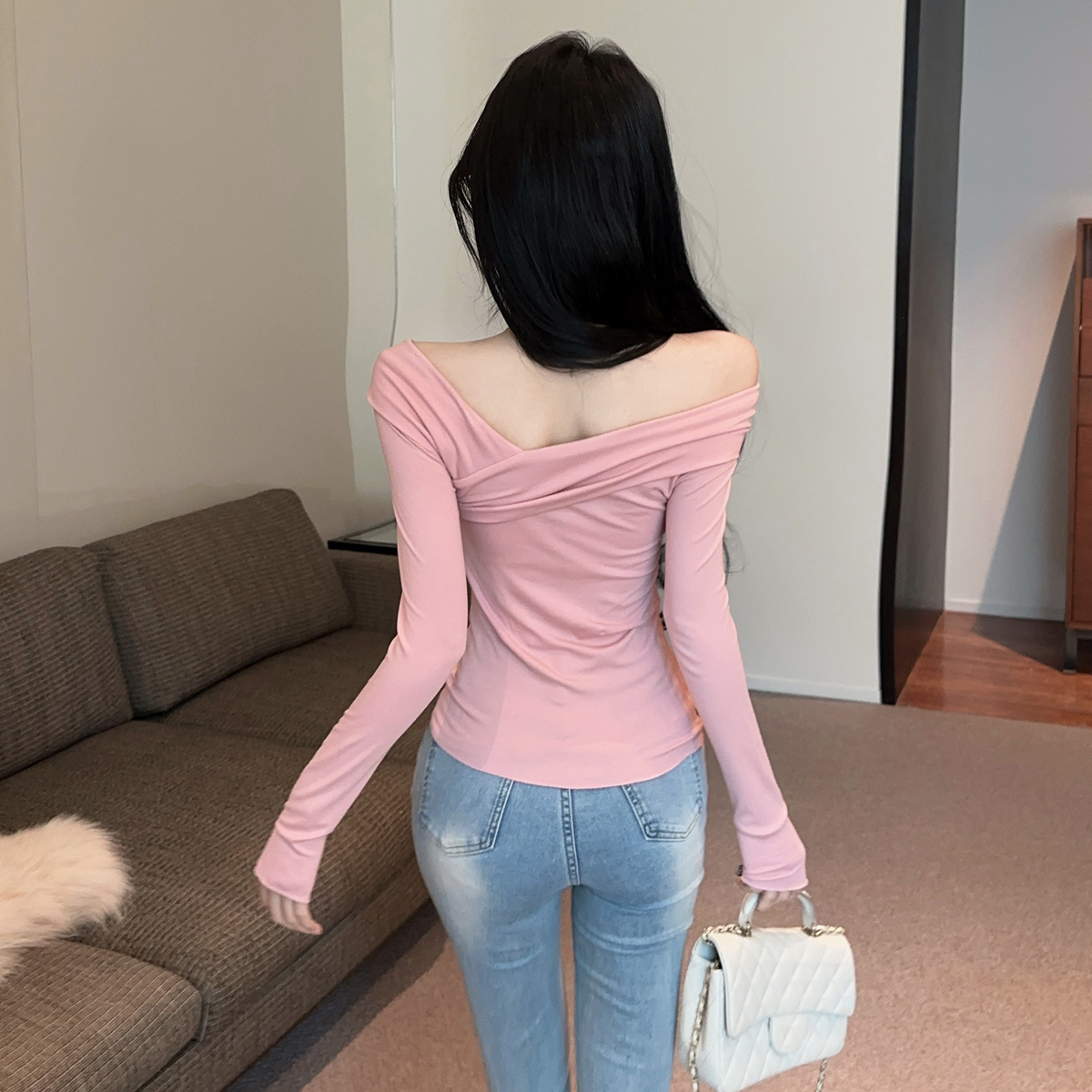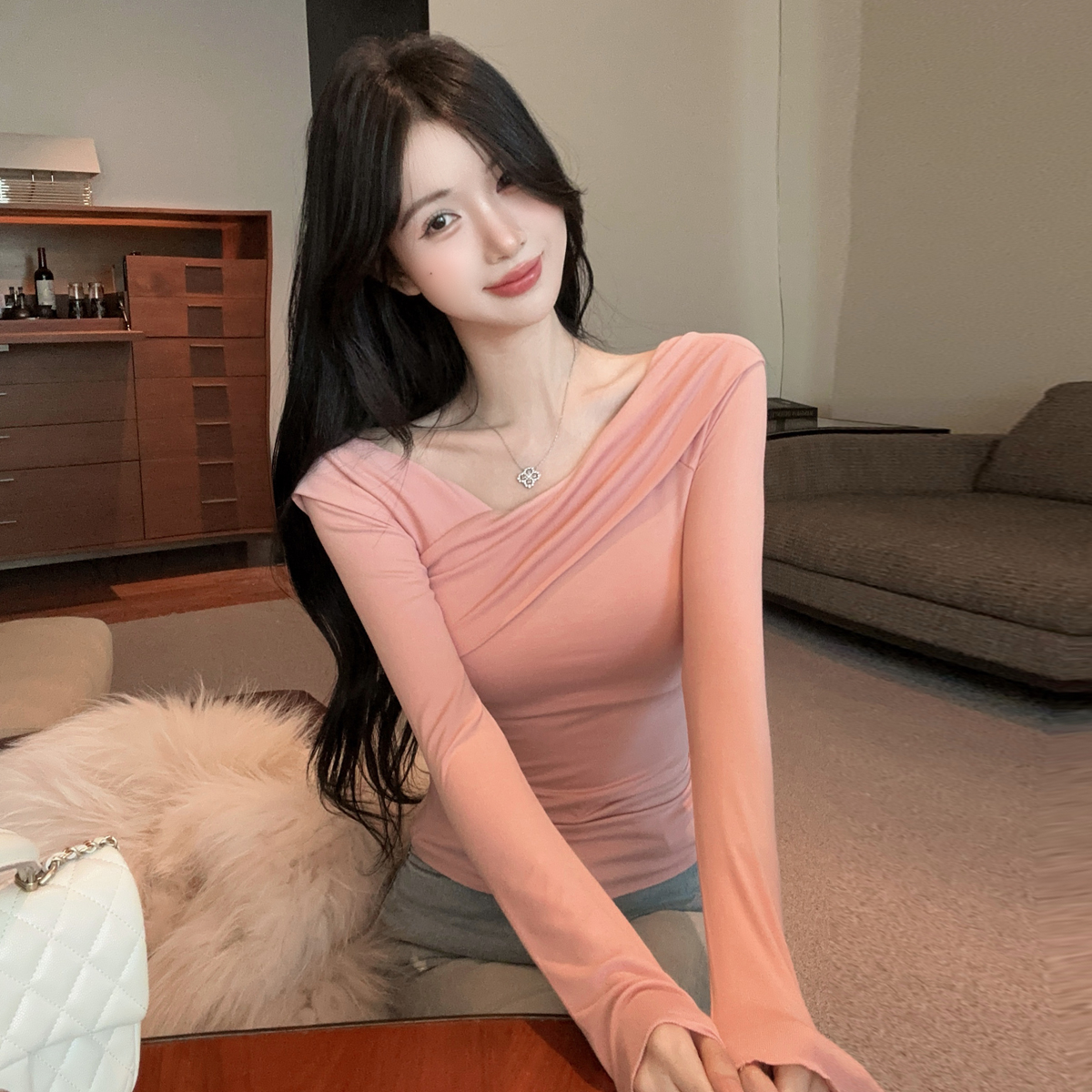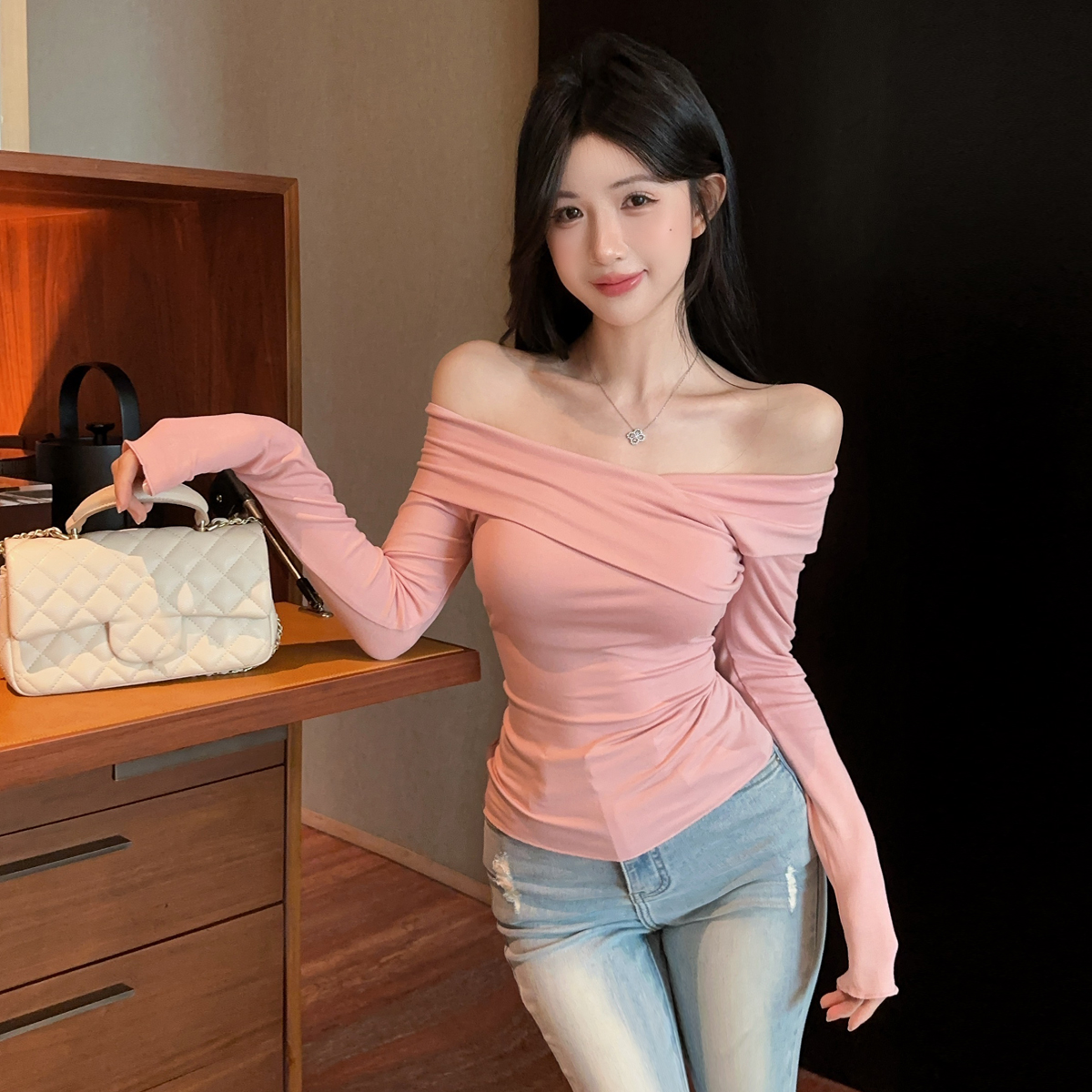 MY16317# 性感纯欲辣妹气质斜肩长袖T恤衫纯色交叉V领露肩打底衫上衣女裝貨源服裝批發
