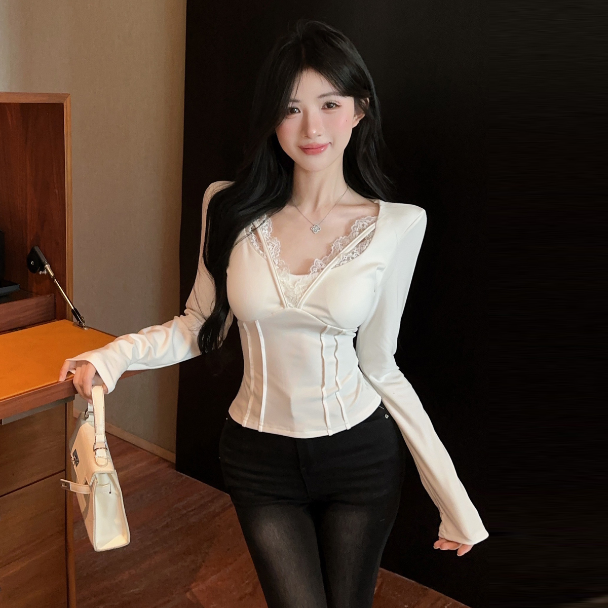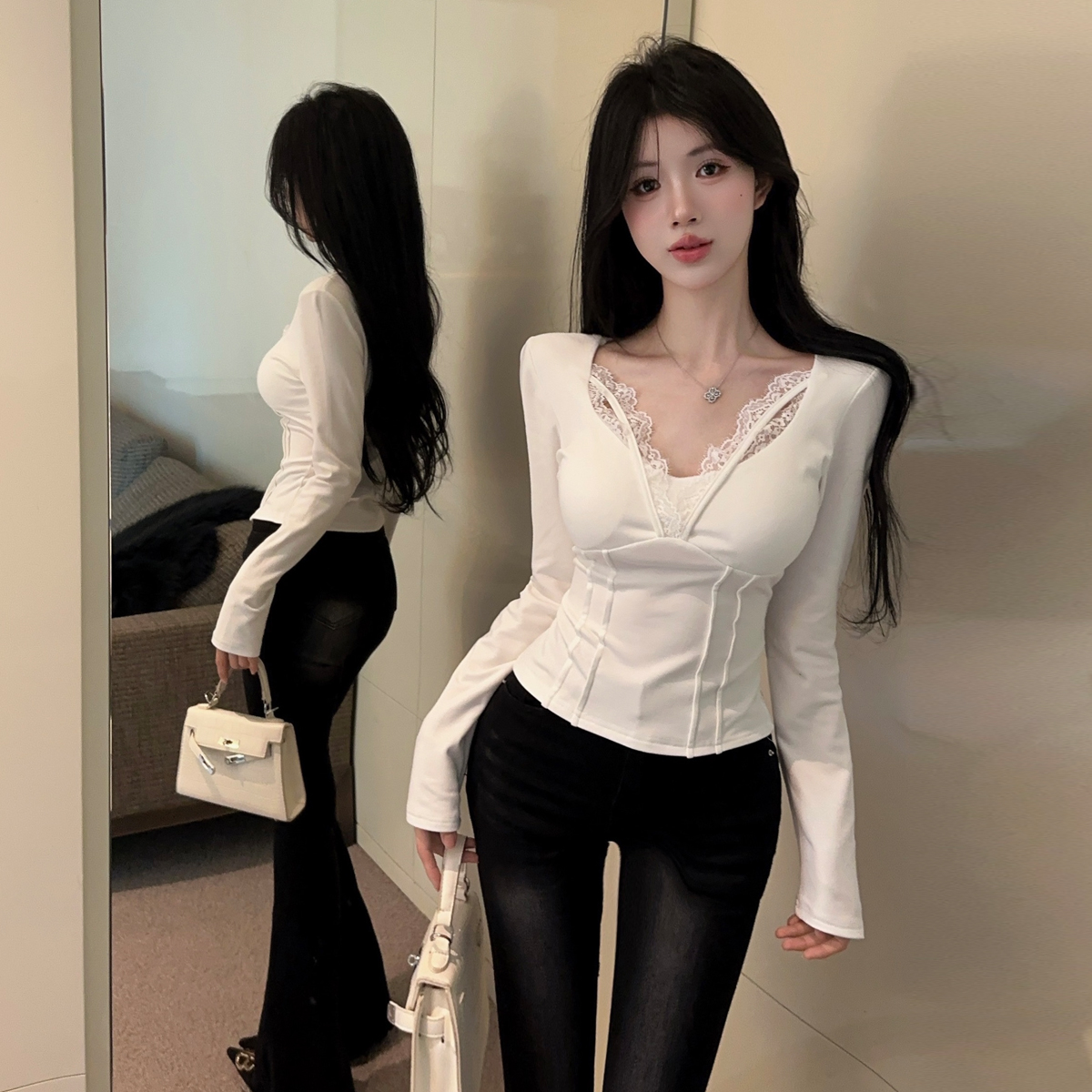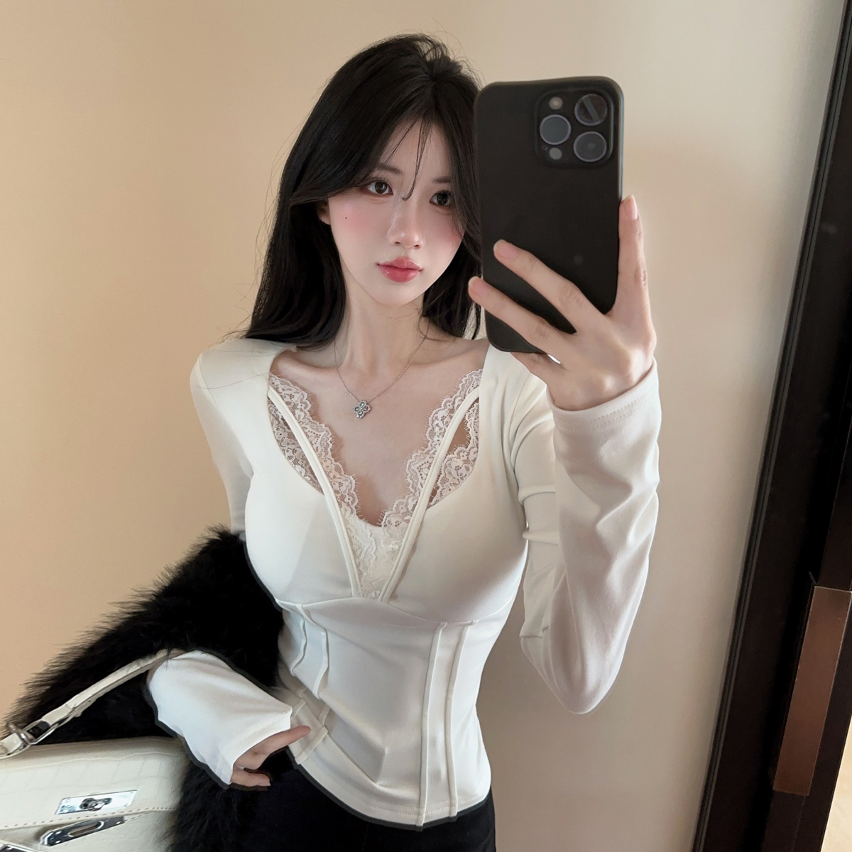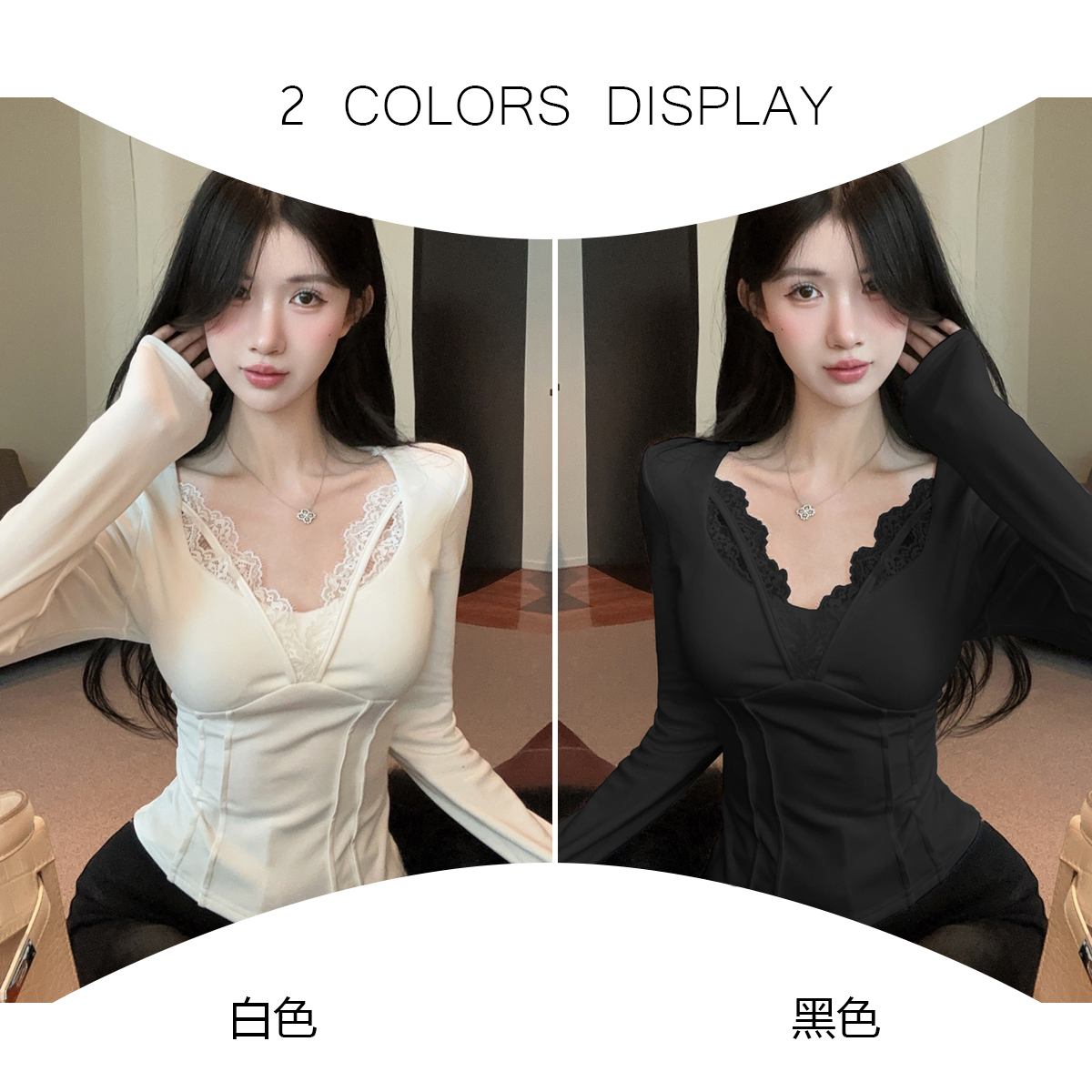 MY16318# 性感纯欲辣妹蕾丝拼接带胸垫打底衫秋冬加绒保暖长袖T恤上衣女裝貨源服裝批發