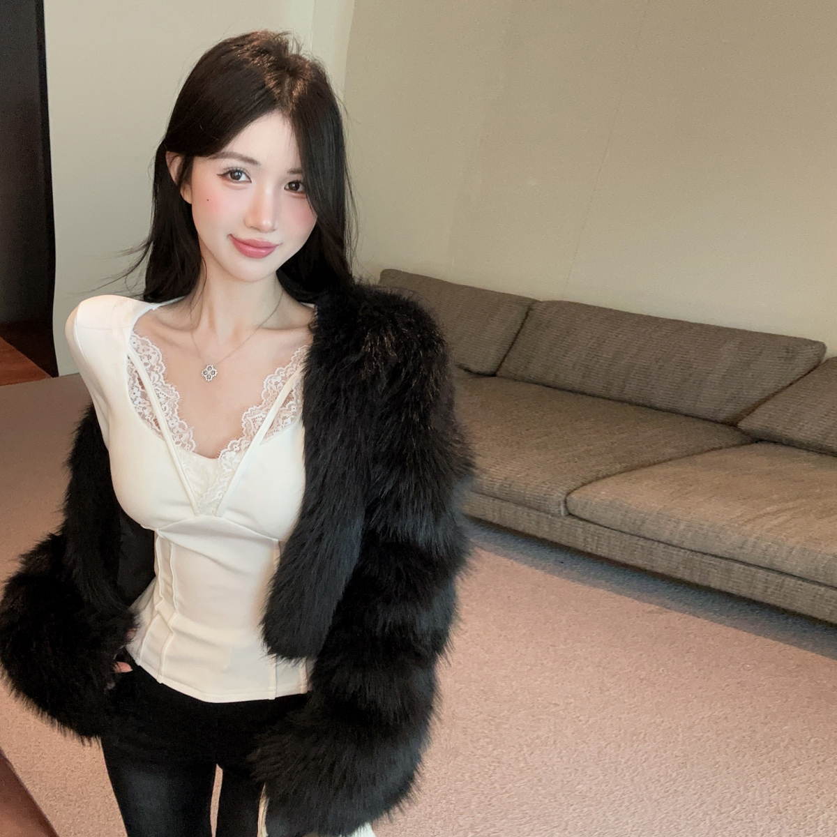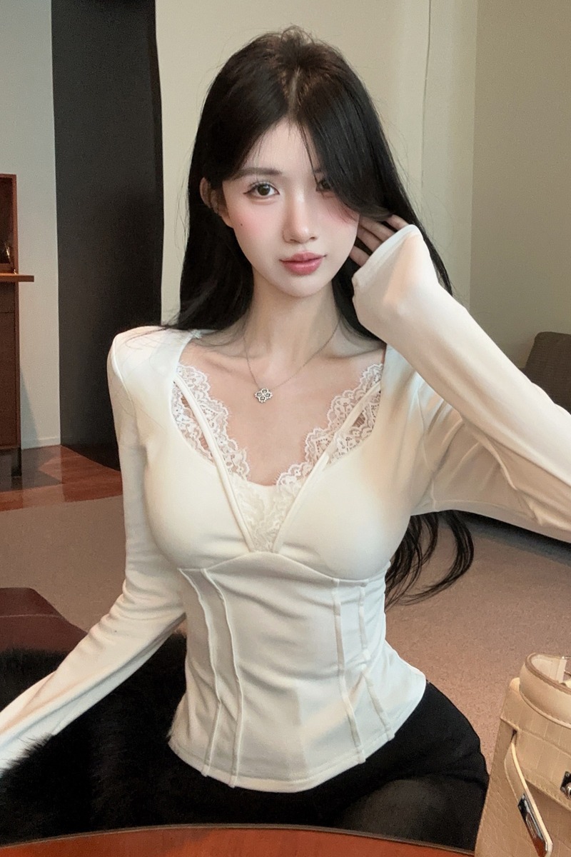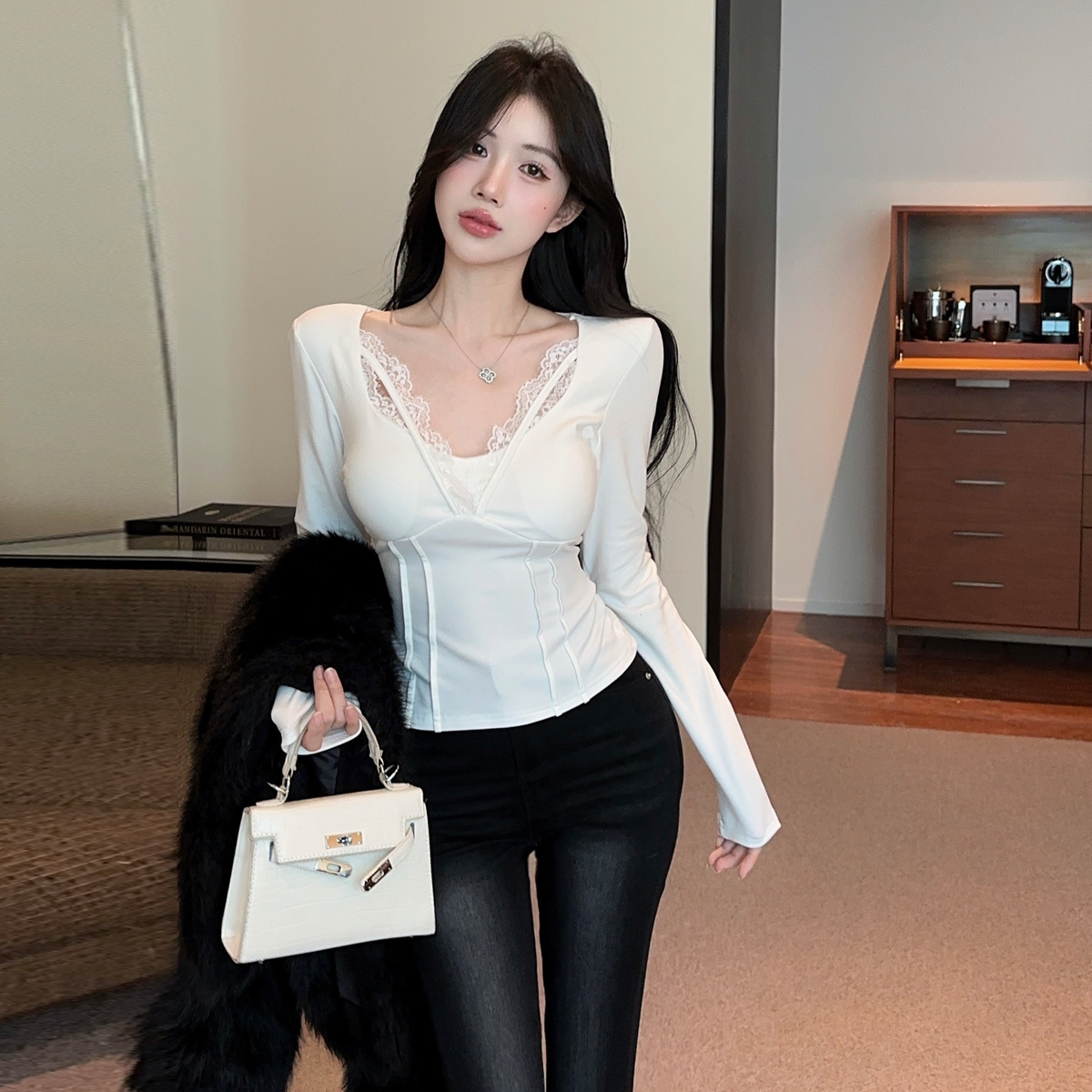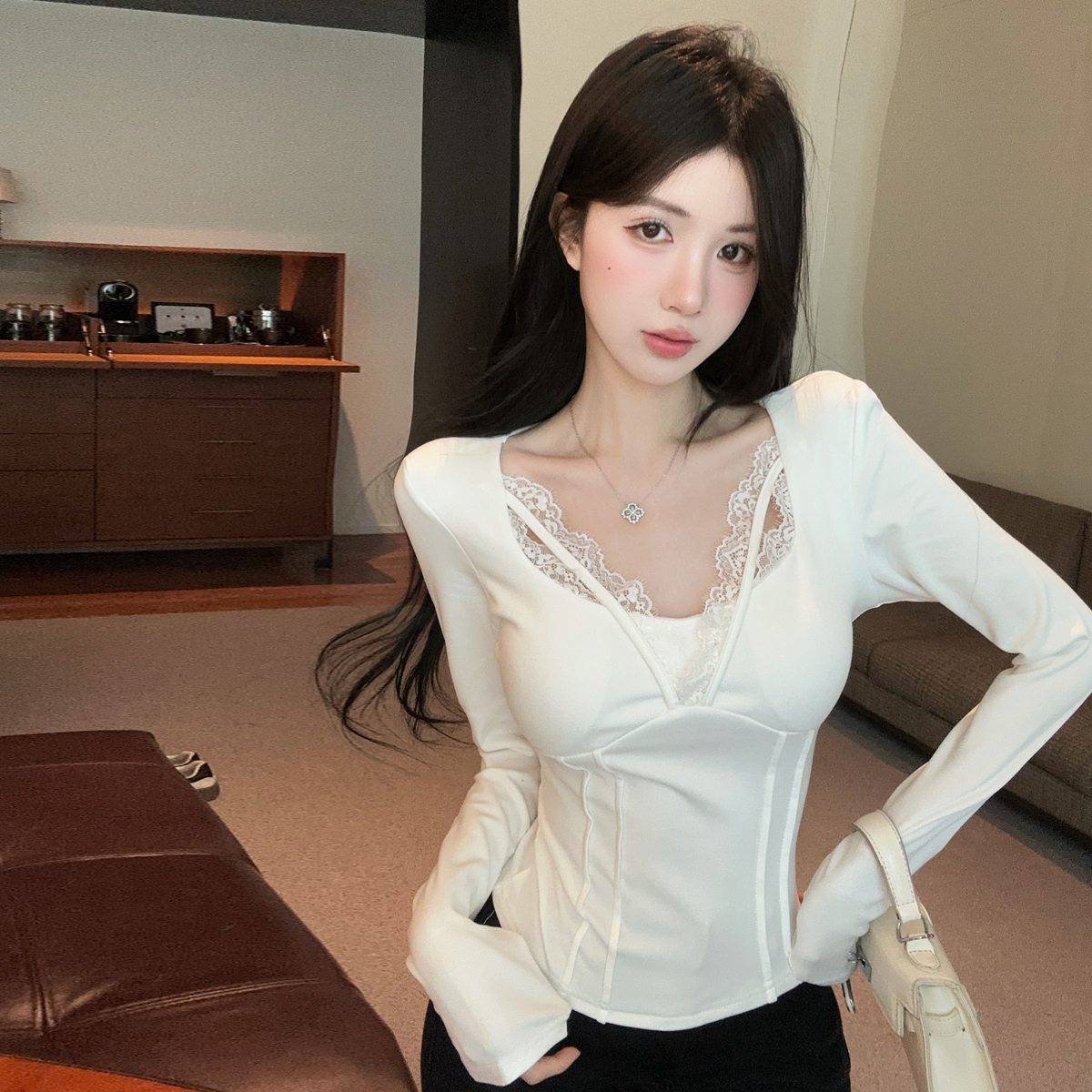 MY16318# 性感纯欲辣妹蕾丝拼接带胸垫打底衫秋冬加绒保暖长袖T恤上衣女裝貨源服裝批發