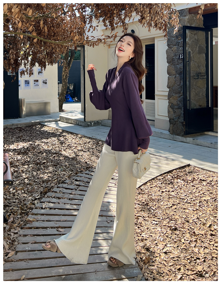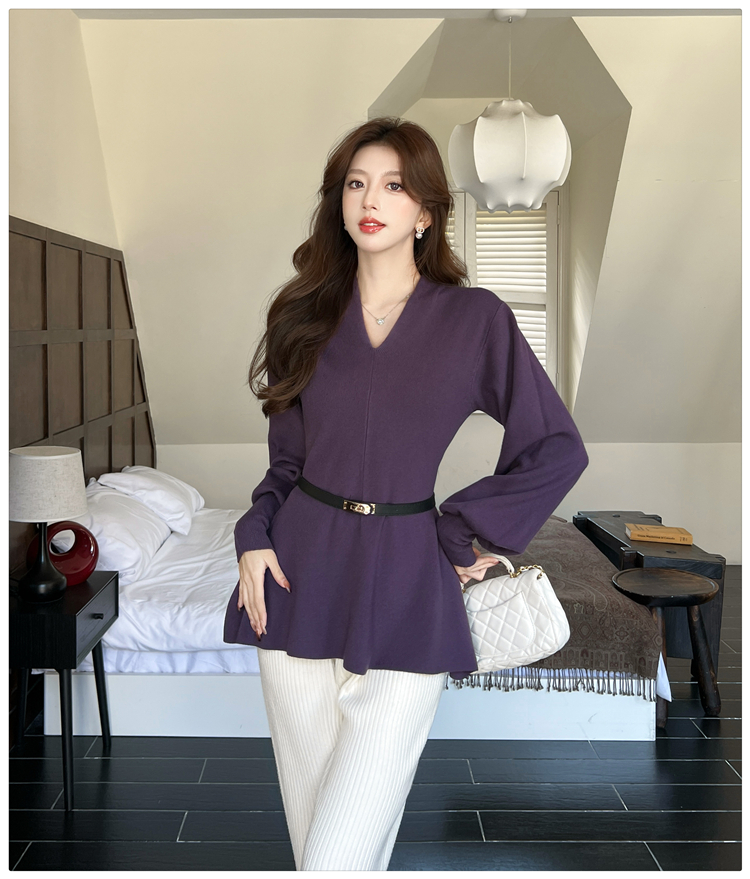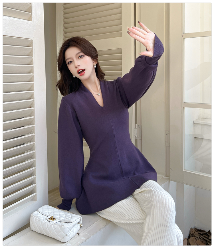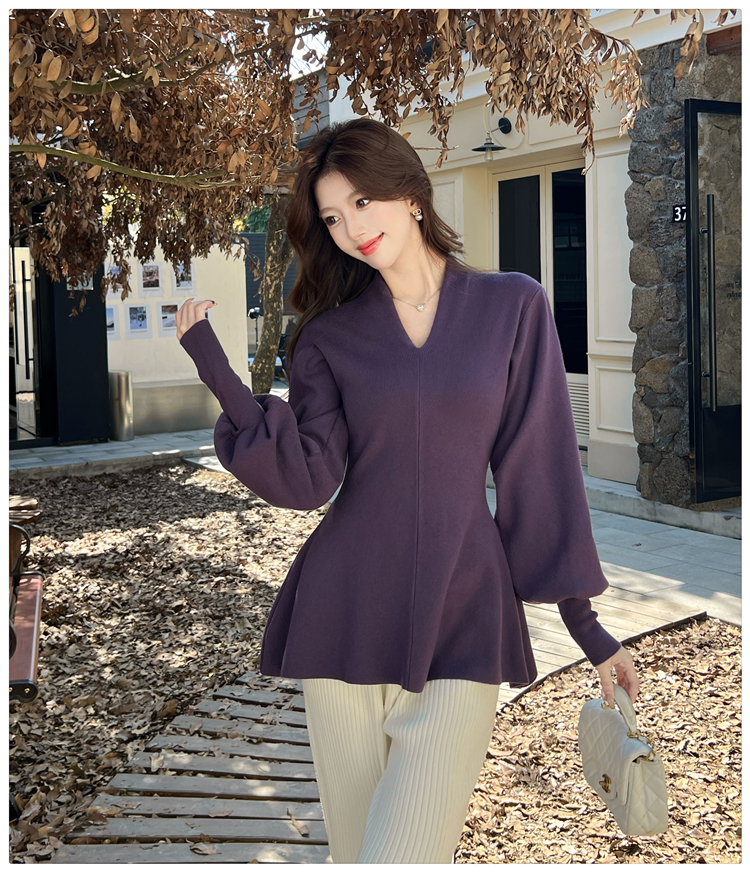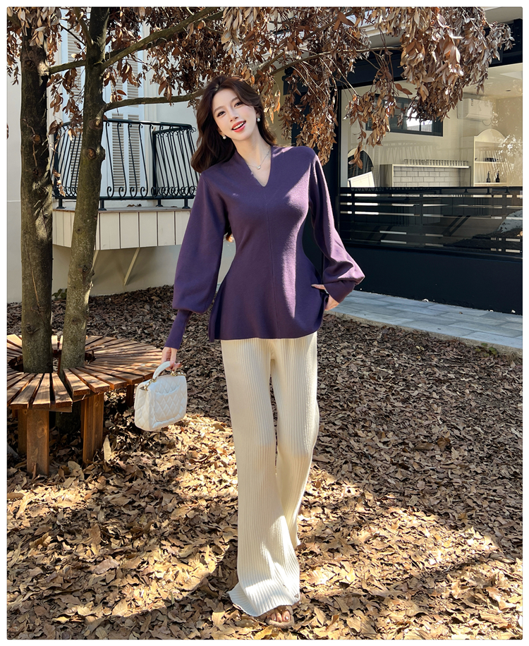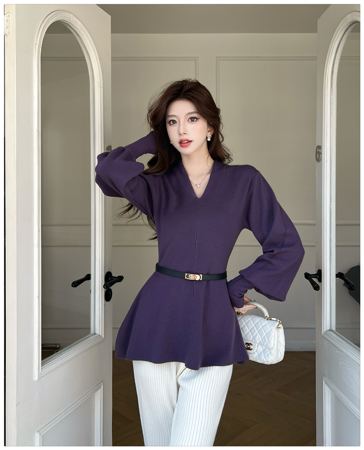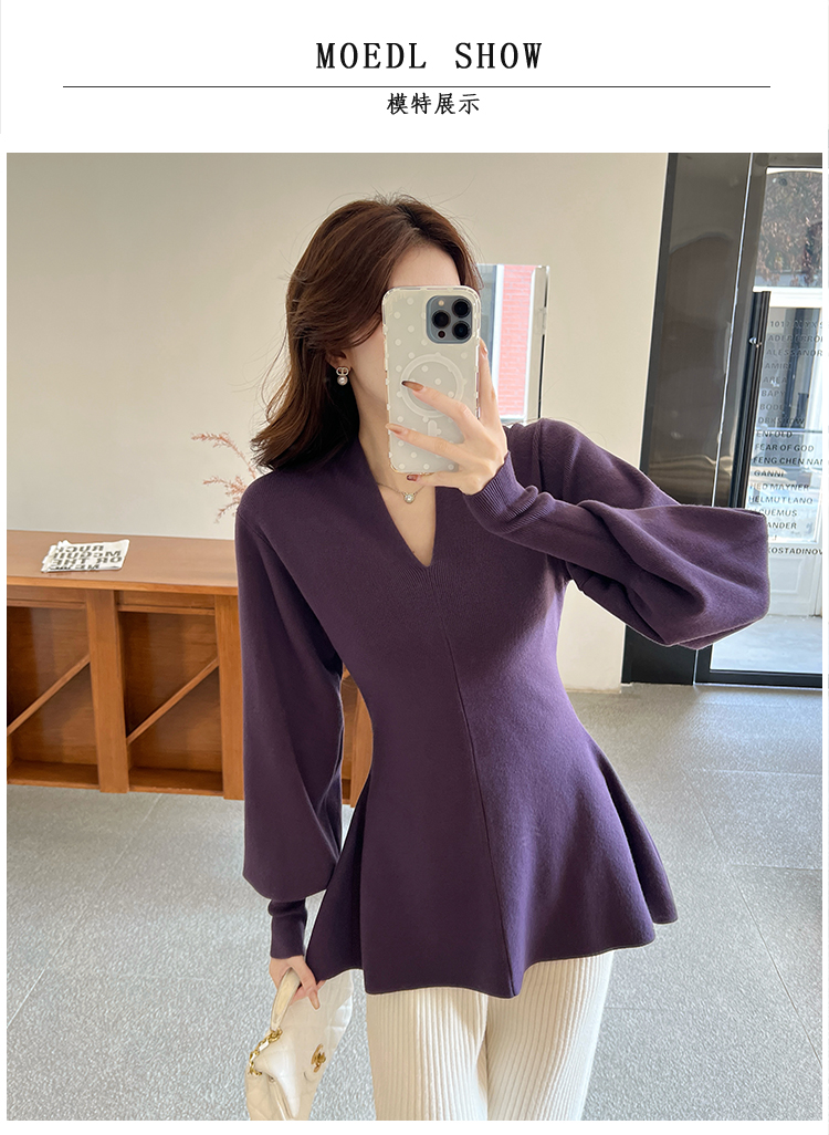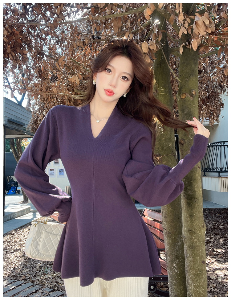MY16333# 法式温柔气质v领灯笼袖毛衣针织衫女独特绝美紫色慵懒风上衣秋冬女裝貨源服裝批發