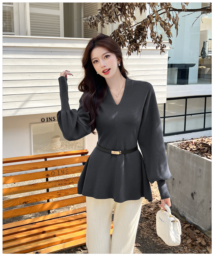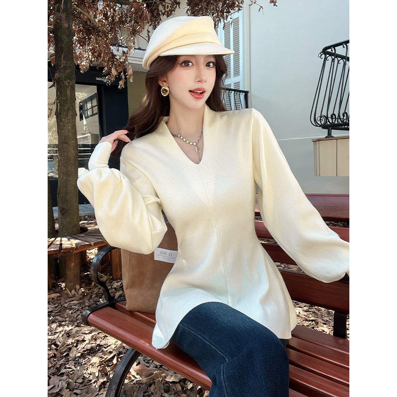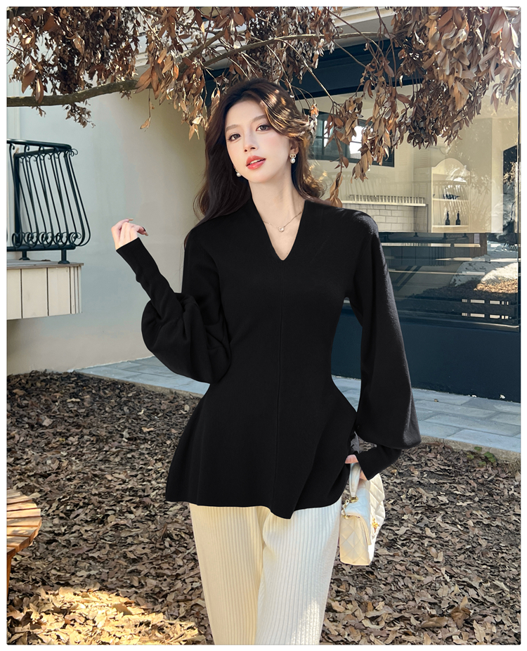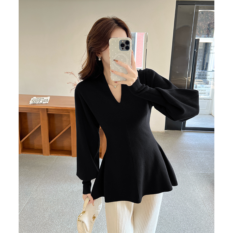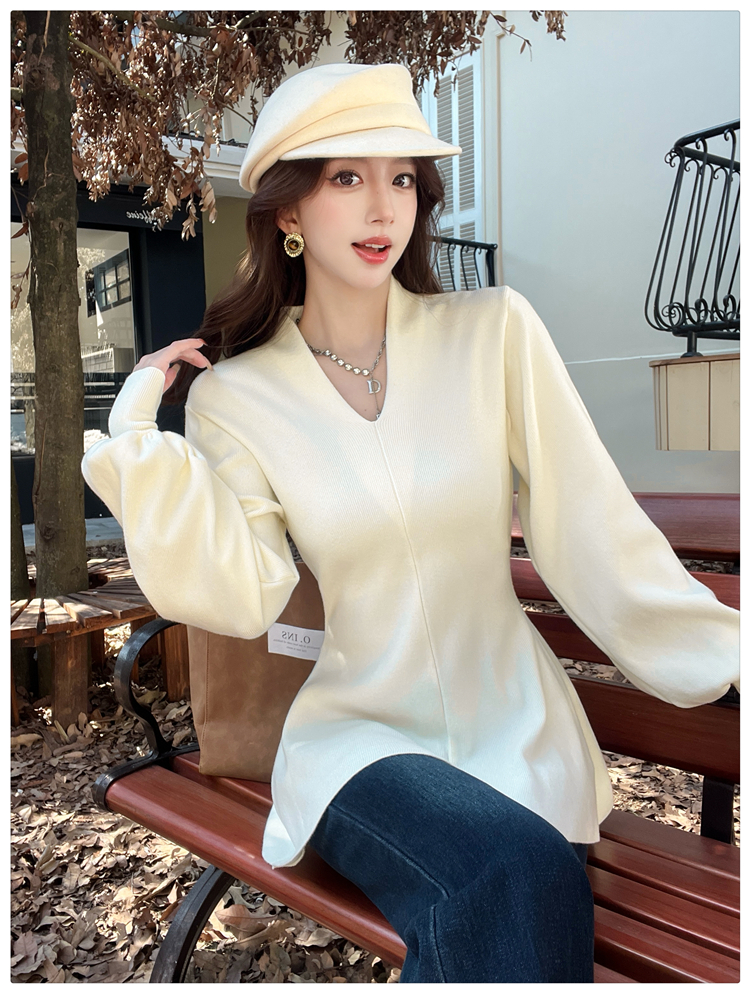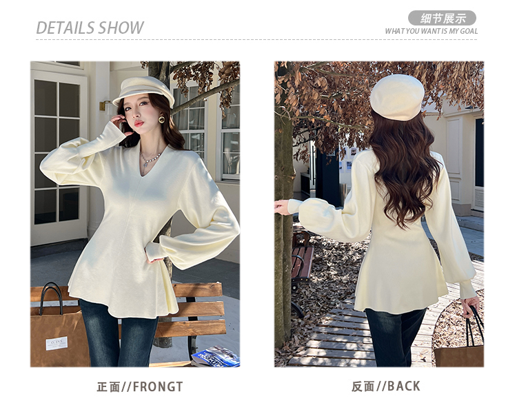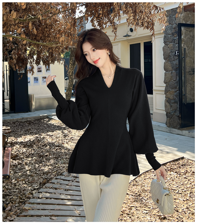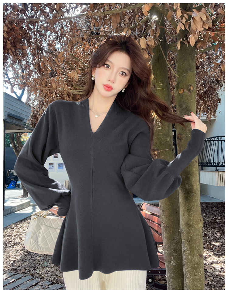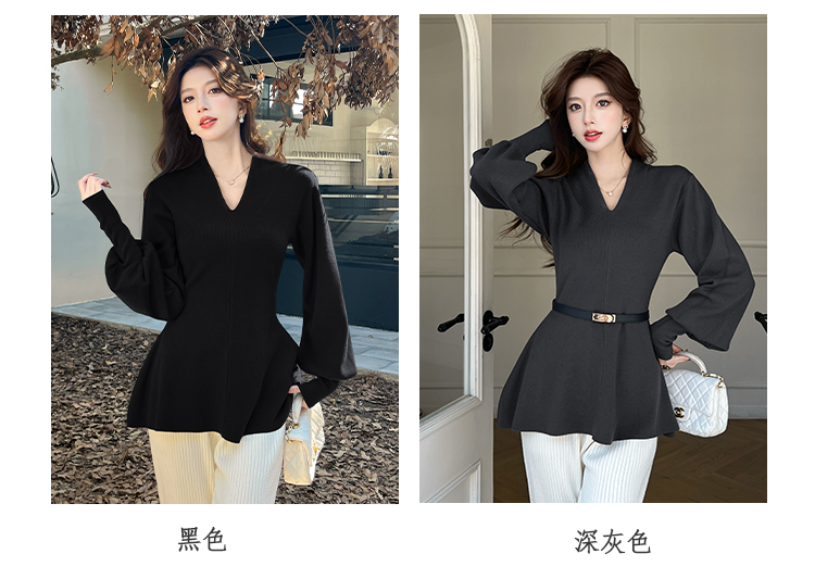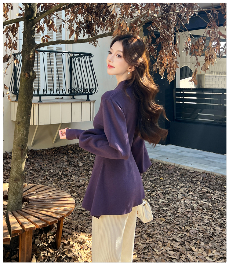 MY16333# 法式温柔气质v领灯笼袖毛衣针织衫女独特绝美紫色慵懒风上衣秋冬女裝貨源服裝批發