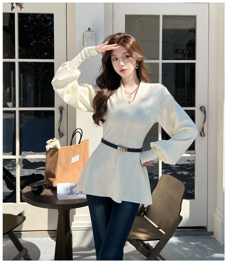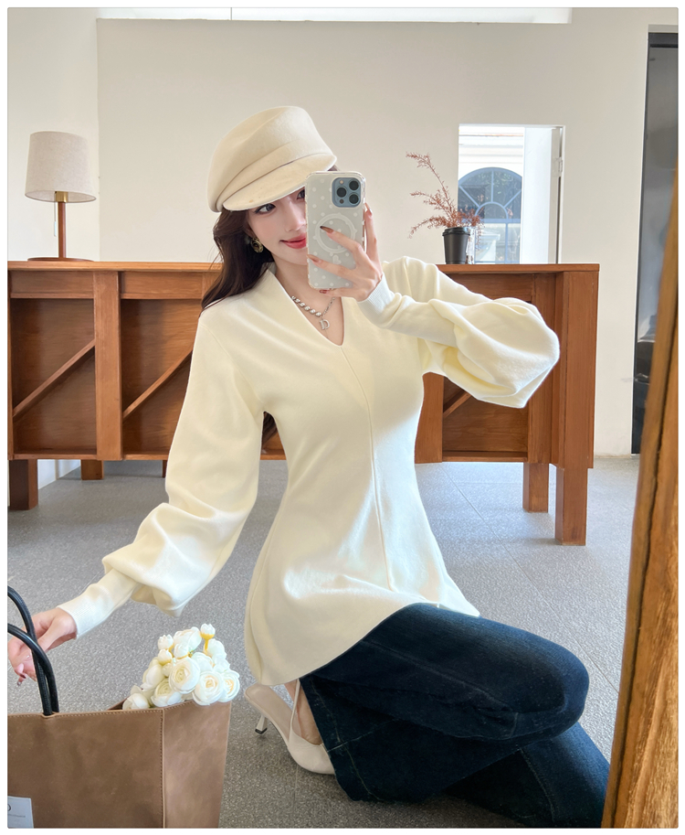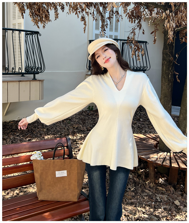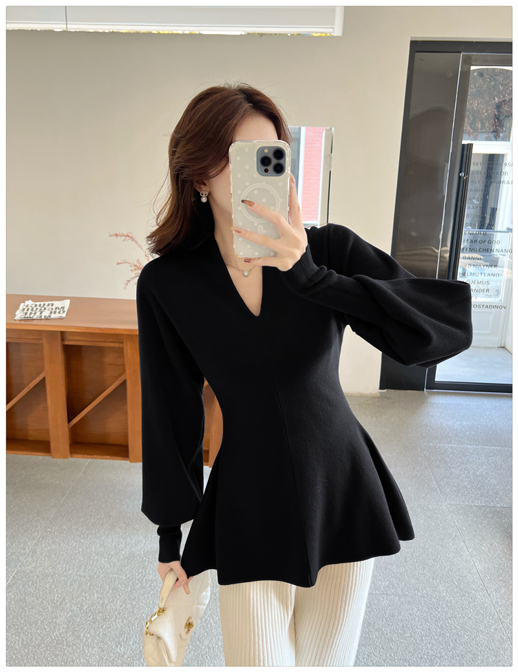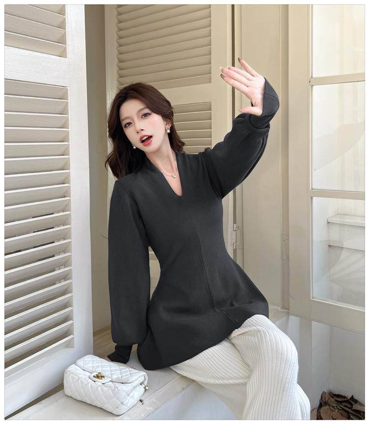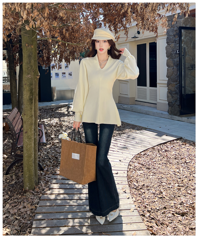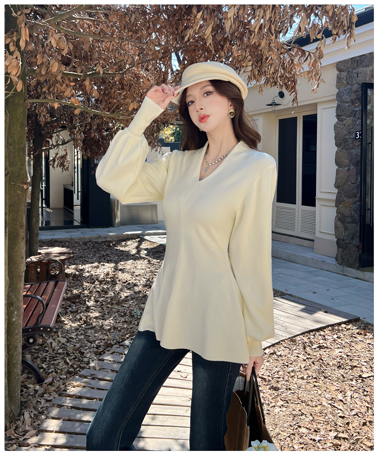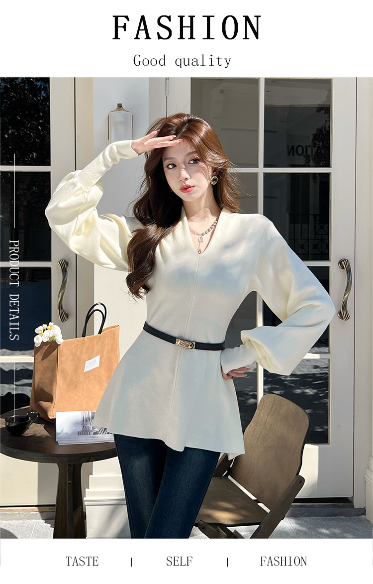 MY16333# 法式温柔气质v领灯笼袖毛衣针织衫女独特绝美紫色慵懒风上衣秋冬女裝貨源服裝批發