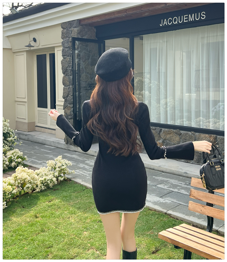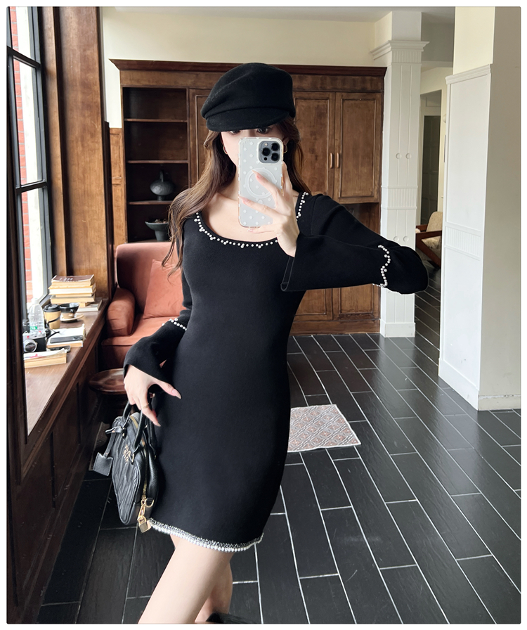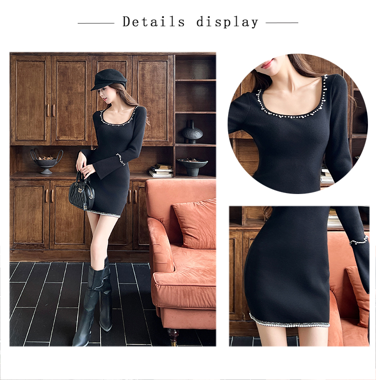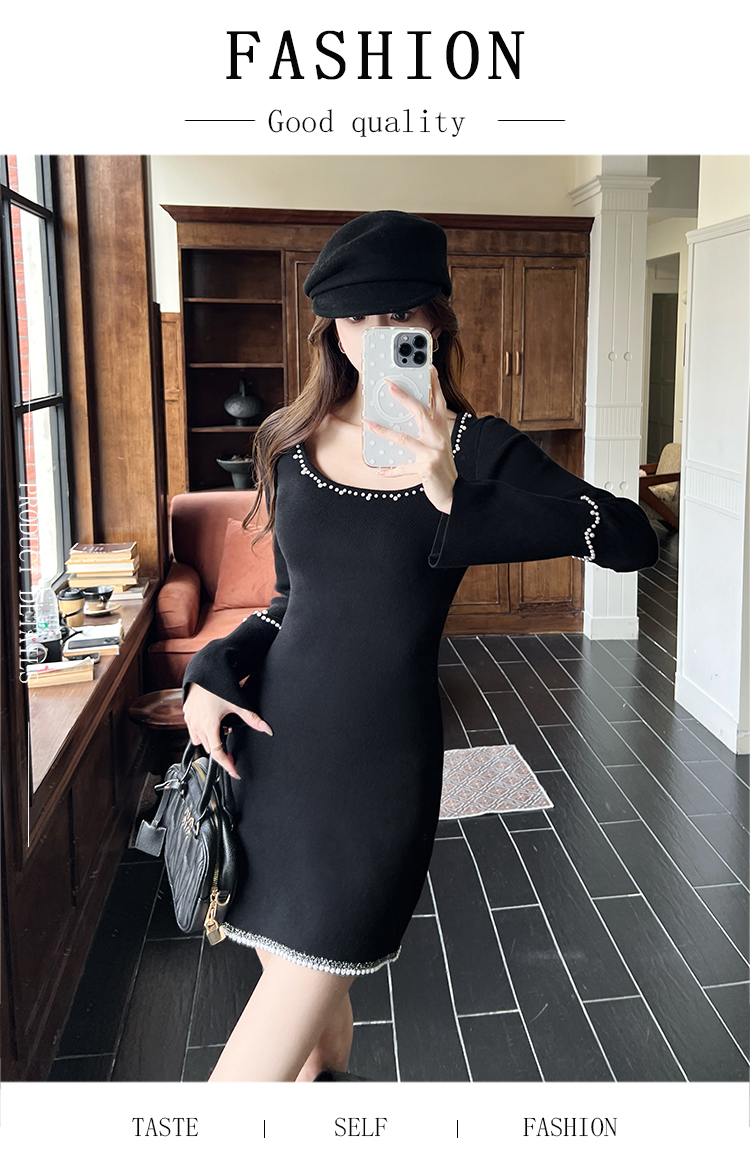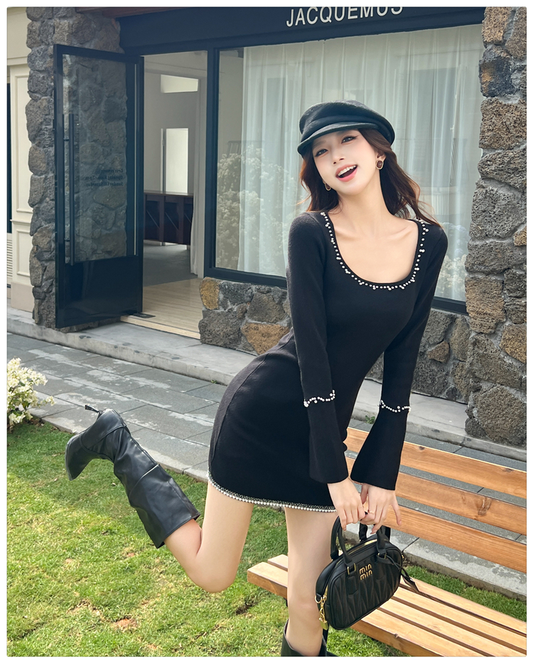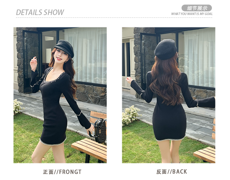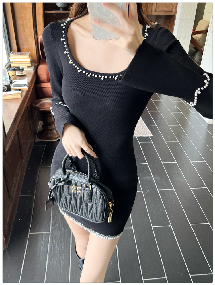 MY16335# 纯欲甜辣气质钉珠黑色方领长袖针织连衣裙女设计感小香风包臀短裙女裝貨源服裝批發