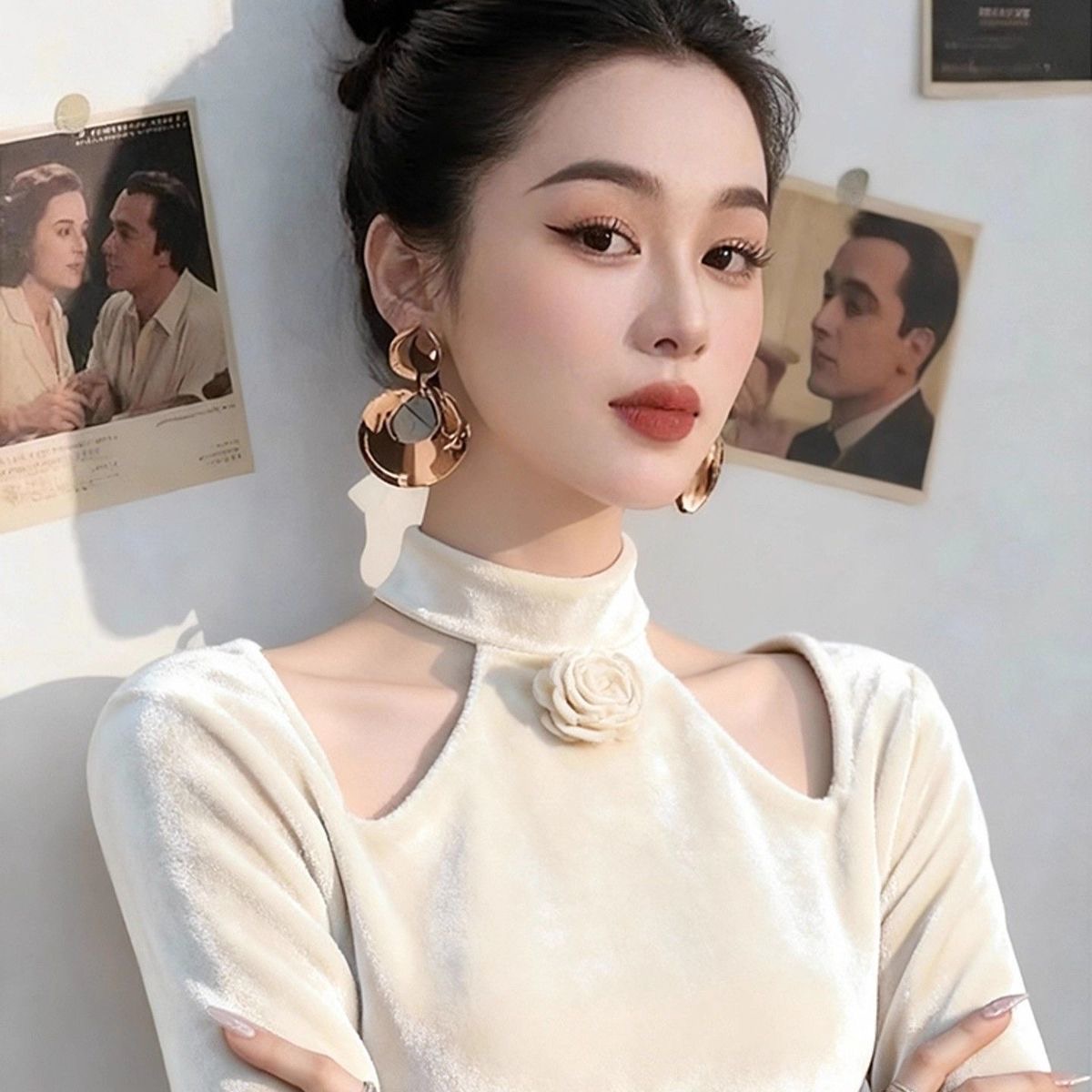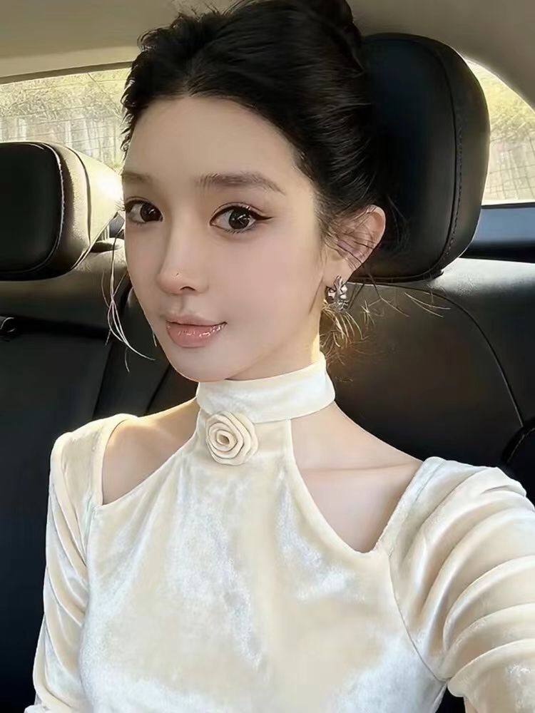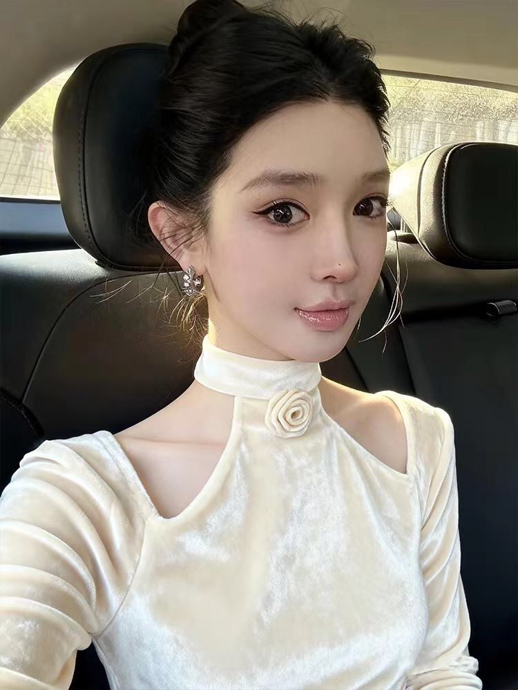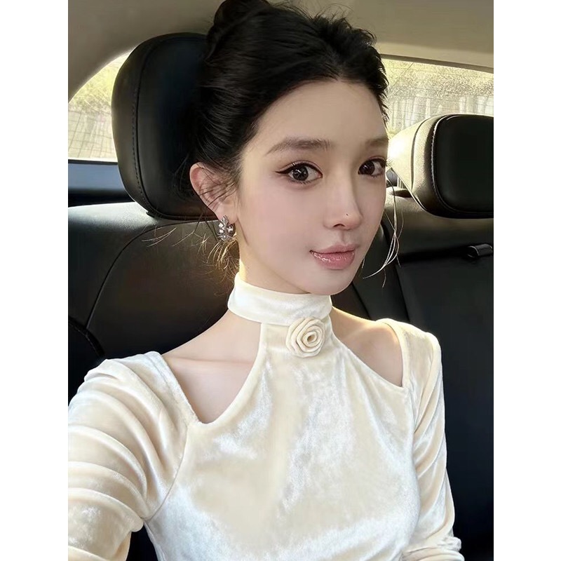 MY16350# 白色露肩立体花朵丝绒上衣女装气质名媛修身显瘦打底衬衣女裝貨源服裝批發