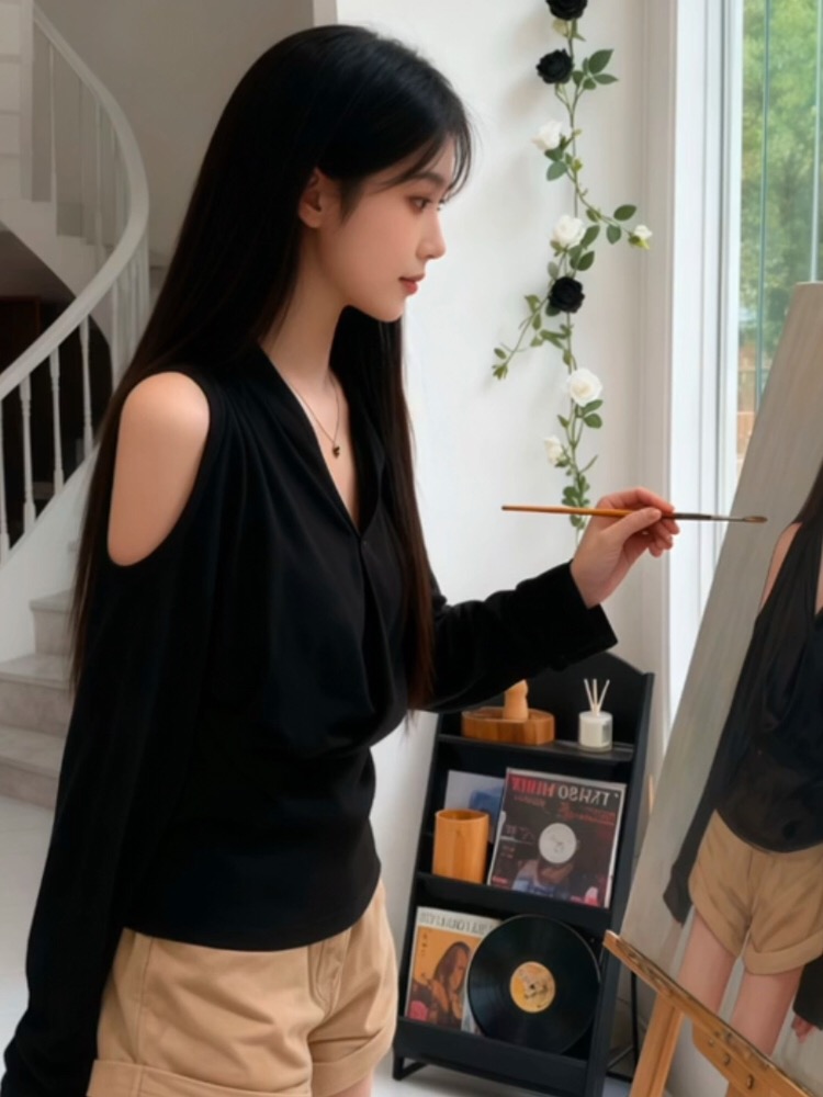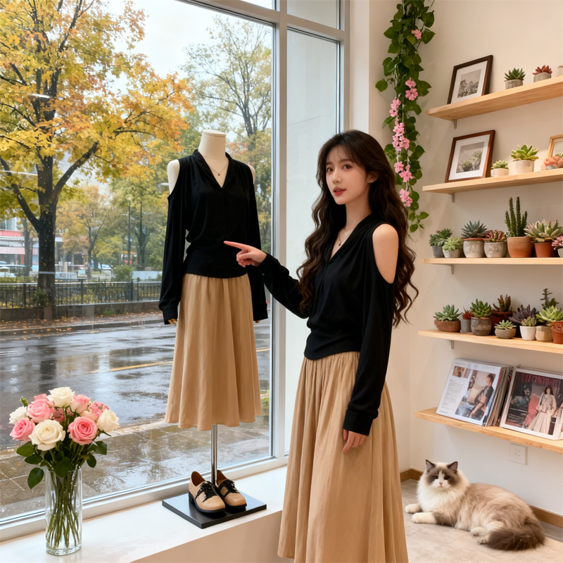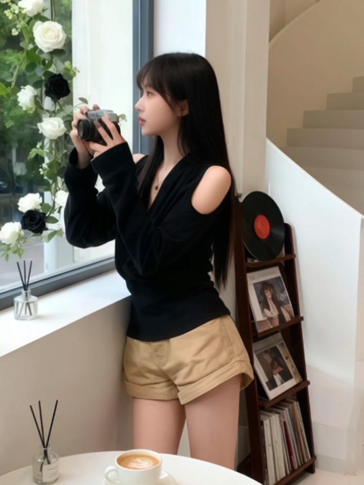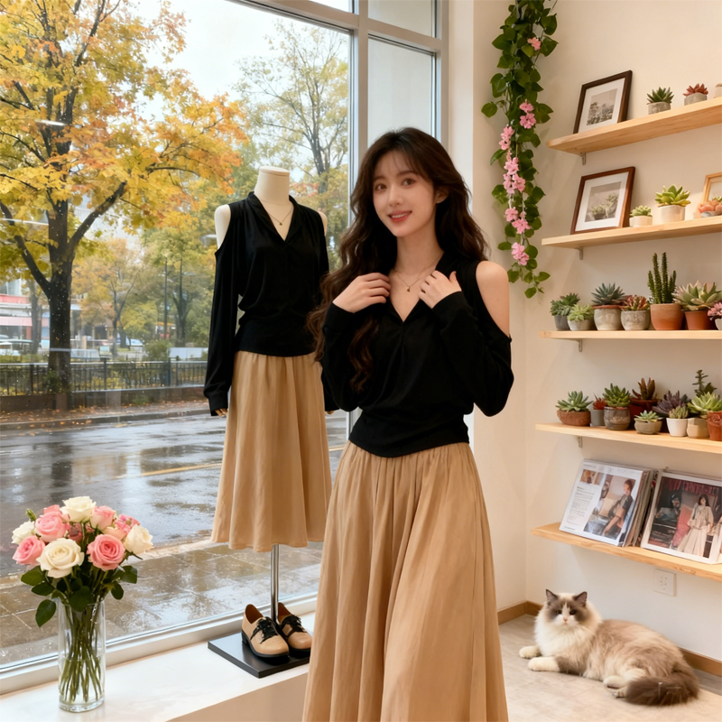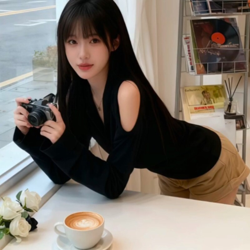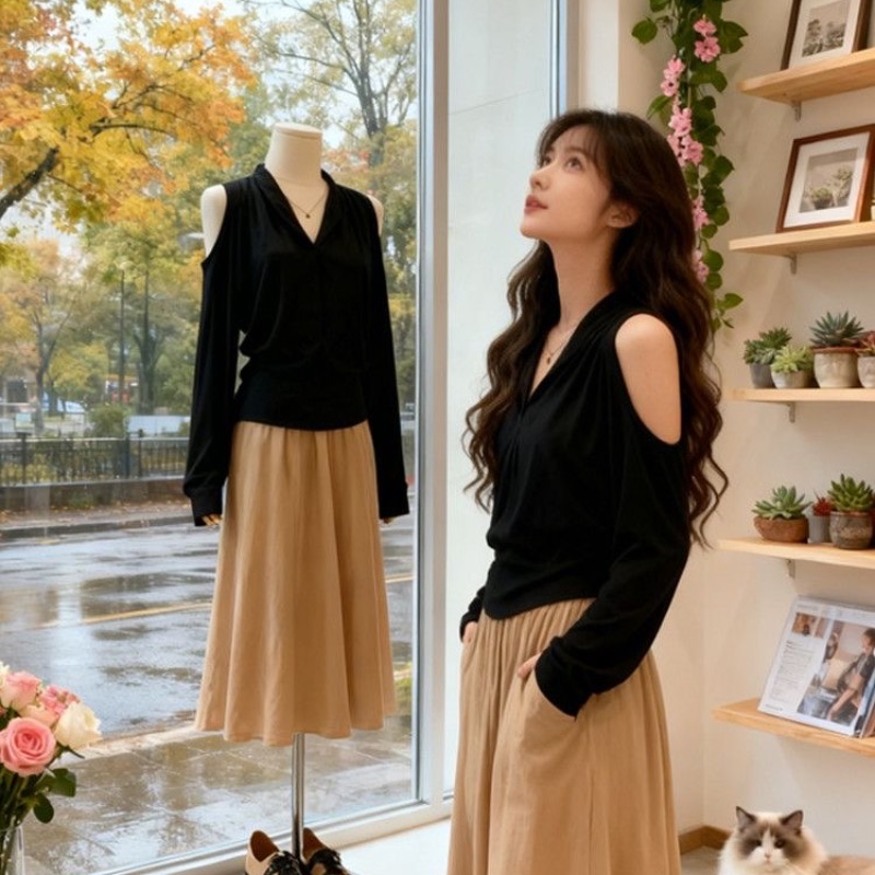 MY16351# 韩系设计感露肩V领长袖T恤女超好看的气质小众别致时尚穿搭上衣潮女裝貨源服裝批發
