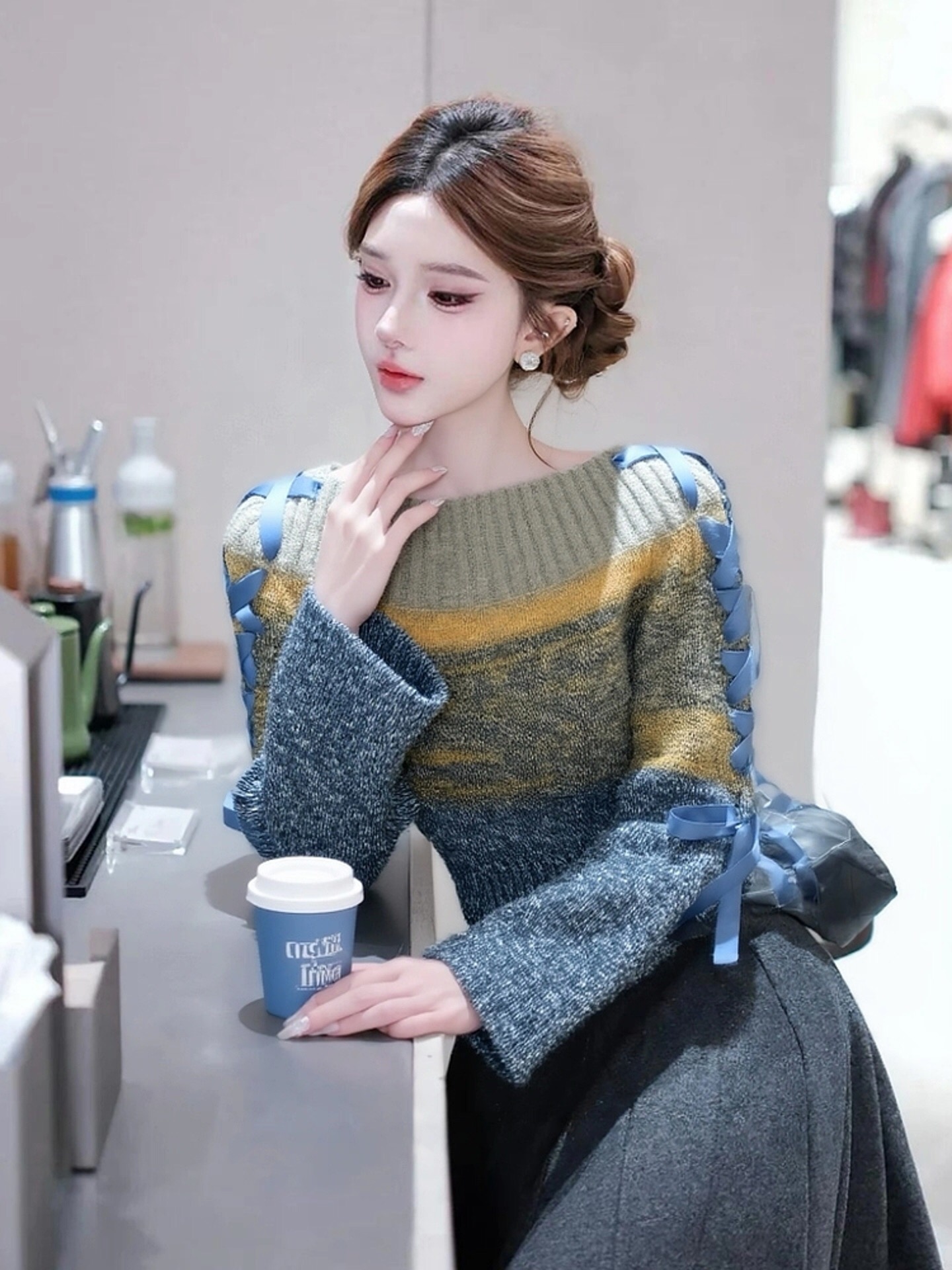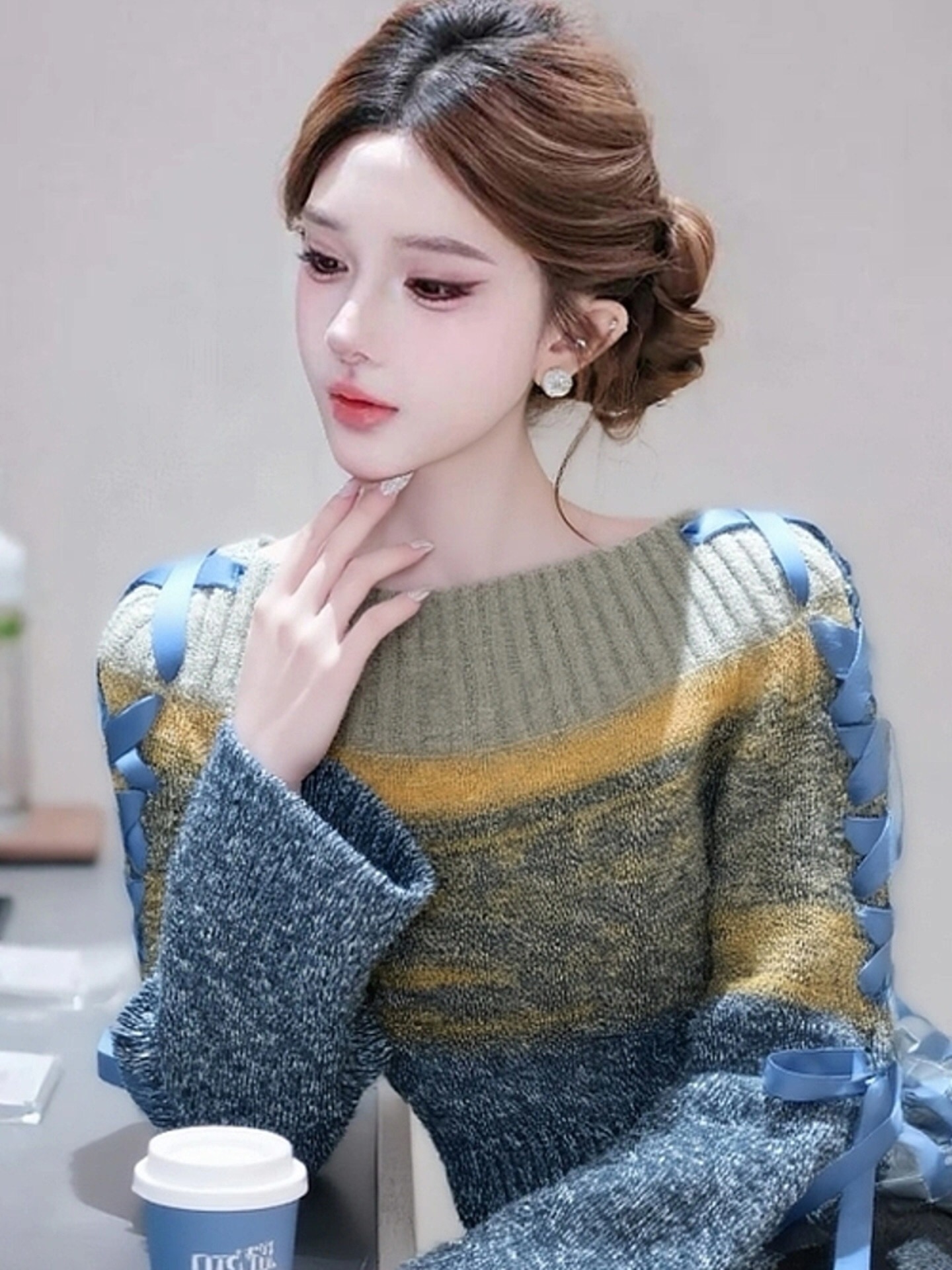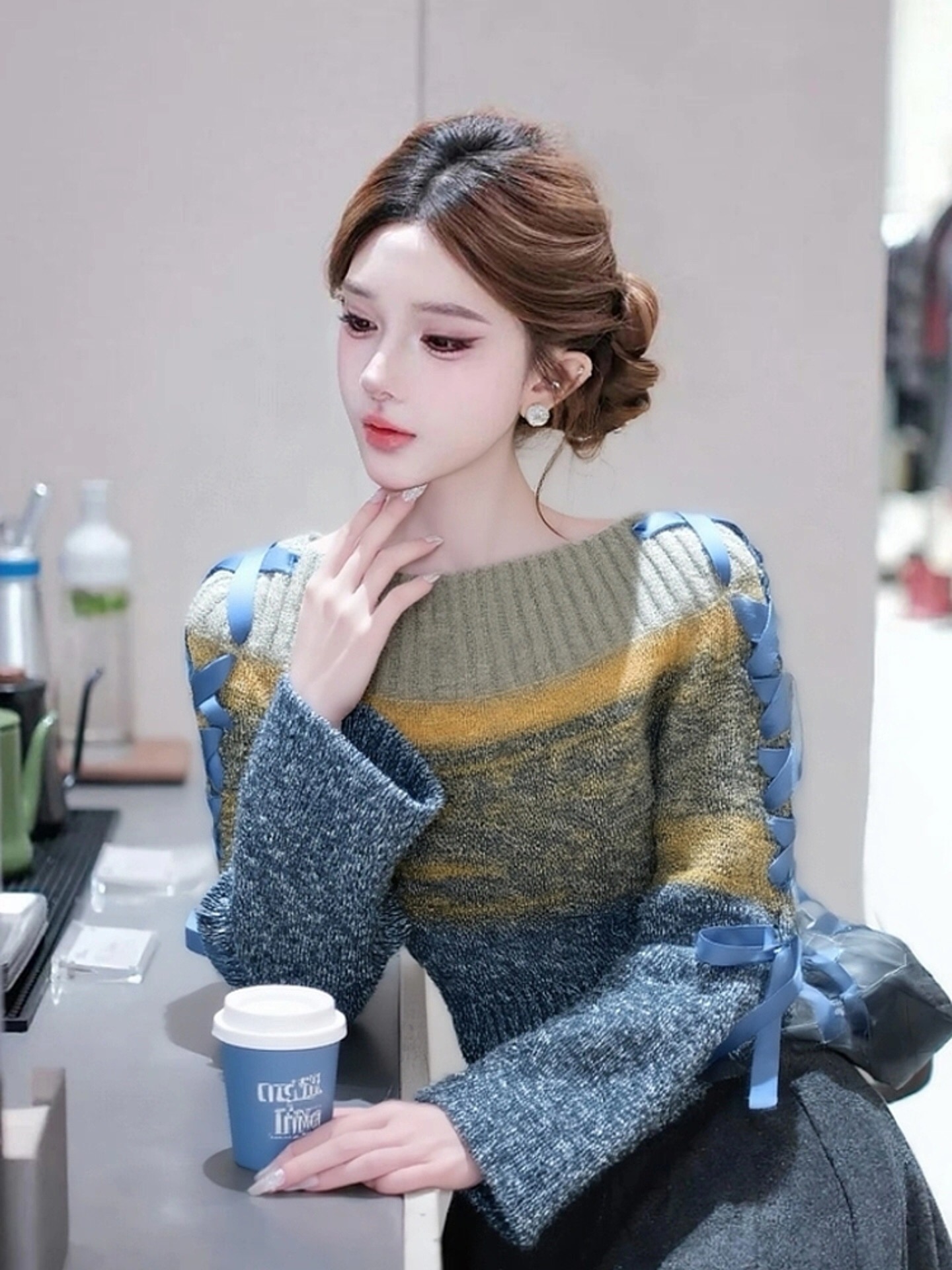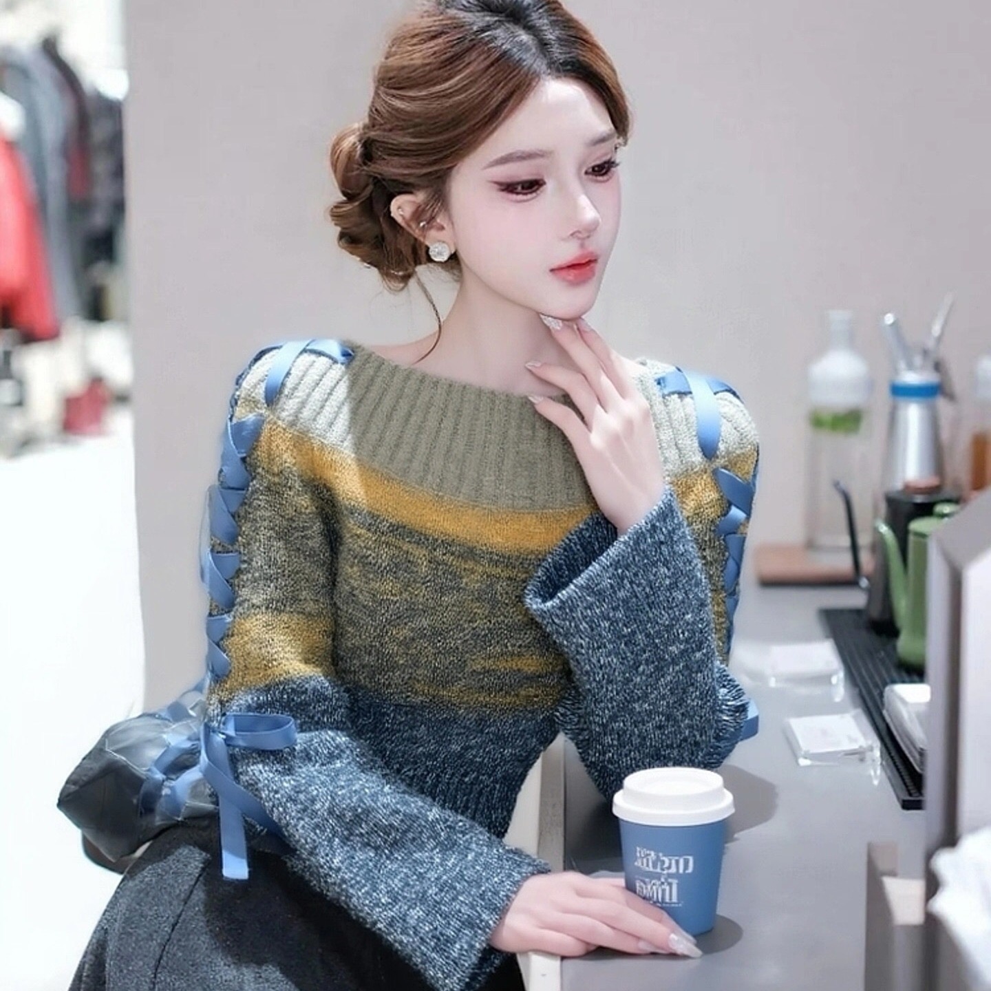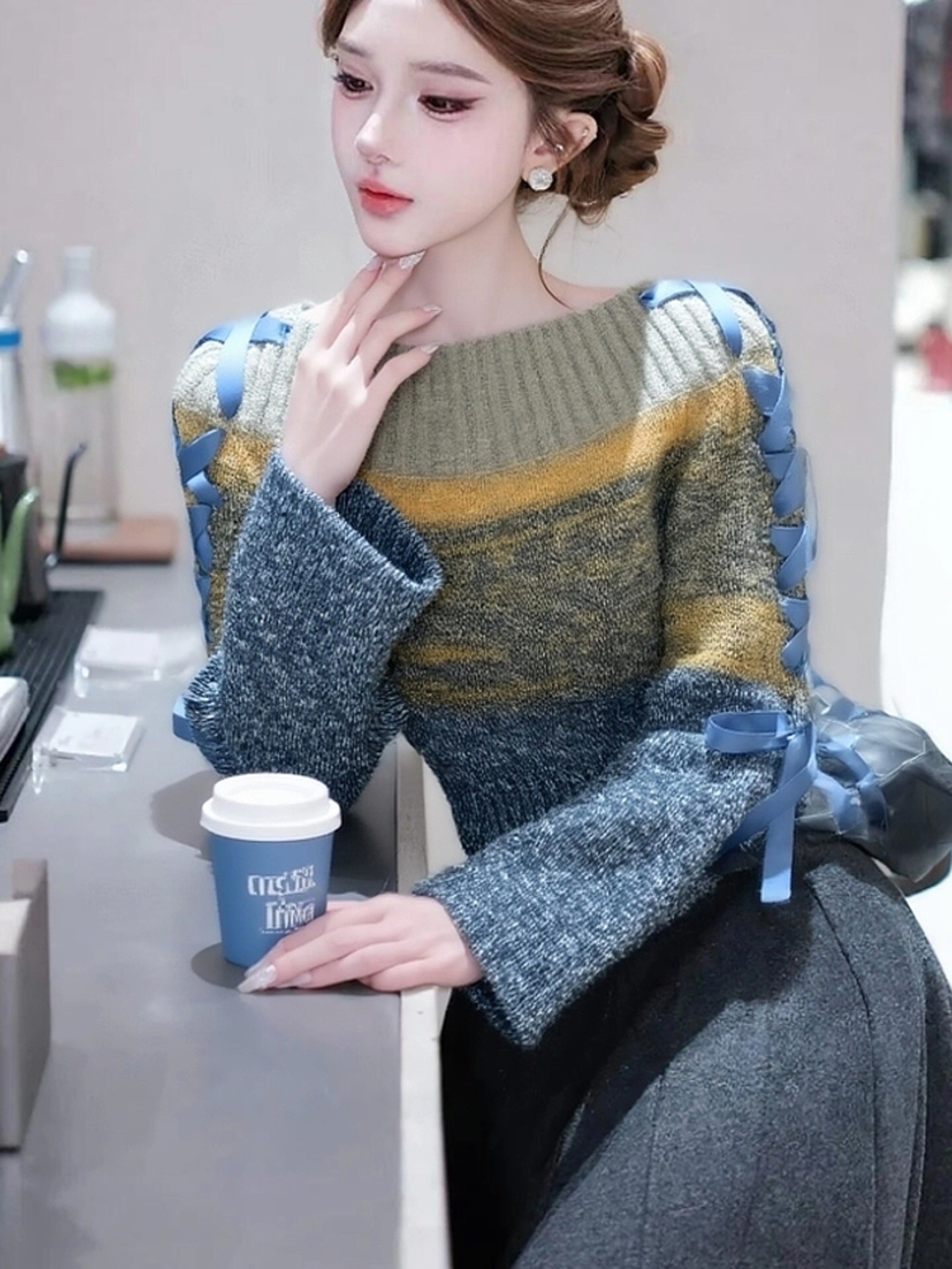 MY16352# 巨好看蓝色撞色针织衫时髦洋气高级感法式小资收腰上衣女女裝貨源服裝批發