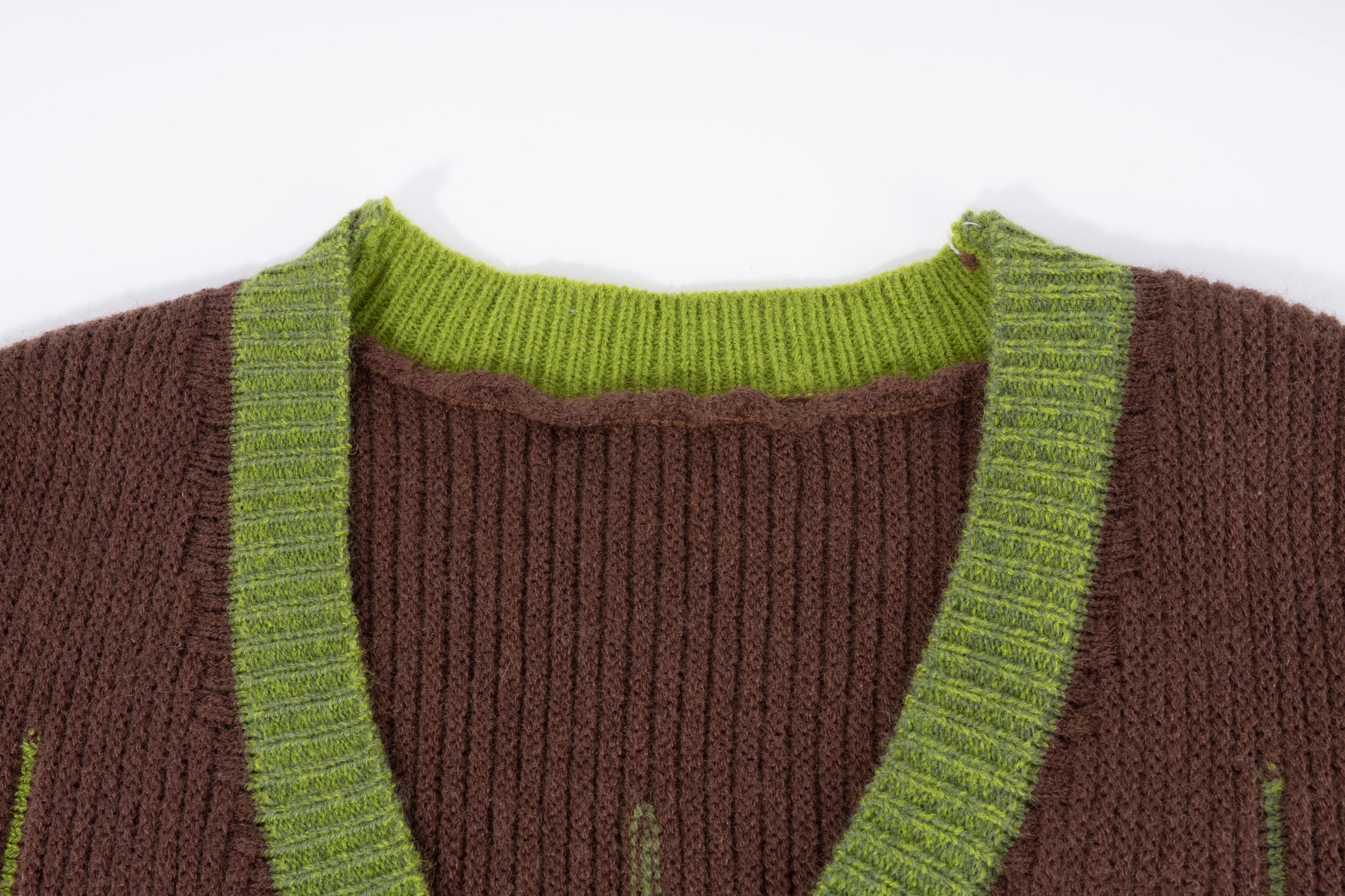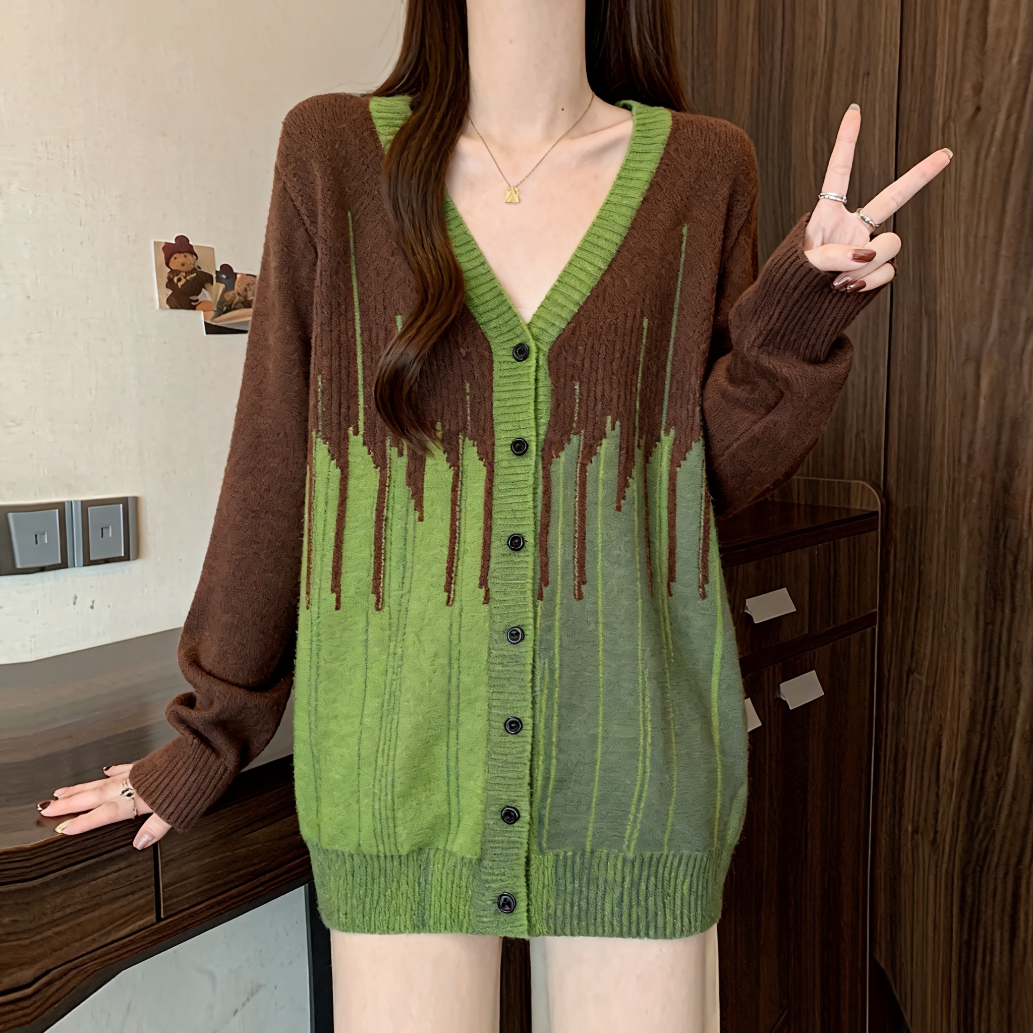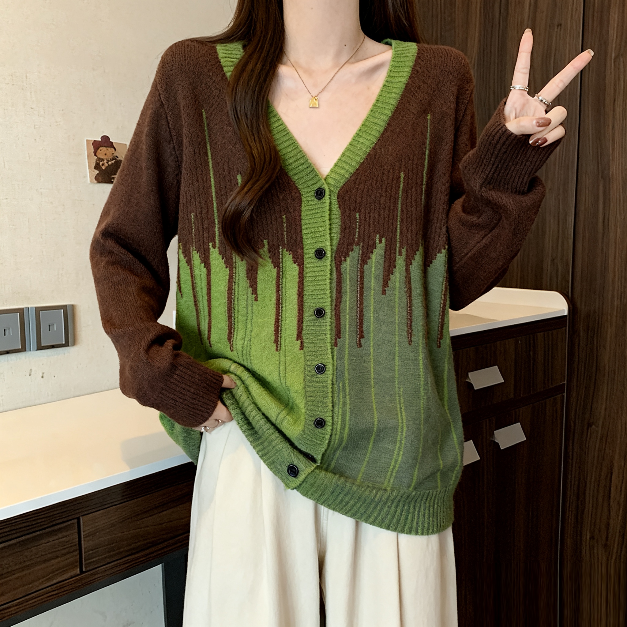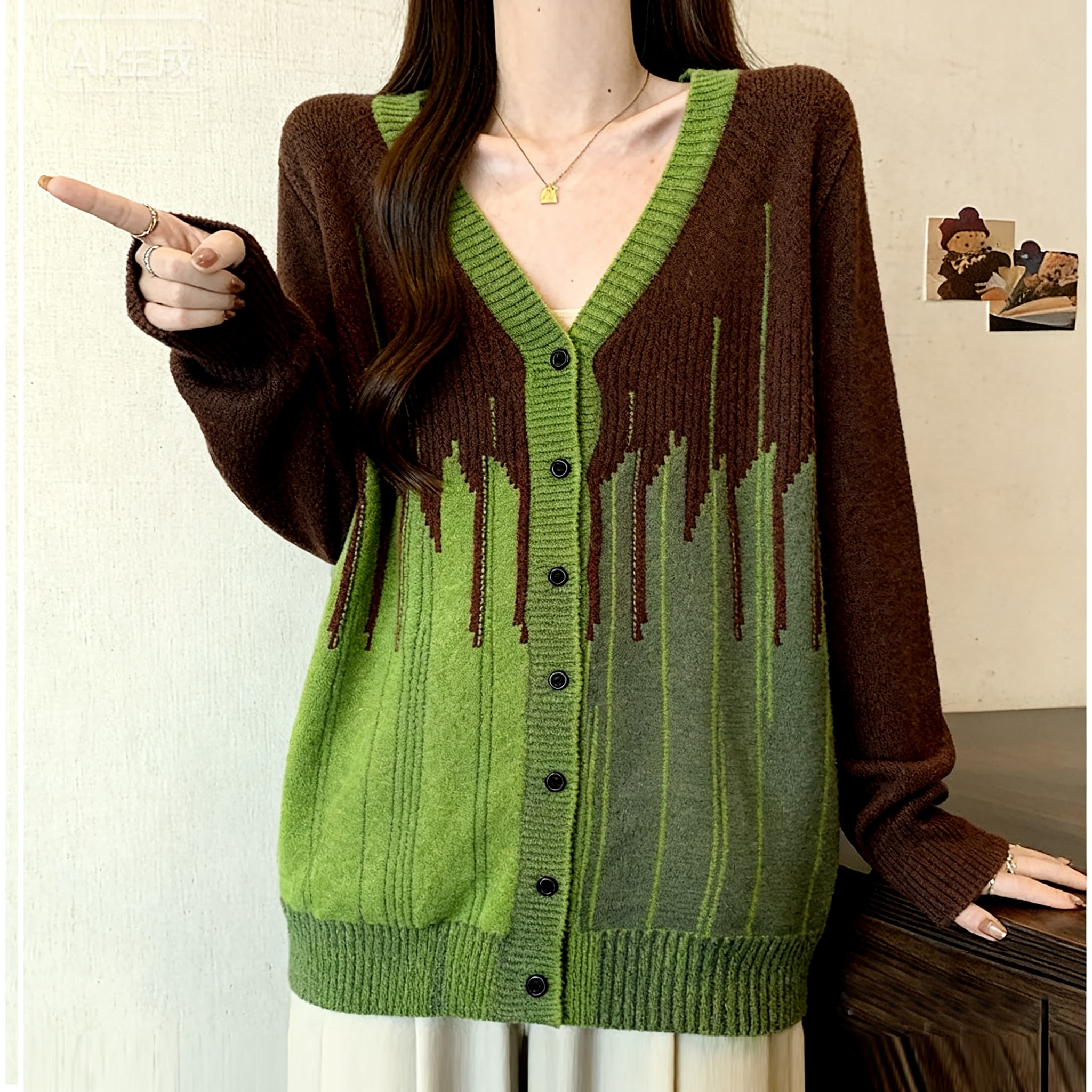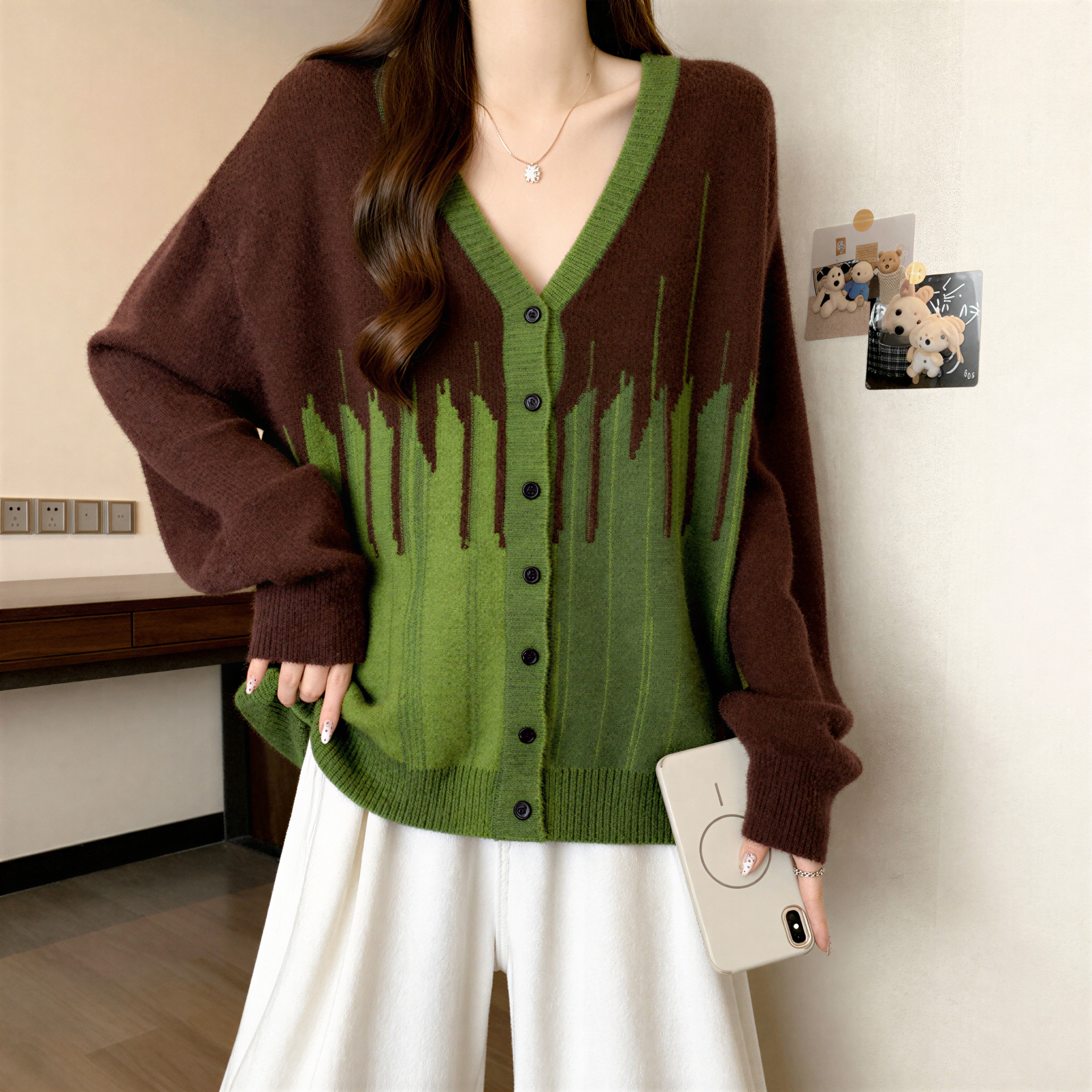 MY16367# 时髦撞色V领长袖针织开衫外套大码胖MM高级百搭显瘦上衣潮女裝貨源服裝批發