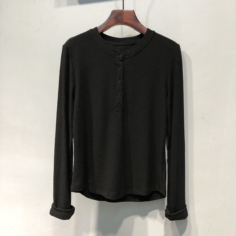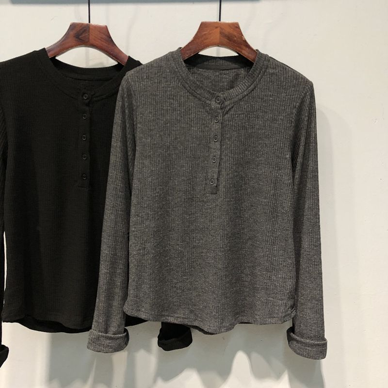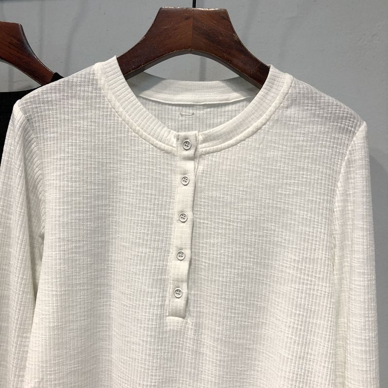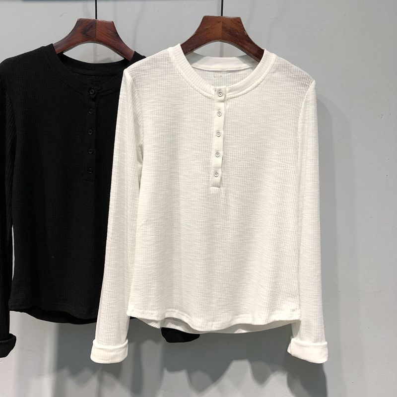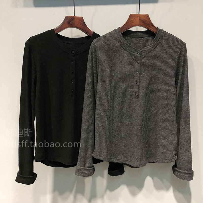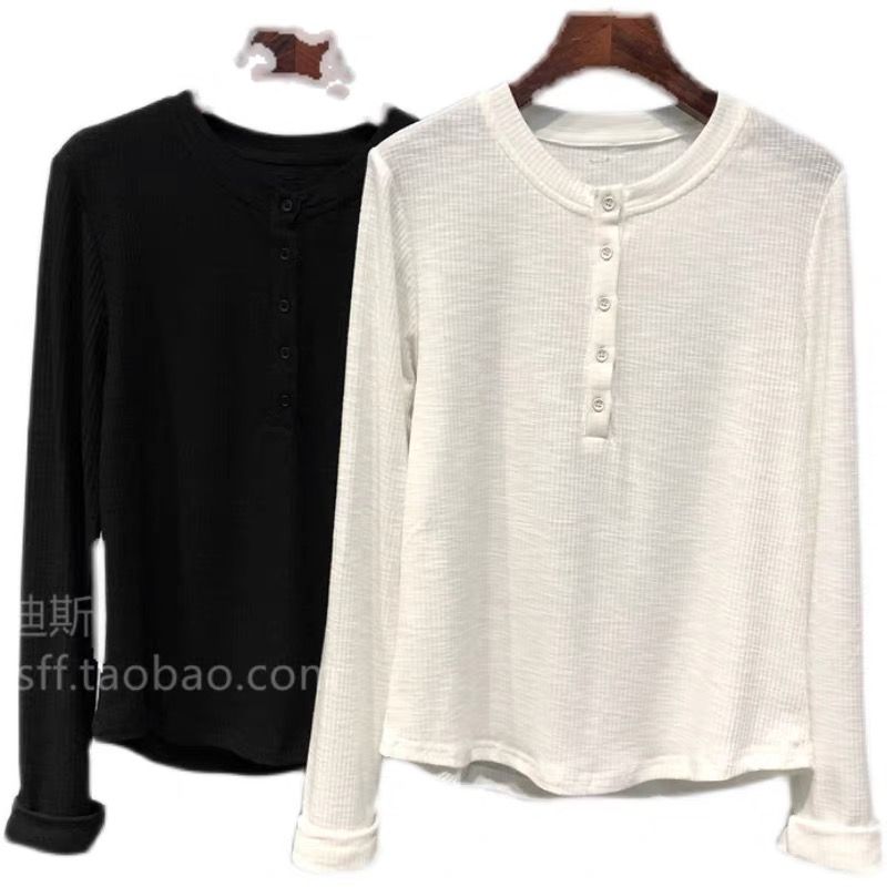 MY16380# 新款韩系纯色圆领排扣简约螺纹棉长袖T恤上衣女女裝貨源服裝批發