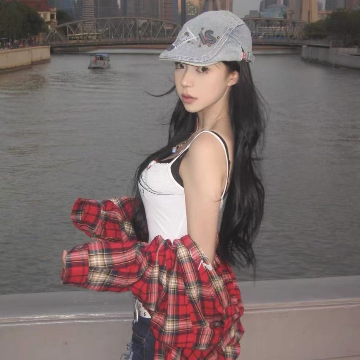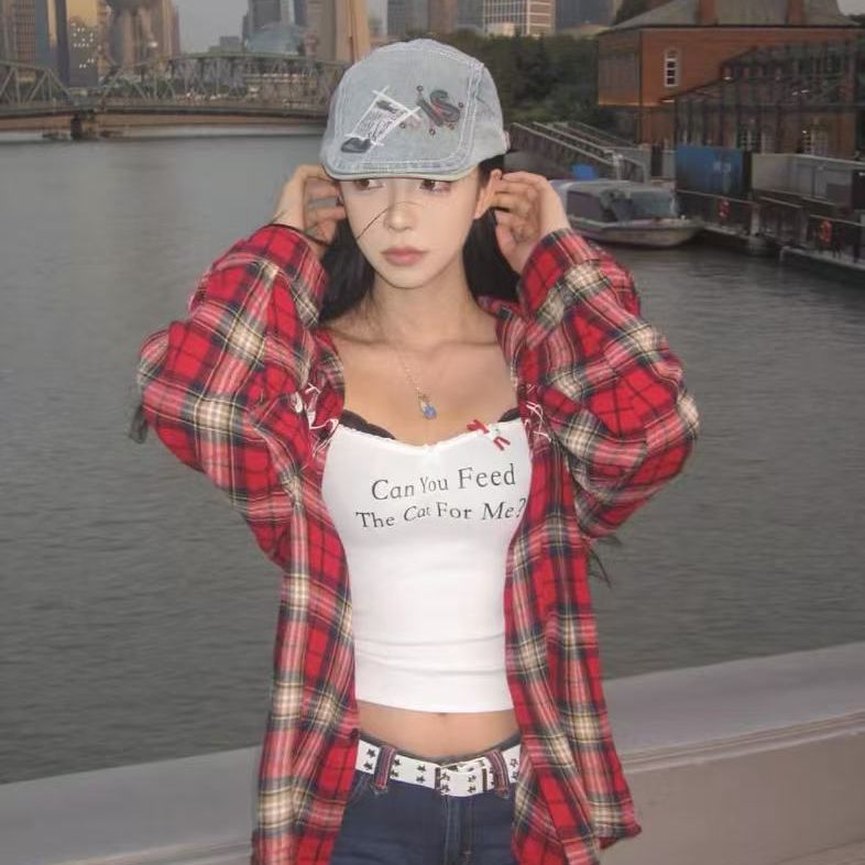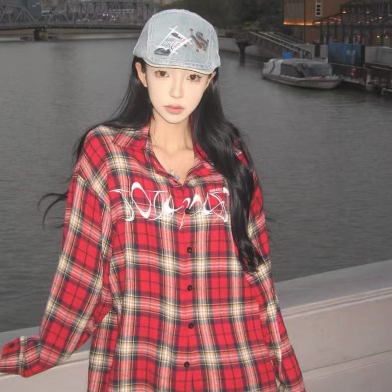 MY16384# 爆款美式复古红色刺绣格子衬衫潮牌长袖hiphop高街衬衣外套女裝貨源服裝批發