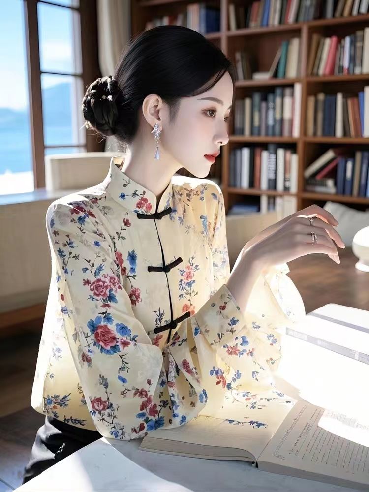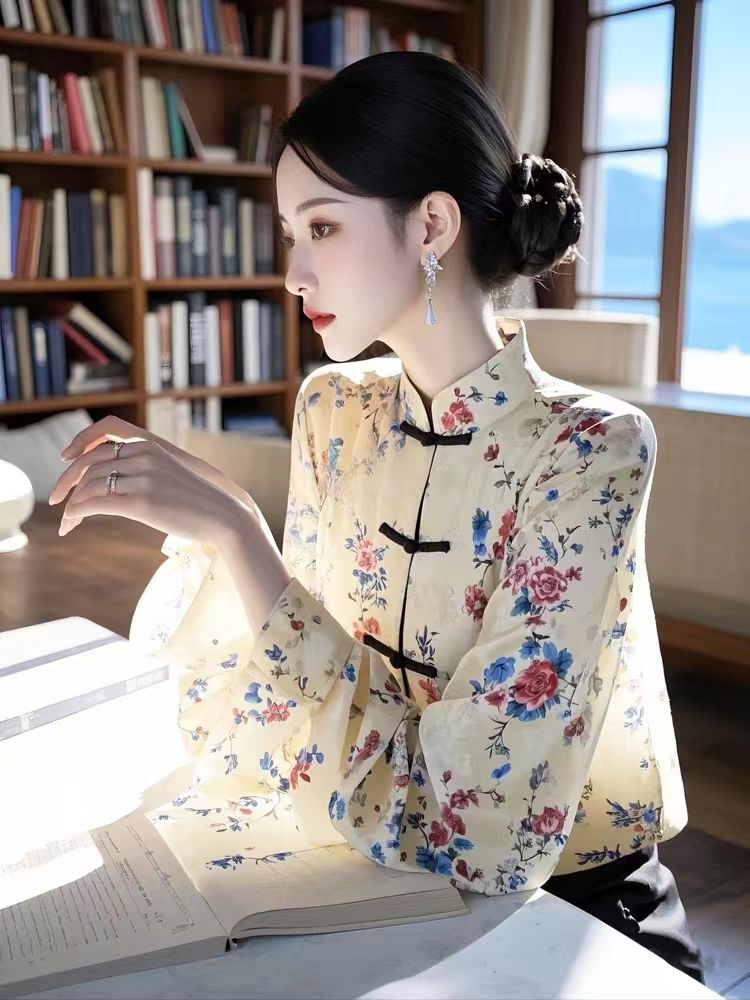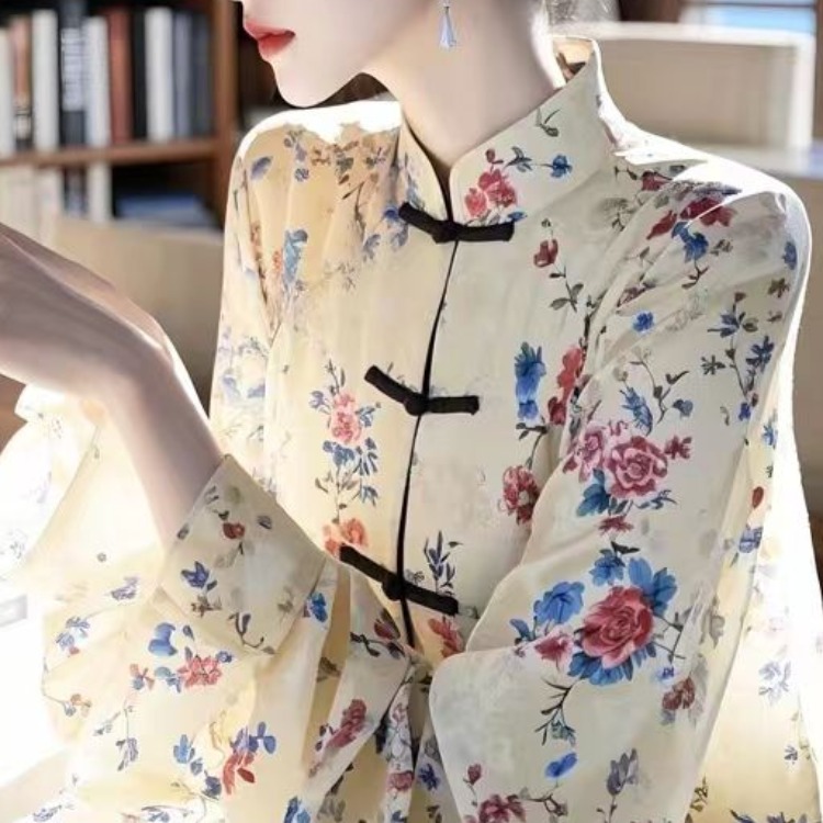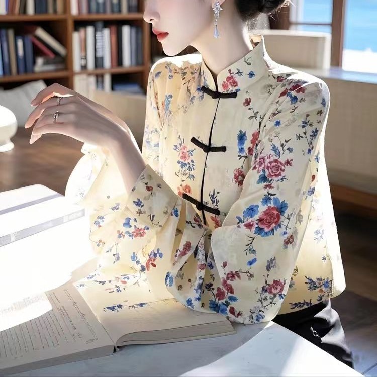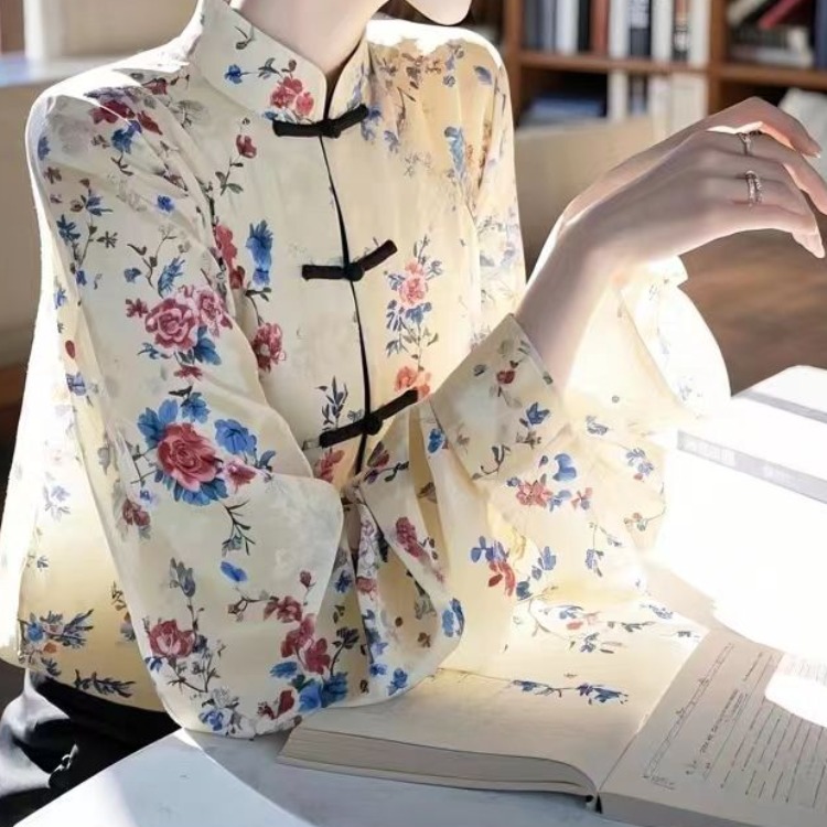 MY16387# 新款小衫新中式国风杏色碎花衬衫女长袖上衣女裝貨源服裝批發