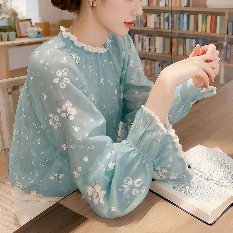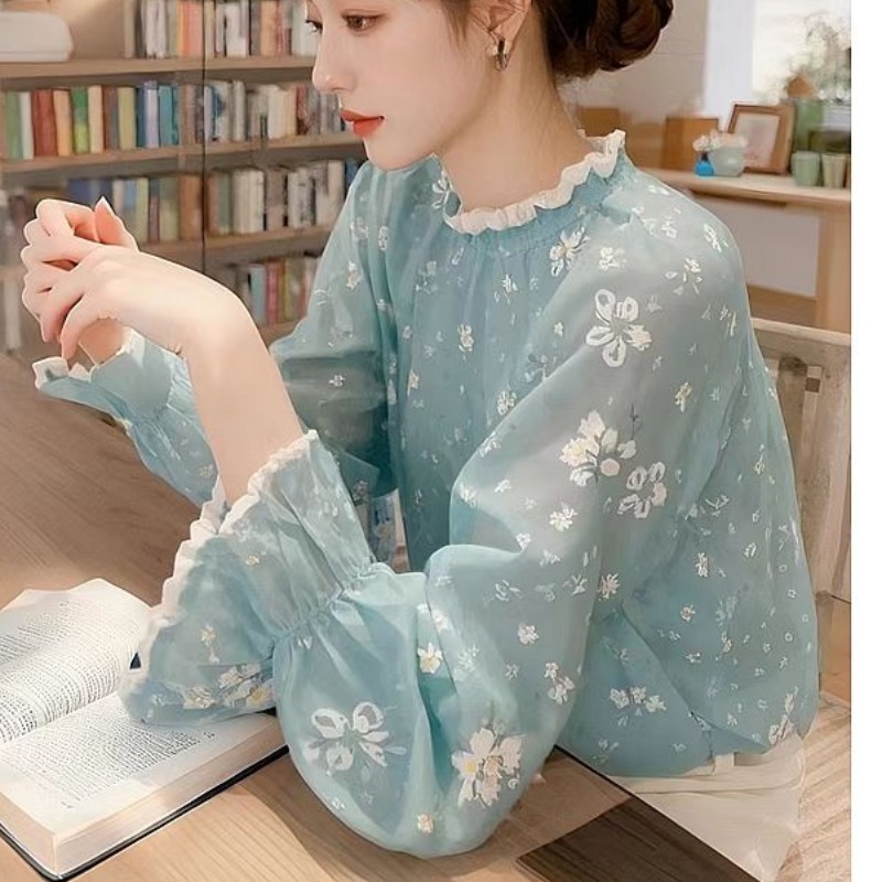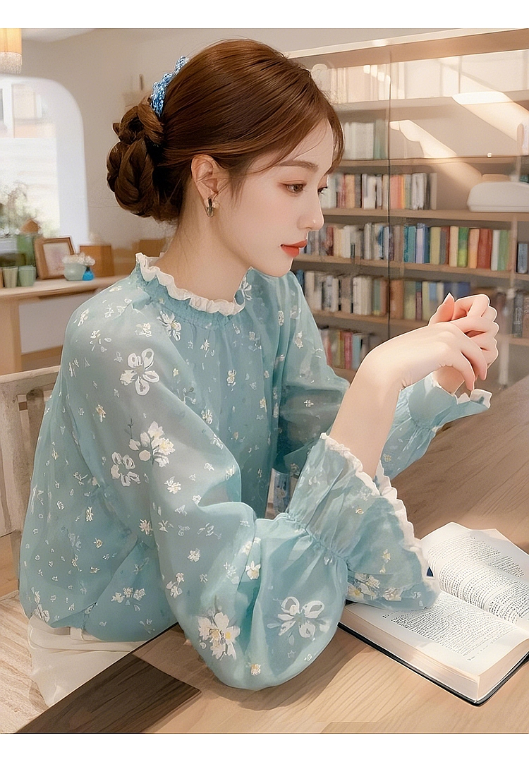 MY16388# 新款蓝色碎花衬衫女减龄洋气法式气质上衣小衫女裝貨源服裝批發